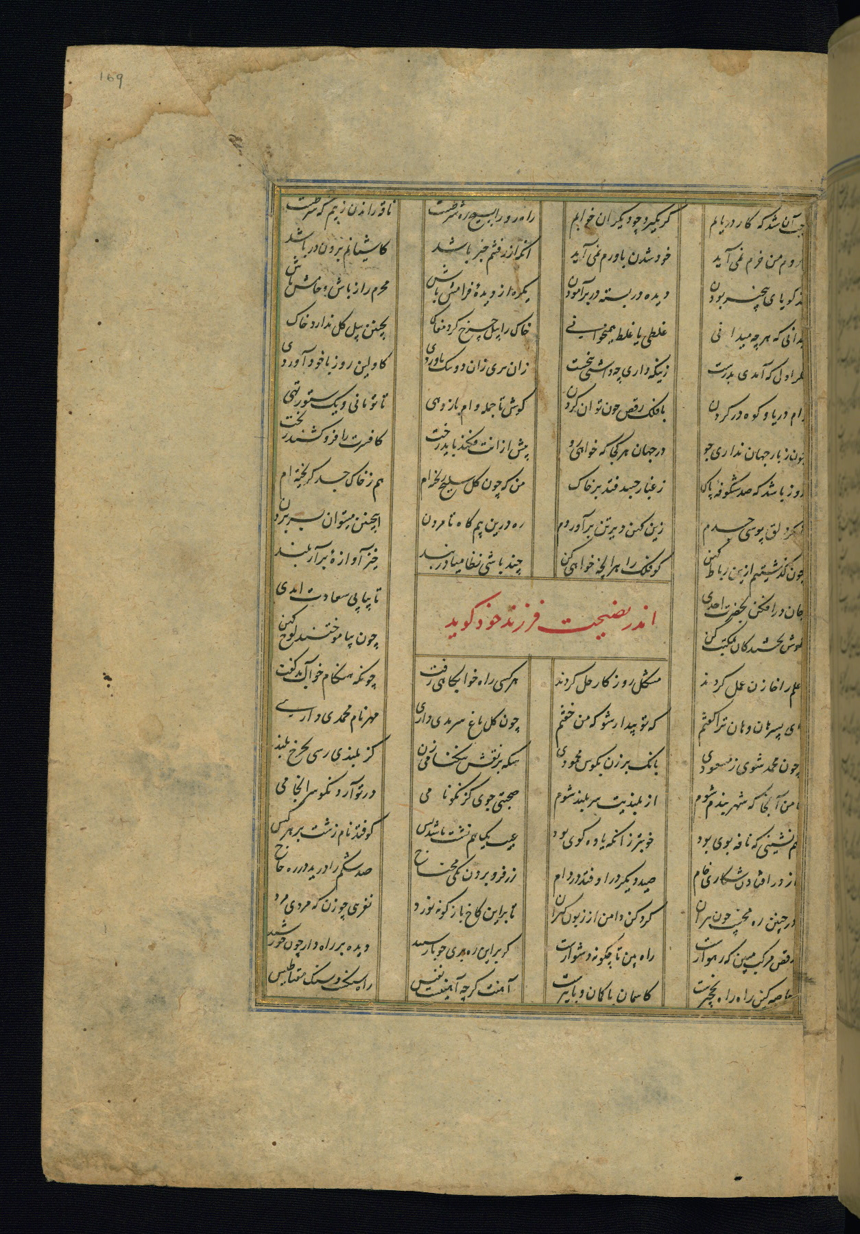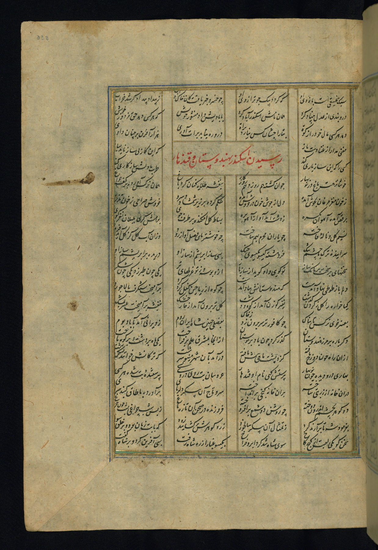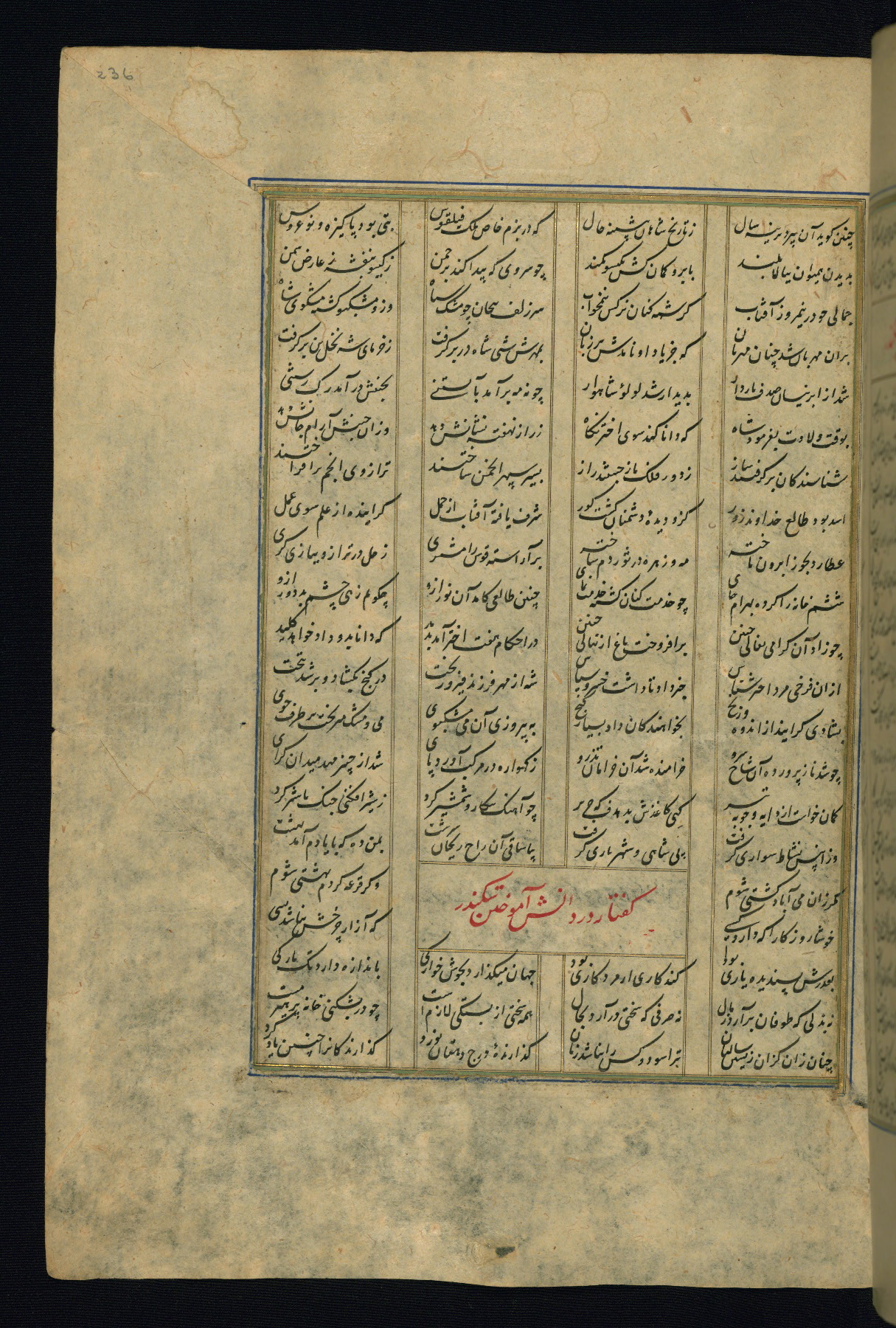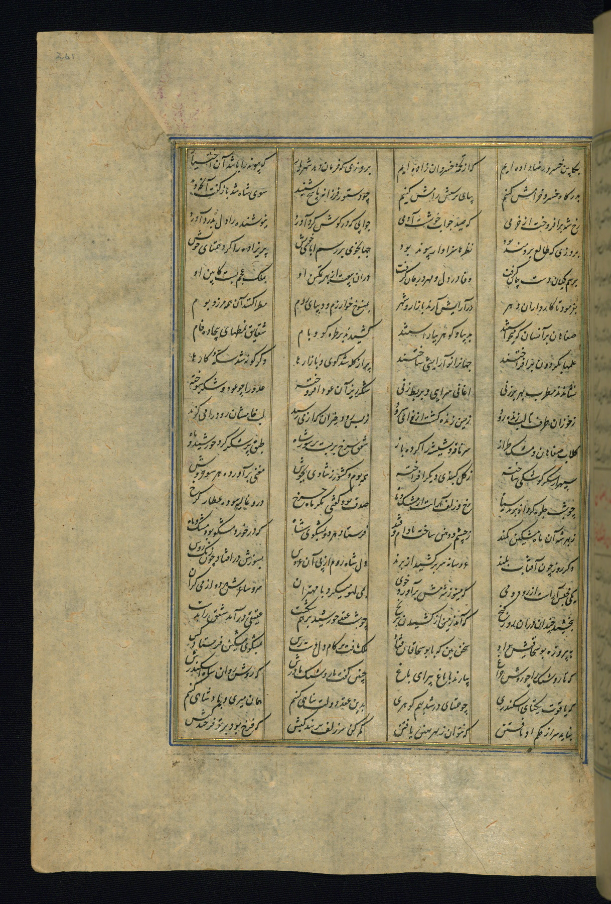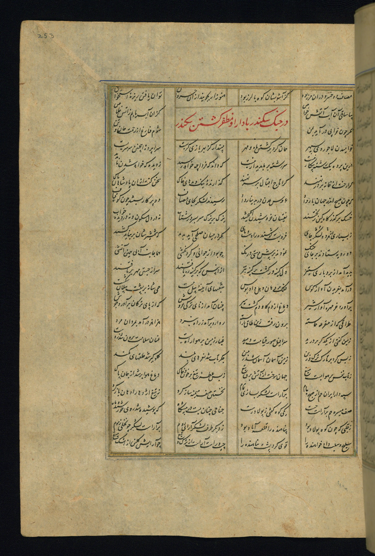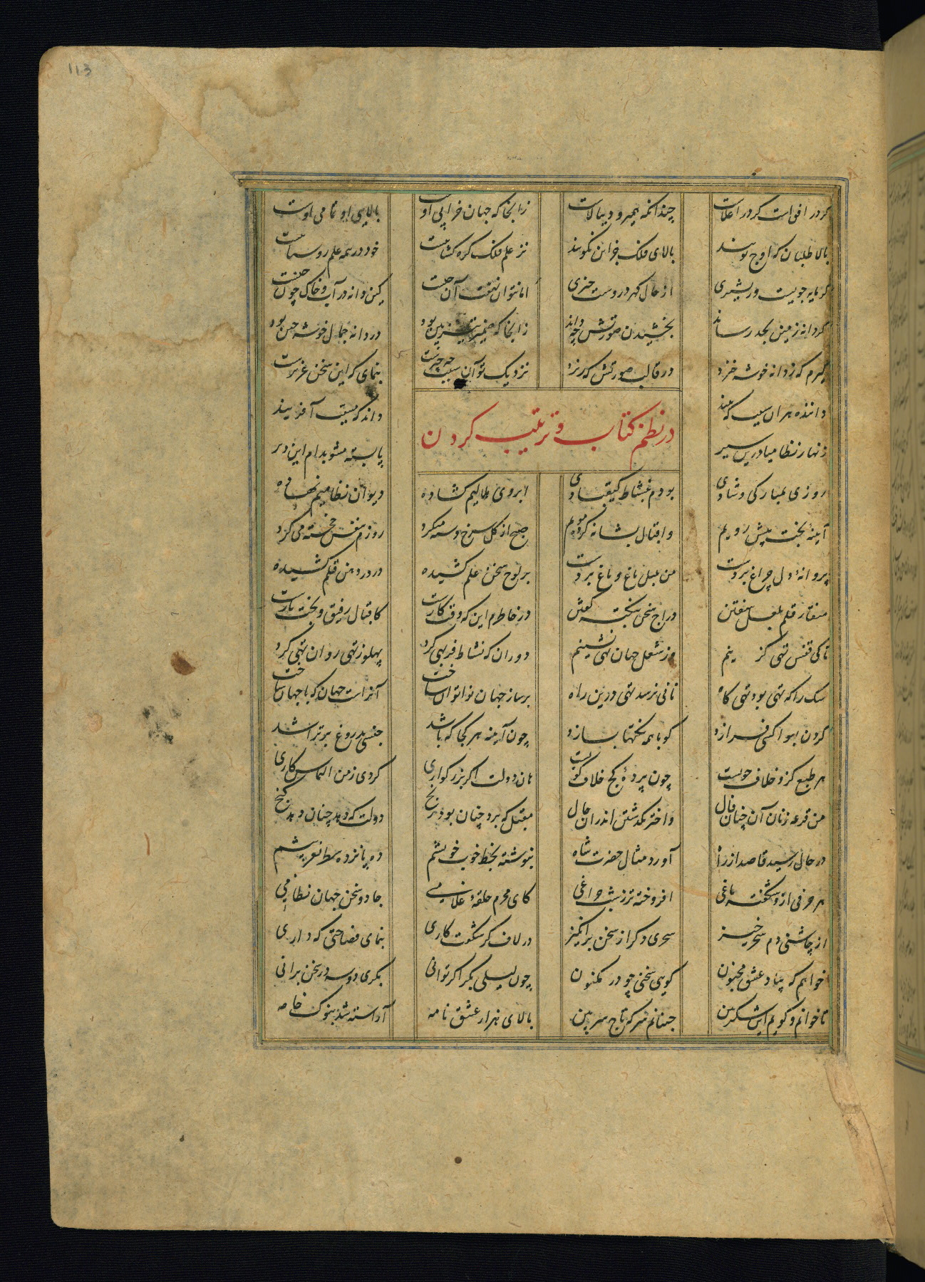This is an illuminated and illustrated copy of the Khamsah (quintet) by Niẓāmī Ganjavī (d. 605 AH / 1209 CE), completed by Ḥabīb Allāh ibn ʿAlī ibn Ḥusām in Safavid Iran in Rabīʿ II 971 AH / 1563 CE. Illuminated titlepieces introduce the five poems, and there are thirty illustrations, the majority of which are attributable to thirteenth century AH / nineteenth CE Qajar Iran. Ownership notes and seals indicating the provenance of this manuscript are found throughout the codex (fols. 1a, 2a, 153a, 177a, 233a, 349a, and 351a). The binding is not original to the manuscript.