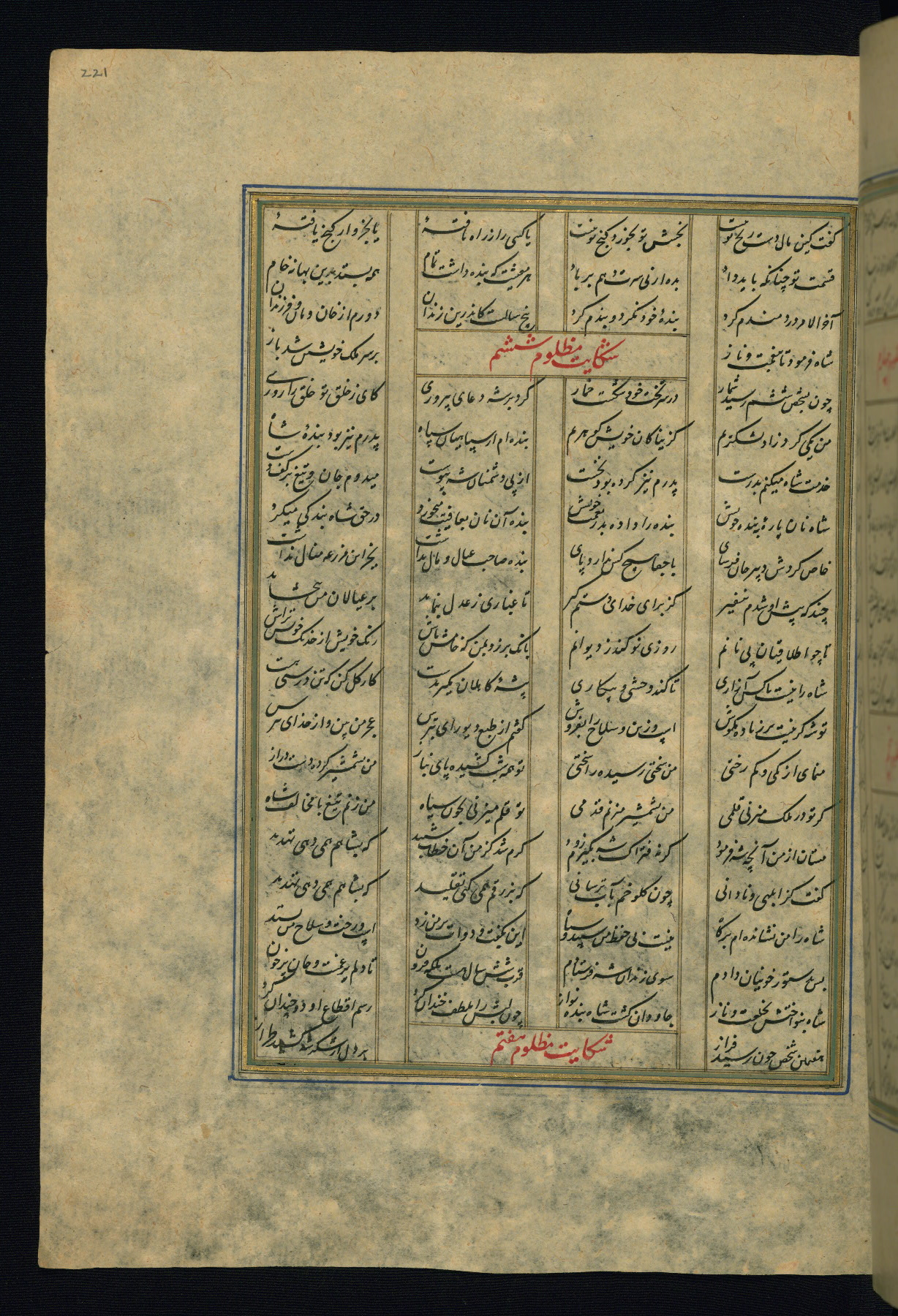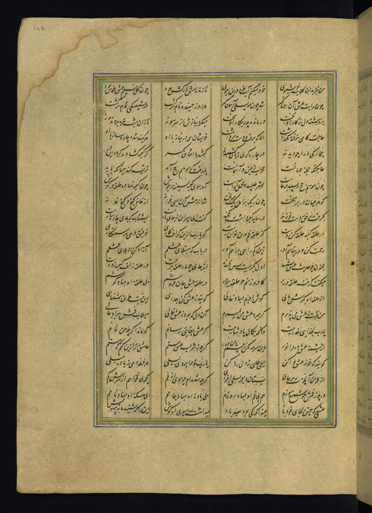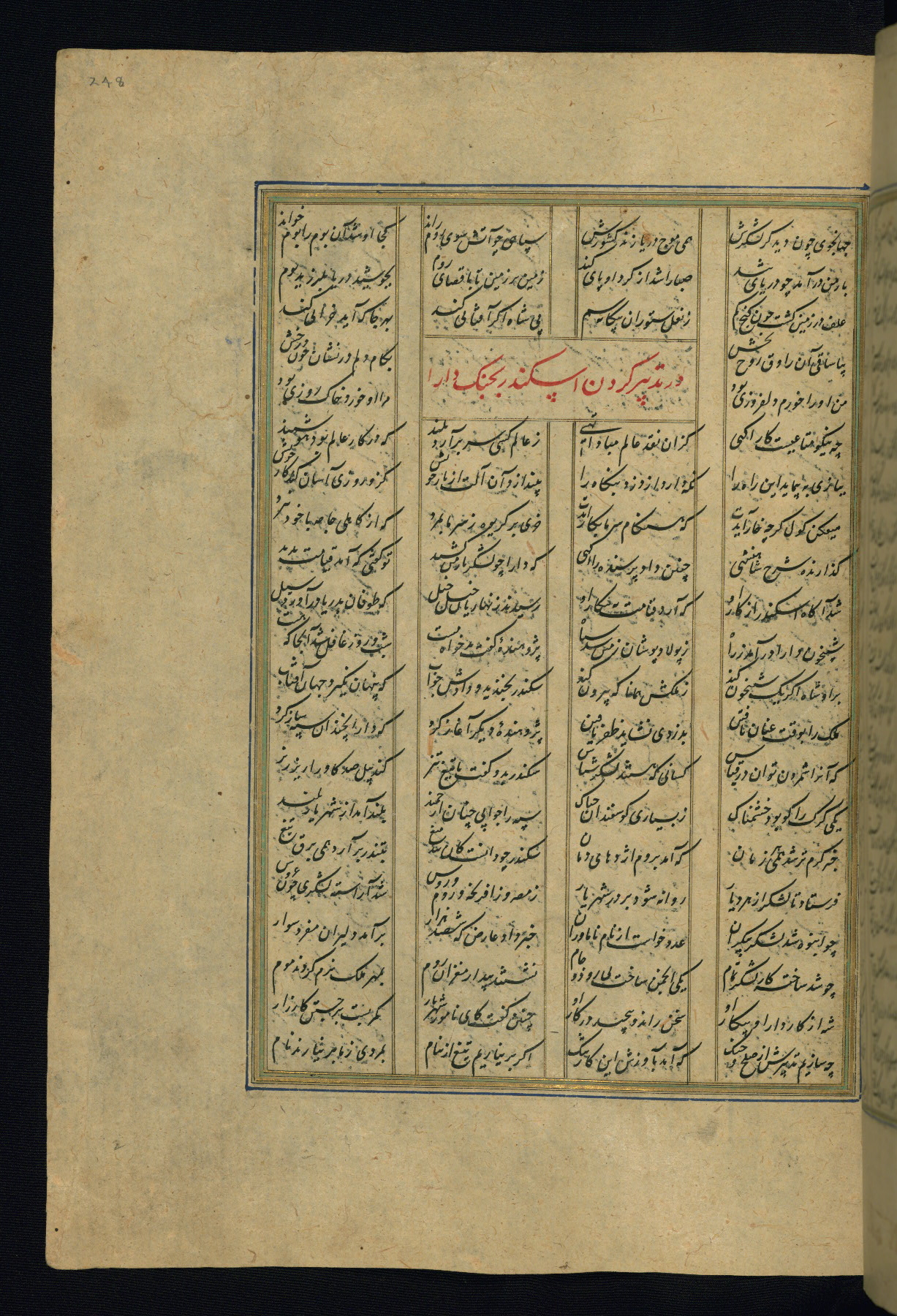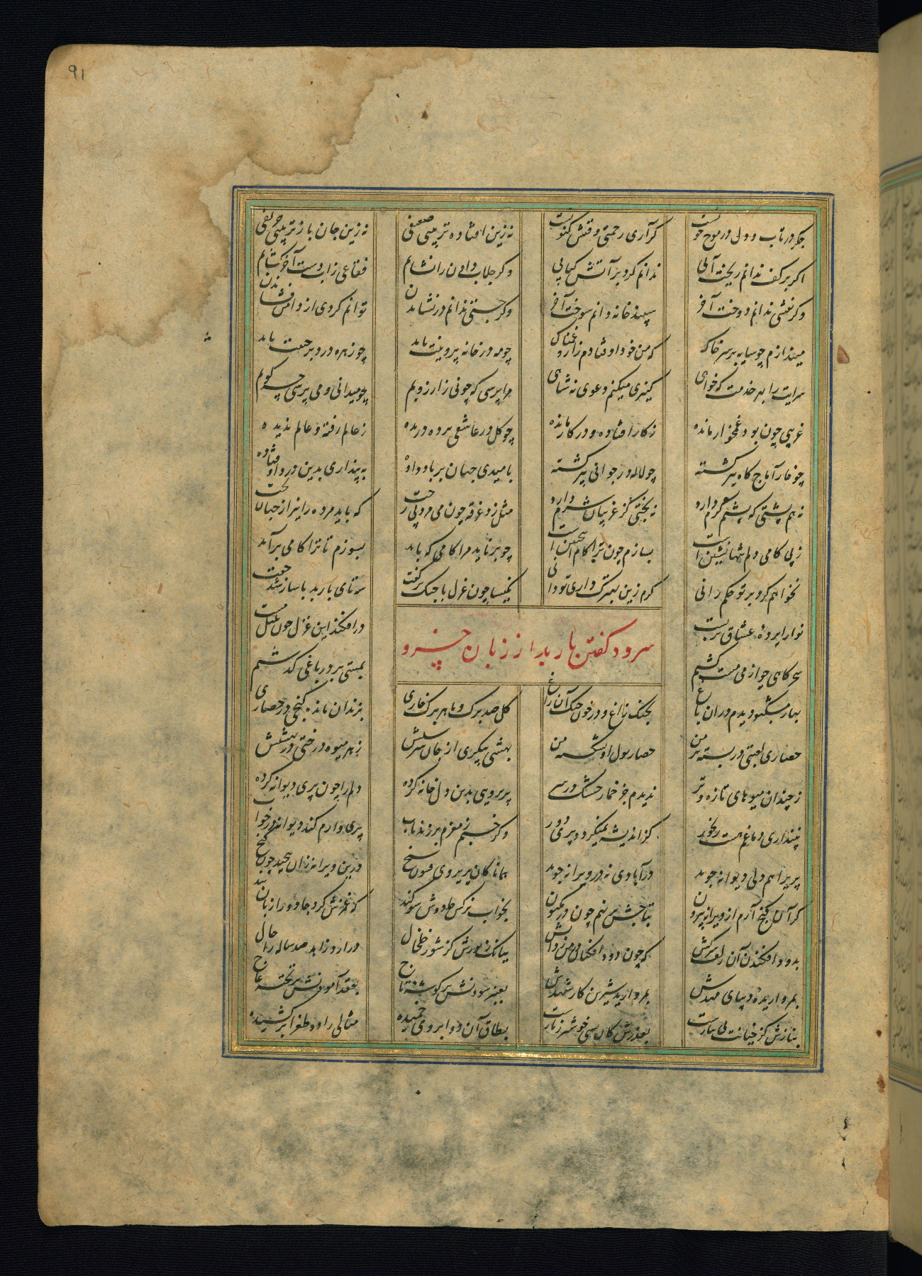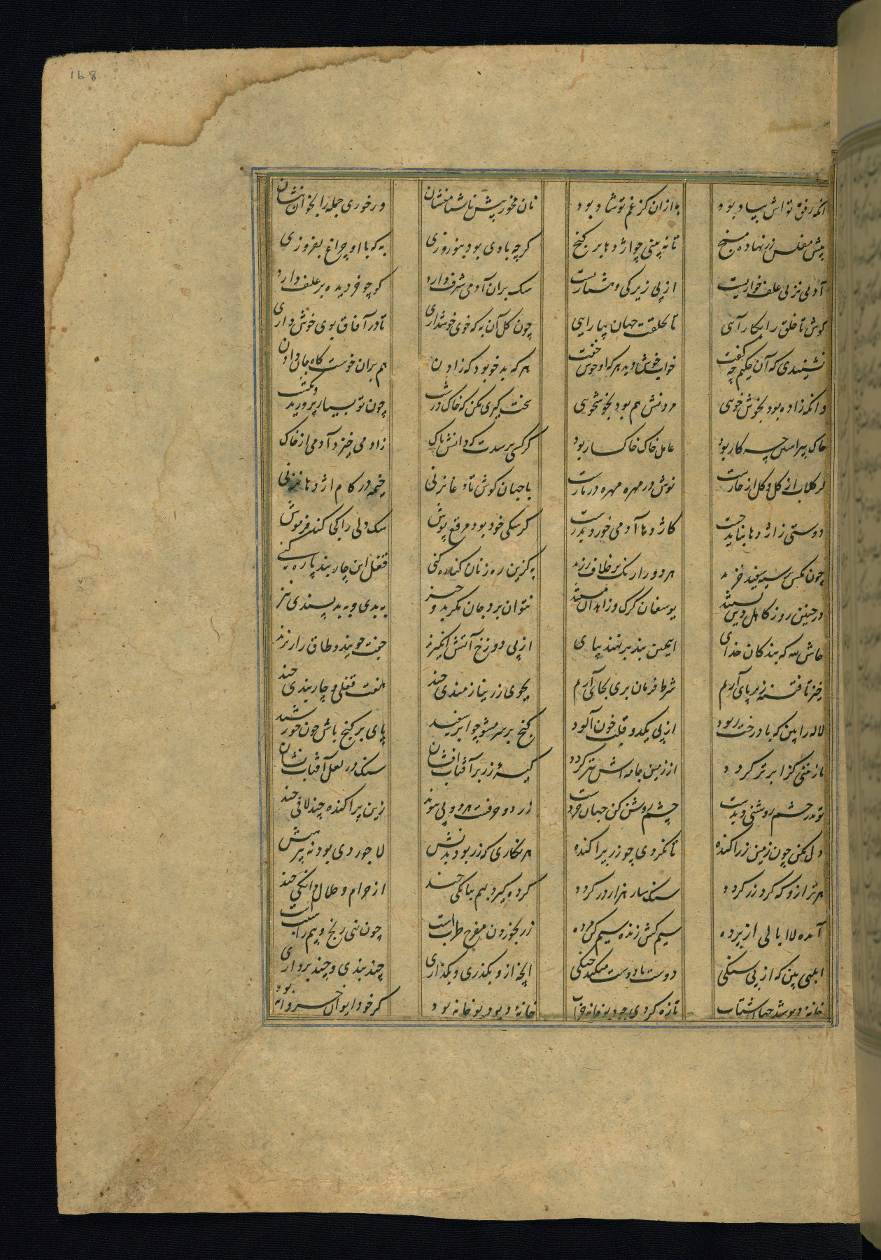 This is an illuminated and illustrated copy of the Khamsah (quintet) by Niẓāmī Ganjavī (d. 605 AH / 1209 CE), completed by Ḥabīb Allāh ibn ʿAlī ibn Ḥusām in Safavid Iran in Rabīʿ II 971 AH / 1563 CE. Illuminated titlepieces introduce the five poems, and there are thirty illustrations, the majority of which are attributable to thirteenth century AH / nineteenth CE Qajar Iran. Ownership notes and seals indicating the provenance of this manuscript are found throughout the codex (fols. 1a, 2a, 153a, 177a, 233a, 349a, and 351a). The binding is not original to the manuscript.