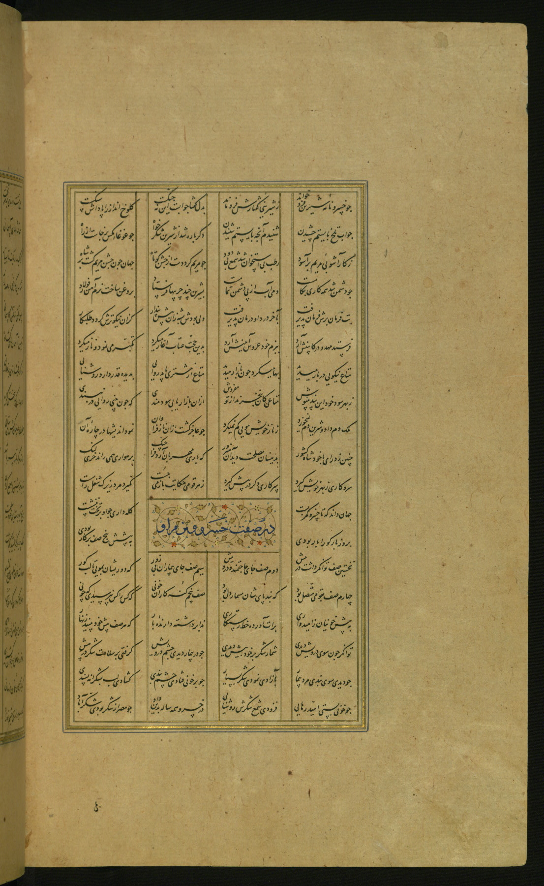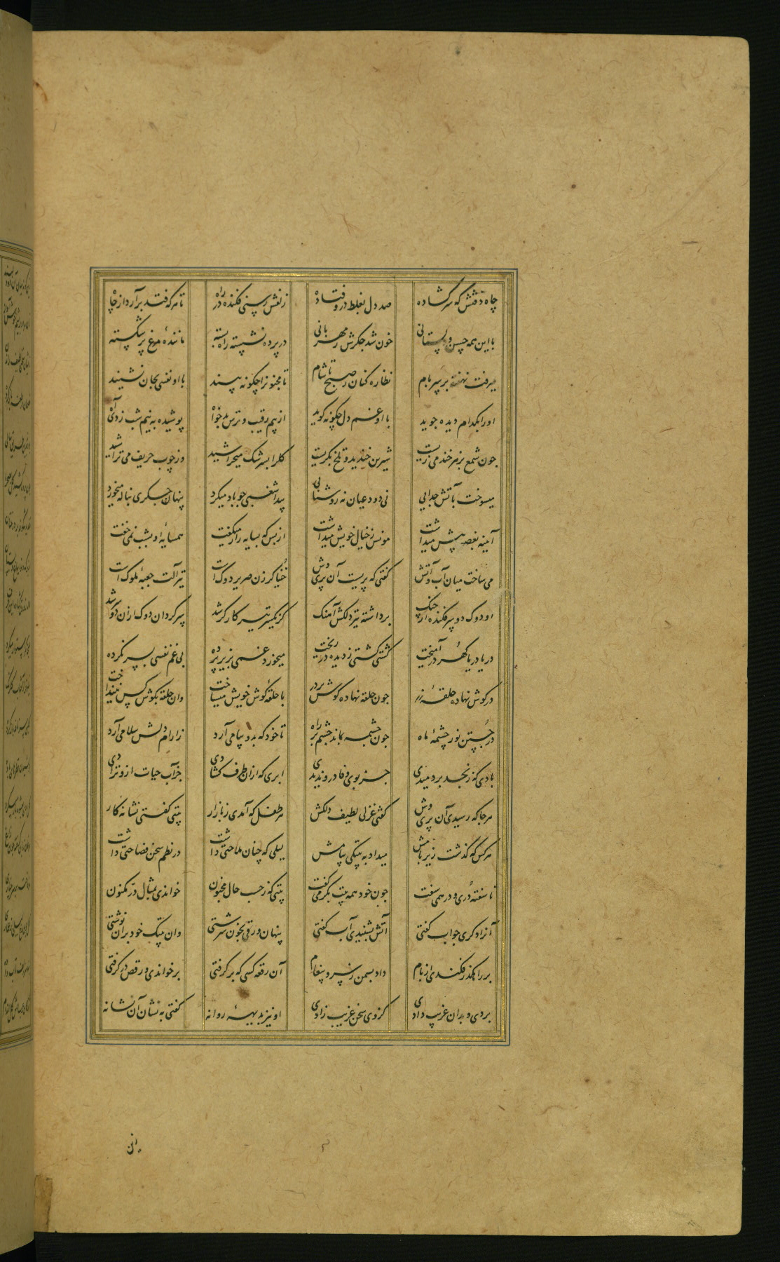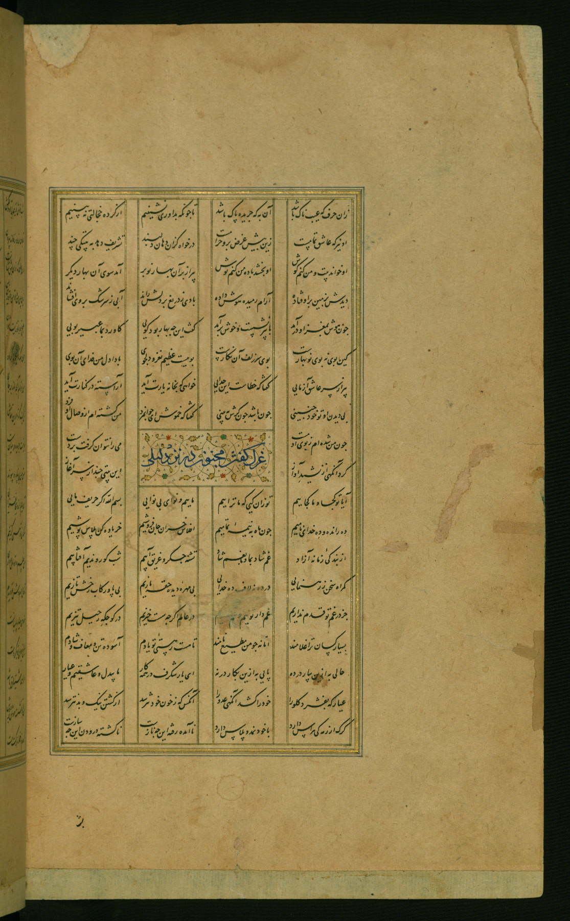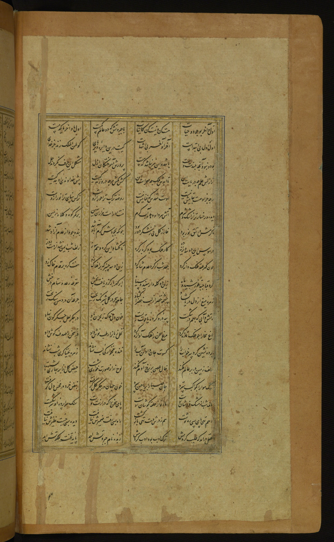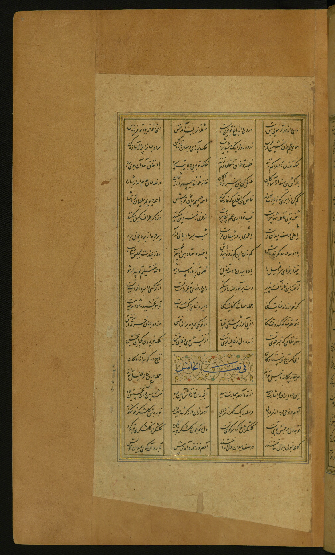 This illuminated and illustrated copy of the Khamsah (quintet) of Niẓāmī Ganjavī (d. 605 AH / 1209 CE) was written by Yār Muḥammad al-Haravī in 922 AH / 1516 CE. Written in four columns in black nastaʿlīq script, this manuscript opens with a double-page illuminated frontispiece signed by ʿAbd al-Wahhāb ibn ʿAbd al-Fattāḥ ibn ʿAlī. It contains thirty-five illustrations that were repainted in India during the twelfth century AH / eighteenth CE. The seal of Muḥammad Asharf ibn Muḥammad Khātam al-Ḥusaynī, dated 1173 AH / 1759-60 CE appears on fols. 1a and 401a. It is possible that the brown leather binding with center and side panels brushed with gold is original to the manuscript but was repaired at a later stage in the codex's history.