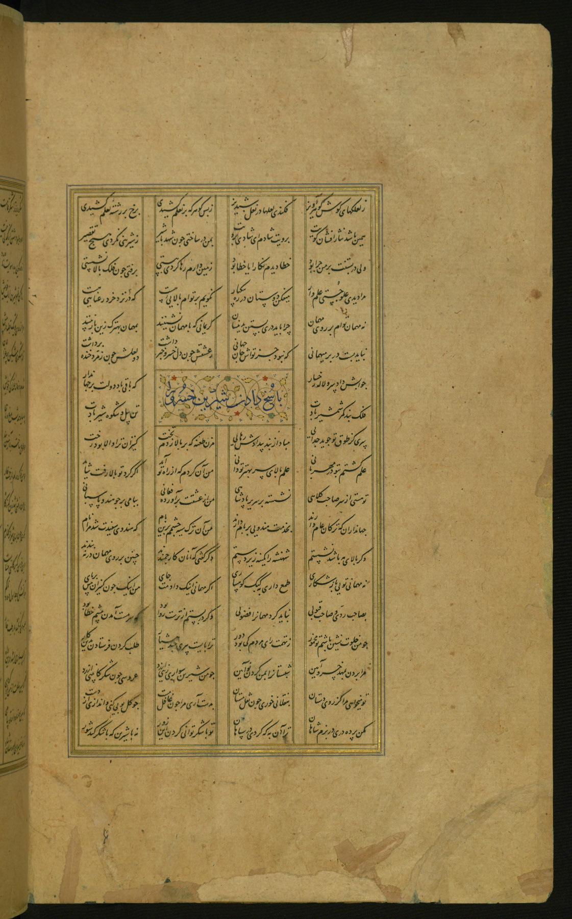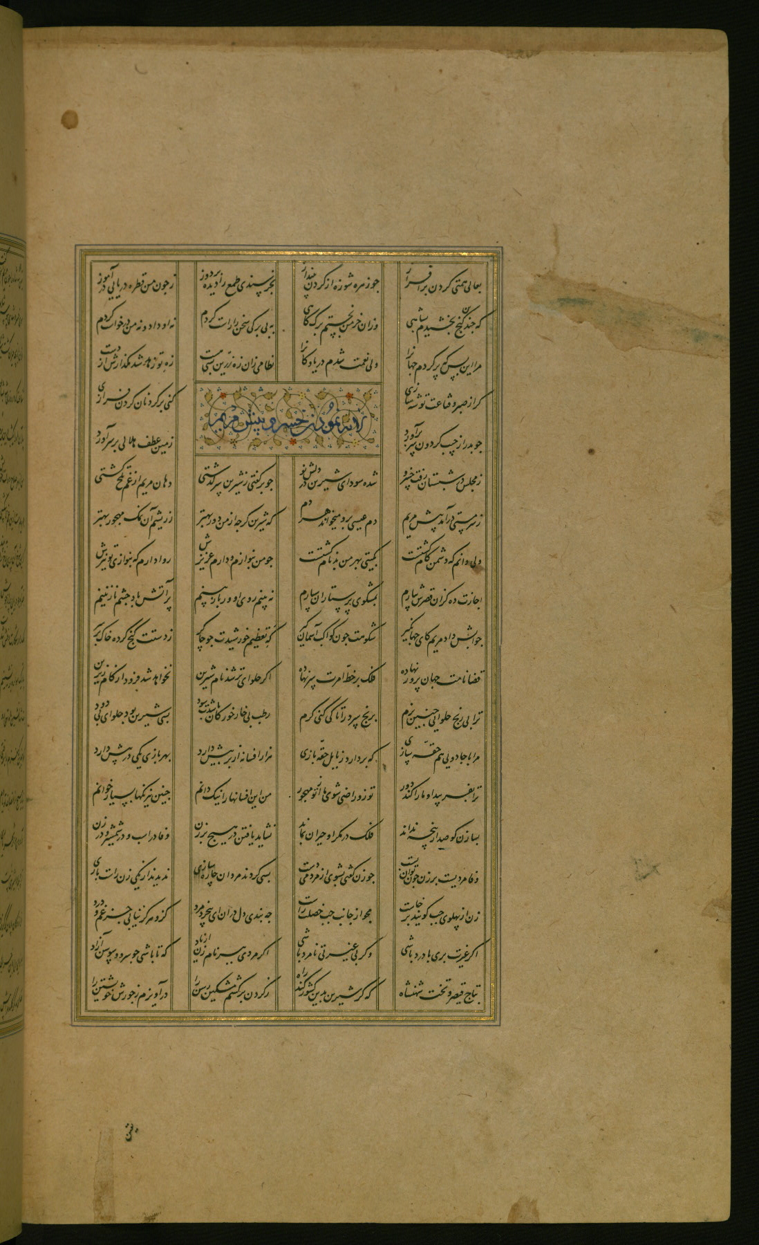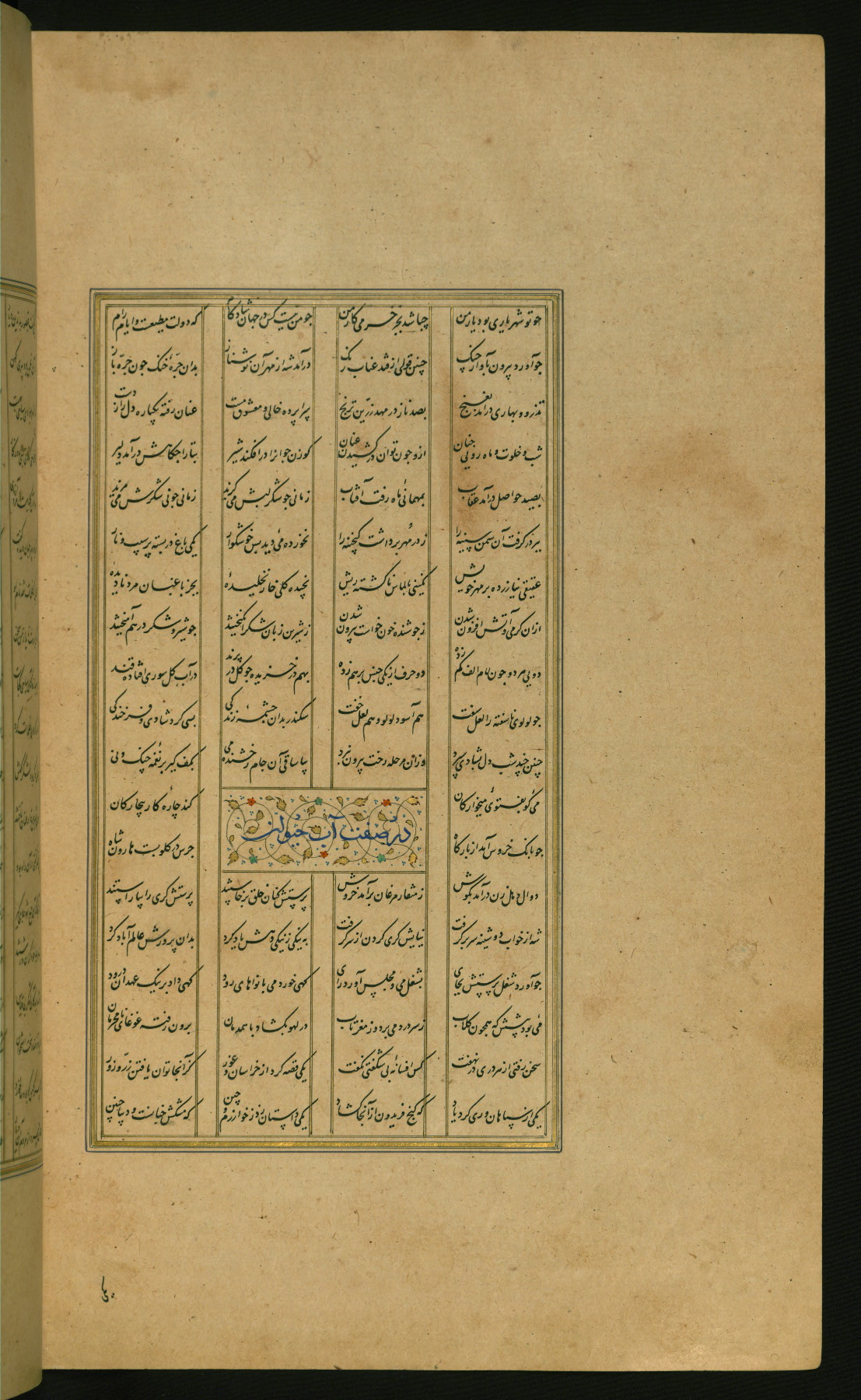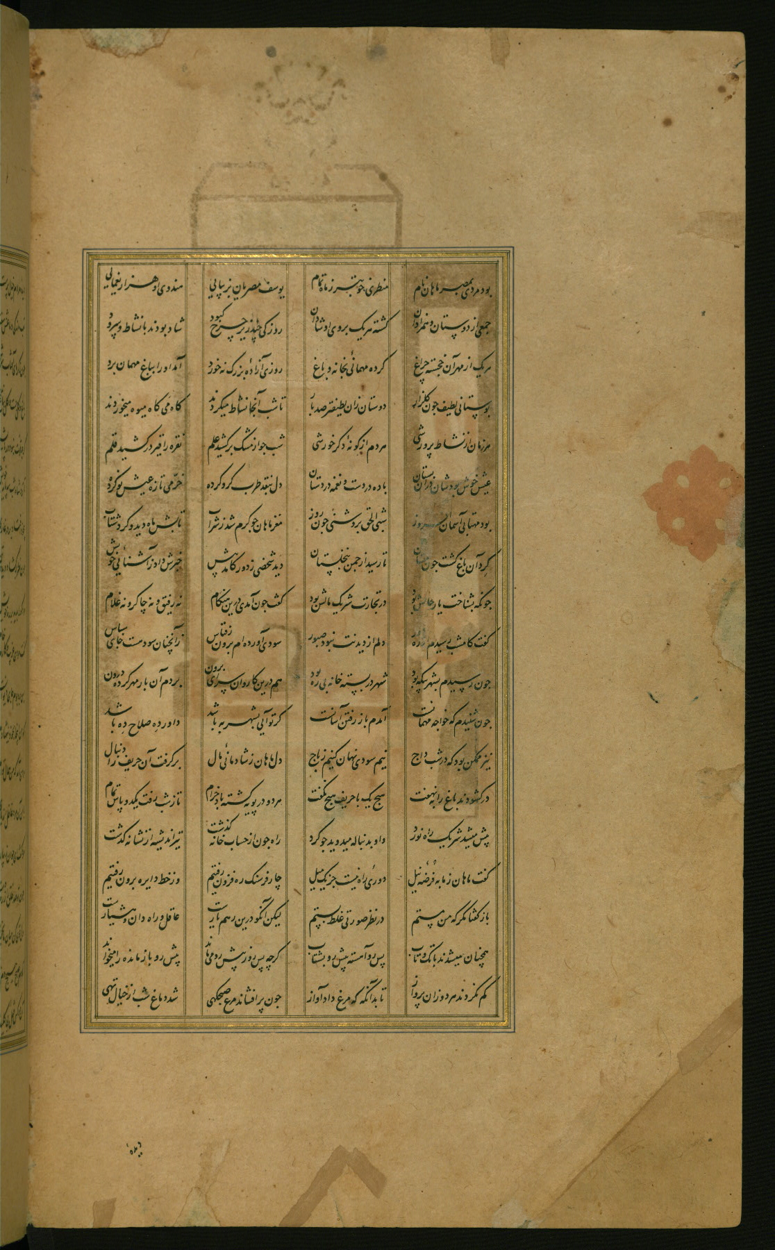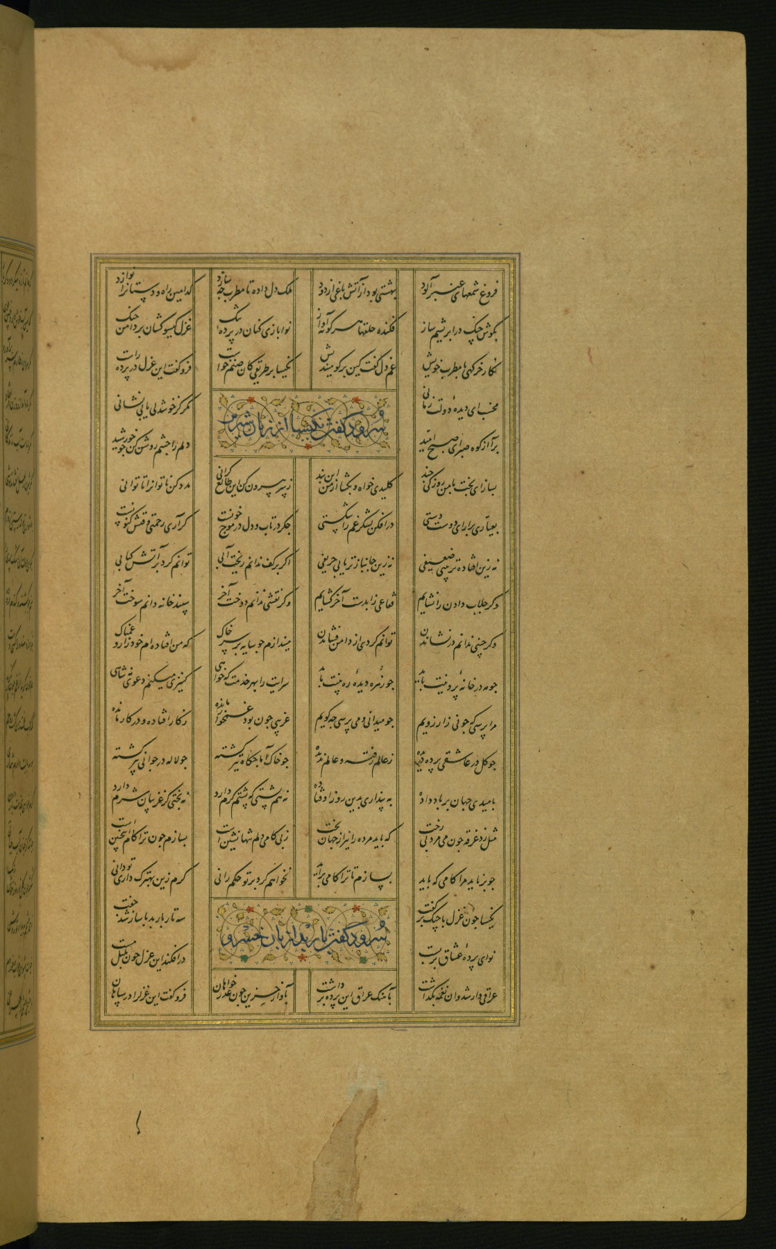 This illuminated and illustrated copy of the Khamsah (quintet) of Niẓāmī Ganjavī (d. 605 AH / 1209 CE) was written by Yār Muḥammad al-Haravī in 922 AH / 1516 CE. Written in four columns in black nastaʿlīq script, this manuscript opens with a double-page illuminated frontispiece signed by ʿAbd al-Wahhāb ibn ʿAbd al-Fattāḥ ibn ʿAlī. It contains thirty-five illustrations that were repainted in India during the twelfth century AH / eighteenth CE. The seal of Muḥammad Asharf ibn Muḥammad Khātam al-Ḥusaynī, dated 1173 AH / 1759-60 CE appears on fols. 1a and 401a. It is possible that the brown leather binding with center and side panels brushed with gold is original to the manuscript but was repaired at a later stage in the codex's history.