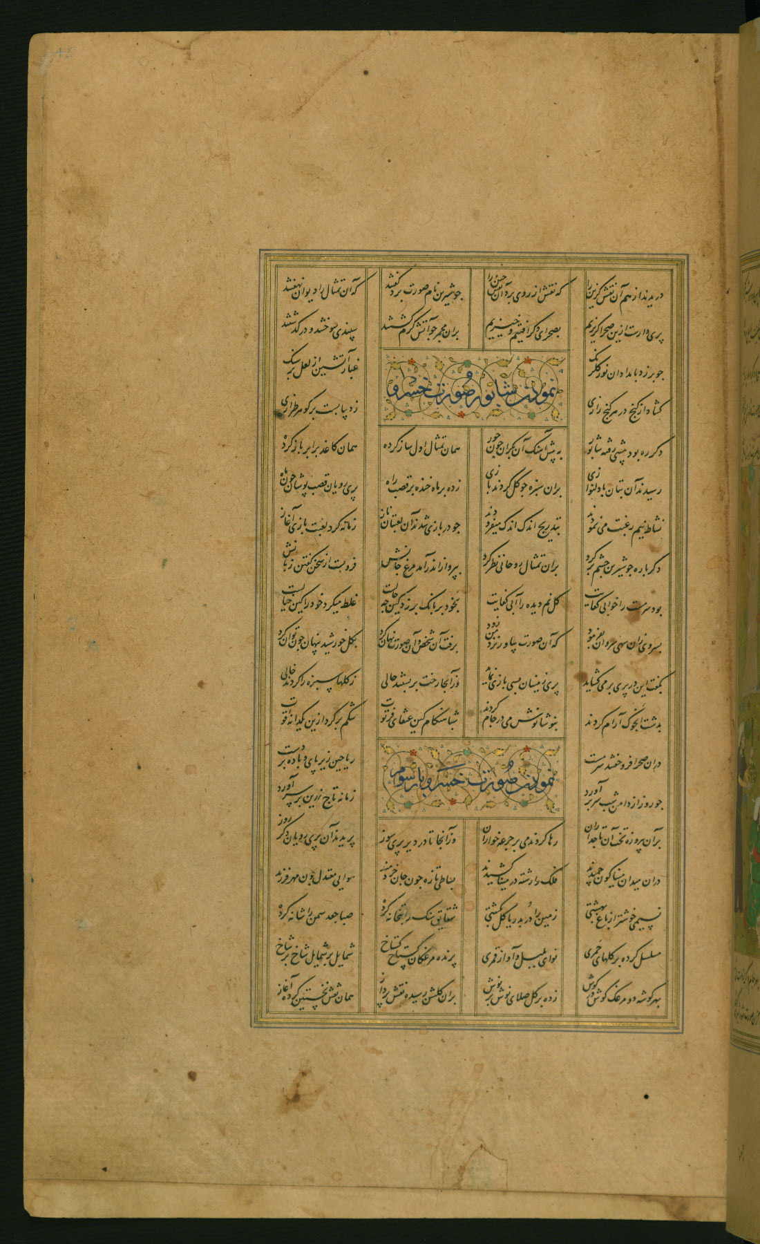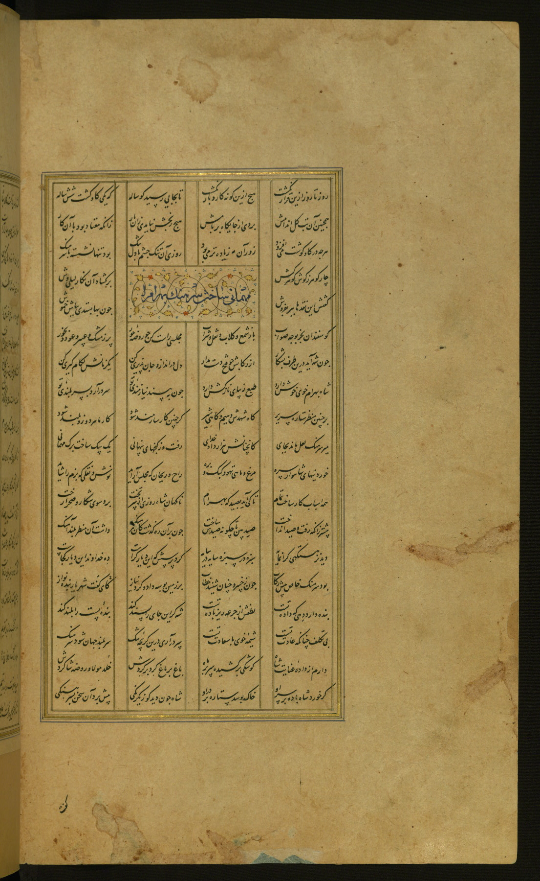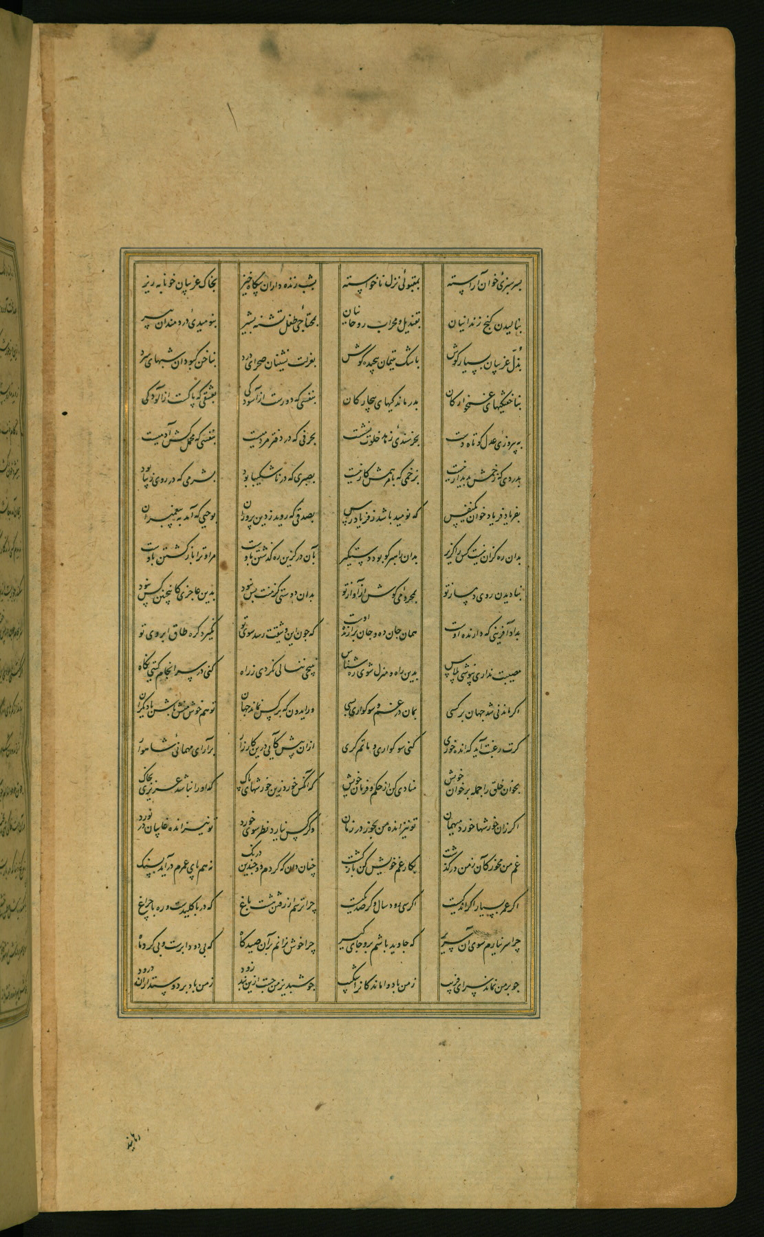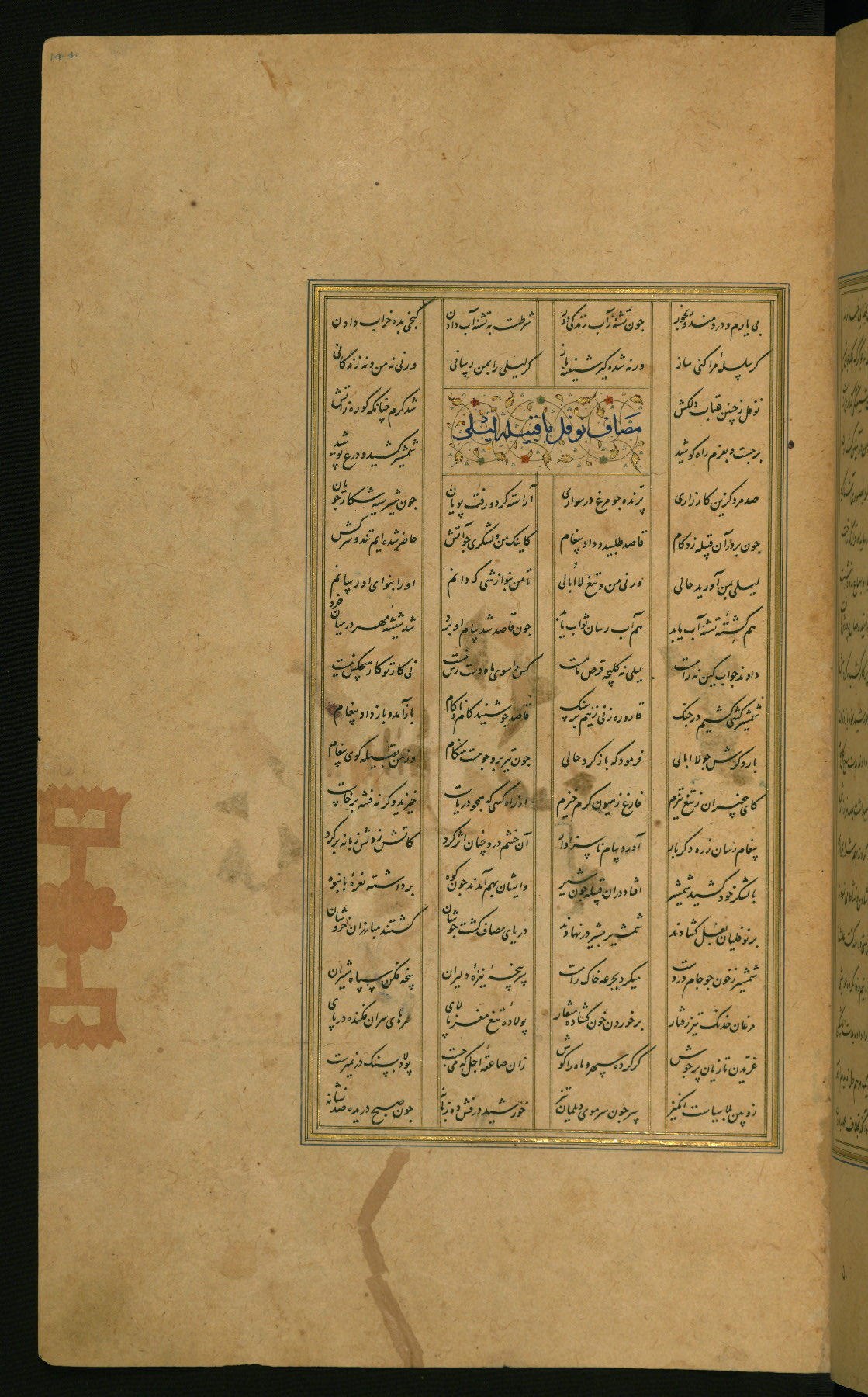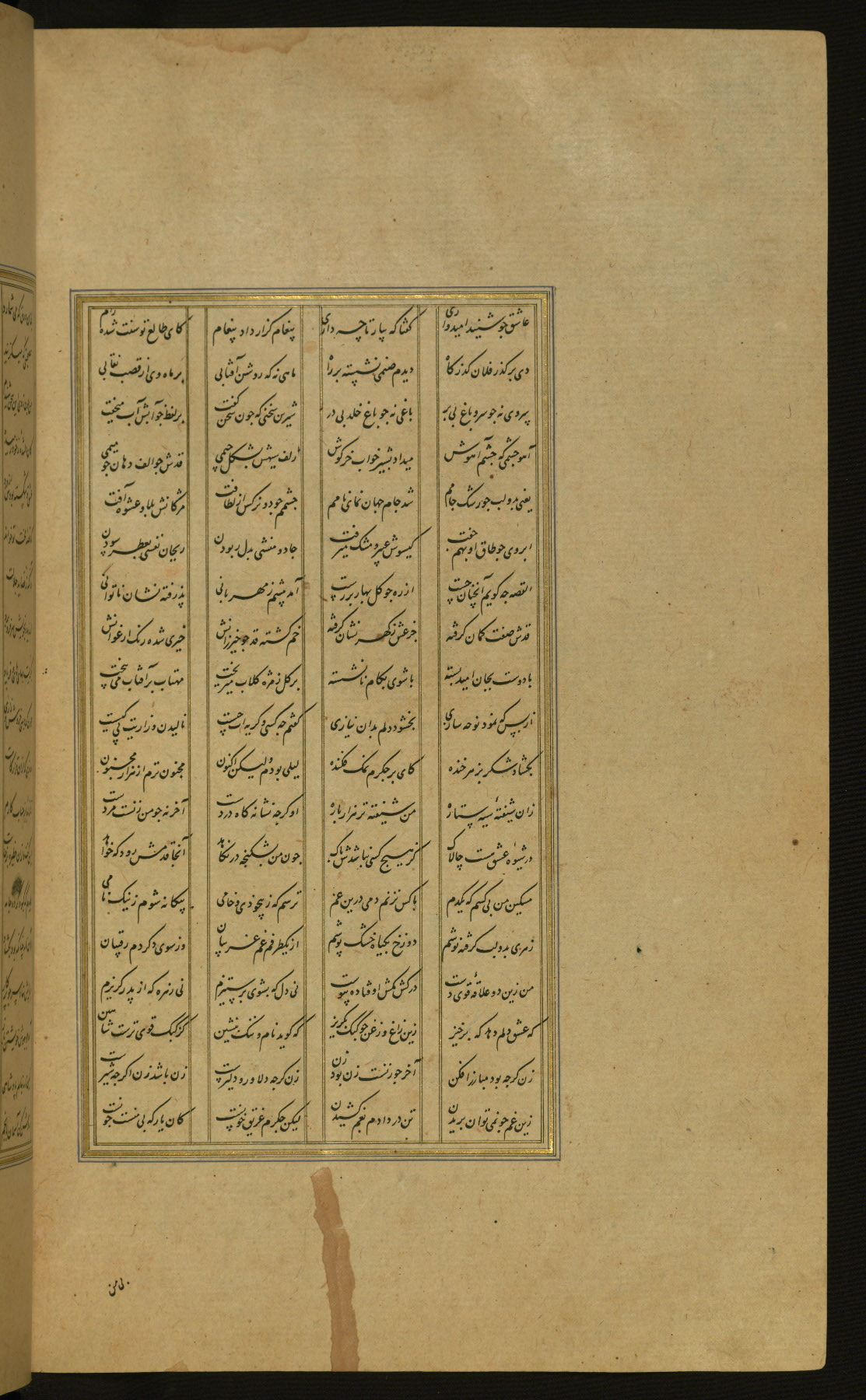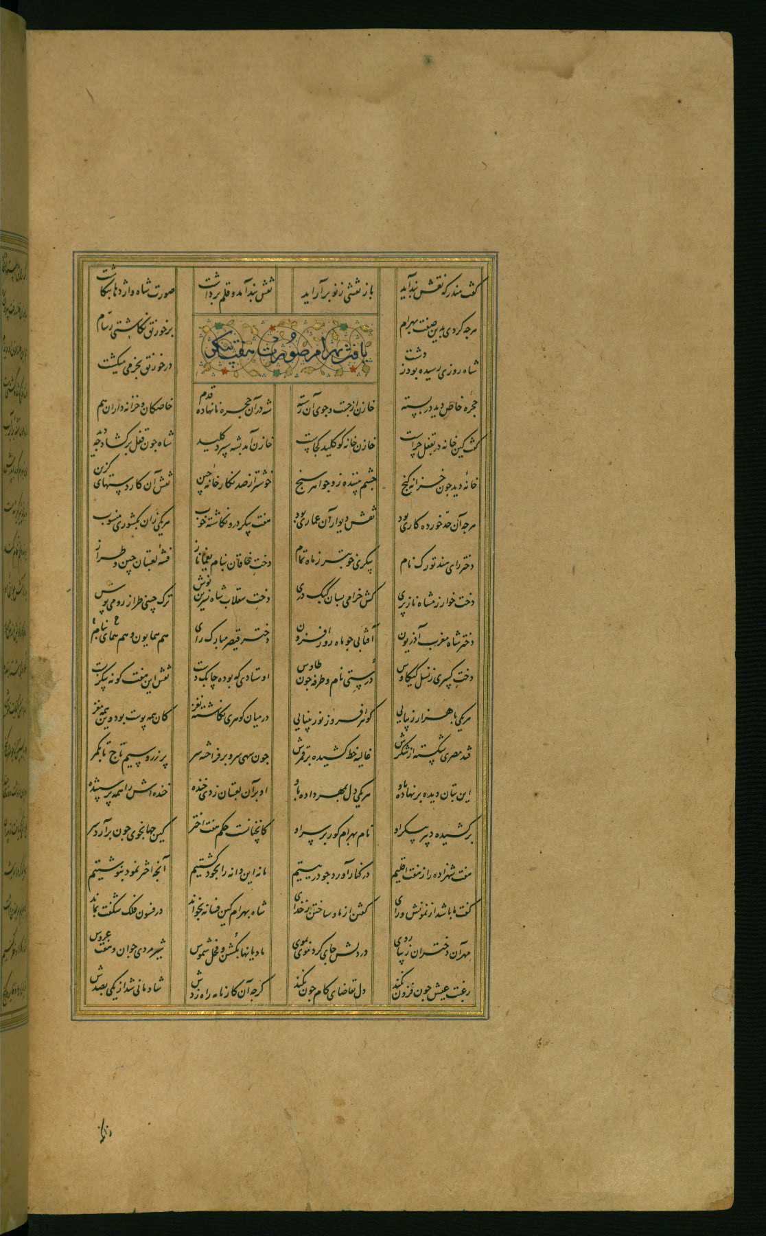 This illuminated and illustrated copy of the Khamsah (quintet) of Niẓāmī Ganjavī (d. 605 AH / 1209 CE) was written by Yār Muḥammad al-Haravī in 922 AH / 1516 CE. Written in four columns in black nastaʿlīq script, this manuscript opens with a double-page illuminated frontispiece signed by ʿAbd al-Wahhāb ibn ʿAbd al-Fattāḥ ibn ʿAlī. It contains thirty-five illustrations that were repainted in India during the twelfth century AH / eighteenth CE. The seal of Muḥammad Asharf ibn Muḥammad Khātam al-Ḥusaynī, dated 1173 AH / 1759-60 CE appears on fols. 1a and 401a. It is possible that the brown leather binding with center and side panels brushed with gold is original to the manuscript but was repaired at a later stage in the codex's history.