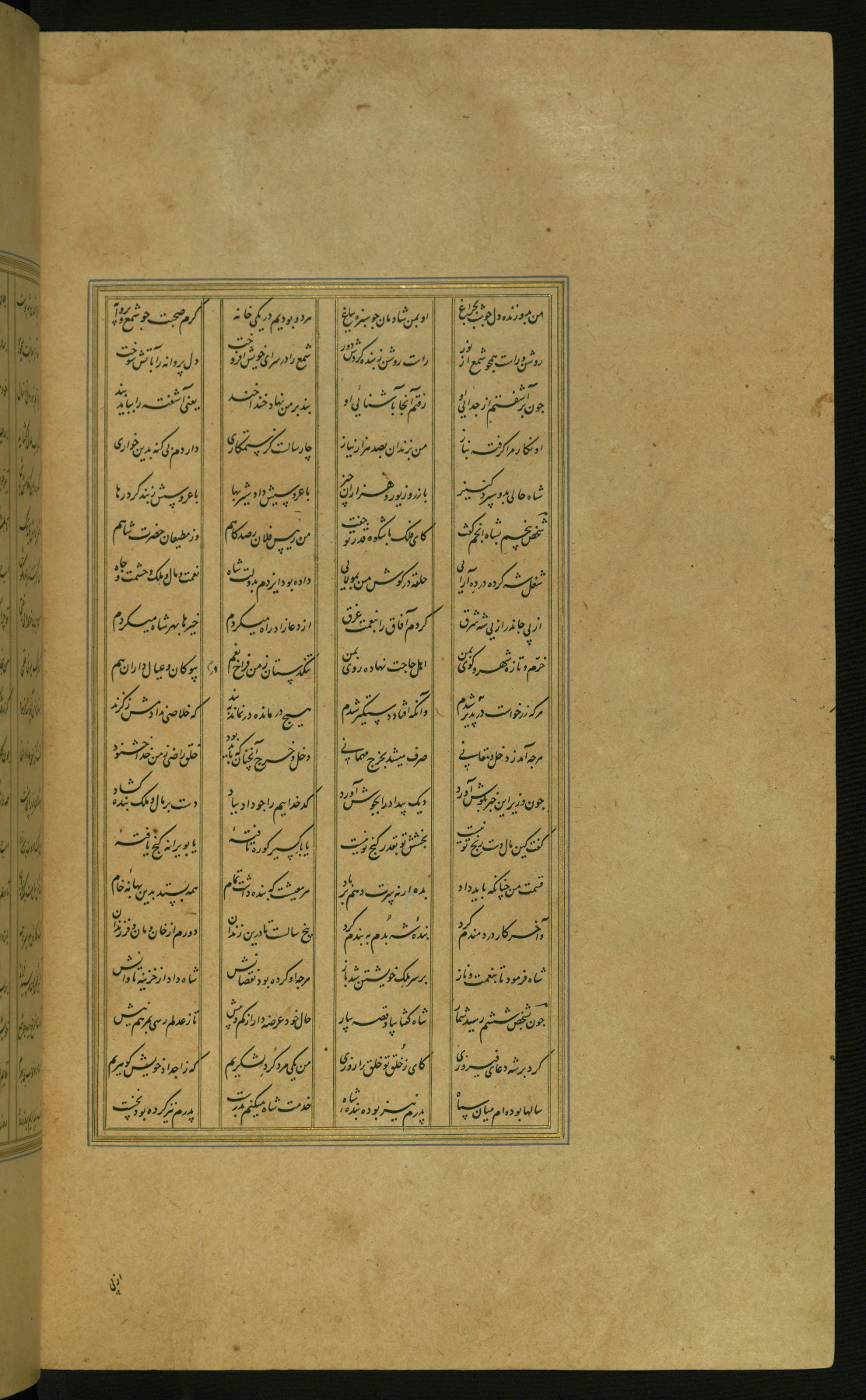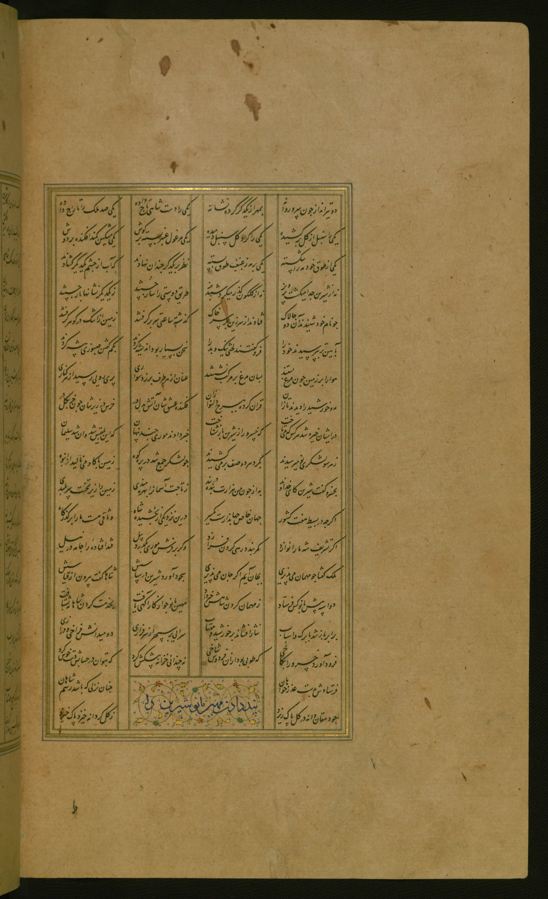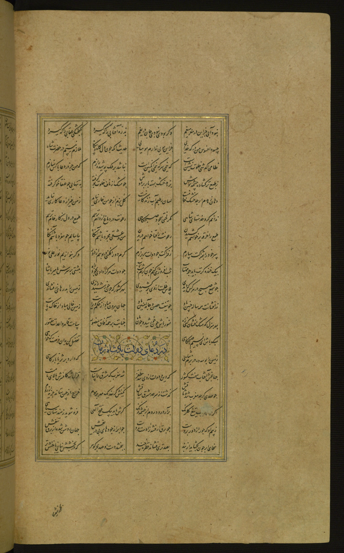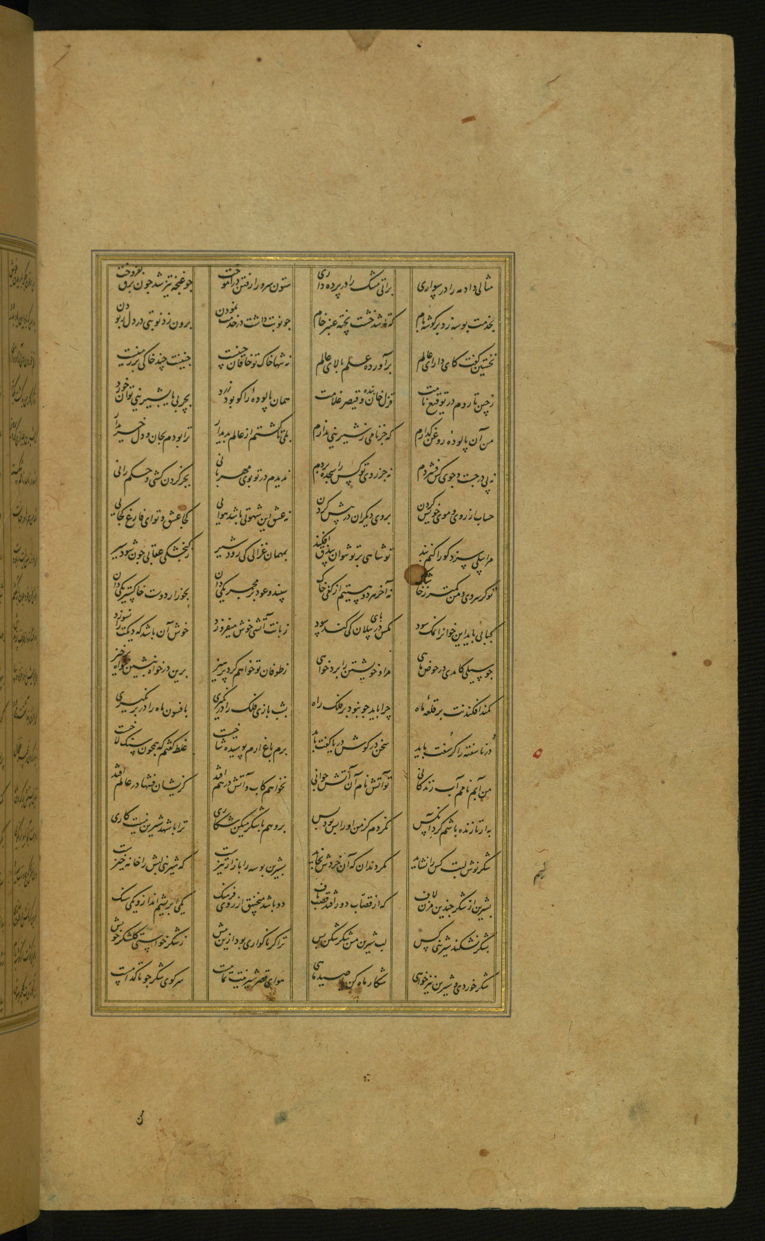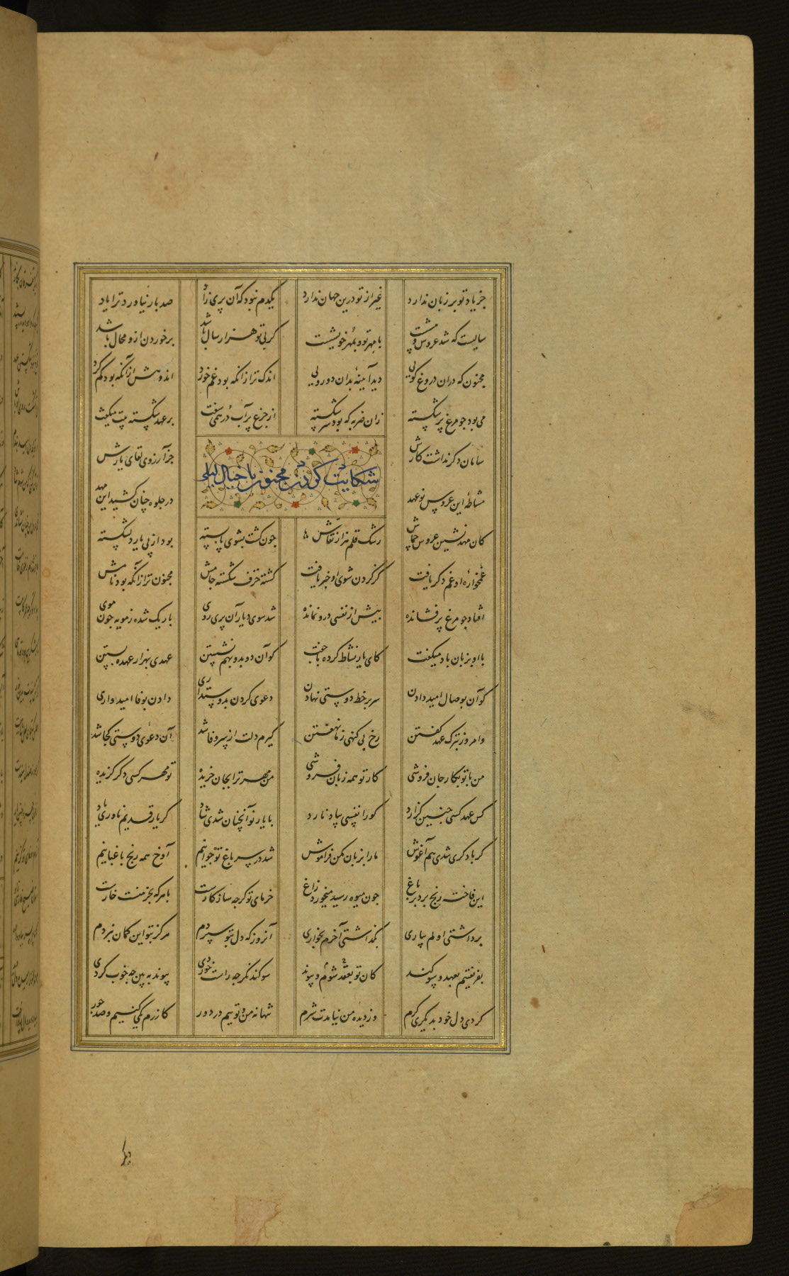 This illuminated and illustrated copy of the Khamsah (quintet) of Niẓāmī Ganjavī (d. 605 AH / 1209 CE) was written by Yār Muḥammad al-Haravī in 922 AH / 1516 CE. Written in four columns in black nastaʿlīq script, this manuscript opens with a double-page illuminated frontispiece signed by ʿAbd al-Wahhāb ibn ʿAbd al-Fattāḥ ibn ʿAlī. It contains thirty-five illustrations that were repainted in India during the twelfth century AH / eighteenth CE. The seal of Muḥammad Asharf ibn Muḥammad Khātam al-Ḥusaynī, dated 1173 AH / 1759-60 CE appears on fols. 1a and 401a. It is possible that the brown leather binding with center and side panels brushed with gold is original to the manuscript but was repaired at a later stage in the codex's history.