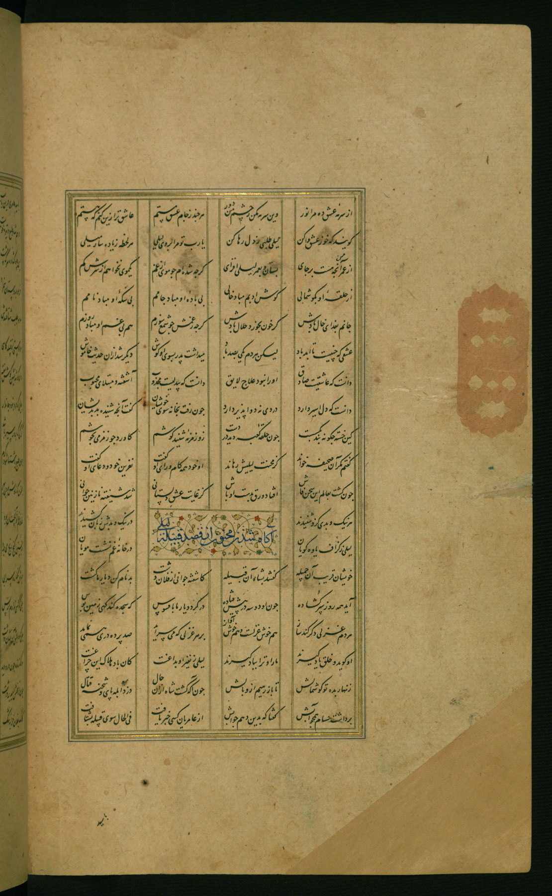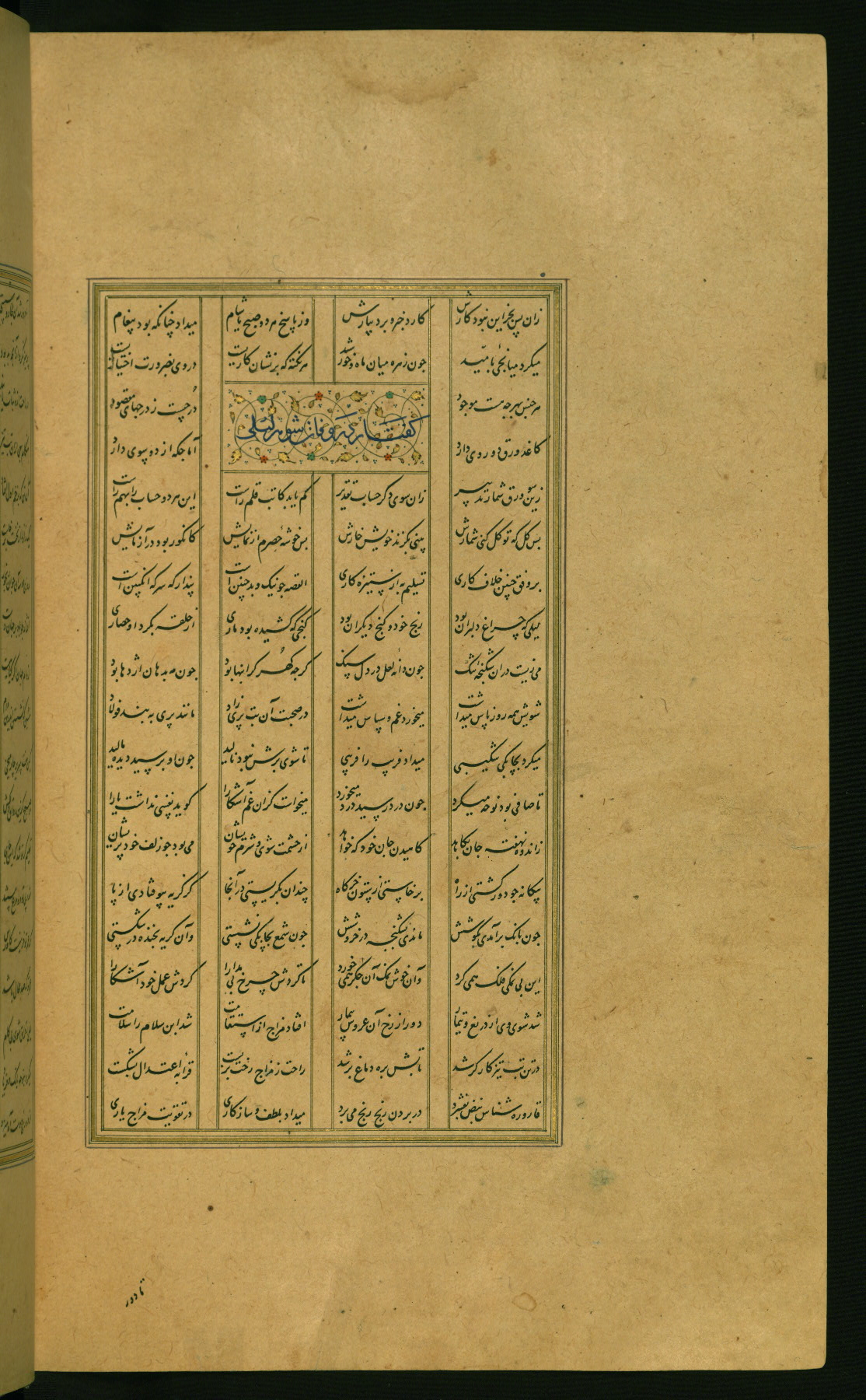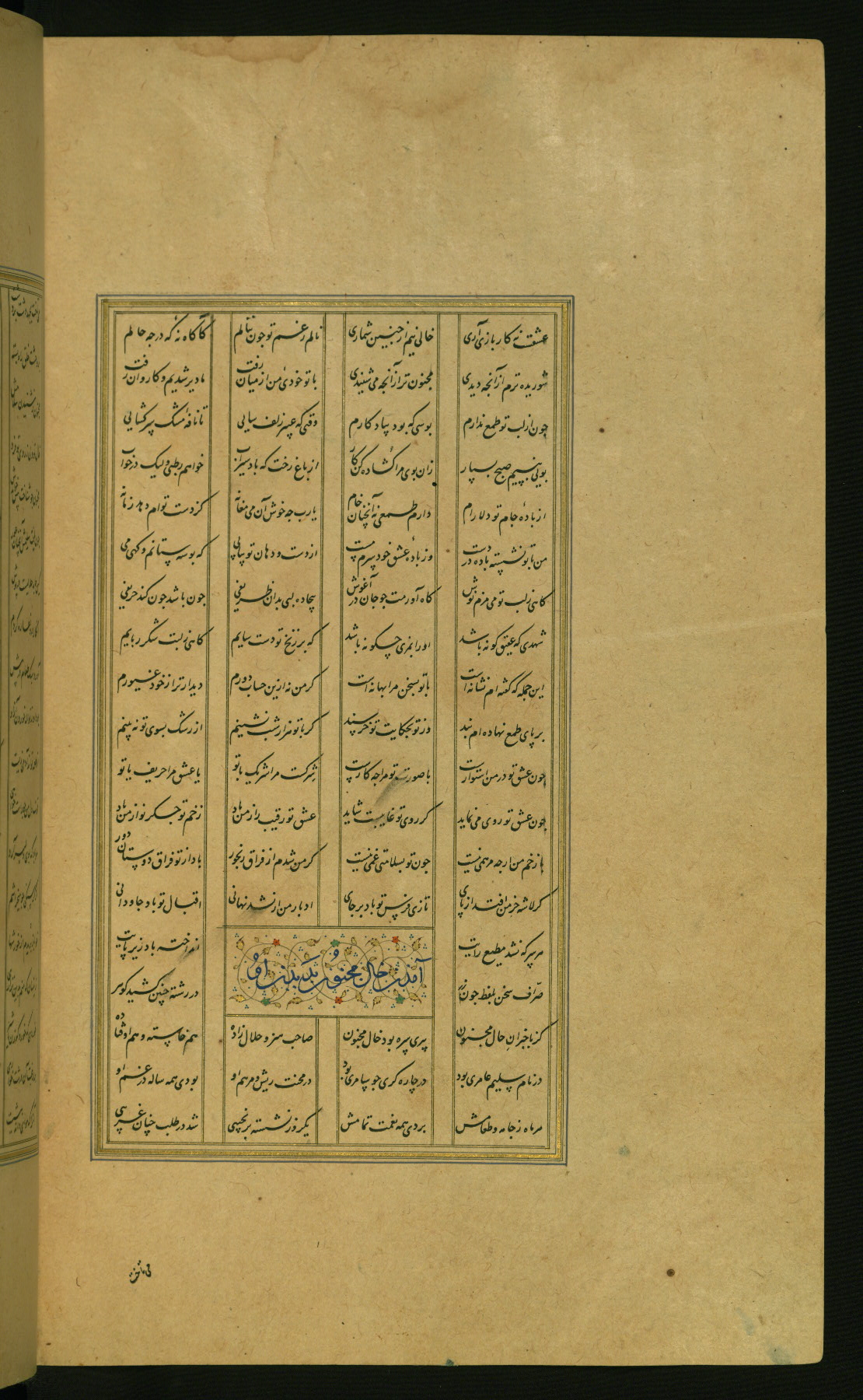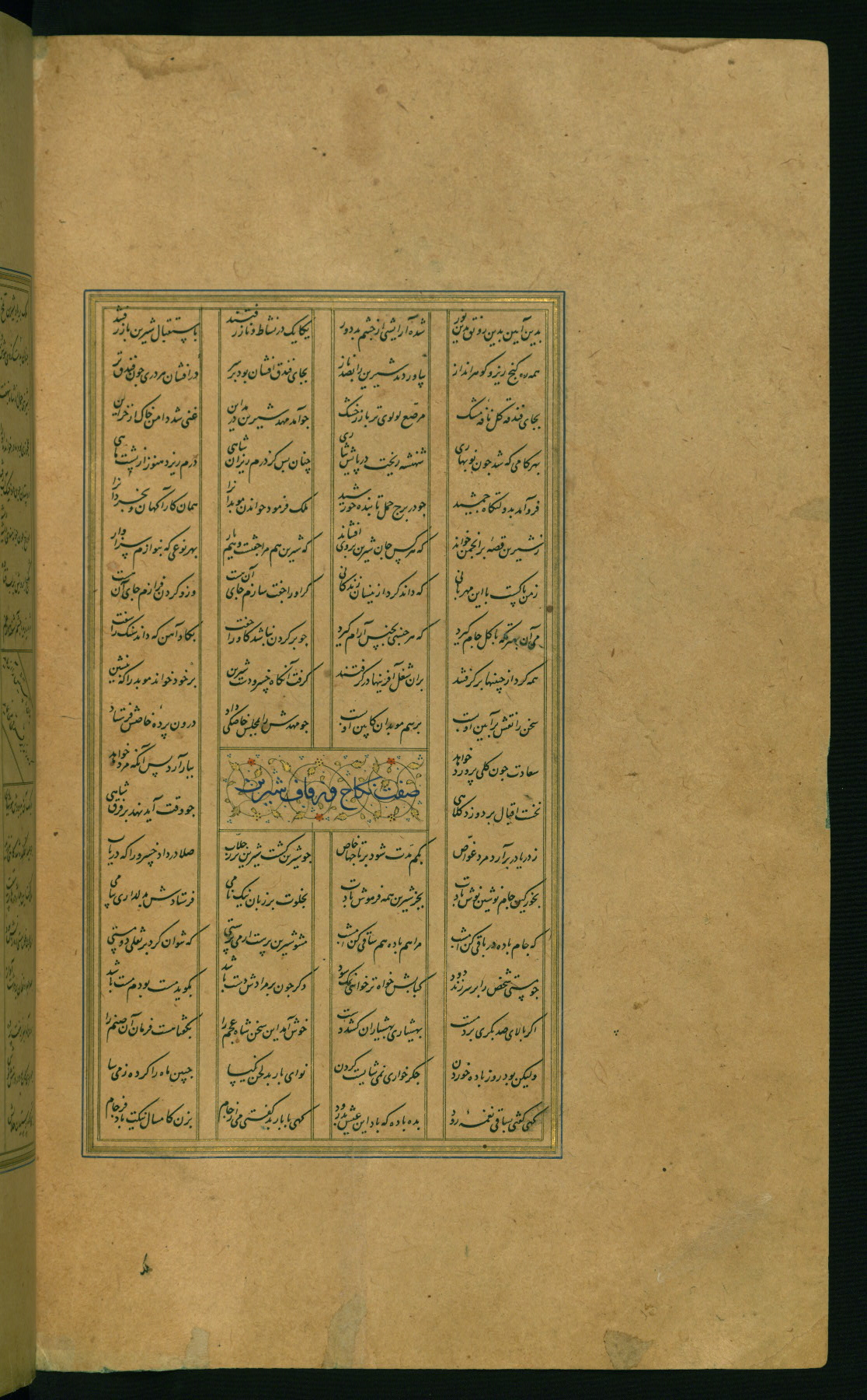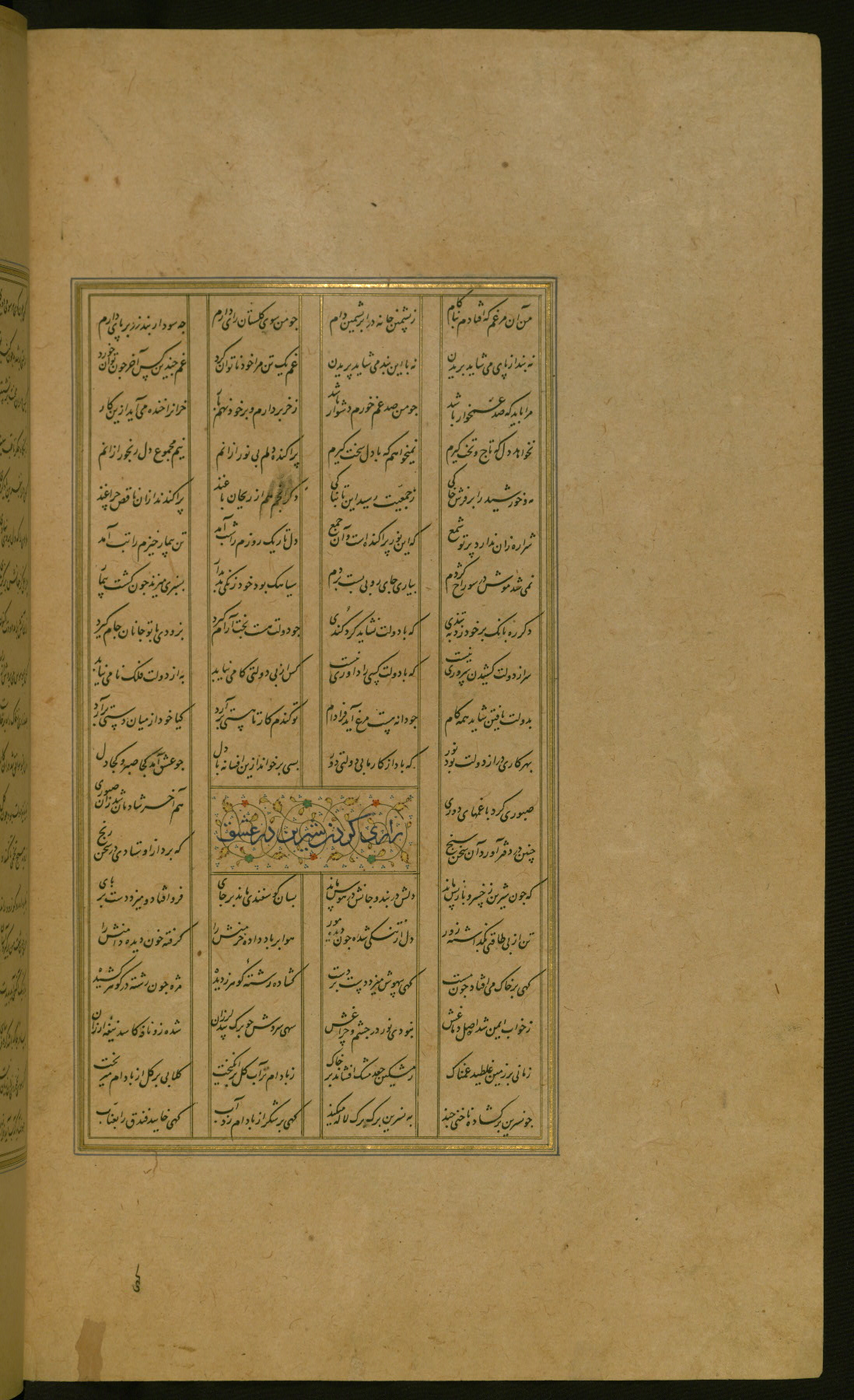 This illuminated and illustrated copy of the Khamsah (quintet) of Niẓāmī Ganjavī (d. 605 AH / 1209 CE) was written by Yār Muḥammad al-Haravī in 922 AH / 1516 CE. Written in four columns in black nastaʿlīq script, this manuscript opens with a double-page illuminated frontispiece signed by ʿAbd al-Wahhāb ibn ʿAbd al-Fattāḥ ibn ʿAlī. It contains thirty-five illustrations that were repainted in India during the twelfth century AH / eighteenth CE. The seal of Muḥammad Asharf ibn Muḥammad Khātam al-Ḥusaynī, dated 1173 AH / 1759-60 CE appears on fols. 1a and 401a. It is possible that the brown leather binding with center and side panels brushed with gold is original to the manuscript but was repaired at a later stage in the codex's history.