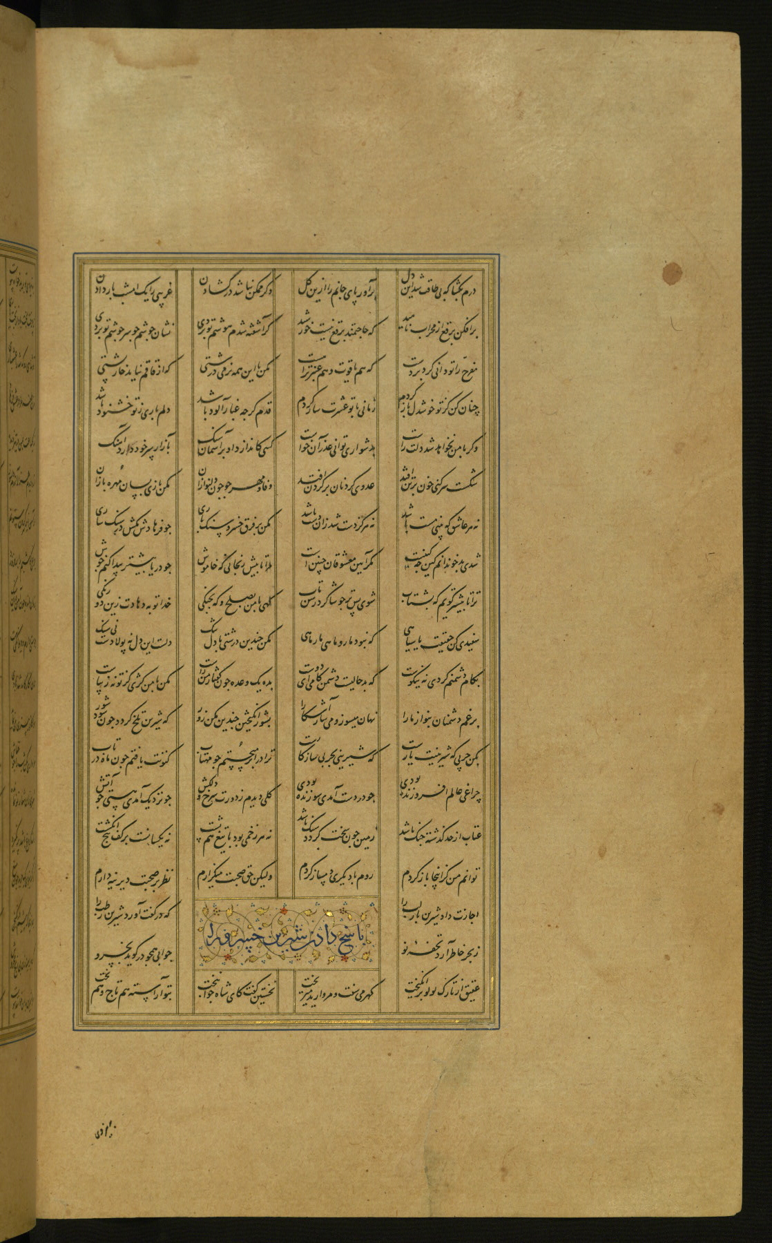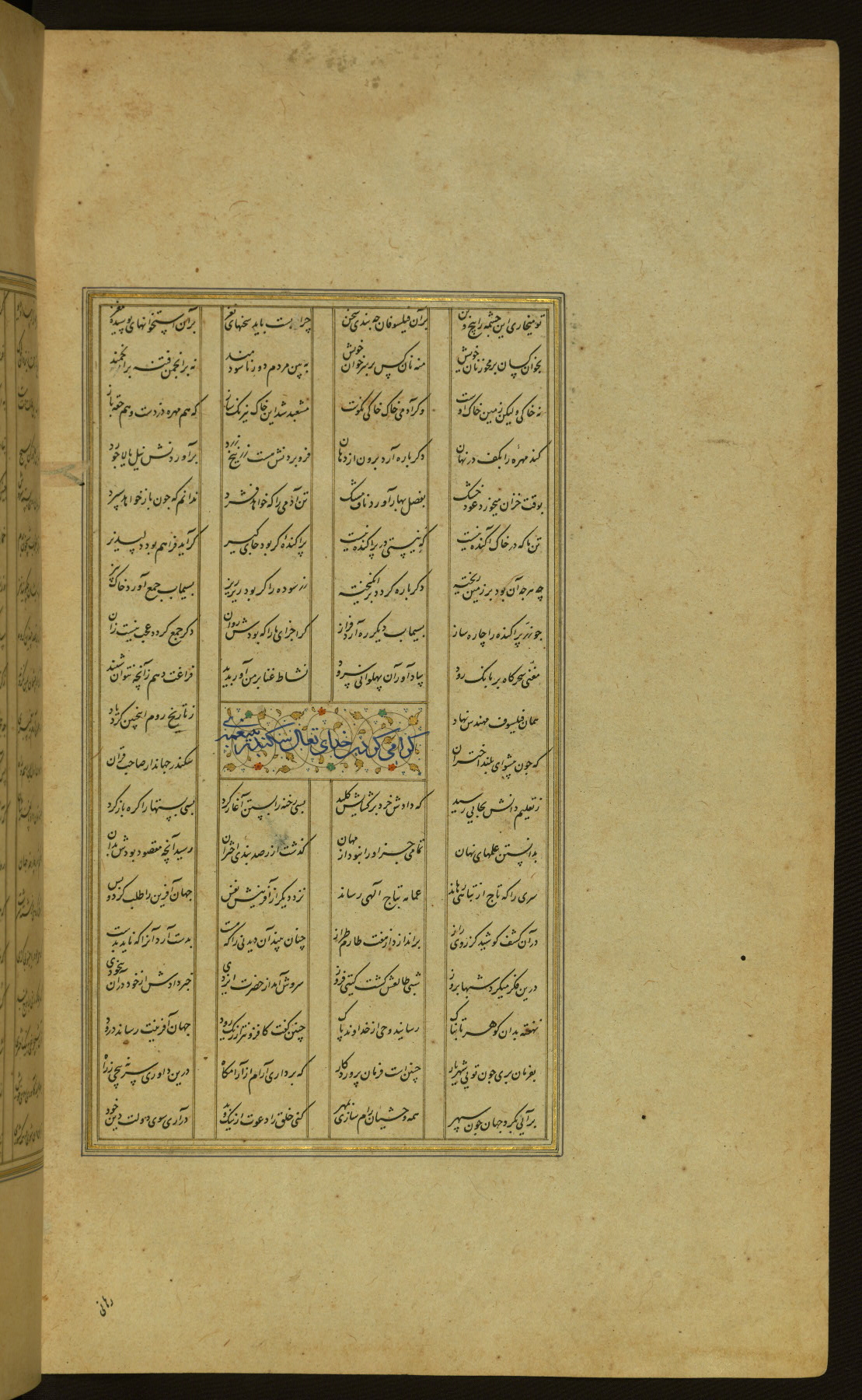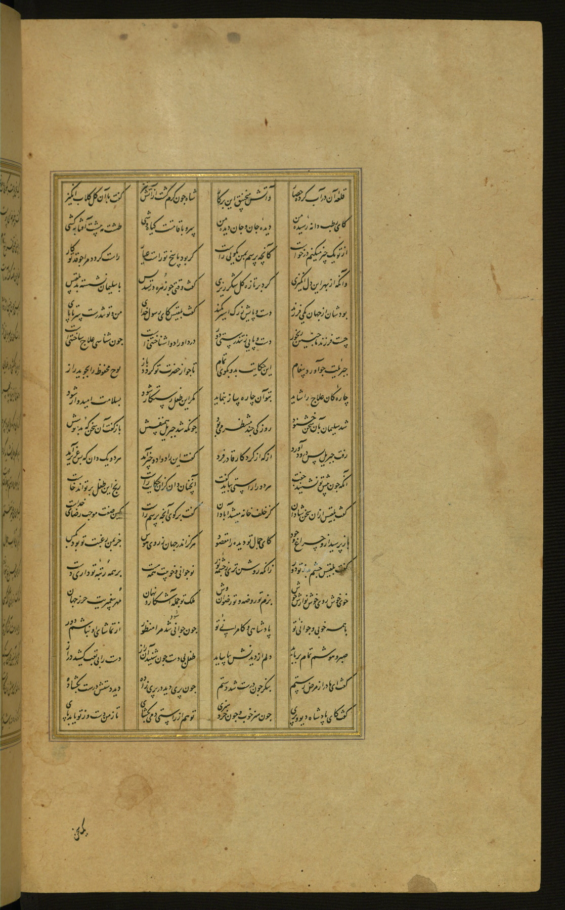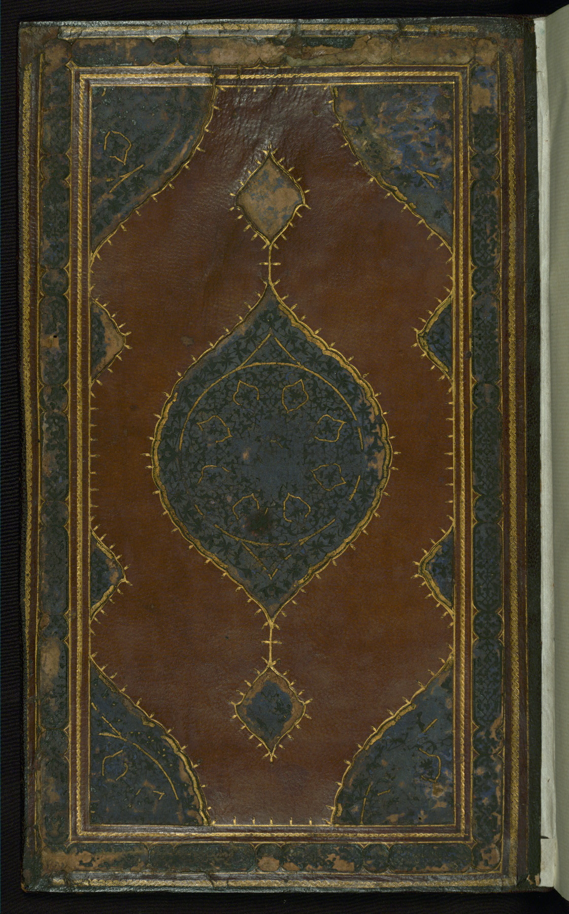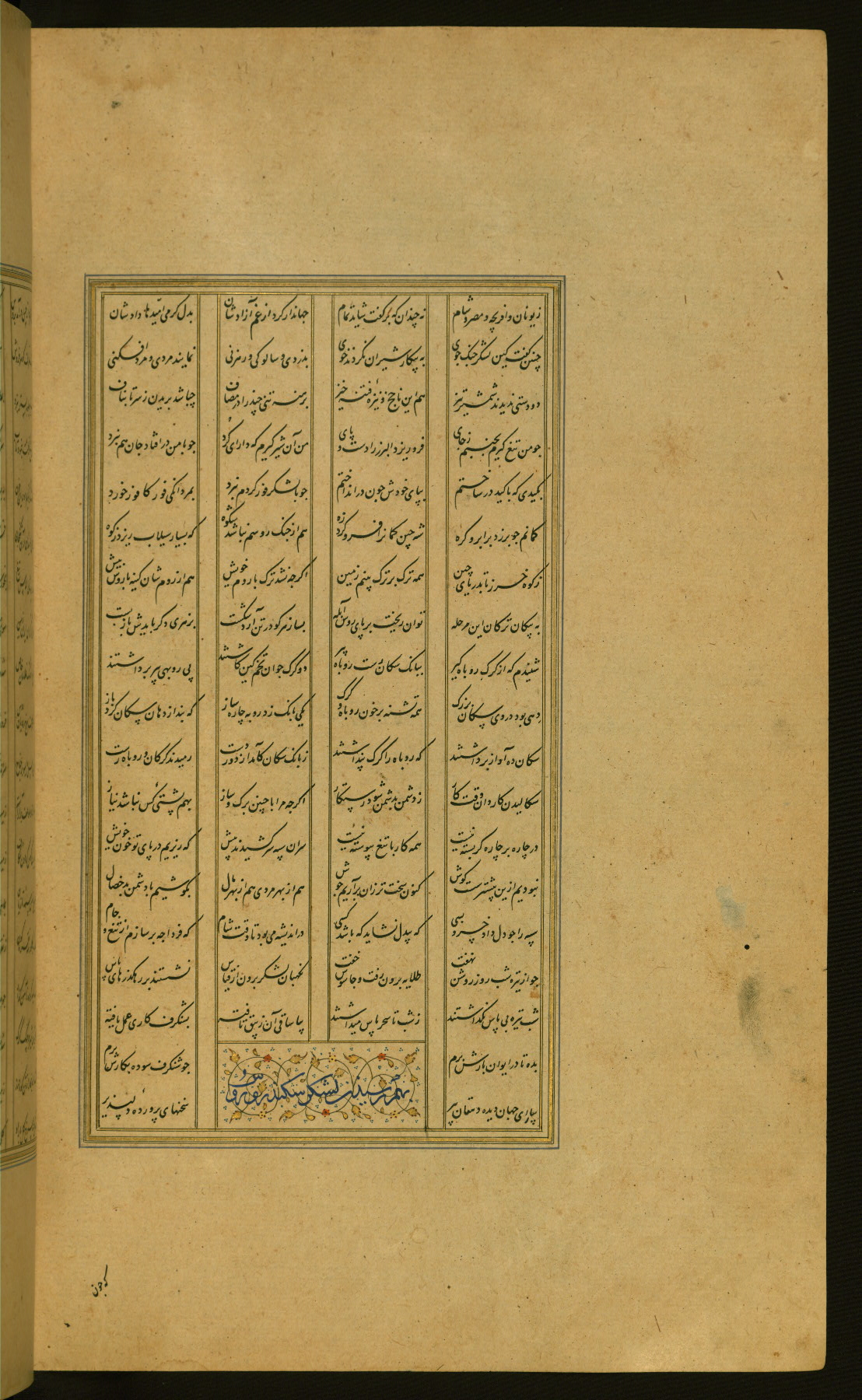 This illuminated and illustrated copy of the Khamsah (quintet) of Niẓāmī Ganjavī (d. 605 AH / 1209 CE) was written by Yār Muḥammad al-Haravī in 922 AH / 1516 CE. Written in four columns in black nastaʿlīq script, this manuscript opens with a double-page illuminated frontispiece signed by ʿAbd al-Wahhāb ibn ʿAbd al-Fattāḥ ibn ʿAlī. It contains thirty-five illustrations that were repainted in India during the twelfth century AH / eighteenth CE. The seal of Muḥammad Asharf ibn Muḥammad Khātam al-Ḥusaynī, dated 1173 AH / 1759-60 CE appears on fols. 1a and 401a. It is possible that the brown leather binding with center and side panels brushed with gold is original to the manuscript but was repaired at a later stage in the codex's history.