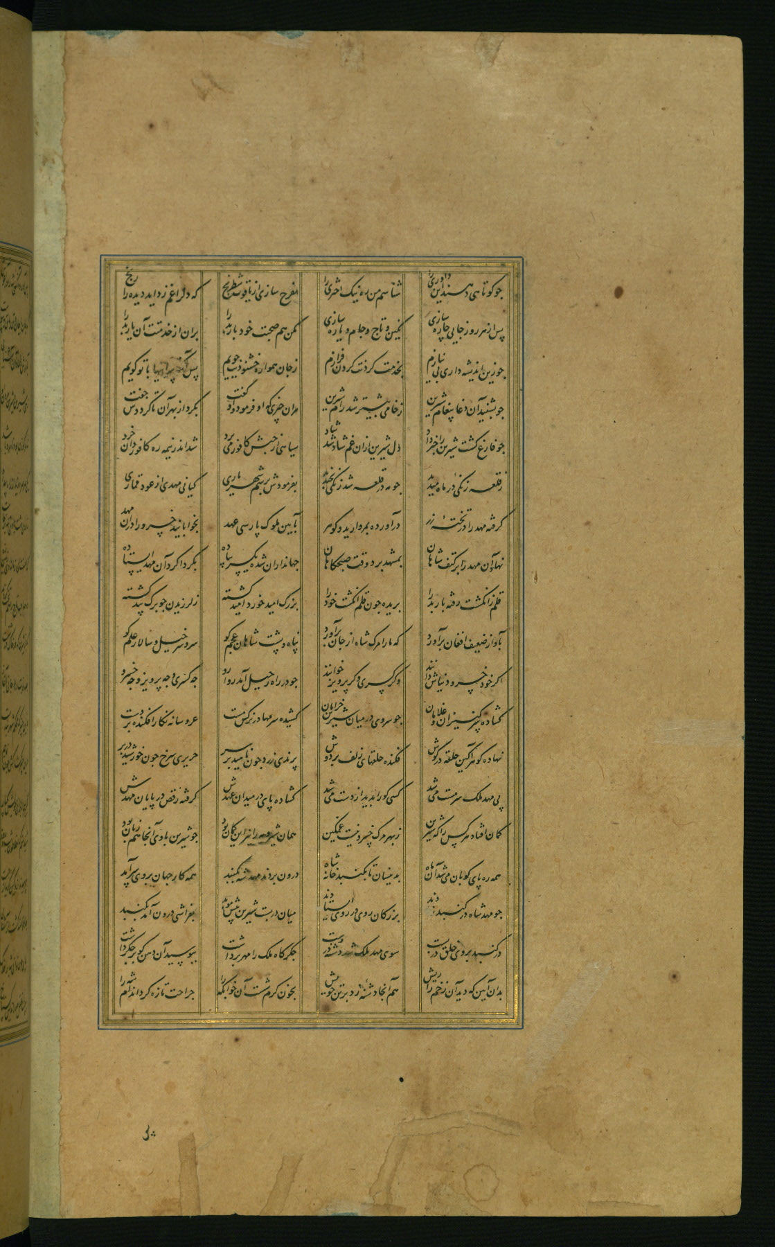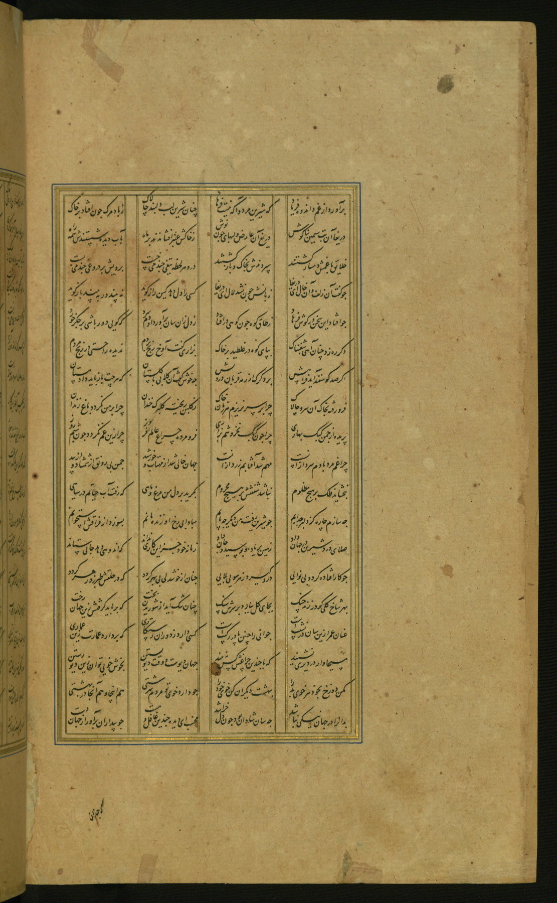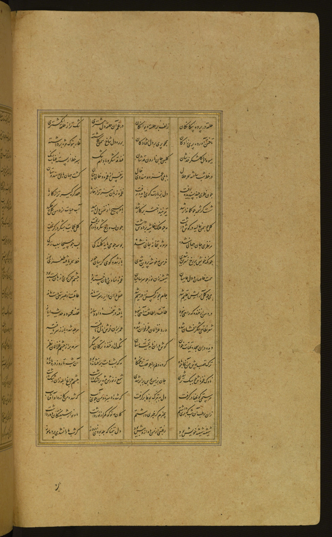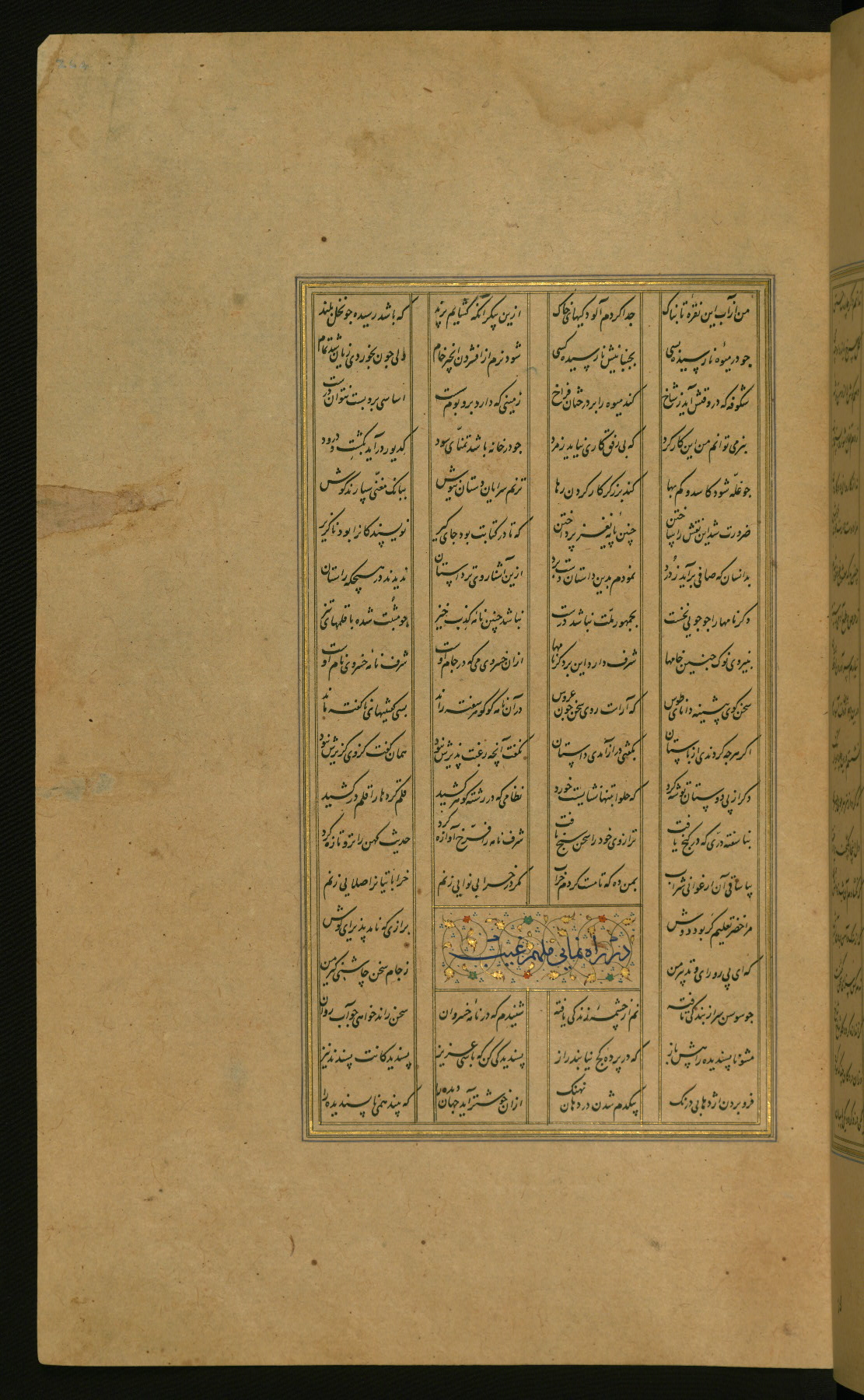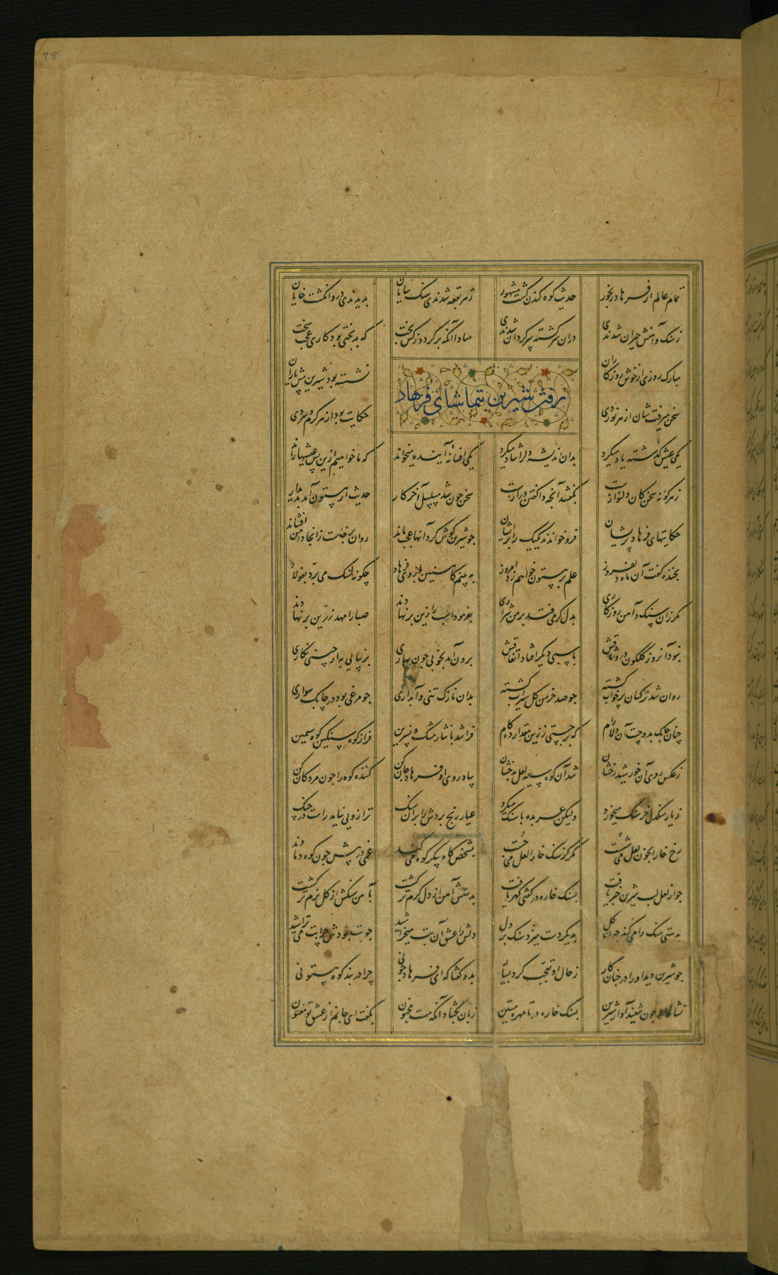 This illuminated and illustrated copy of the Khamsah (quintet) of Niẓāmī Ganjavī (d. 605 AH / 1209 CE) was written by Yār Muḥammad al-Haravī in 922 AH / 1516 CE. Written in four columns in black nastaʿlīq script, this manuscript opens with a double-page illuminated frontispiece signed by ʿAbd al-Wahhāb ibn ʿAbd al-Fattāḥ ibn ʿAlī. It contains thirty-five illustrations that were repainted in India during the twelfth century AH / eighteenth CE. The seal of Muḥammad Asharf ibn Muḥammad Khātam al-Ḥusaynī, dated 1173 AH / 1759-60 CE appears on fols. 1a and 401a. It is possible that the brown leather binding with center and side panels brushed with gold is original to the manuscript but was repaired at a later stage in the codex's history.