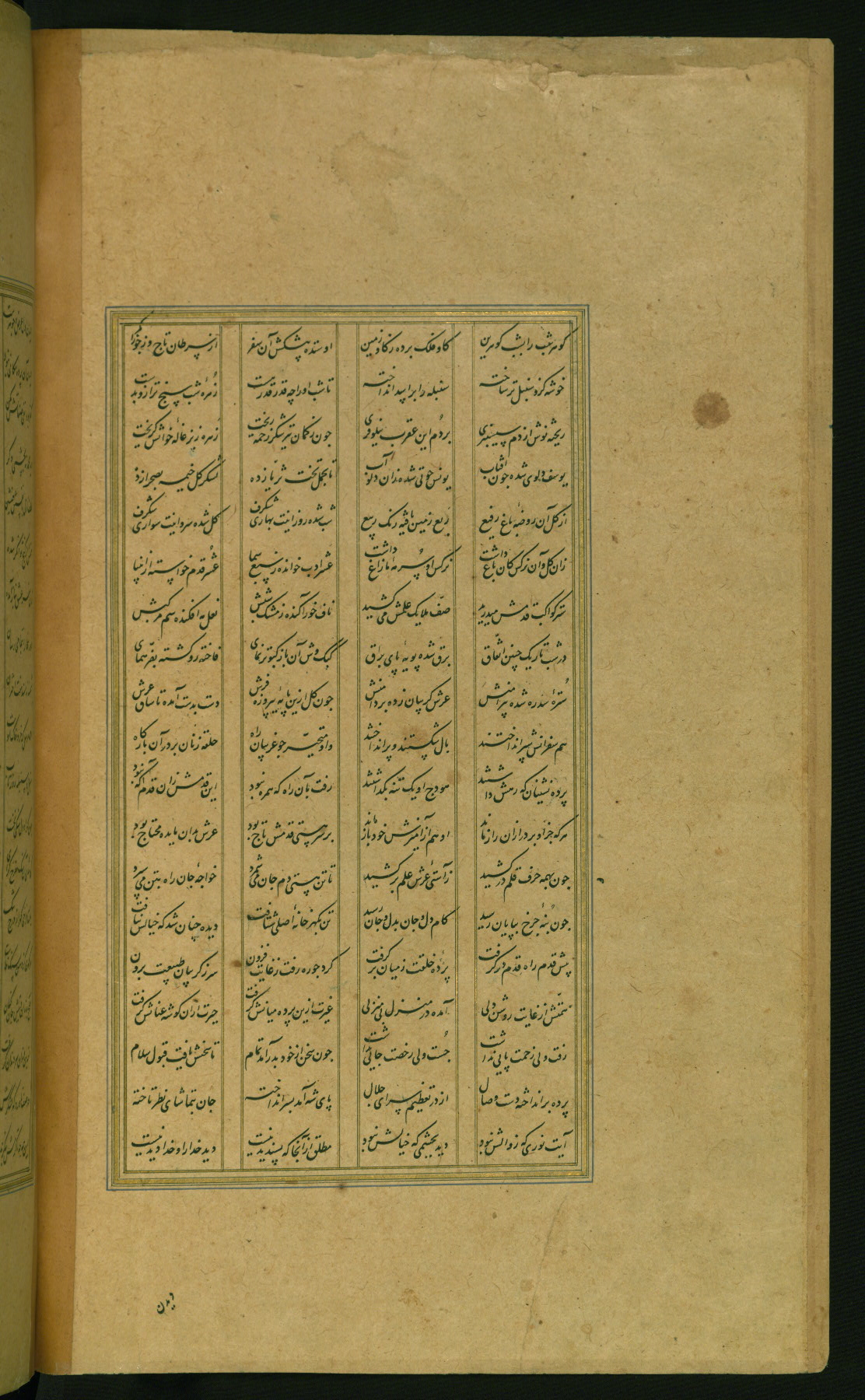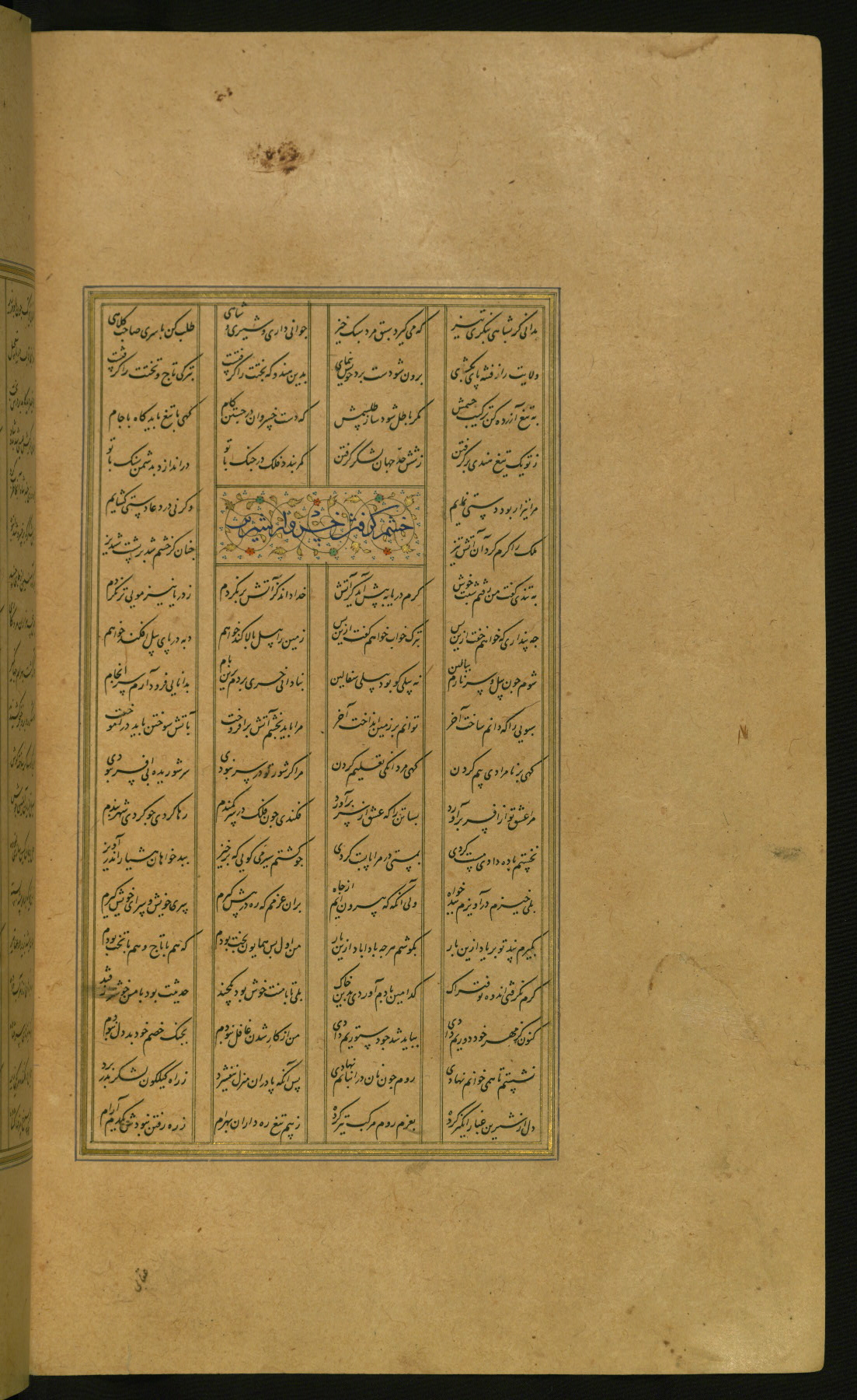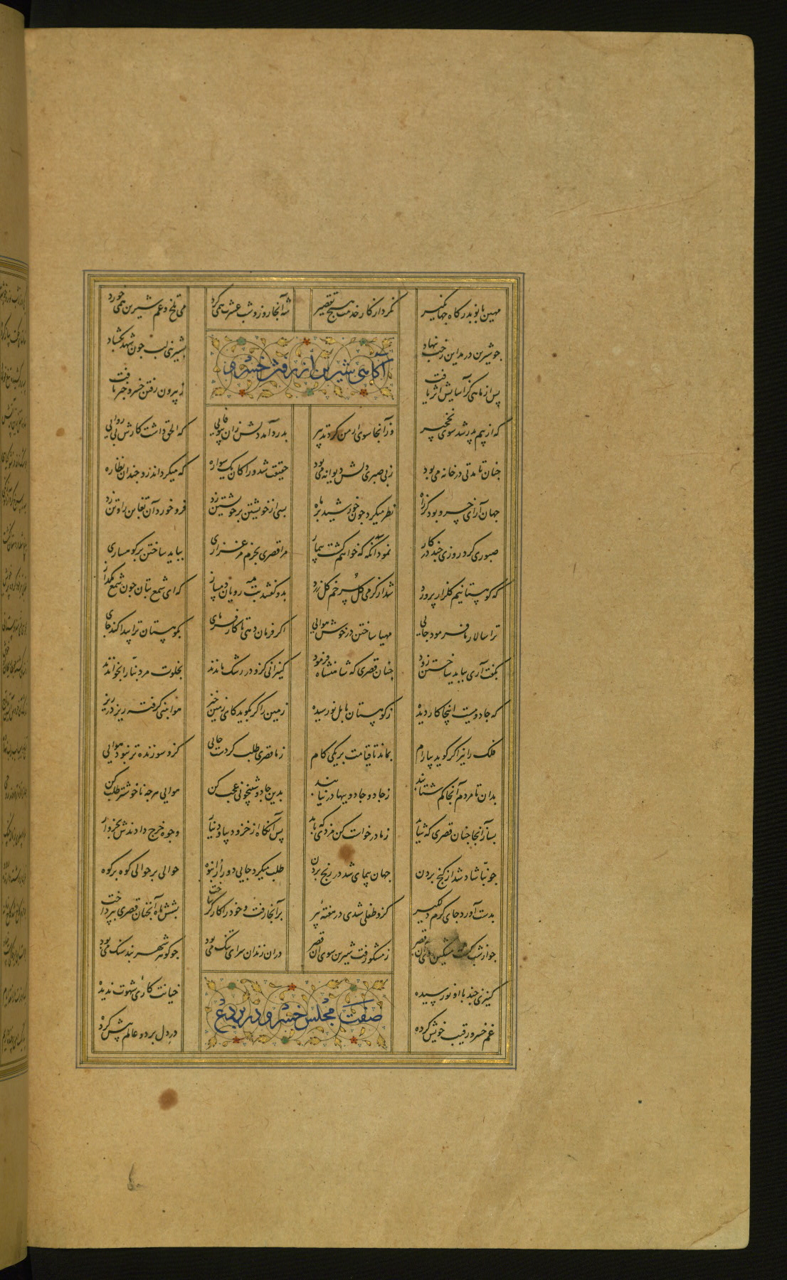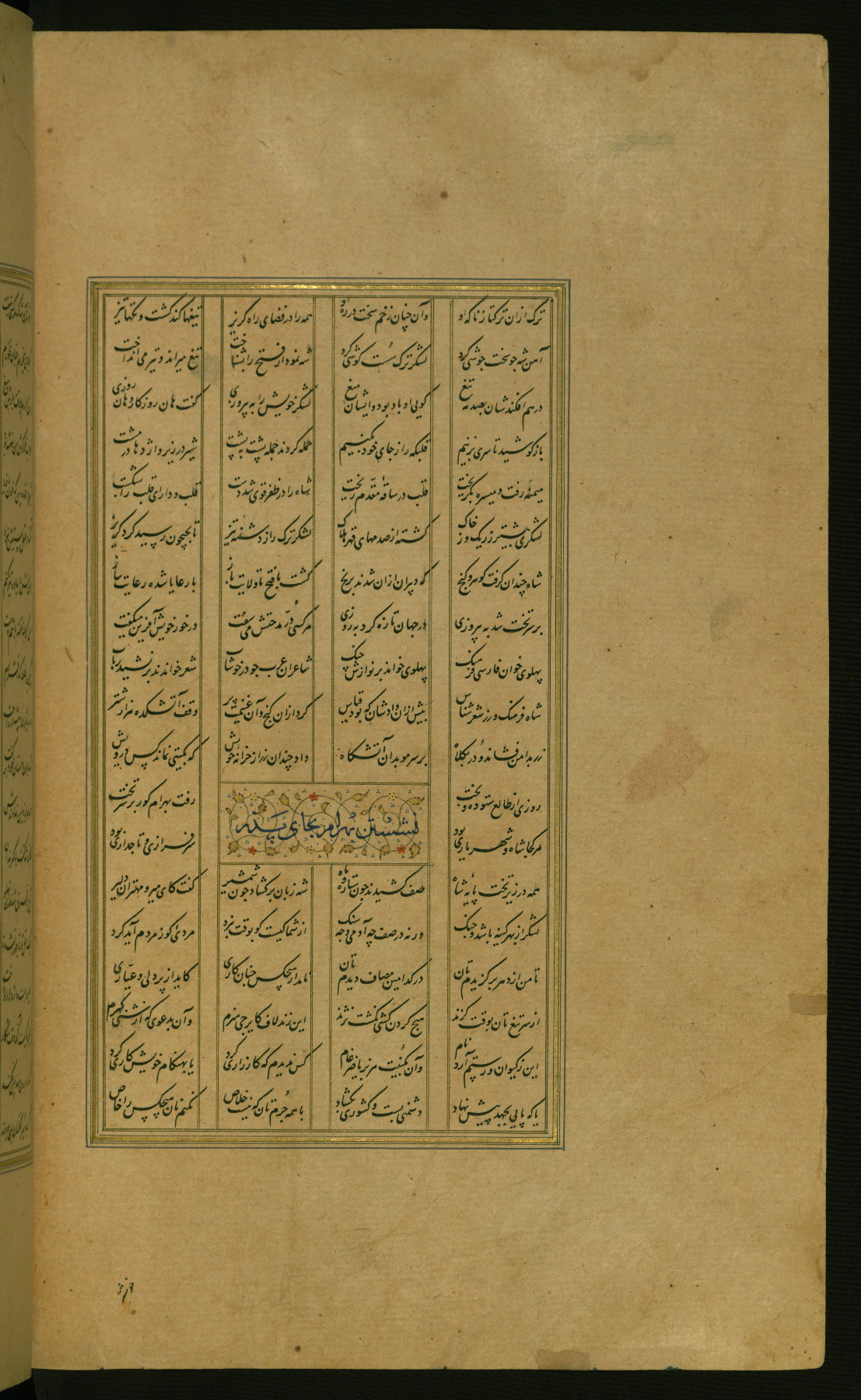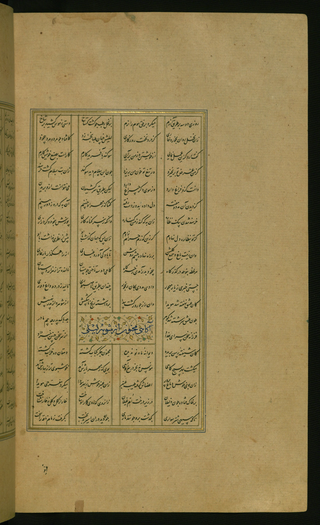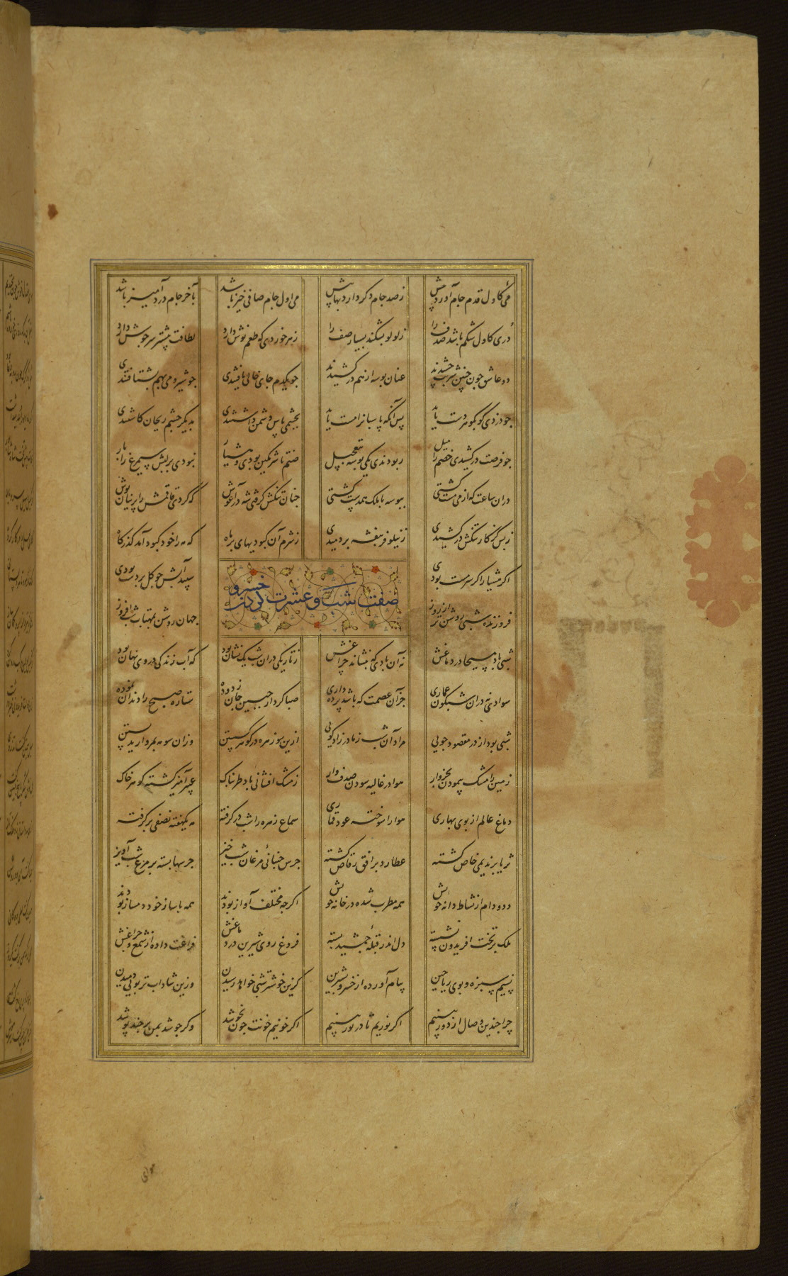 This illuminated and illustrated copy of the Khamsah (quintet) of Niẓāmī Ganjavī (d. 605 AH / 1209 CE) was written by Yār Muḥammad al-Haravī in 922 AH / 1516 CE. Written in four columns in black nastaʿlīq script, this manuscript opens with a double-page illuminated frontispiece signed by ʿAbd al-Wahhāb ibn ʿAbd al-Fattāḥ ibn ʿAlī. It contains thirty-five illustrations that were repainted in India during the twelfth century AH / eighteenth CE. The seal of Muḥammad Asharf ibn Muḥammad Khātam al-Ḥusaynī, dated 1173 AH / 1759-60 CE appears on fols. 1a and 401a. It is possible that the brown leather binding with center and side panels brushed with gold is original to the manuscript but was repaired at a later stage in the codex's history.