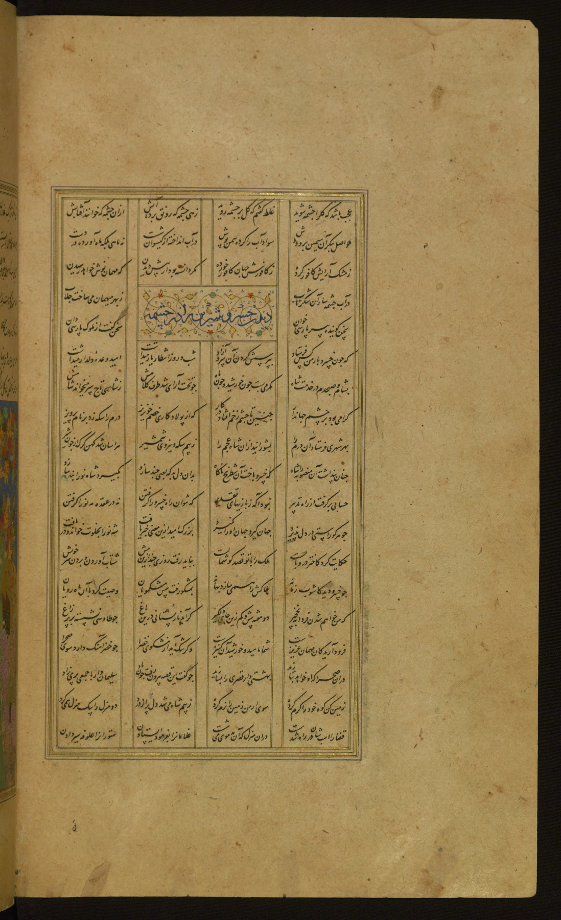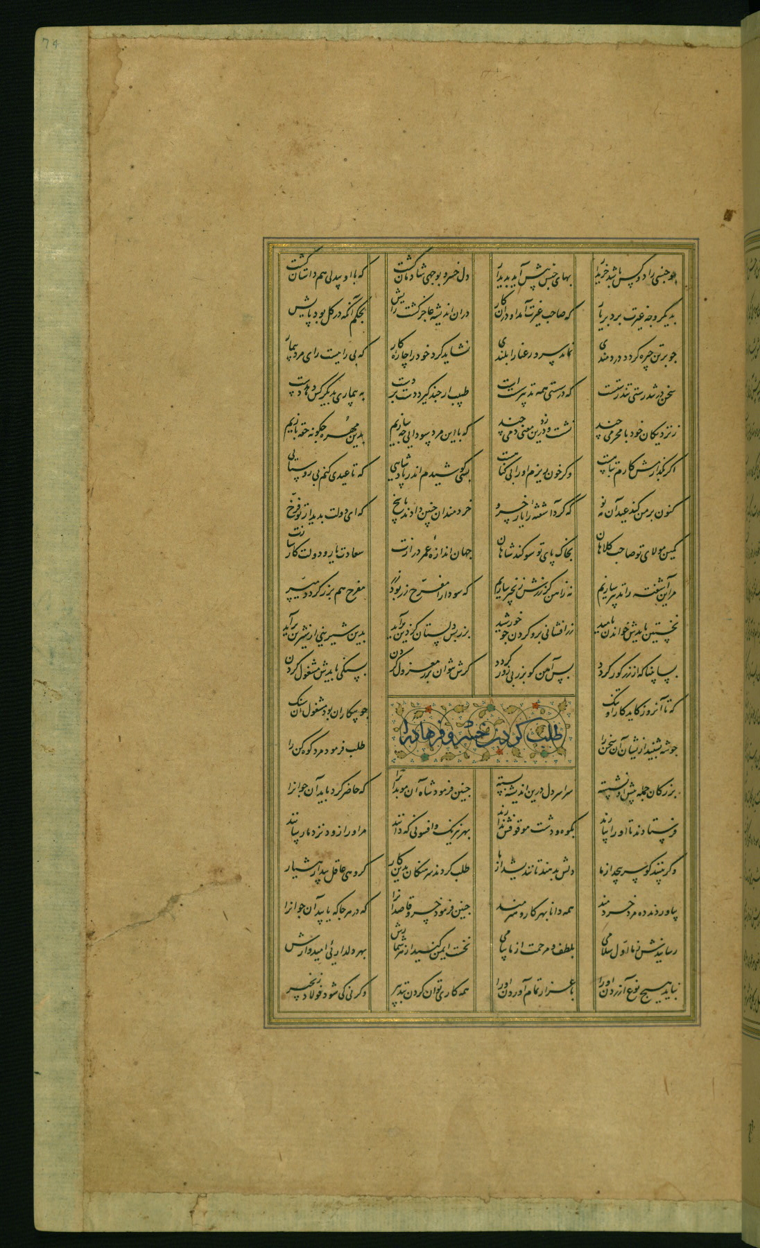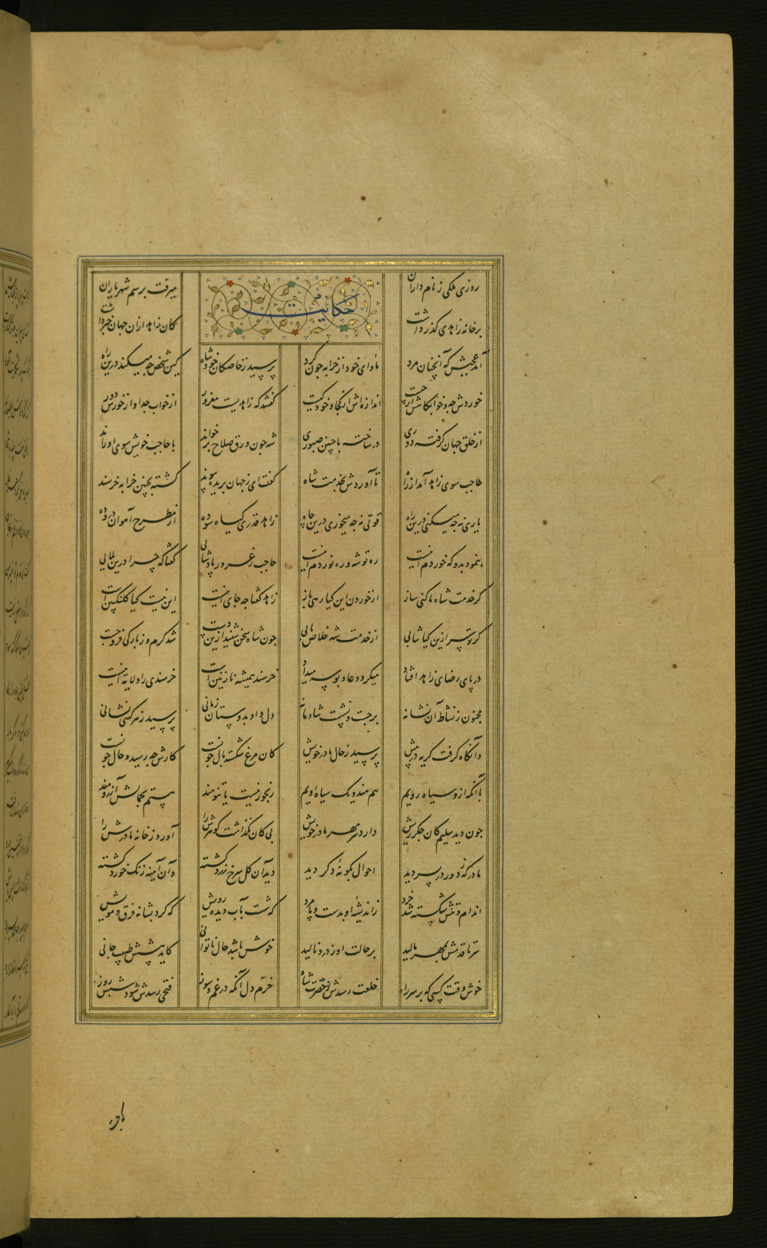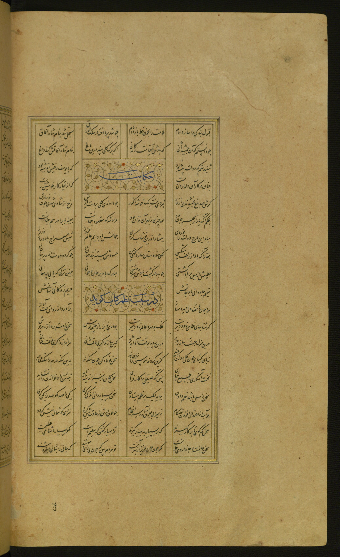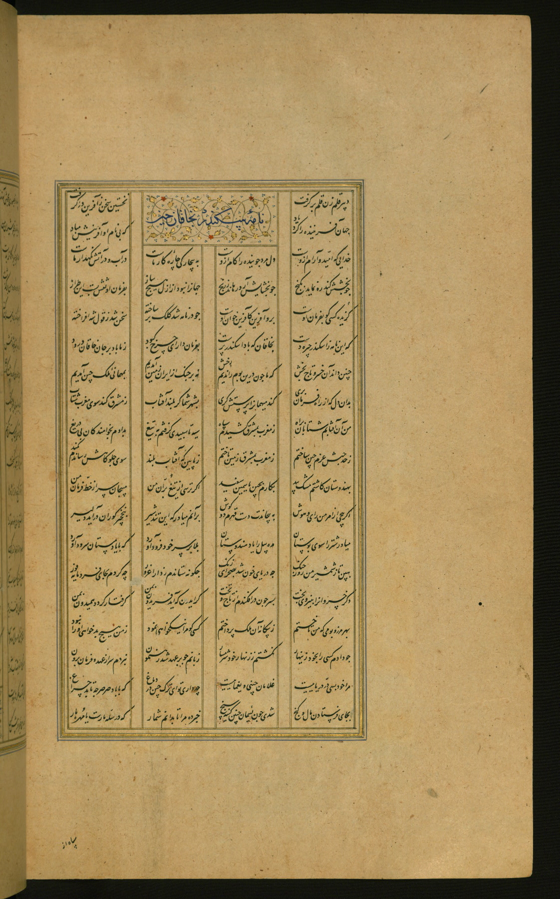 This illuminated and illustrated copy of the Khamsah (quintet) of Niẓāmī Ganjavī (d. 605 AH / 1209 CE) was written by Yār Muḥammad al-Haravī in 922 AH / 1516 CE. Written in four columns in black nastaʿlīq script, this manuscript opens with a double-page illuminated frontispiece signed by ʿAbd al-Wahhāb ibn ʿAbd al-Fattāḥ ibn ʿAlī. It contains thirty-five illustrations that were repainted in India during the twelfth century AH / eighteenth CE. The seal of Muḥammad Asharf ibn Muḥammad Khātam al-Ḥusaynī, dated 1173 AH / 1759-60 CE appears on fols. 1a and 401a. It is possible that the brown leather binding with center and side panels brushed with gold is original to the manuscript but was repaired at a later stage in the codex's history.