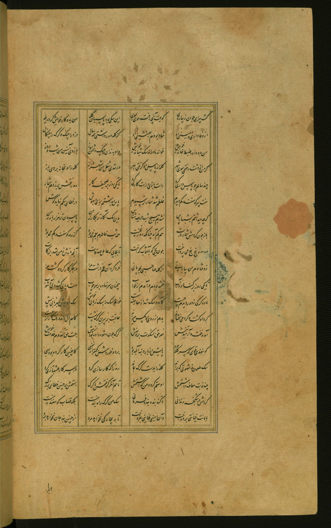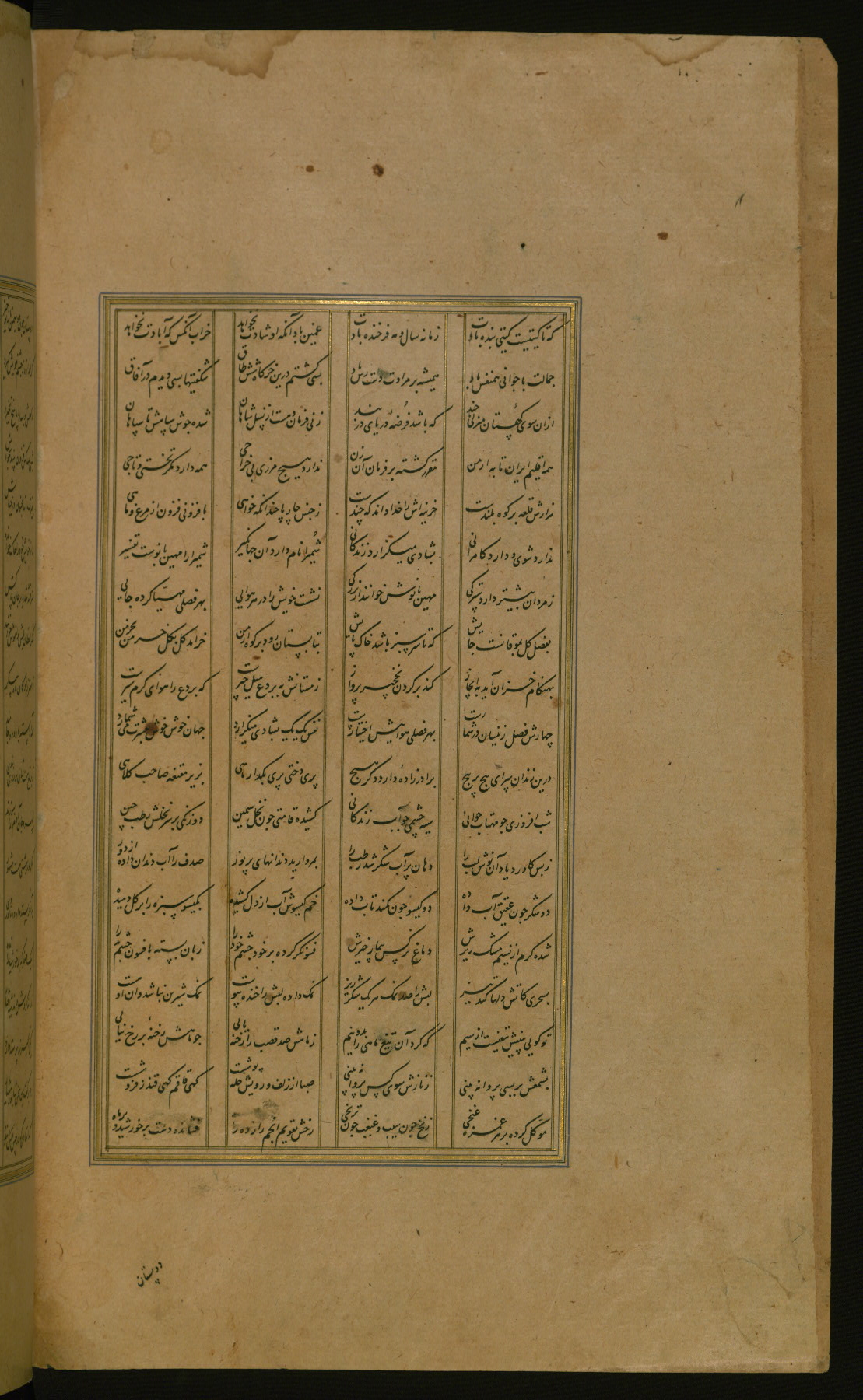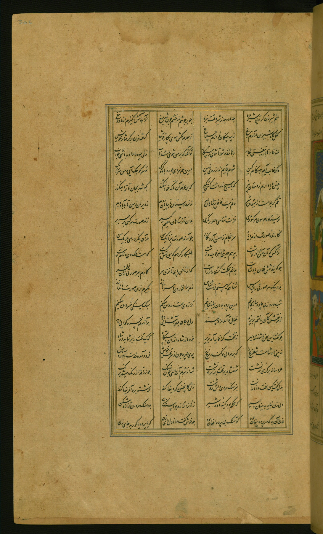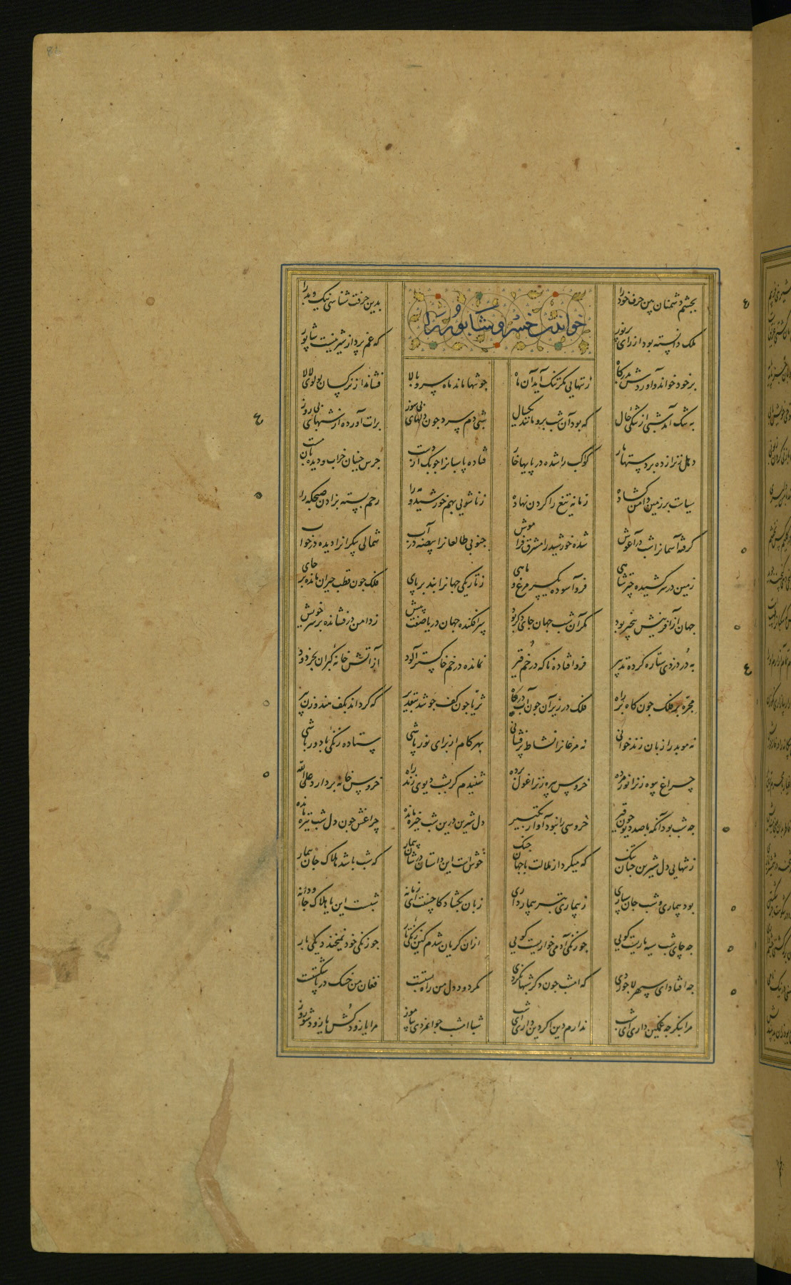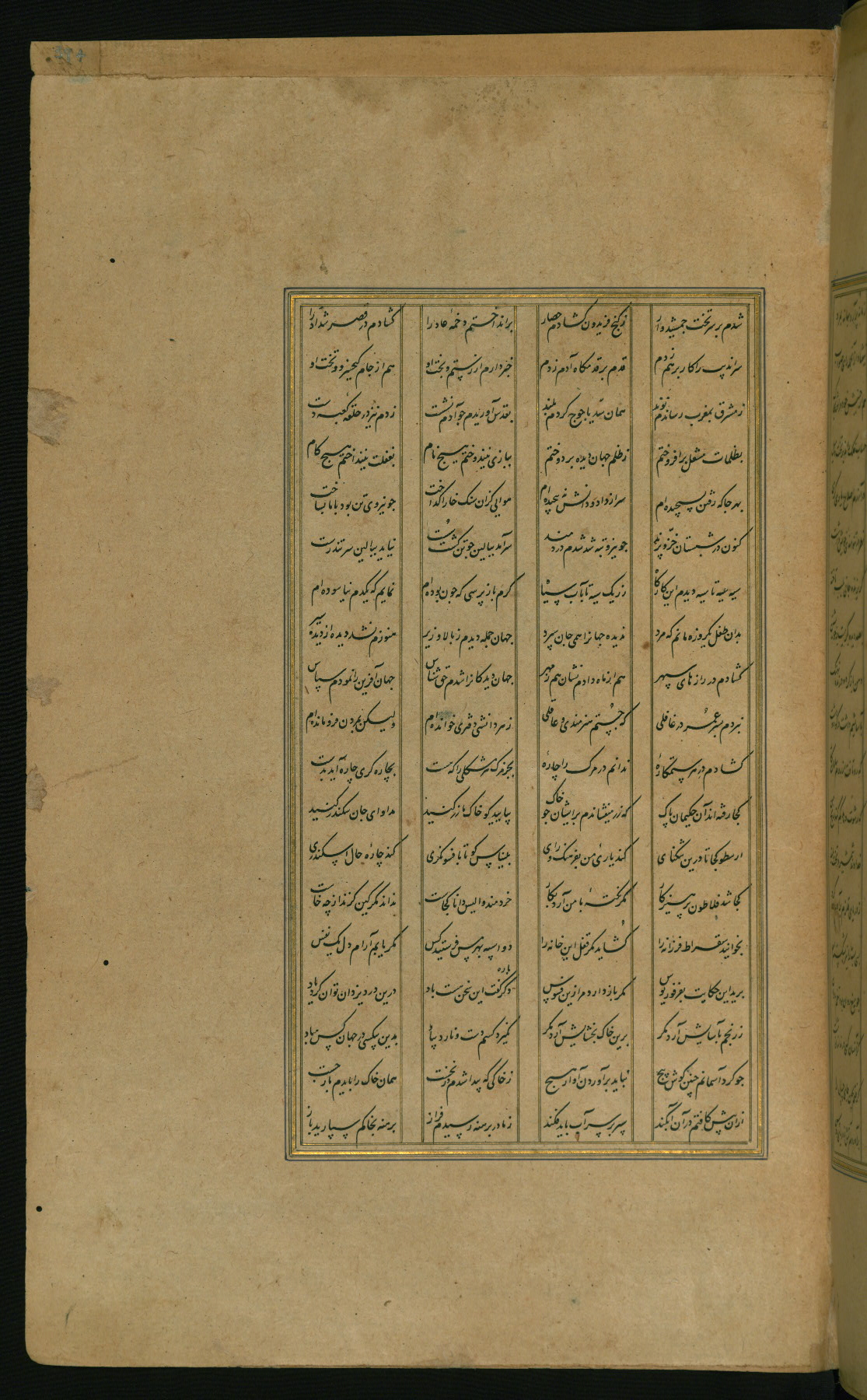 This illuminated and illustrated copy of the Khamsah (quintet) of Niẓāmī Ganjavī (d. 605 AH / 1209 CE) was written by Yār Muḥammad al-Haravī in 922 AH / 1516 CE. Written in four columns in black nastaʿlīq script, this manuscript opens with a double-page illuminated frontispiece signed by ʿAbd al-Wahhāb ibn ʿAbd al-Fattāḥ ibn ʿAlī. It contains thirty-five illustrations that were repainted in India during the twelfth century AH / eighteenth CE. The seal of Muḥammad Asharf ibn Muḥammad Khātam al-Ḥusaynī, dated 1173 AH / 1759-60 CE appears on fols. 1a and 401a. It is possible that the brown leather binding with center and side panels brushed with gold is original to the manuscript but was repaired at a later stage in the codex's history.