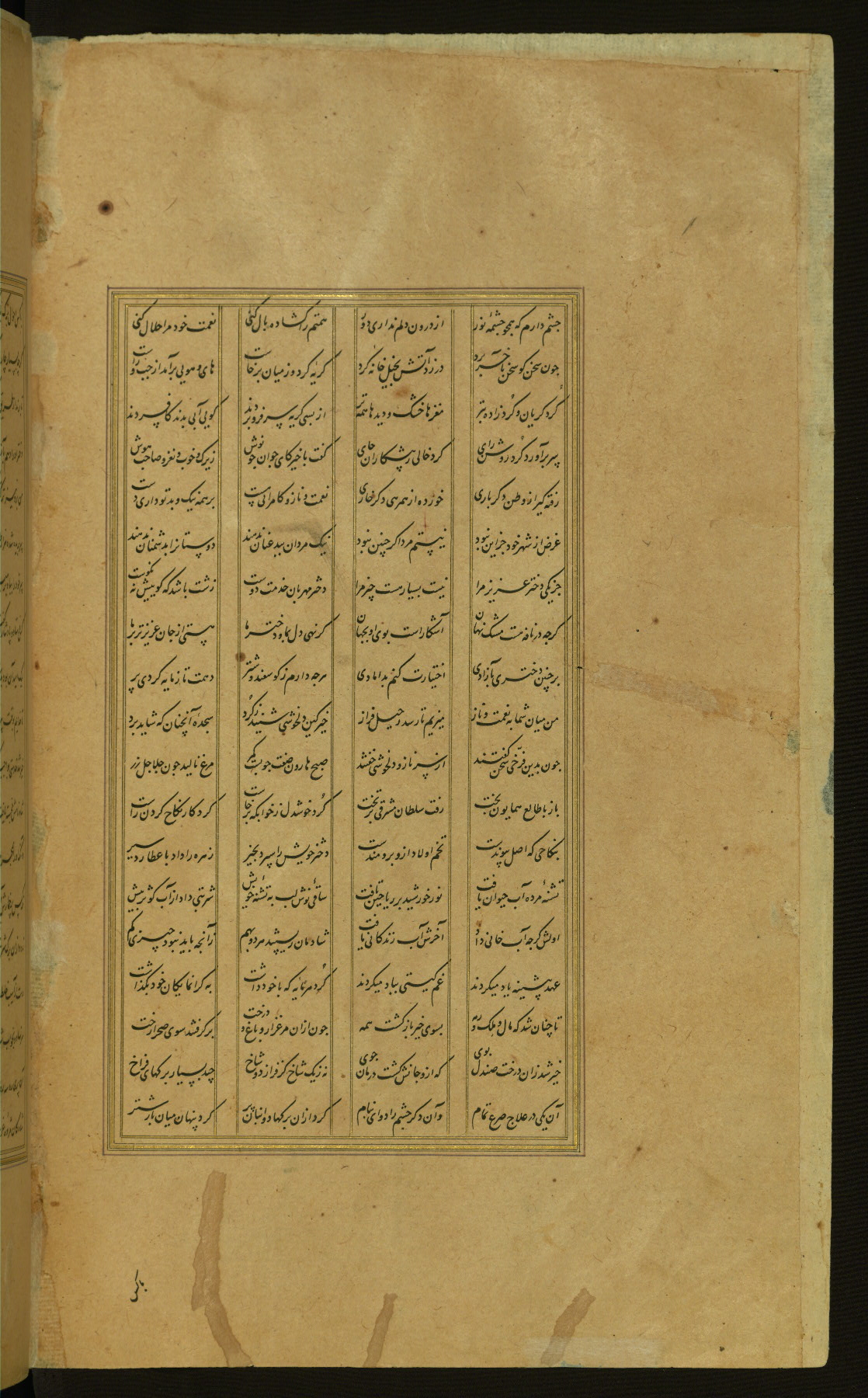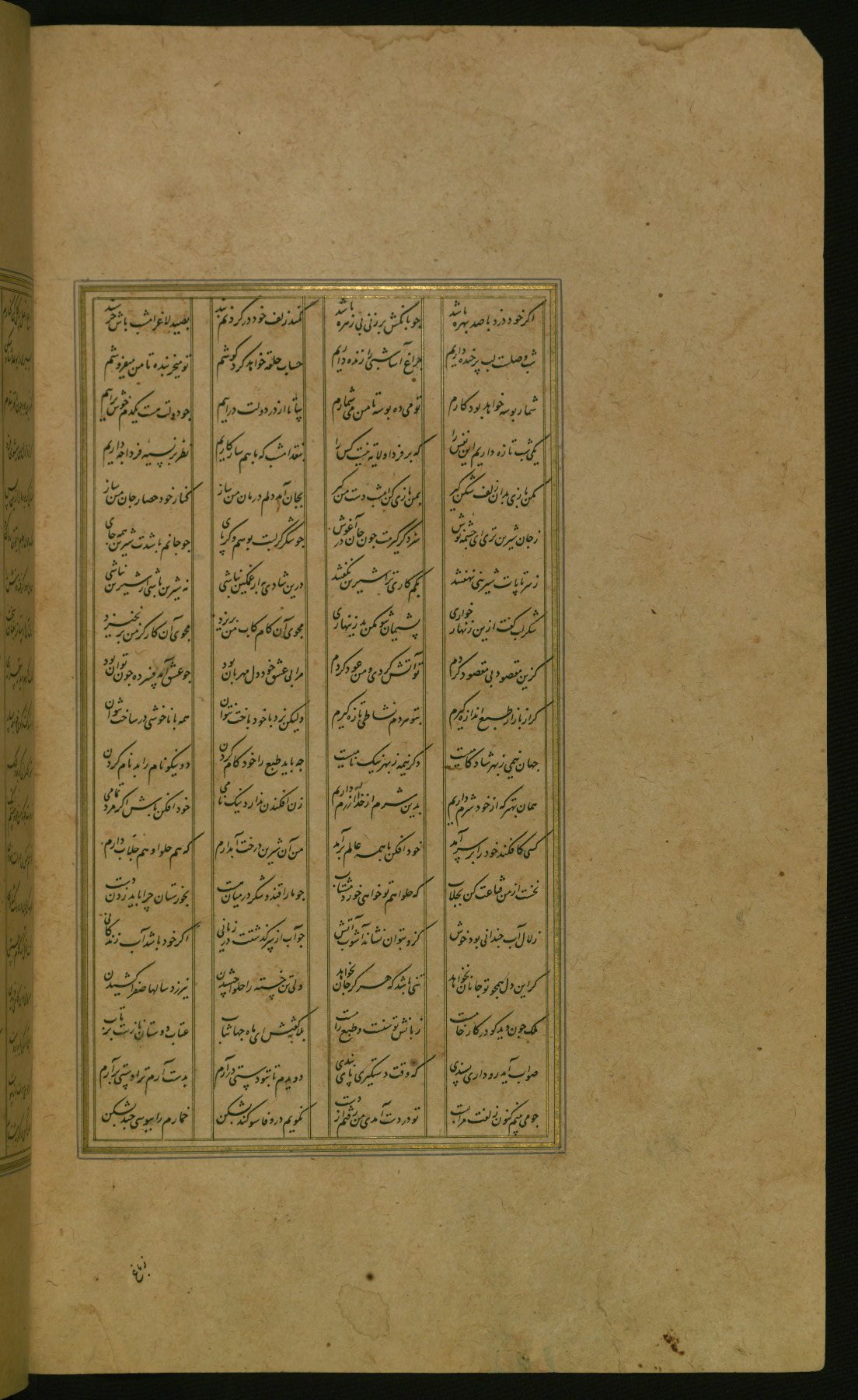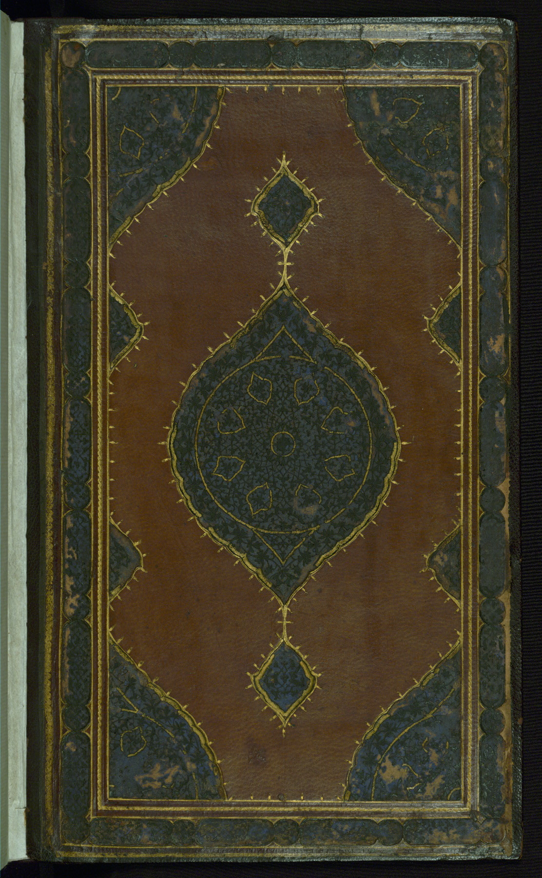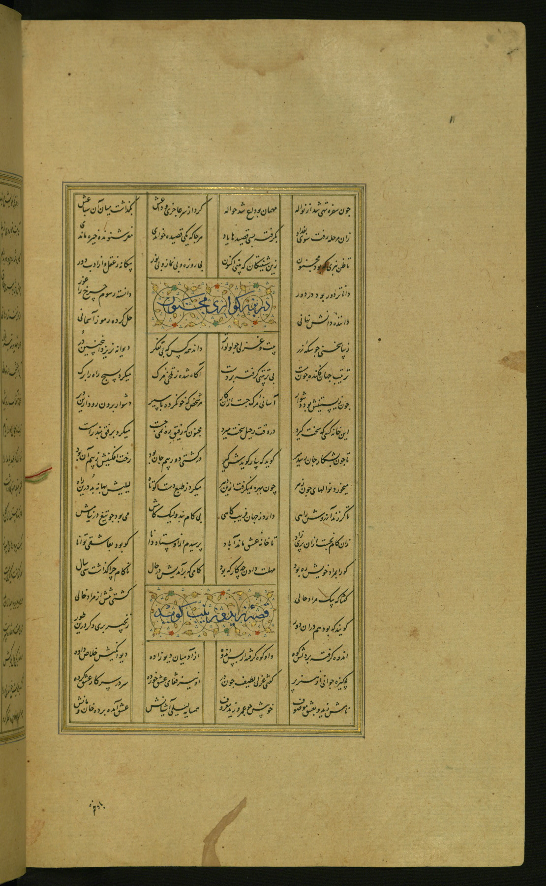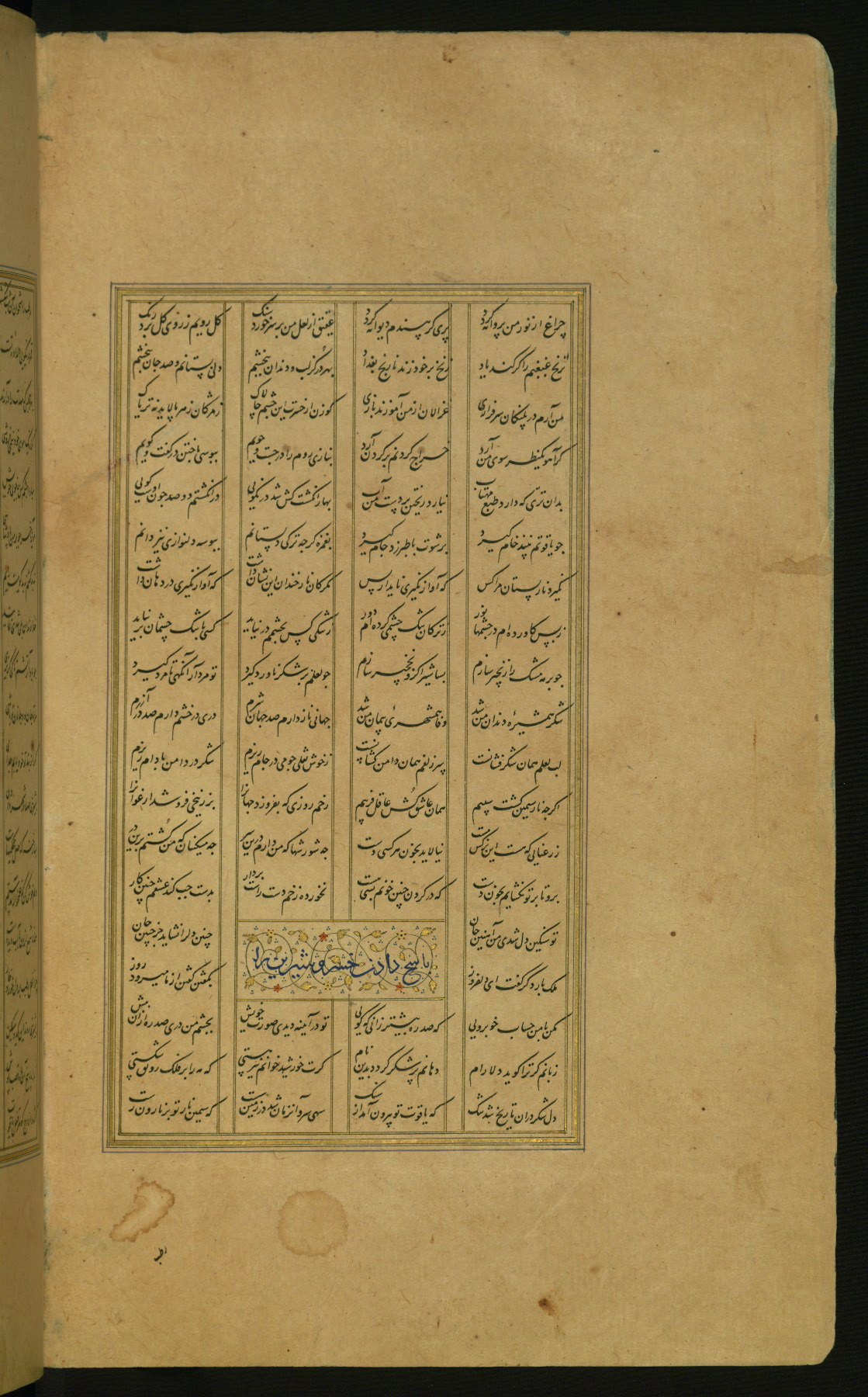 This illuminated and illustrated copy of the Khamsah (quintet) of Niẓāmī Ganjavī (d. 605 AH / 1209 CE) was written by Yār Muḥammad al-Haravī in 922 AH / 1516 CE. Written in four columns in black nastaʿlīq script, this manuscript opens with a double-page illuminated frontispiece signed by ʿAbd al-Wahhāb ibn ʿAbd al-Fattāḥ ibn ʿAlī. It contains thirty-five illustrations that were repainted in India during the twelfth century AH / eighteenth CE. The seal of Muḥammad Asharf ibn Muḥammad Khātam al-Ḥusaynī, dated 1173 AH / 1759-60 CE appears on fols. 1a and 401a. It is possible that the brown leather binding with center and side panels brushed with gold is original to the manuscript but was repaired at a later stage in the codex's history.