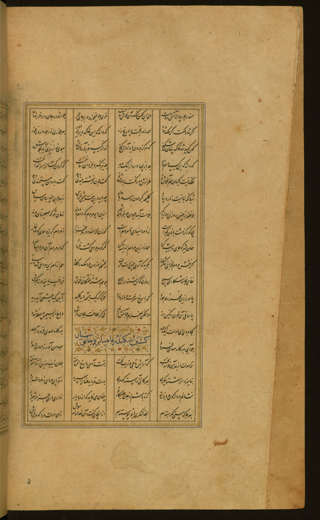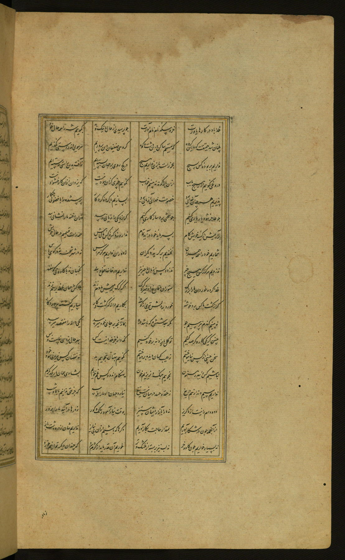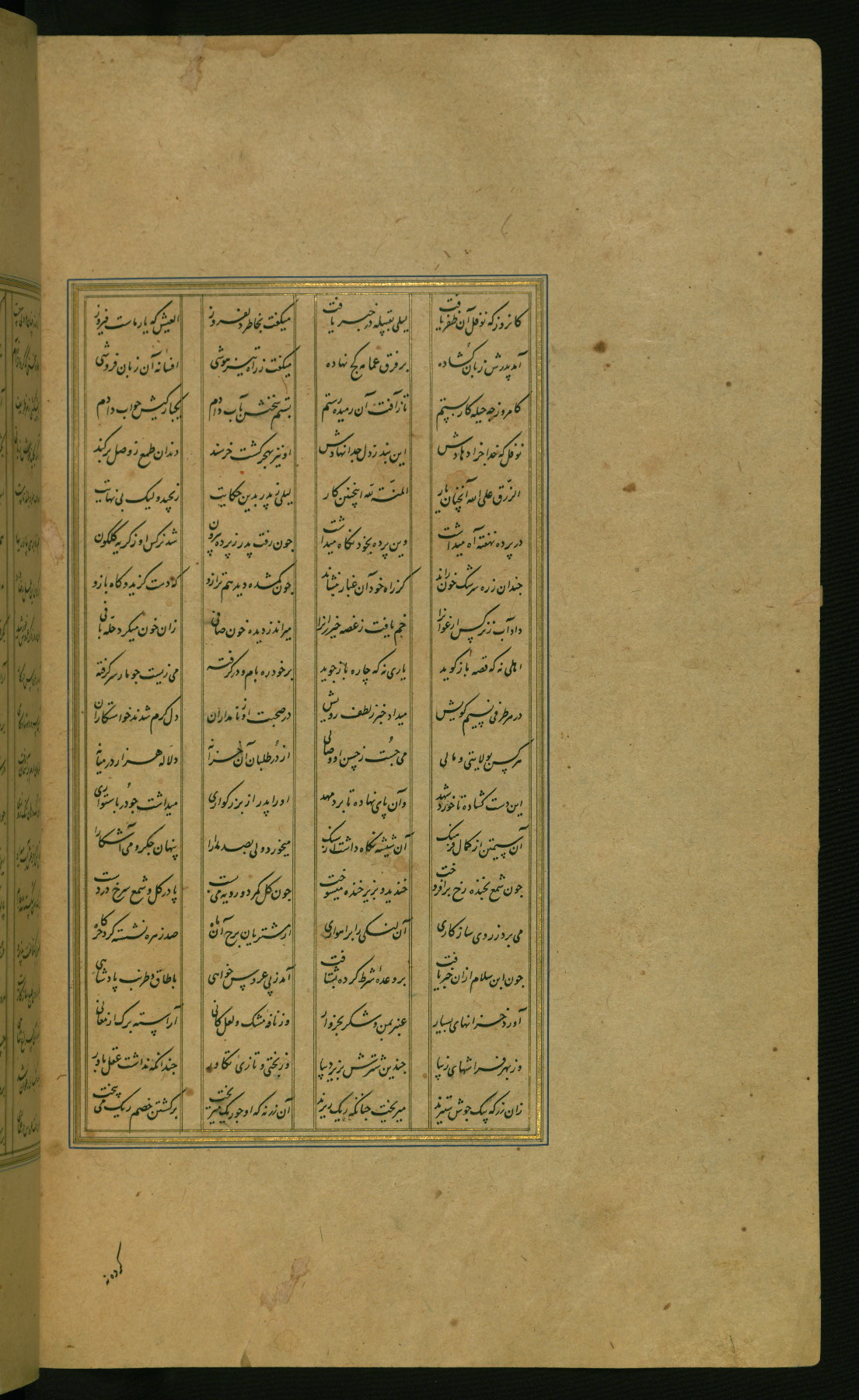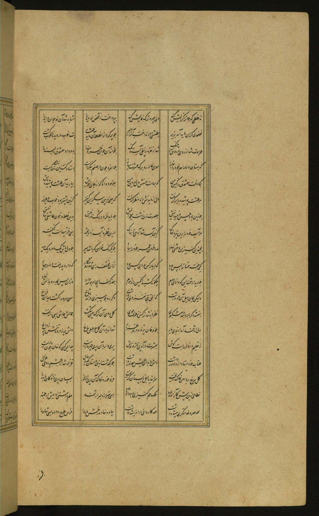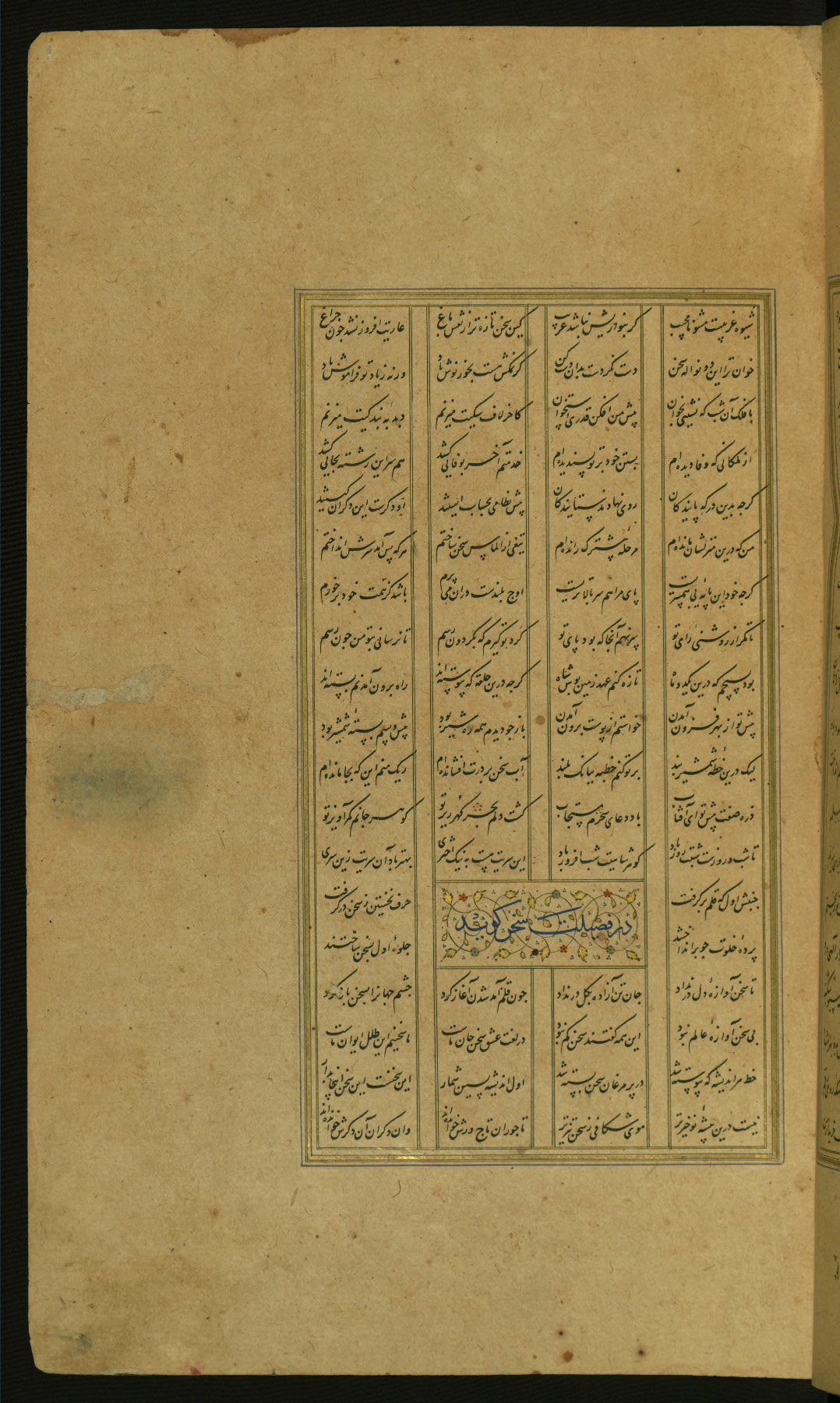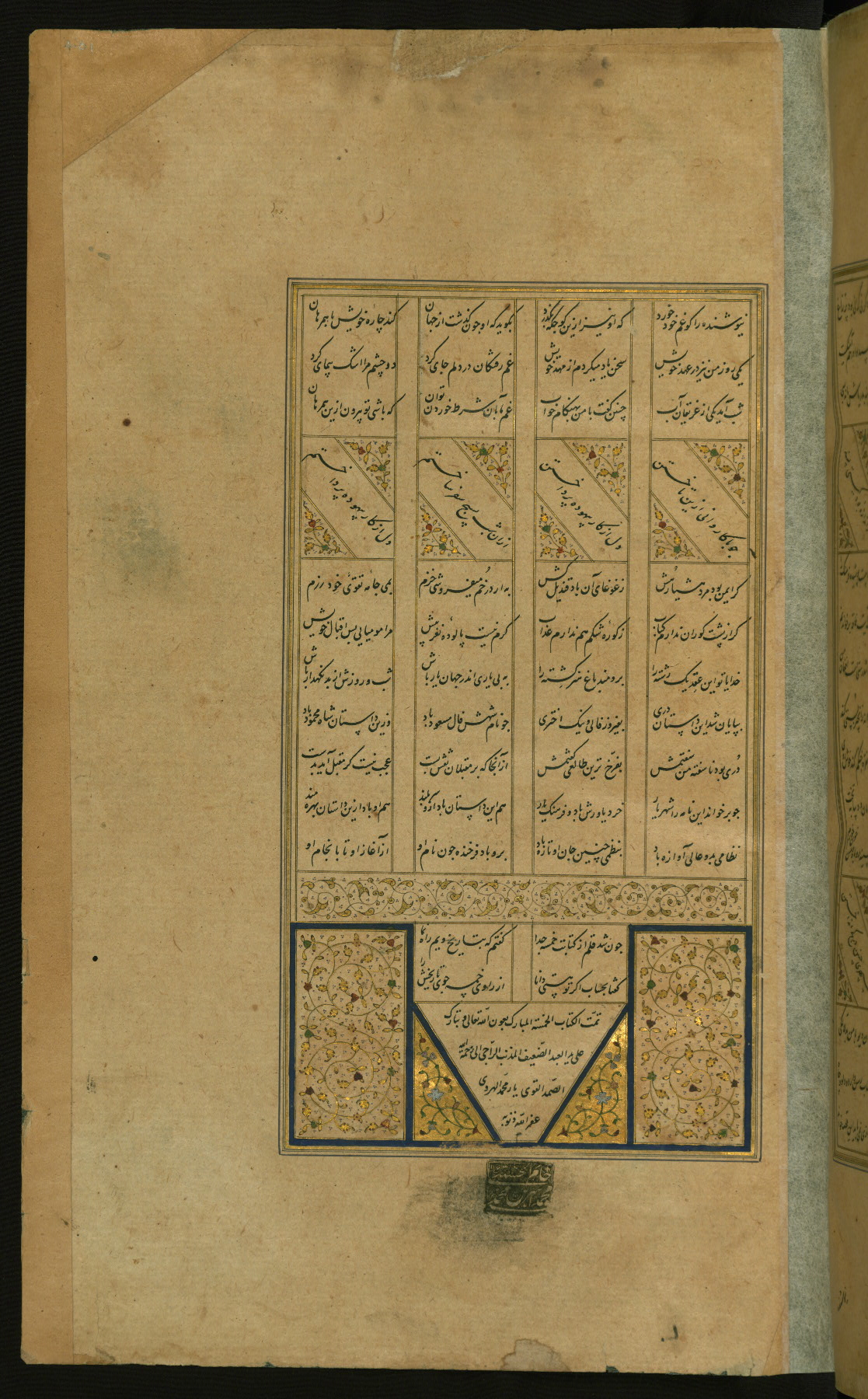 This illuminated and illustrated copy of the Khamsah (quintet) of Niẓāmī Ganjavī (d. 605 AH / 1209 CE) was written by Yār Muḥammad al-Haravī in 922 AH / 1516 CE. Written in four columns in black nastaʿlīq script, this manuscript opens with a double-page illuminated frontispiece signed by ʿAbd al-Wahhāb ibn ʿAbd al-Fattāḥ ibn ʿAlī. It contains thirty-five illustrations that were repainted in India during the twelfth century AH / eighteenth CE. The seal of Muḥammad Asharf ibn Muḥammad Khātam al-Ḥusaynī, dated 1173 AH / 1759-60 CE appears on fols. 1a and 401a. It is possible that the brown leather binding with center and side panels brushed with gold is original to the manuscript but was repaired at a later stage in the codex's history.