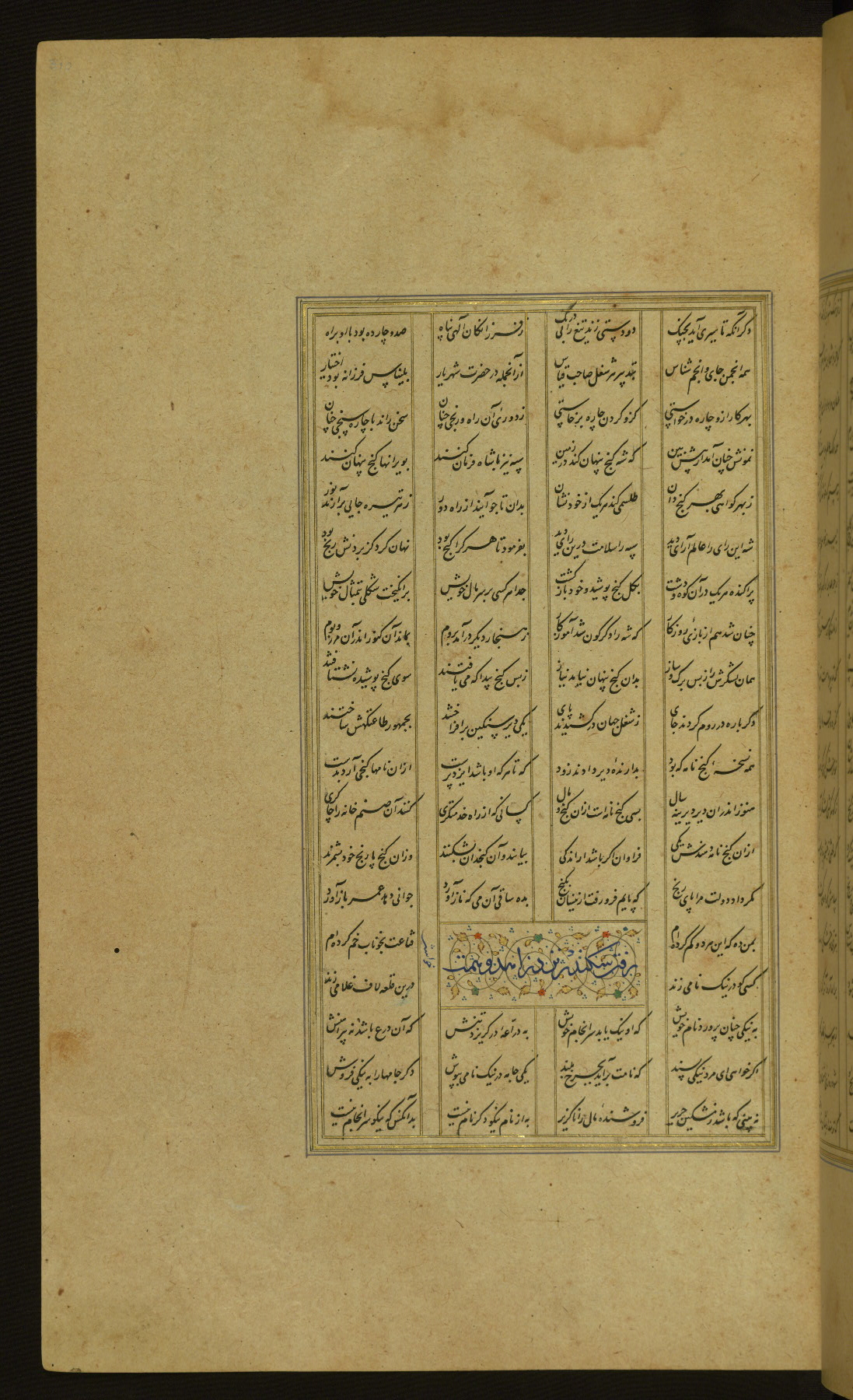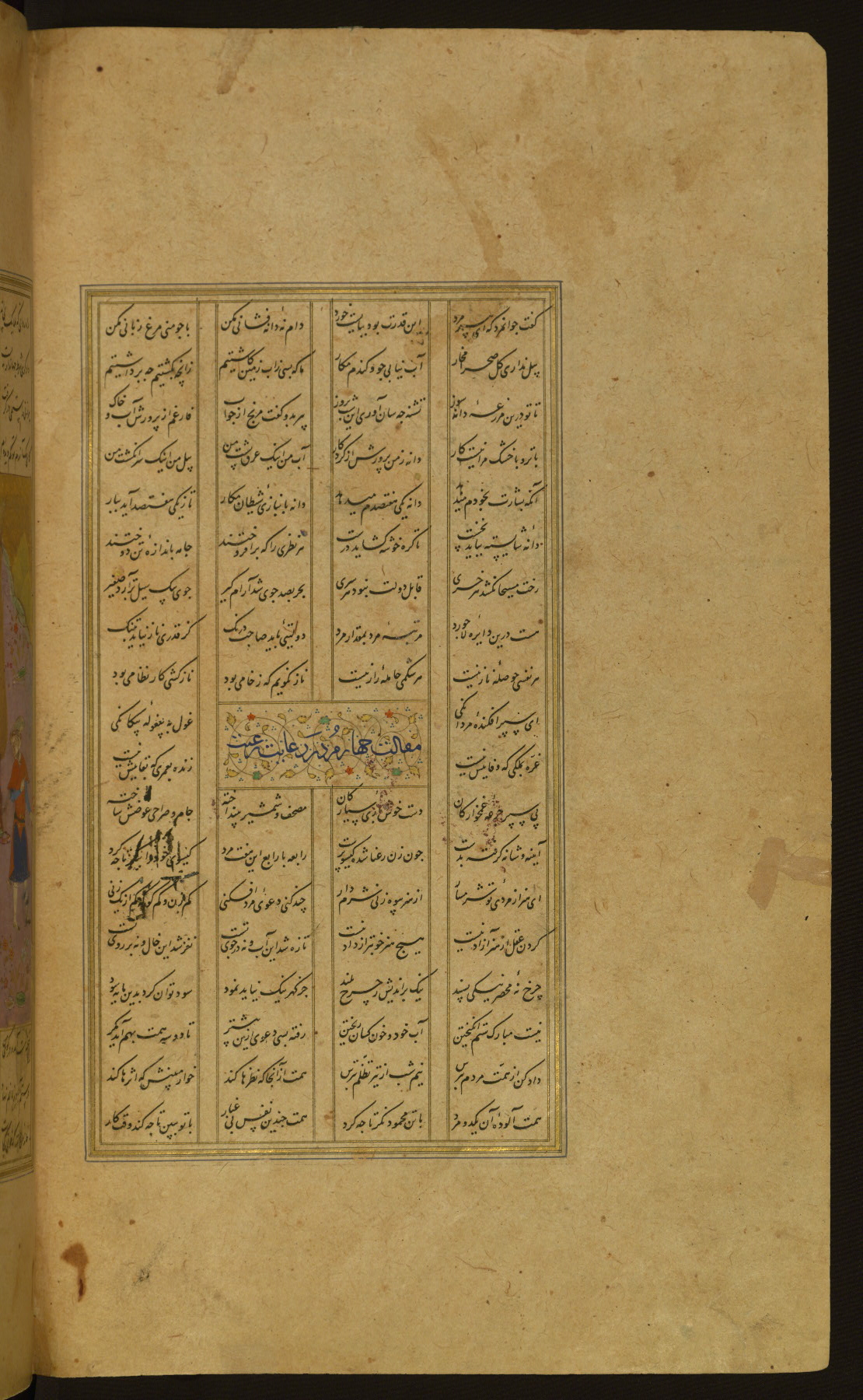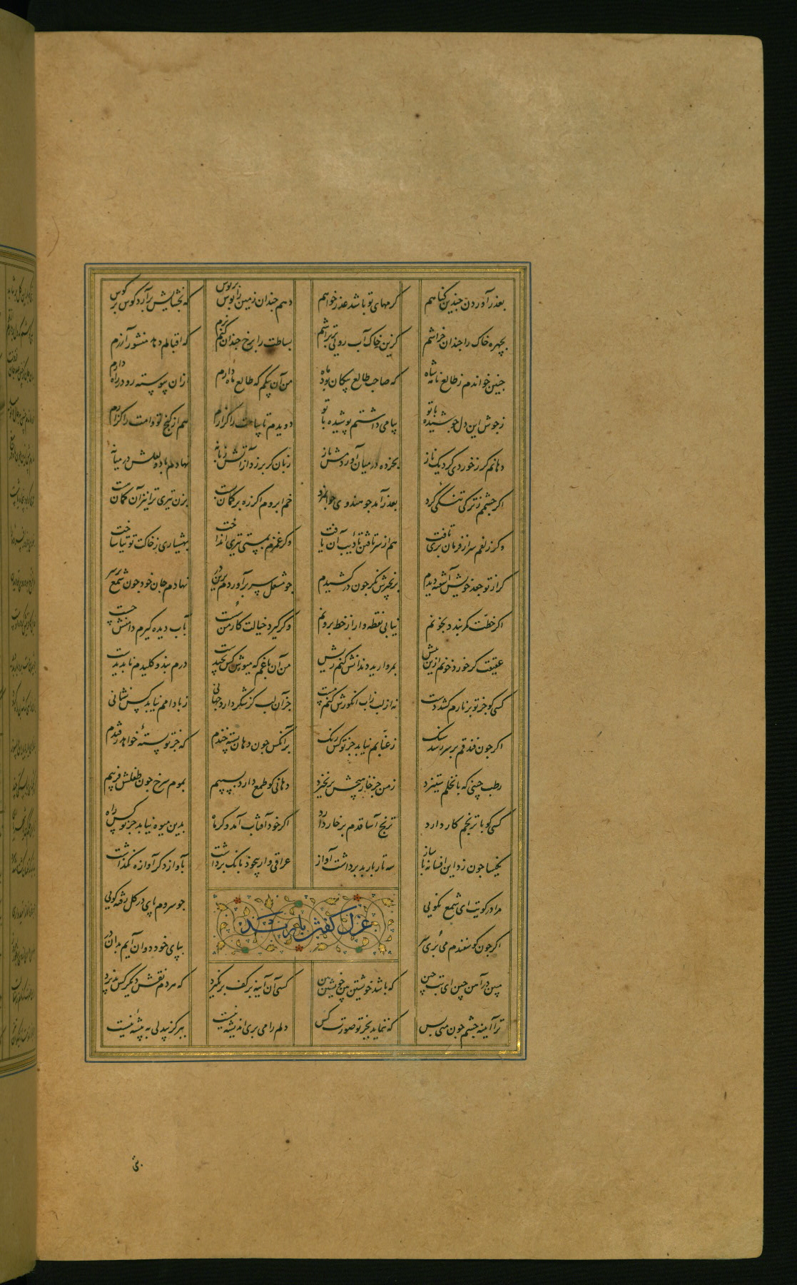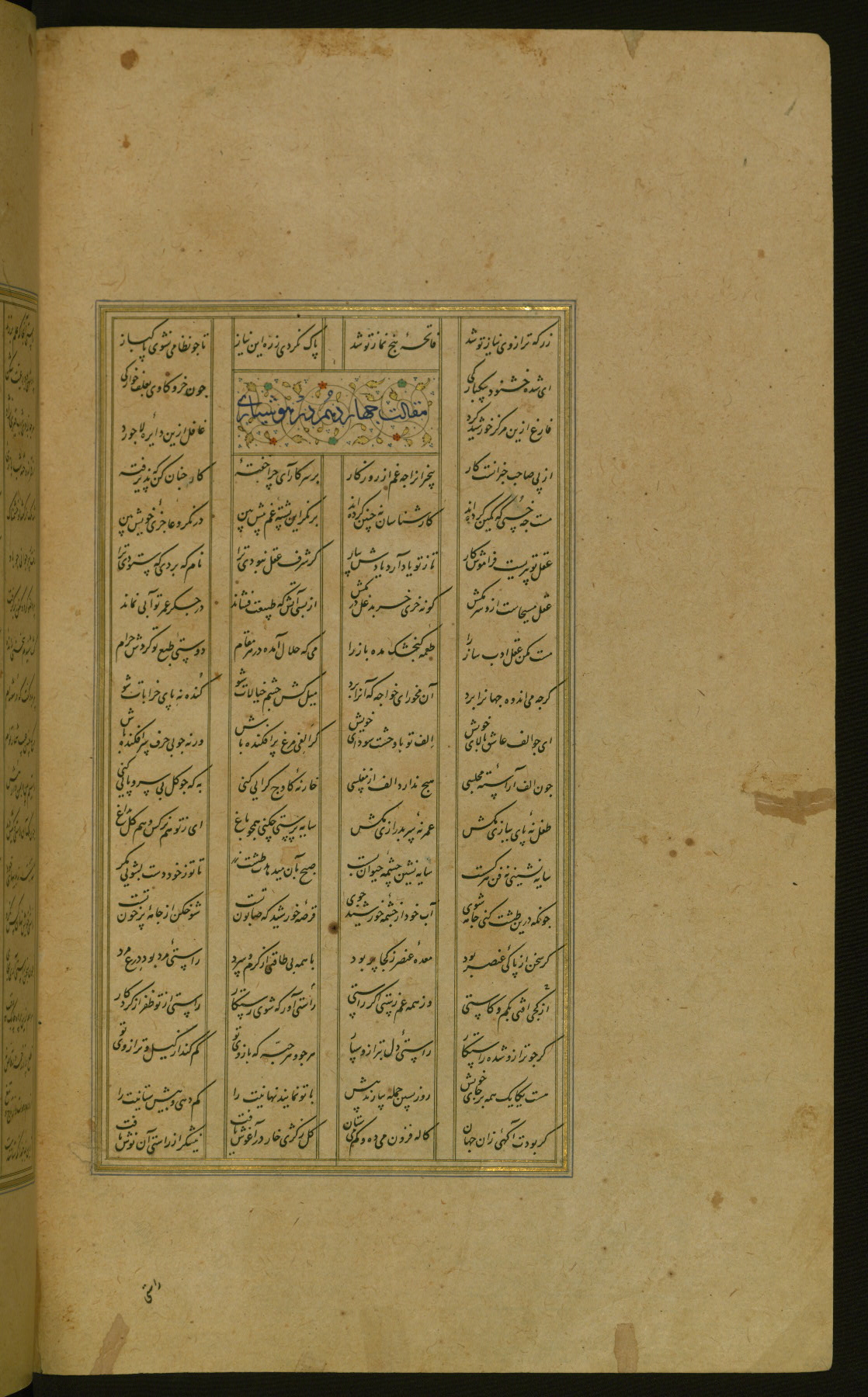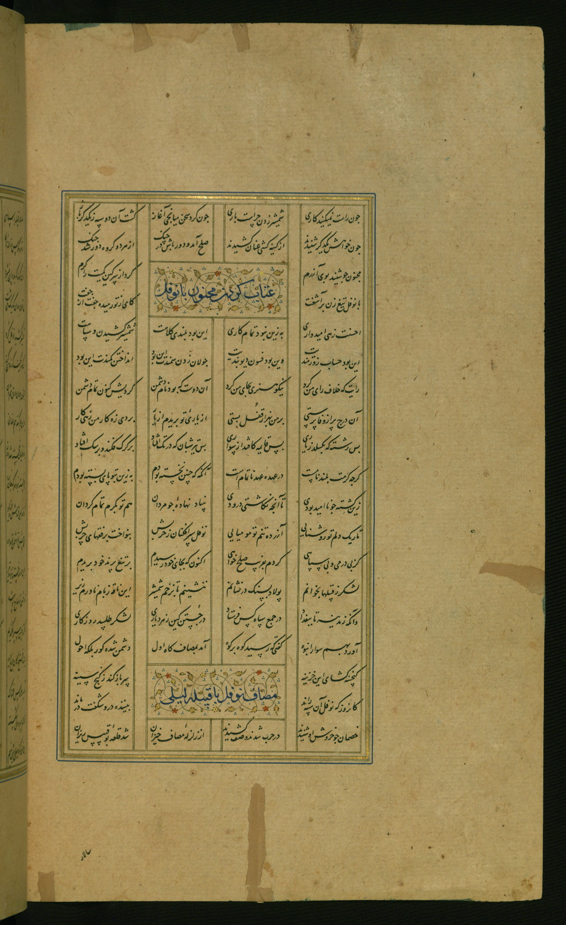 This illuminated and illustrated copy of the Khamsah (quintet) of Niẓāmī Ganjavī (d. 605 AH / 1209 CE) was written by Yār Muḥammad al-Haravī in 922 AH / 1516 CE. Written in four columns in black nastaʿlīq script, this manuscript opens with a double-page illuminated frontispiece signed by ʿAbd al-Wahhāb ibn ʿAbd al-Fattāḥ ibn ʿAlī. It contains thirty-five illustrations that were repainted in India during the twelfth century AH / eighteenth CE. The seal of Muḥammad Asharf ibn Muḥammad Khātam al-Ḥusaynī, dated 1173 AH / 1759-60 CE appears on fols. 1a and 401a. It is possible that the brown leather binding with center and side panels brushed with gold is original to the manuscript but was repaired at a later stage in the codex's history.