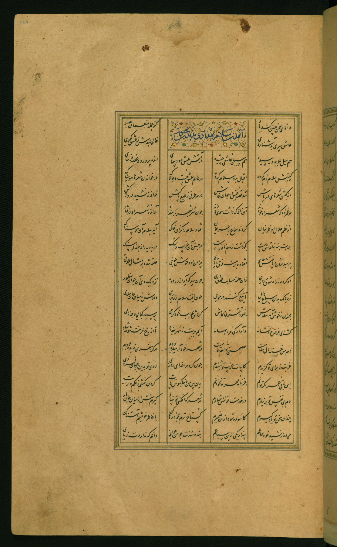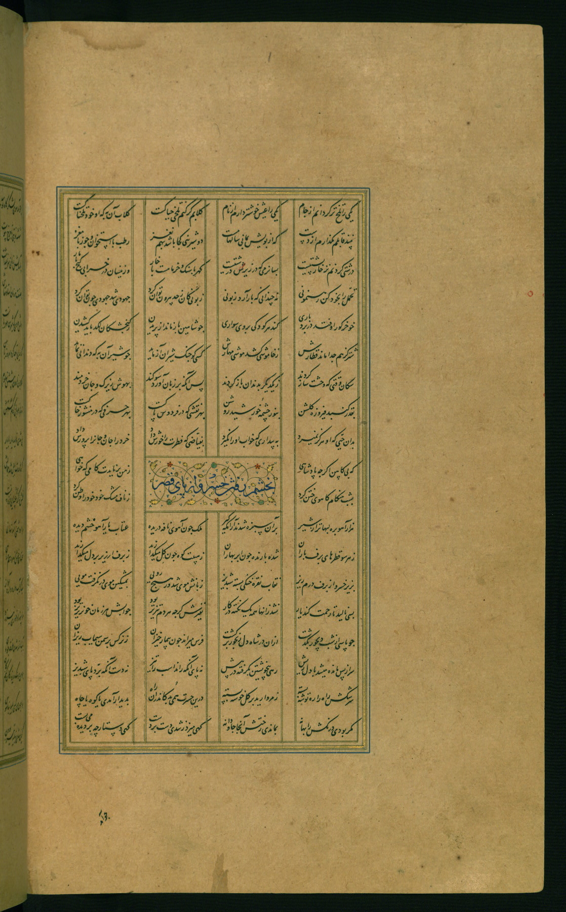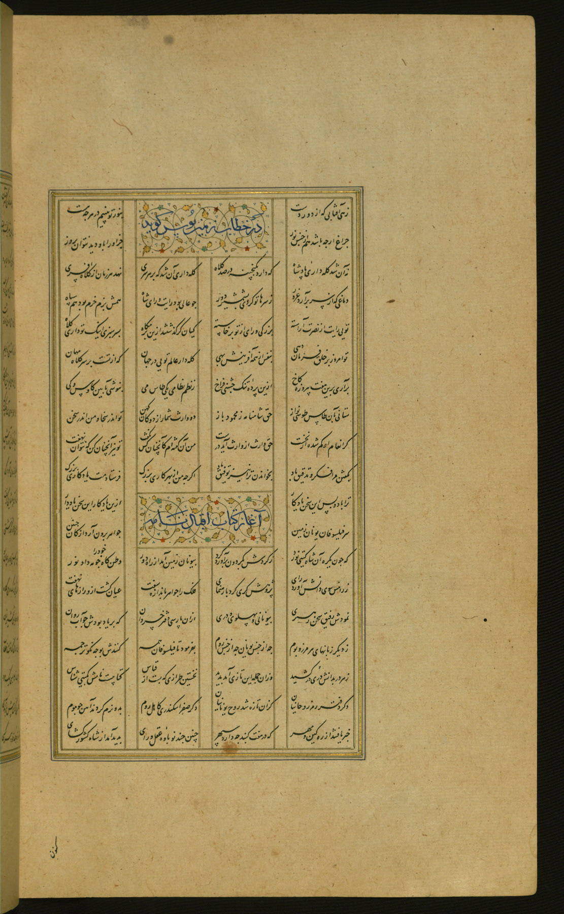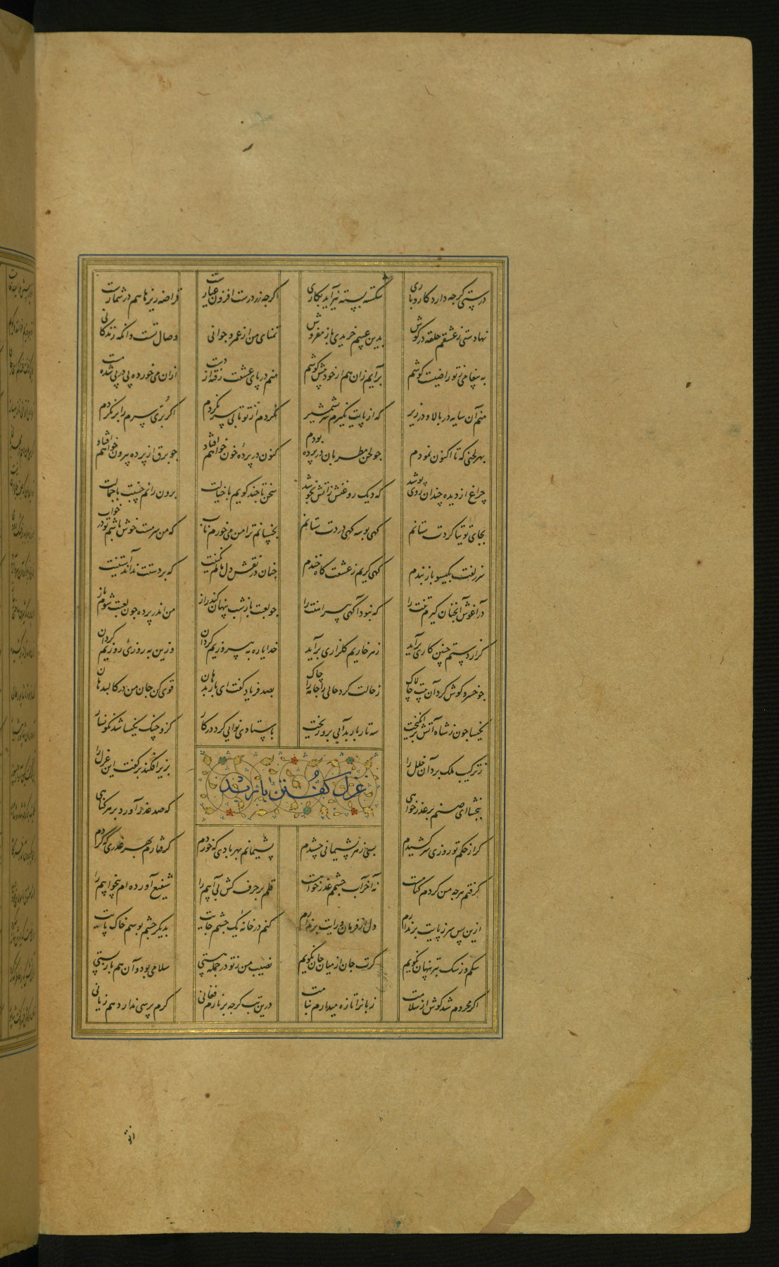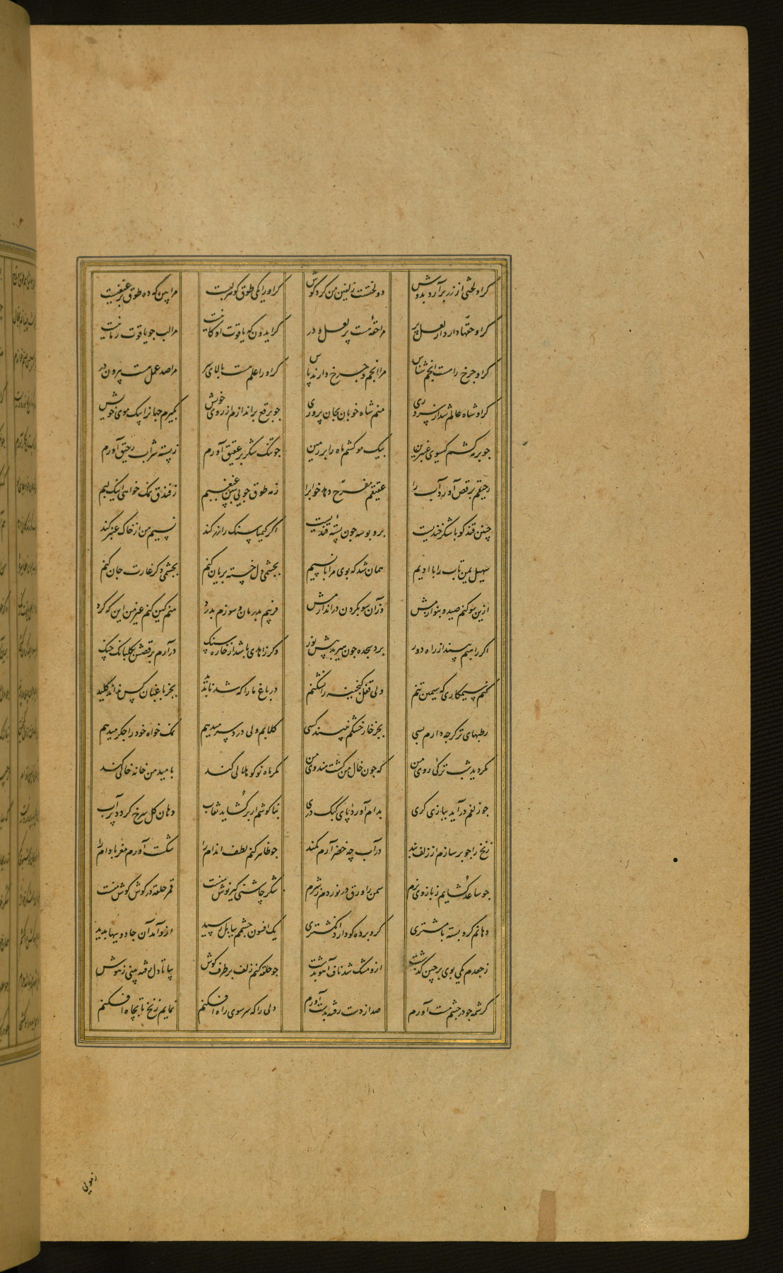 This illuminated and illustrated copy of the Khamsah (quintet) of Niẓāmī Ganjavī (d. 605 AH / 1209 CE) was written by Yār Muḥammad al-Haravī in 922 AH / 1516 CE. Written in four columns in black nastaʿlīq script, this manuscript opens with a double-page illuminated frontispiece signed by ʿAbd al-Wahhāb ibn ʿAbd al-Fattāḥ ibn ʿAlī. It contains thirty-five illustrations that were repainted in India during the twelfth century AH / eighteenth CE. The seal of Muḥammad Asharf ibn Muḥammad Khātam al-Ḥusaynī, dated 1173 AH / 1759-60 CE appears on fols. 1a and 401a. It is possible that the brown leather binding with center and side panels brushed with gold is original to the manuscript but was repaired at a later stage in the codex's history.