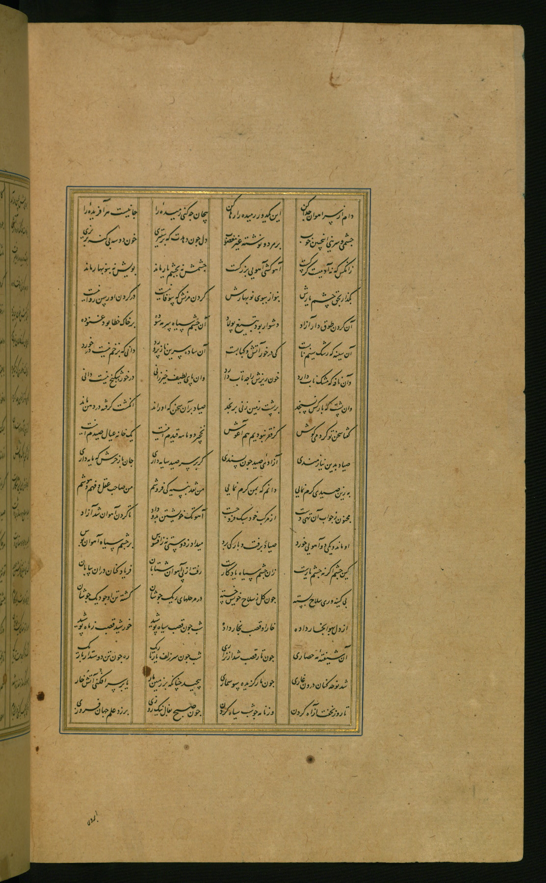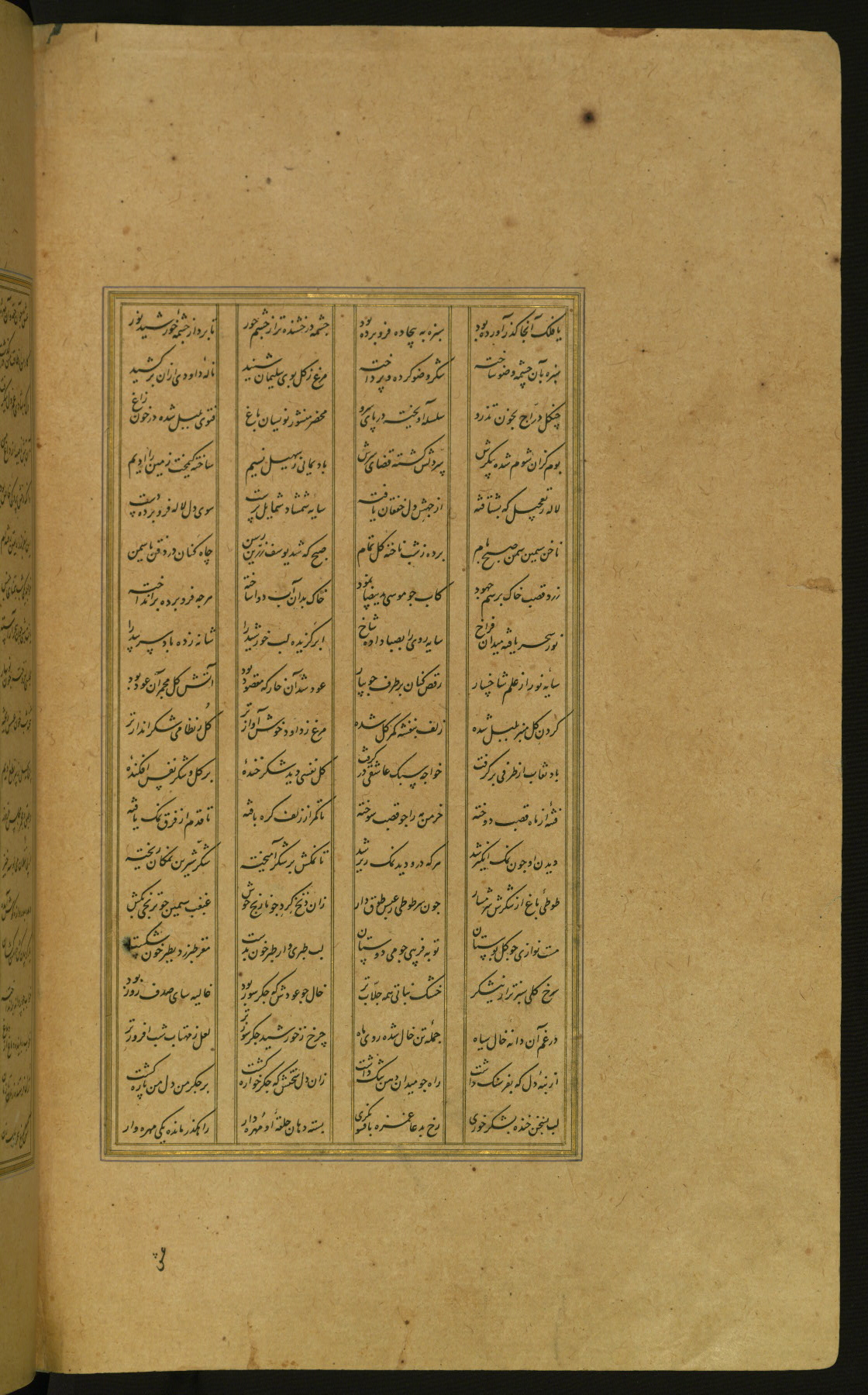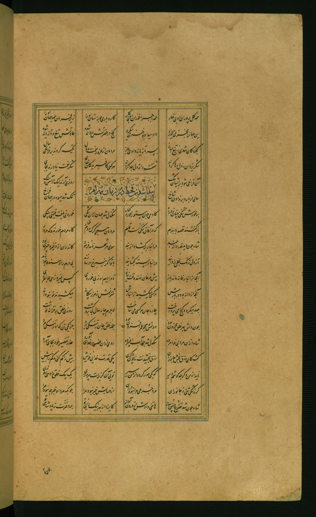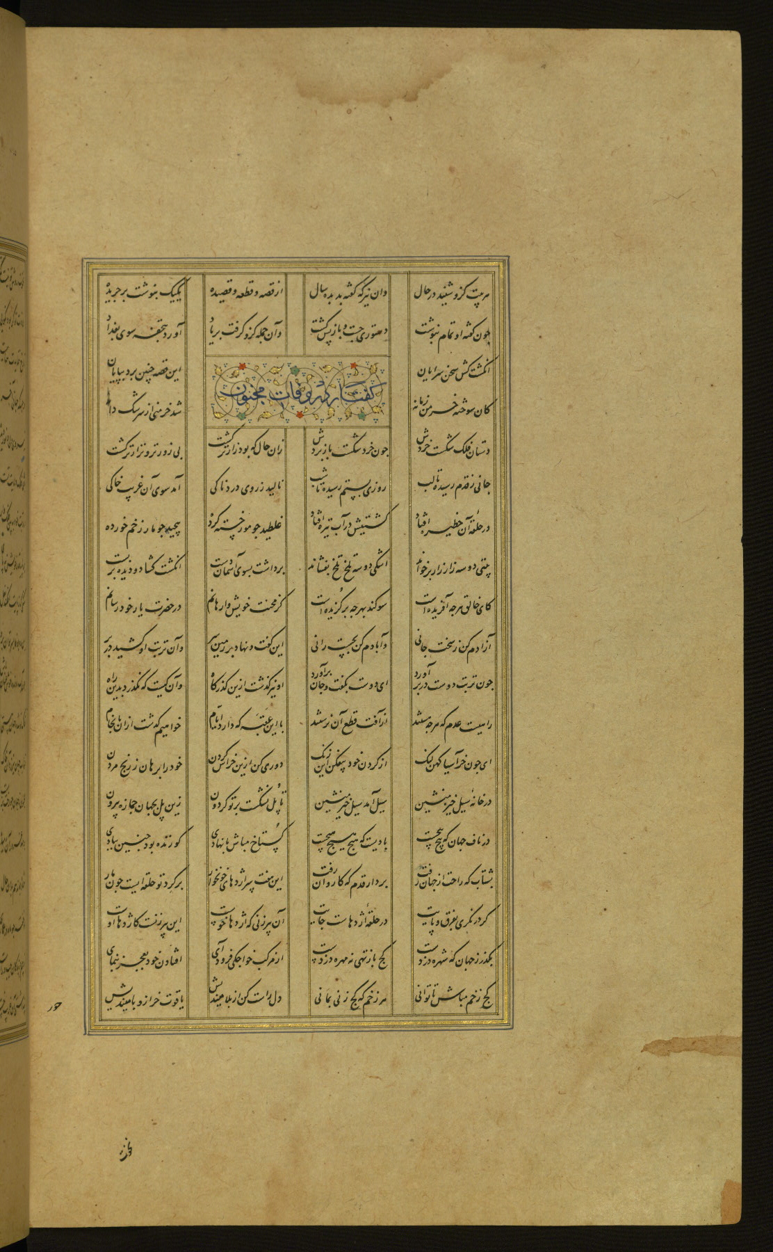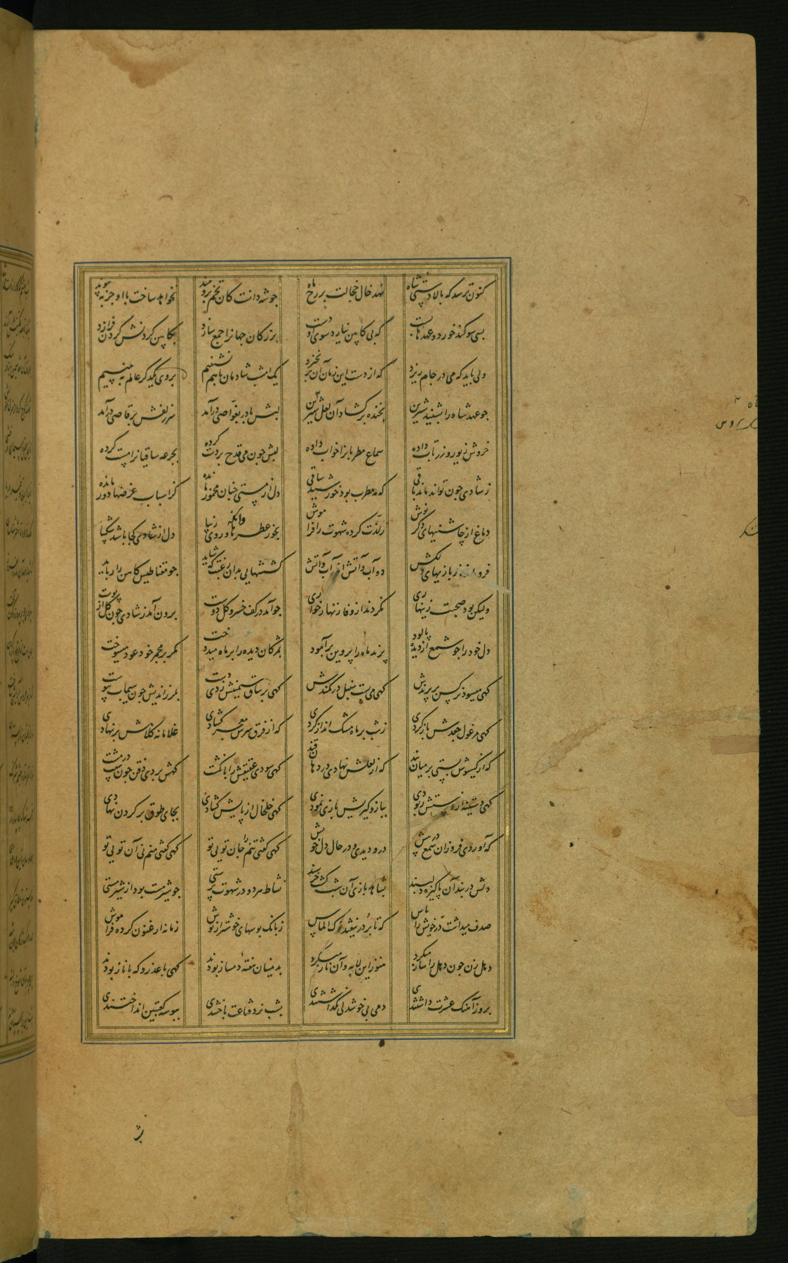 This illuminated and illustrated copy of the Khamsah (quintet) of Niẓāmī Ganjavī (d. 605 AH / 1209 CE) was written by Yār Muḥammad al-Haravī in 922 AH / 1516 CE. Written in four columns in black nastaʿlīq script, this manuscript opens with a double-page illuminated frontispiece signed by ʿAbd al-Wahhāb ibn ʿAbd al-Fattāḥ ibn ʿAlī. It contains thirty-five illustrations that were repainted in India during the twelfth century AH / eighteenth CE. The seal of Muḥammad Asharf ibn Muḥammad Khātam al-Ḥusaynī, dated 1173 AH / 1759-60 CE appears on fols. 1a and 401a. It is possible that the brown leather binding with center and side panels brushed with gold is original to the manuscript but was repaired at a later stage in the codex's history.