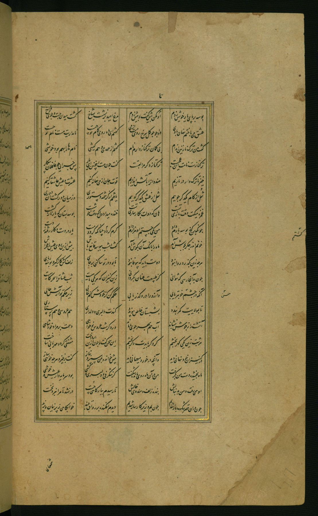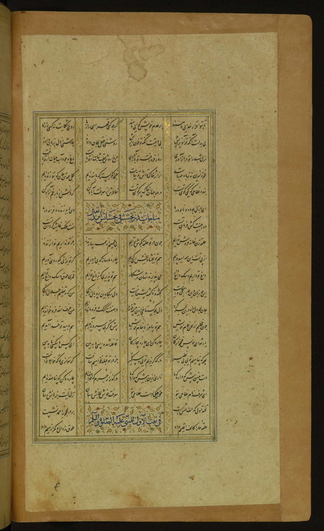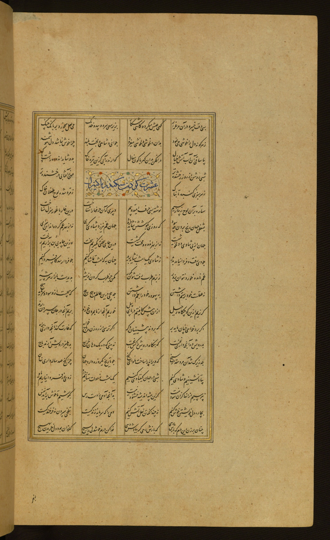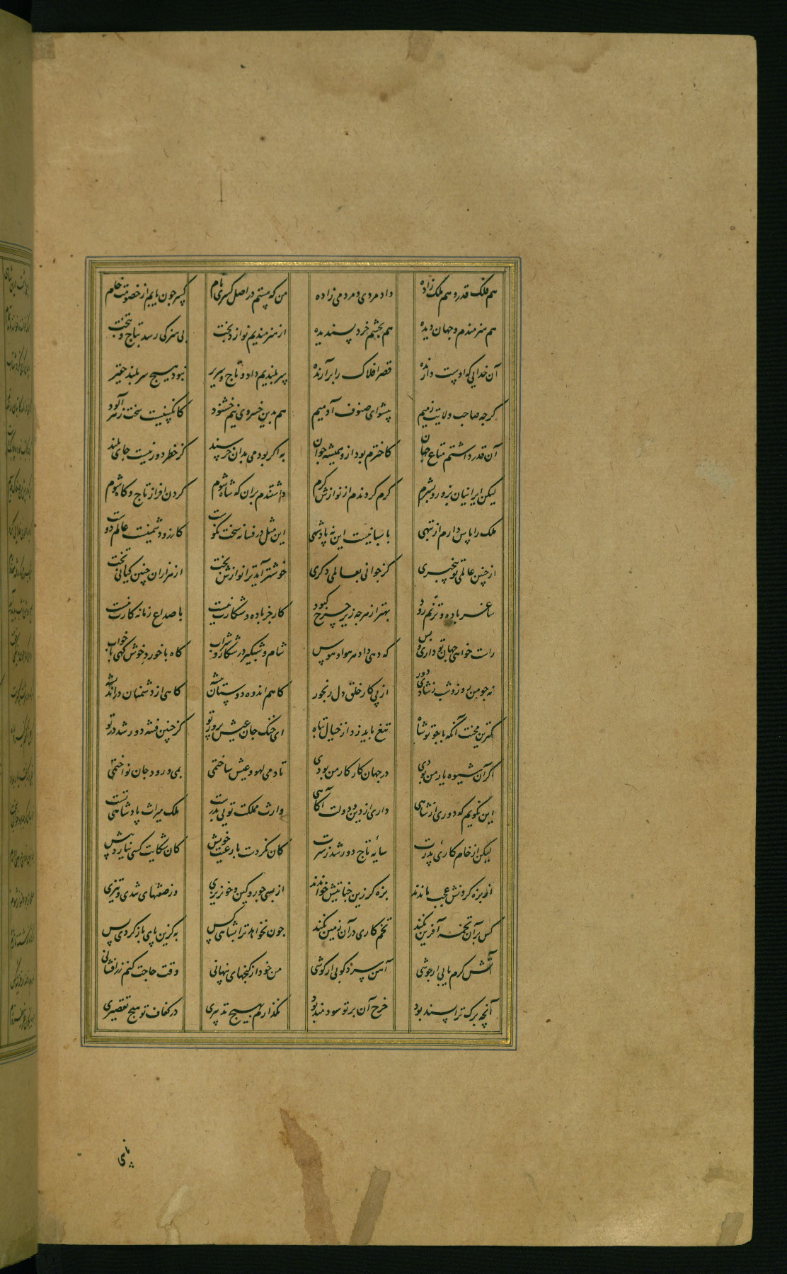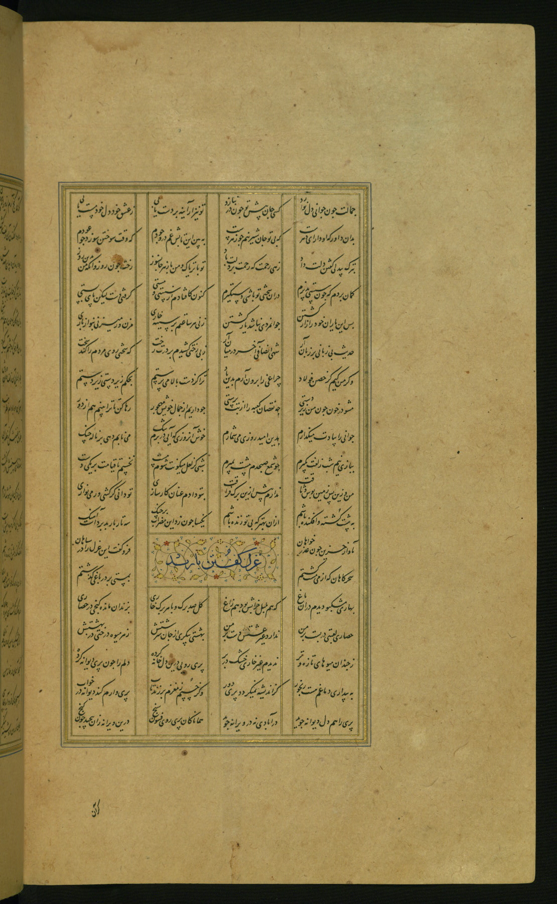 This illuminated and illustrated copy of the Khamsah (quintet) of Niẓāmī Ganjavī (d. 605 AH / 1209 CE) was written by Yār Muḥammad al-Haravī in 922 AH / 1516 CE. Written in four columns in black nastaʿlīq script, this manuscript opens with a double-page illuminated frontispiece signed by ʿAbd al-Wahhāb ibn ʿAbd al-Fattāḥ ibn ʿAlī. It contains thirty-five illustrations that were repainted in India during the twelfth century AH / eighteenth CE. The seal of Muḥammad Asharf ibn Muḥammad Khātam al-Ḥusaynī, dated 1173 AH / 1759-60 CE appears on fols. 1a and 401a. It is possible that the brown leather binding with center and side panels brushed with gold is original to the manuscript but was repaired at a later stage in the codex's history.