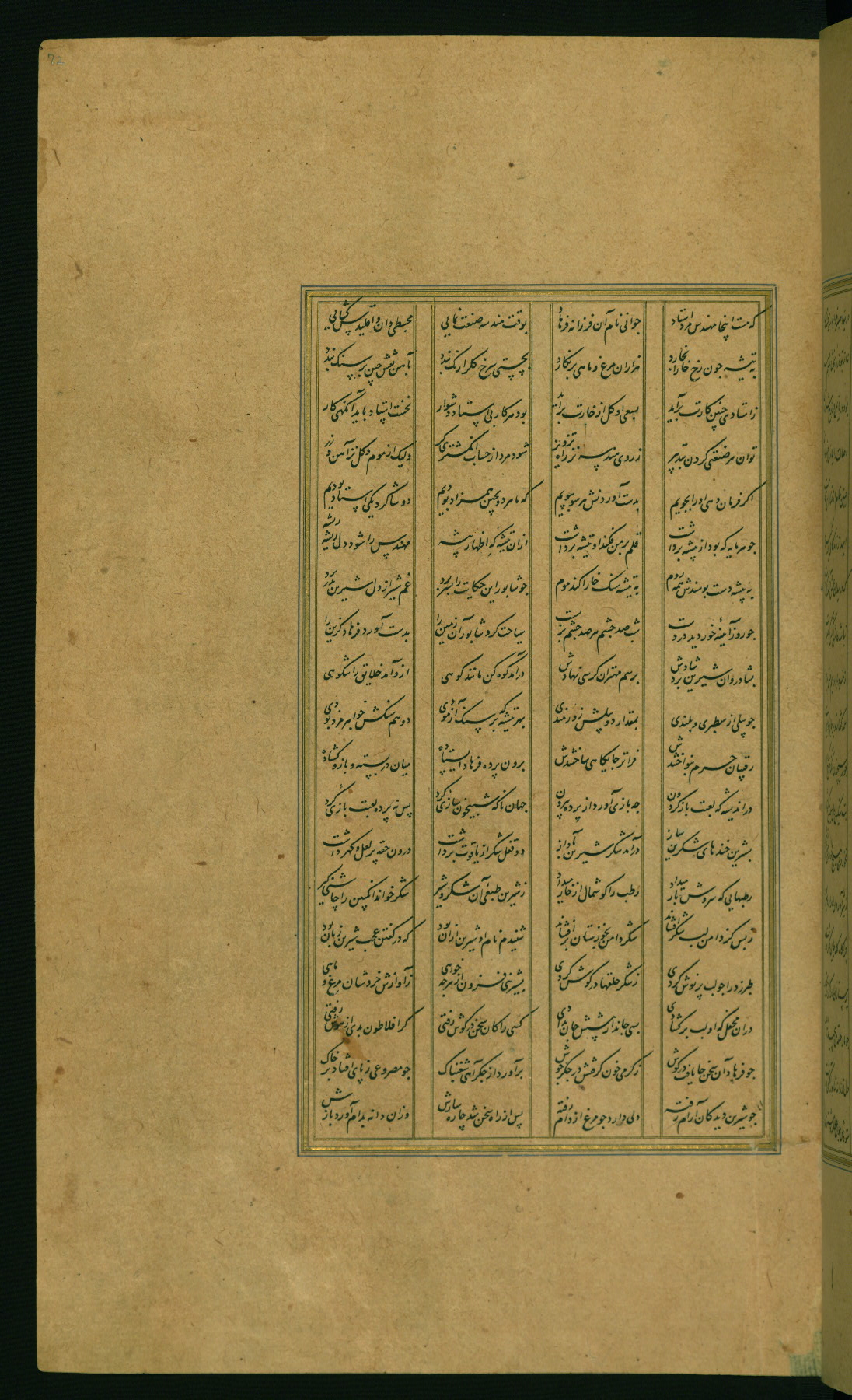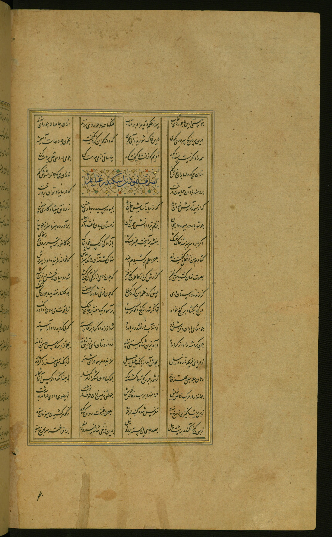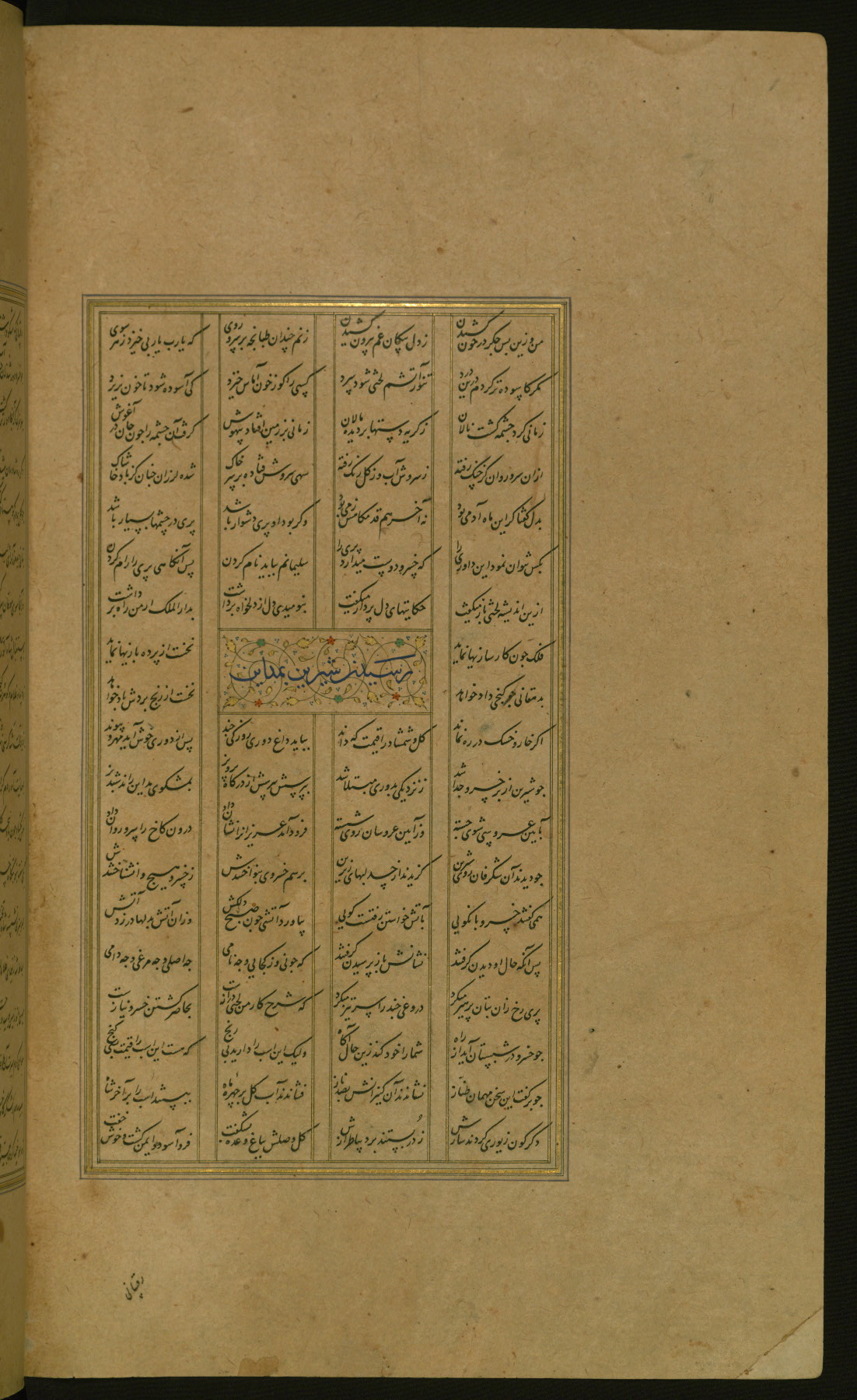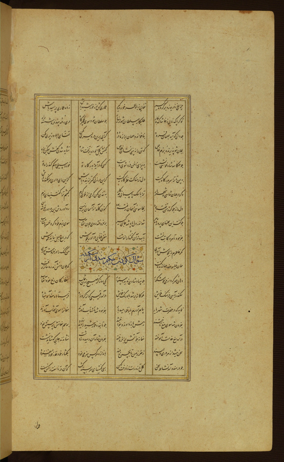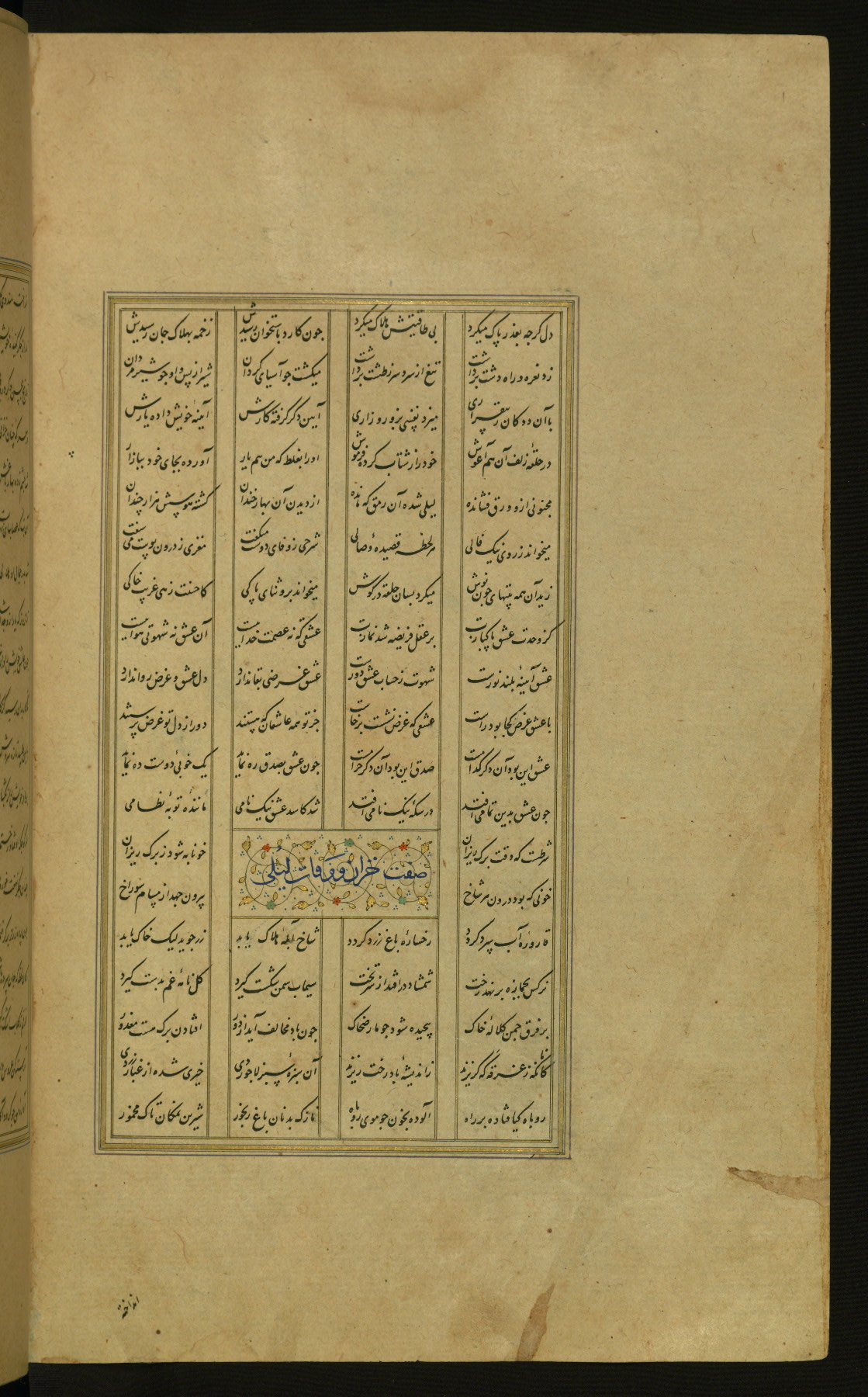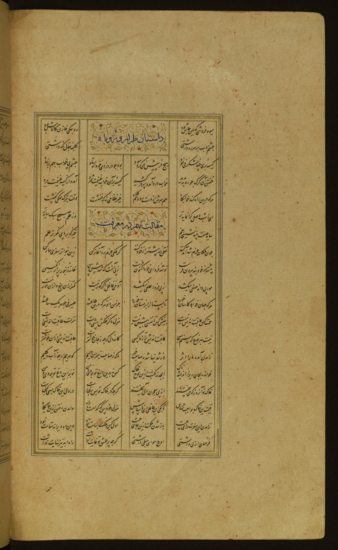 This illuminated and illustrated copy of the Khamsah (quintet) of Niẓāmī Ganjavī (d. 605 AH / 1209 CE) was written by Yār Muḥammad al-Haravī in 922 AH / 1516 CE. Written in four columns in black nastaʿlīq script, this manuscript opens with a double-page illuminated frontispiece signed by ʿAbd al-Wahhāb ibn ʿAbd al-Fattāḥ ibn ʿAlī. It contains thirty-five illustrations that were repainted in India during the twelfth century AH / eighteenth CE. The seal of Muḥammad Asharf ibn Muḥammad Khātam al-Ḥusaynī, dated 1173 AH / 1759-60 CE appears on fols. 1a and 401a. It is possible that the brown leather binding with center and side panels brushed with gold is original to the manuscript but was repaired at a later stage in the codex's history.