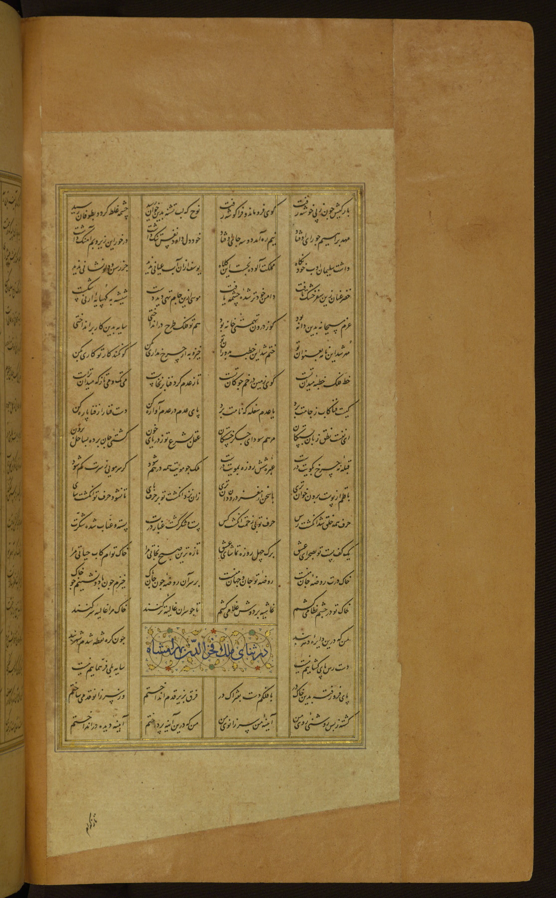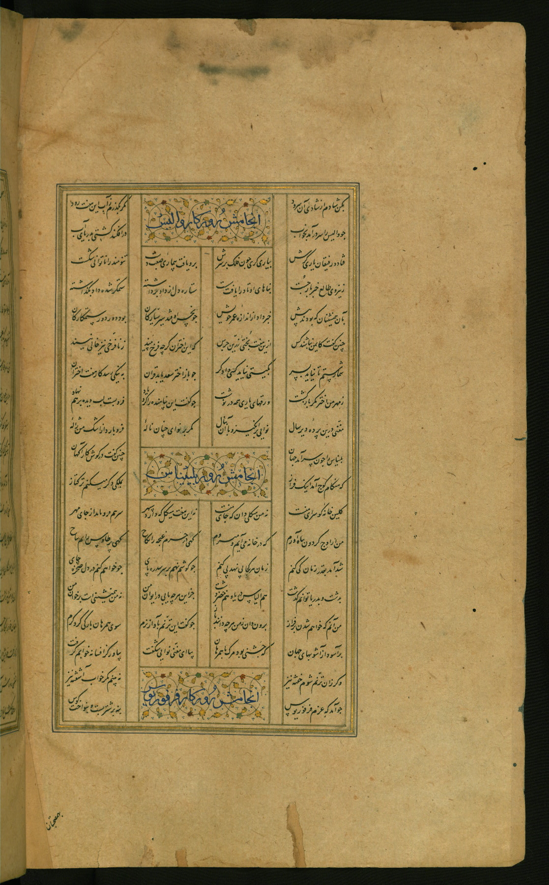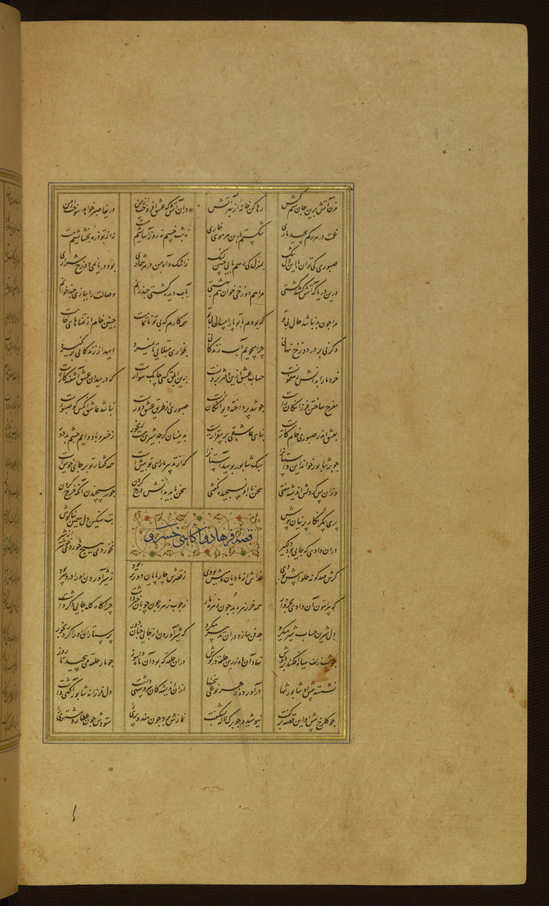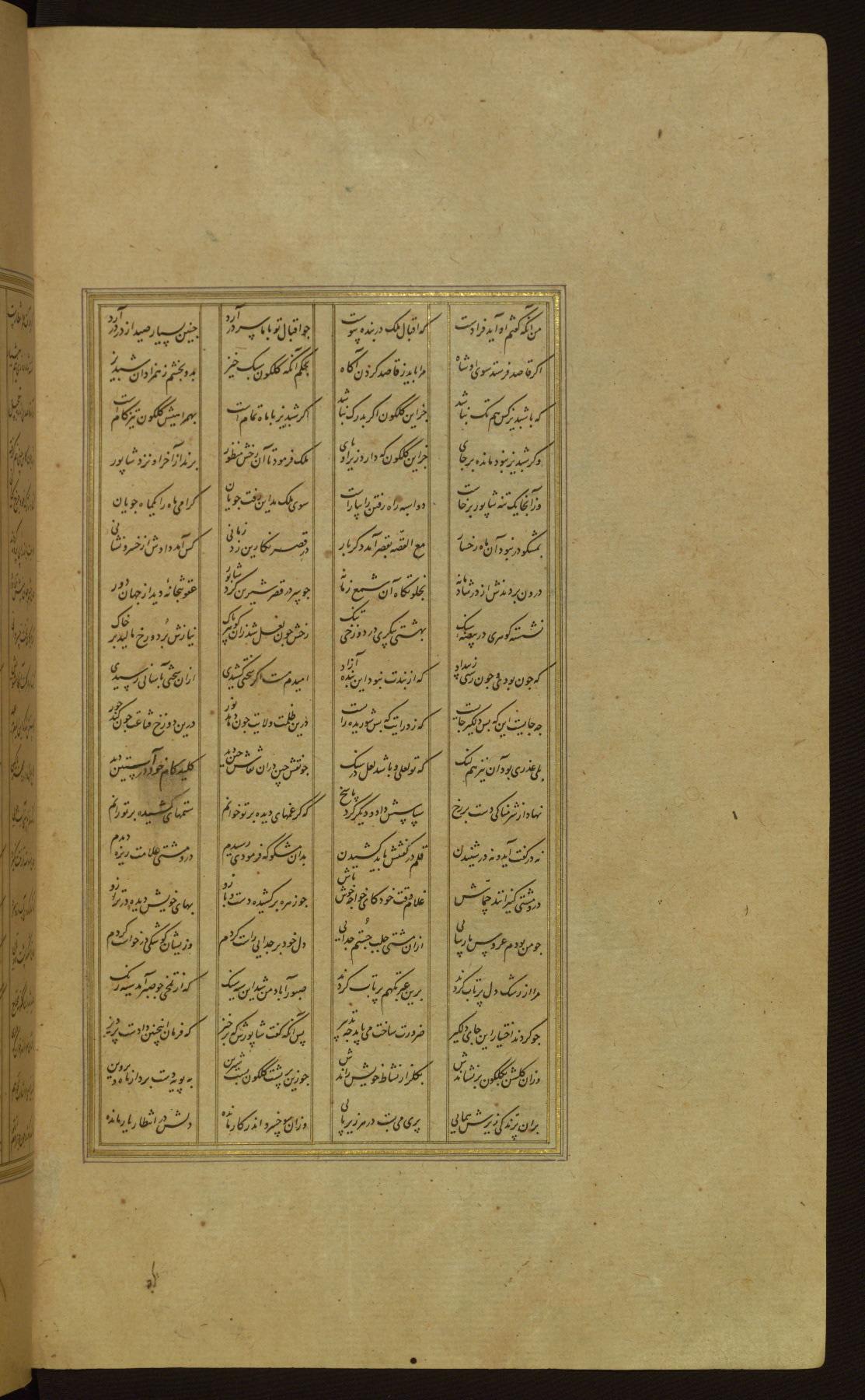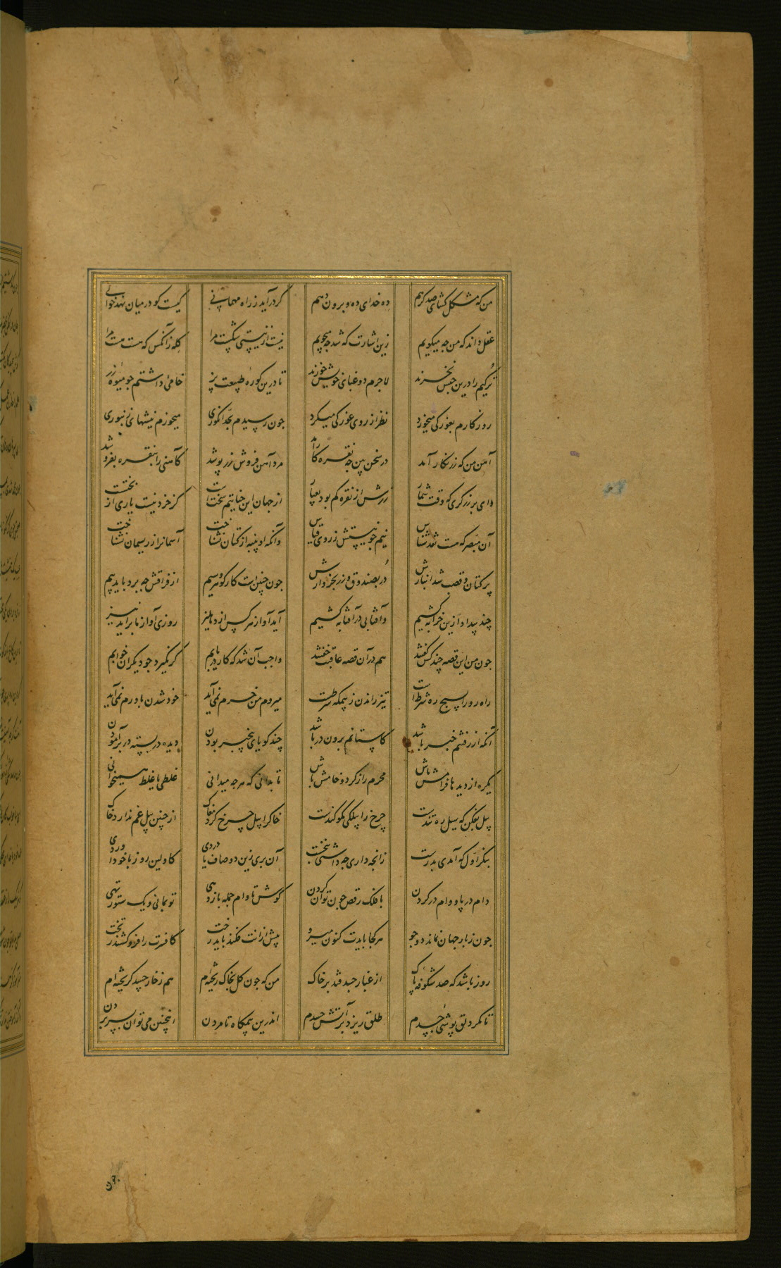 This illuminated and illustrated copy of the Khamsah (quintet) of Niẓāmī Ganjavī (d. 605 AH / 1209 CE) was written by Yār Muḥammad al-Haravī in 922 AH / 1516 CE. Written in four columns in black nastaʿlīq script, this manuscript opens with a double-page illuminated frontispiece signed by ʿAbd al-Wahhāb ibn ʿAbd al-Fattāḥ ibn ʿAlī. It contains thirty-five illustrations that were repainted in India during the twelfth century AH / eighteenth CE. The seal of Muḥammad Asharf ibn Muḥammad Khātam al-Ḥusaynī, dated 1173 AH / 1759-60 CE appears on fols. 1a and 401a. It is possible that the brown leather binding with center and side panels brushed with gold is original to the manuscript but was repaired at a later stage in the codex's history.