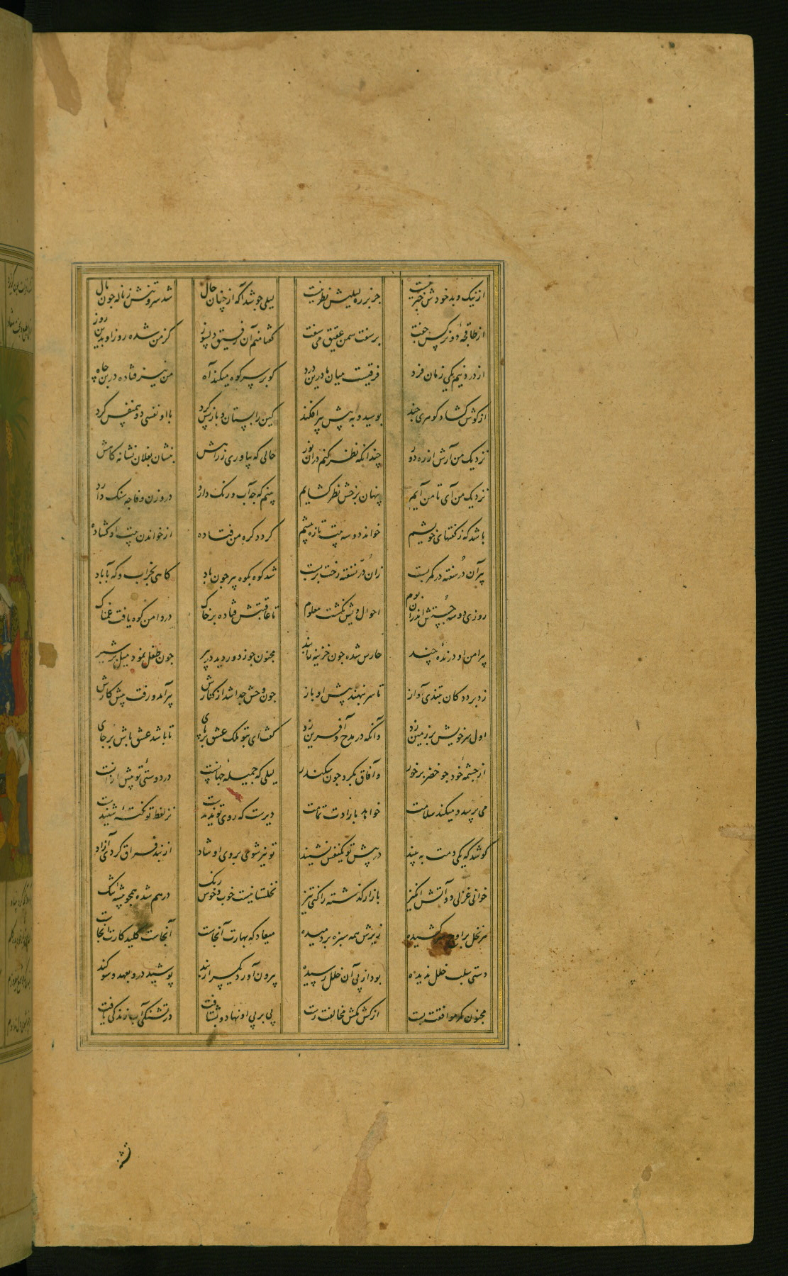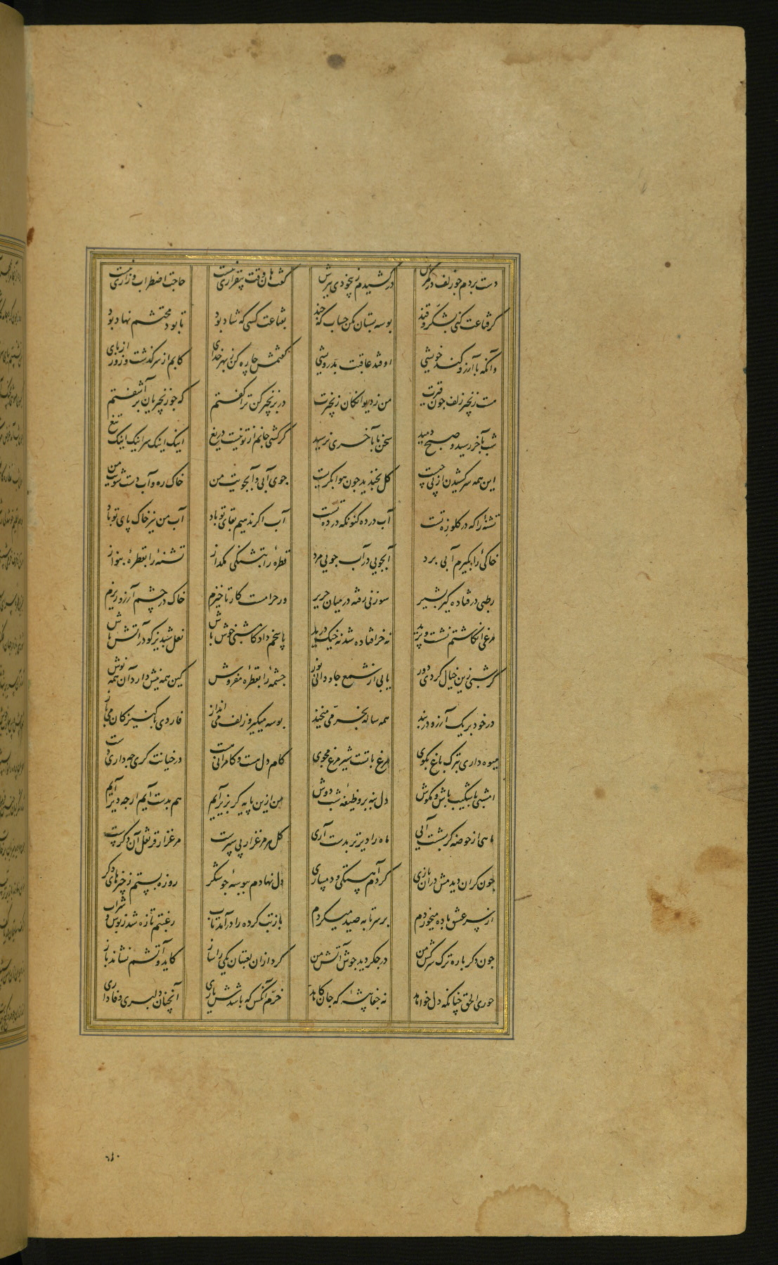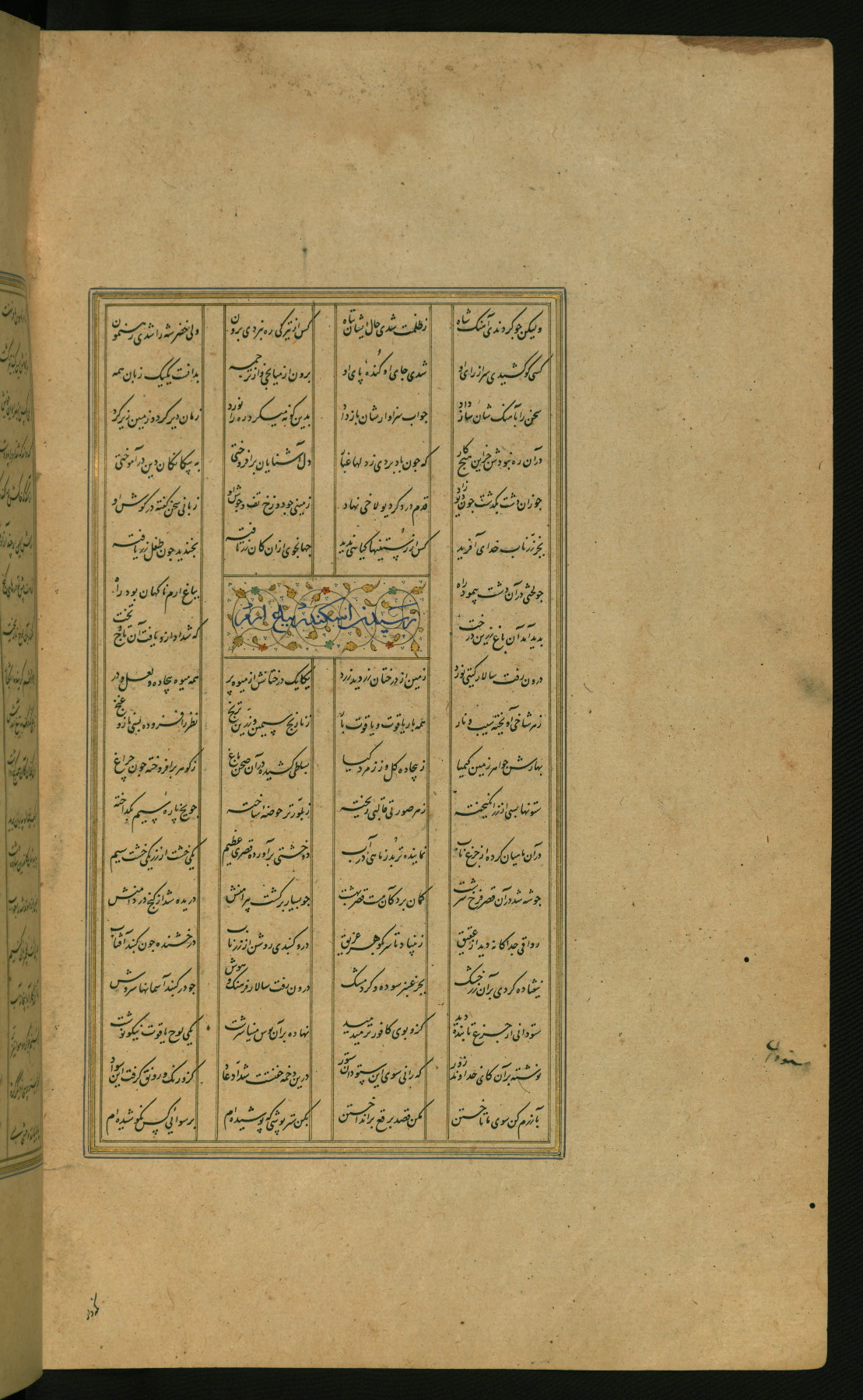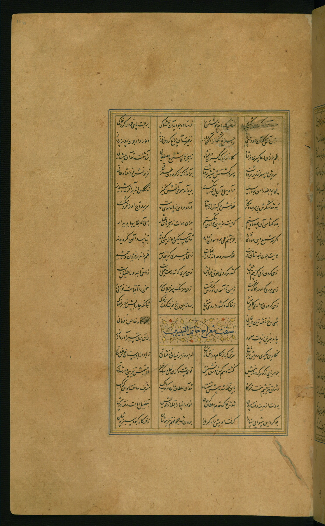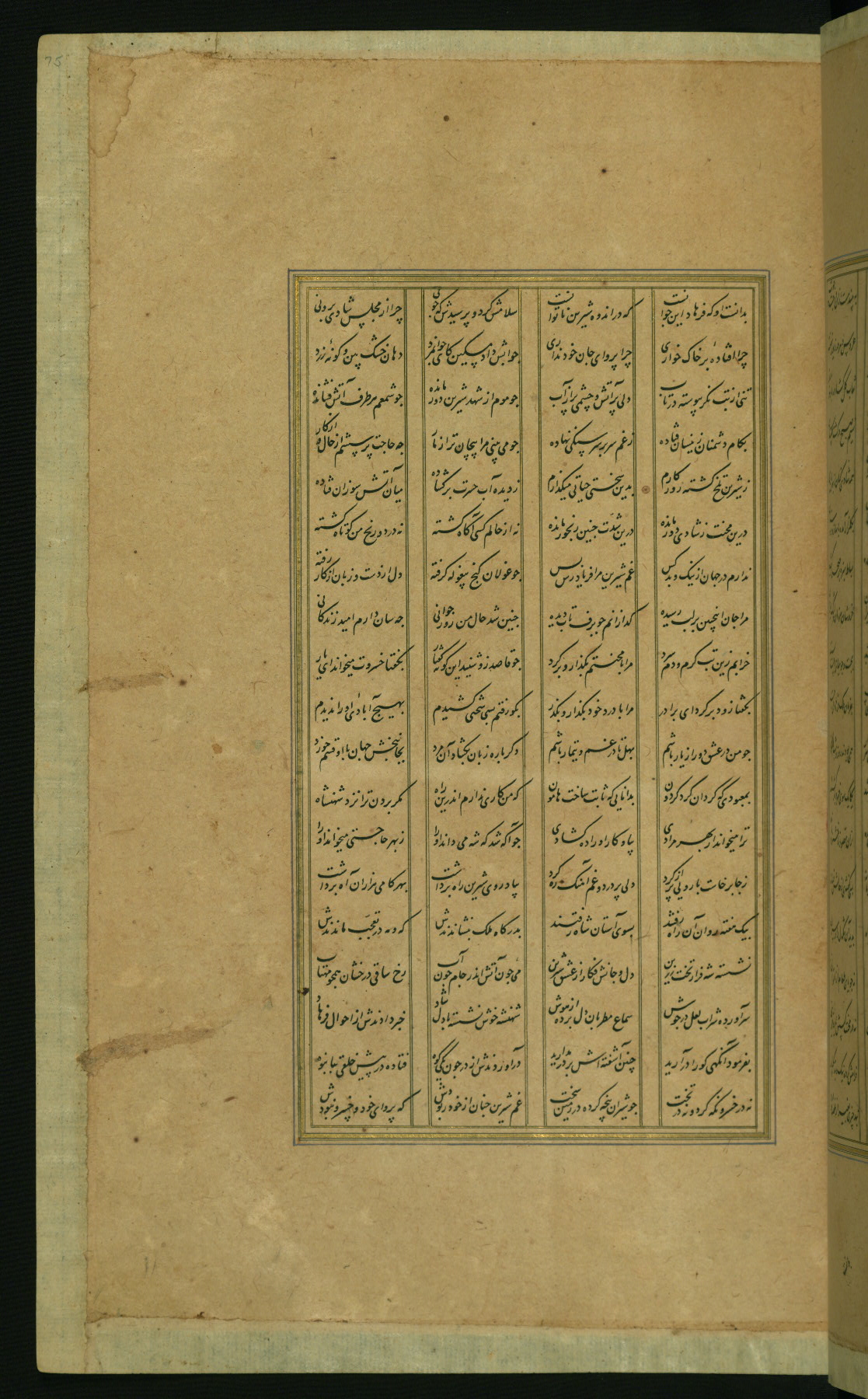 This illuminated and illustrated copy of the Khamsah (quintet) of Niẓāmī Ganjavī (d. 605 AH / 1209 CE) was written by Yār Muḥammad al-Haravī in 922 AH / 1516 CE. Written in four columns in black nastaʿlīq script, this manuscript opens with a double-page illuminated frontispiece signed by ʿAbd al-Wahhāb ibn ʿAbd al-Fattāḥ ibn ʿAlī. It contains thirty-five illustrations that were repainted in India during the twelfth century AH / eighteenth CE. The seal of Muḥammad Asharf ibn Muḥammad Khātam al-Ḥusaynī, dated 1173 AH / 1759-60 CE appears on fols. 1a and 401a. It is possible that the brown leather binding with center and side panels brushed with gold is original to the manuscript but was repaired at a later stage in the codex's history.