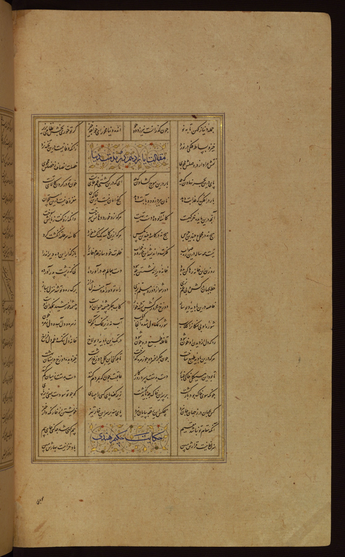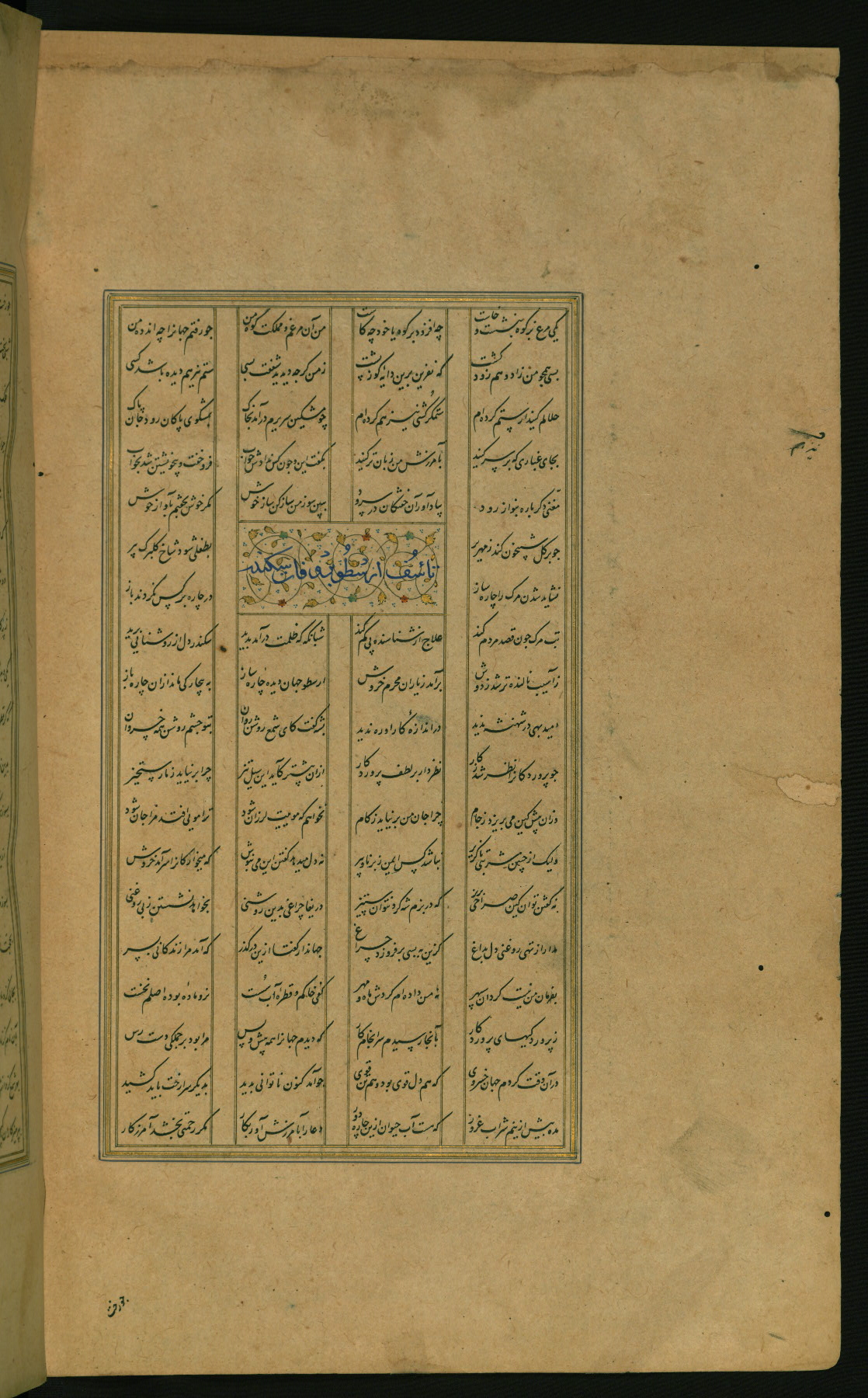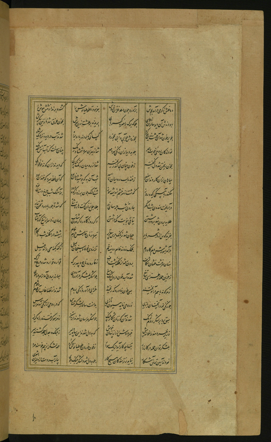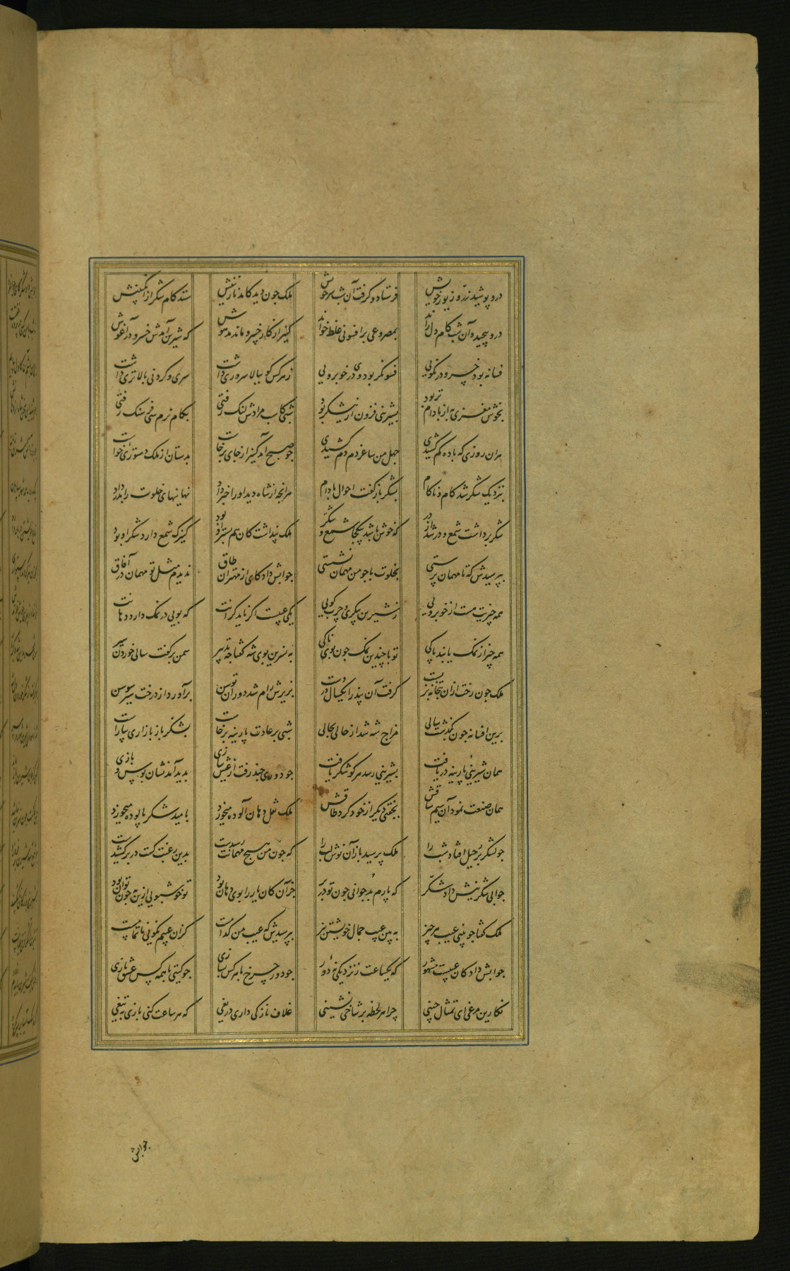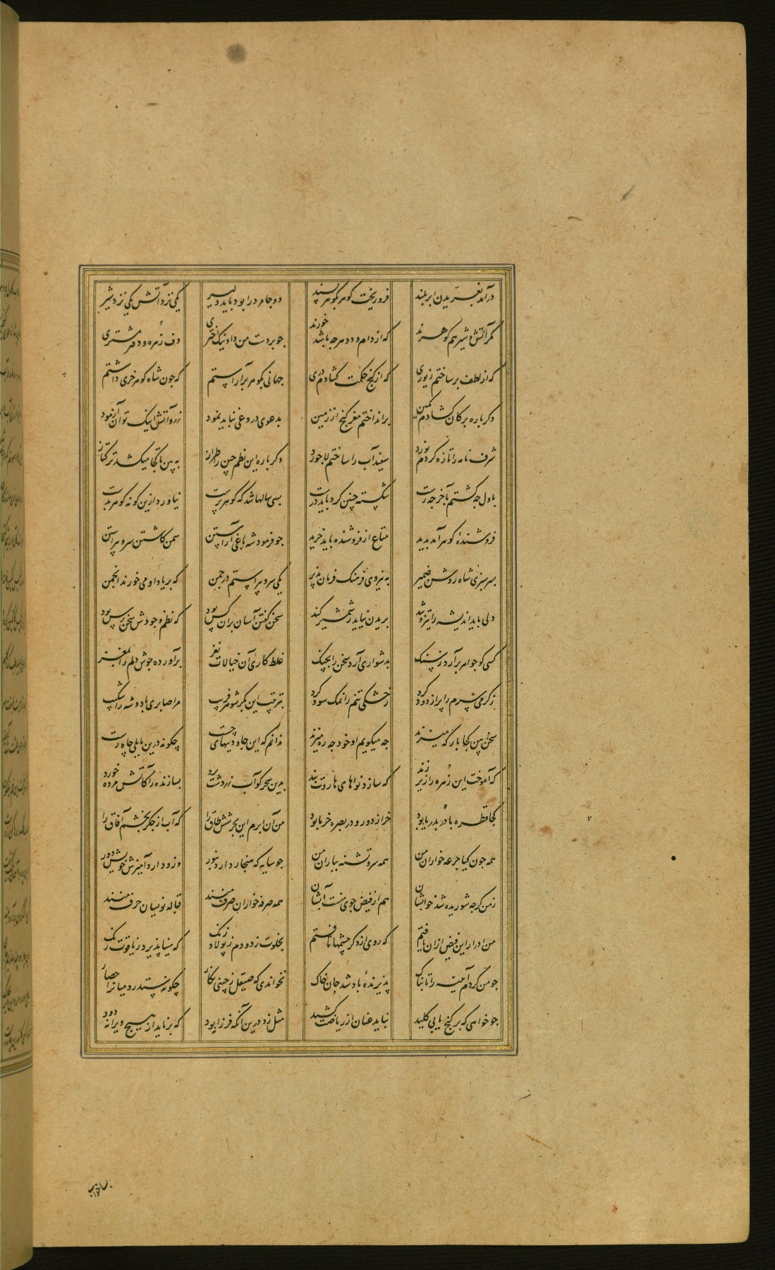 This illuminated and illustrated copy of the Khamsah (quintet) of Niẓāmī Ganjavī (d. 605 AH / 1209 CE) was written by Yār Muḥammad al-Haravī in 922 AH / 1516 CE. Written in four columns in black nastaʿlīq script, this manuscript opens with a double-page illuminated frontispiece signed by ʿAbd al-Wahhāb ibn ʿAbd al-Fattāḥ ibn ʿAlī. It contains thirty-five illustrations that were repainted in India during the twelfth century AH / eighteenth CE. The seal of Muḥammad Asharf ibn Muḥammad Khātam al-Ḥusaynī, dated 1173 AH / 1759-60 CE appears on fols. 1a and 401a. It is possible that the brown leather binding with center and side panels brushed with gold is original to the manuscript but was repaired at a later stage in the codex's history.