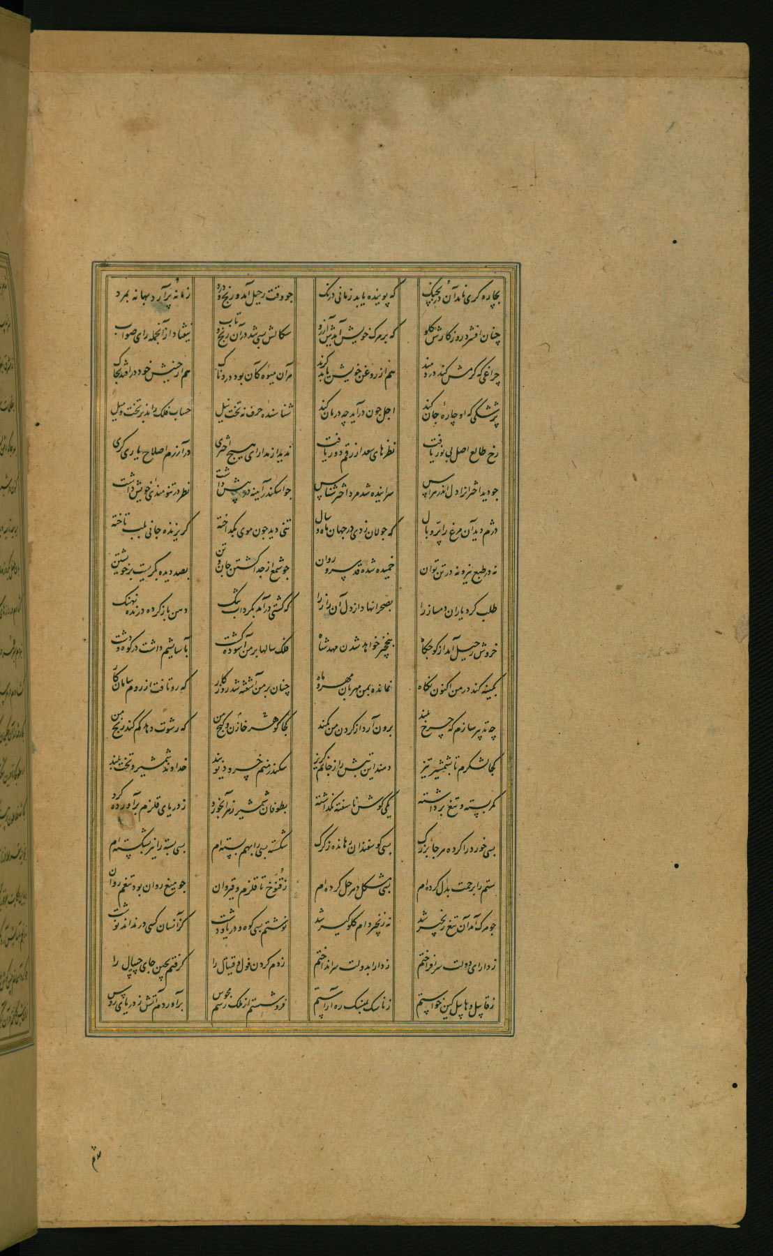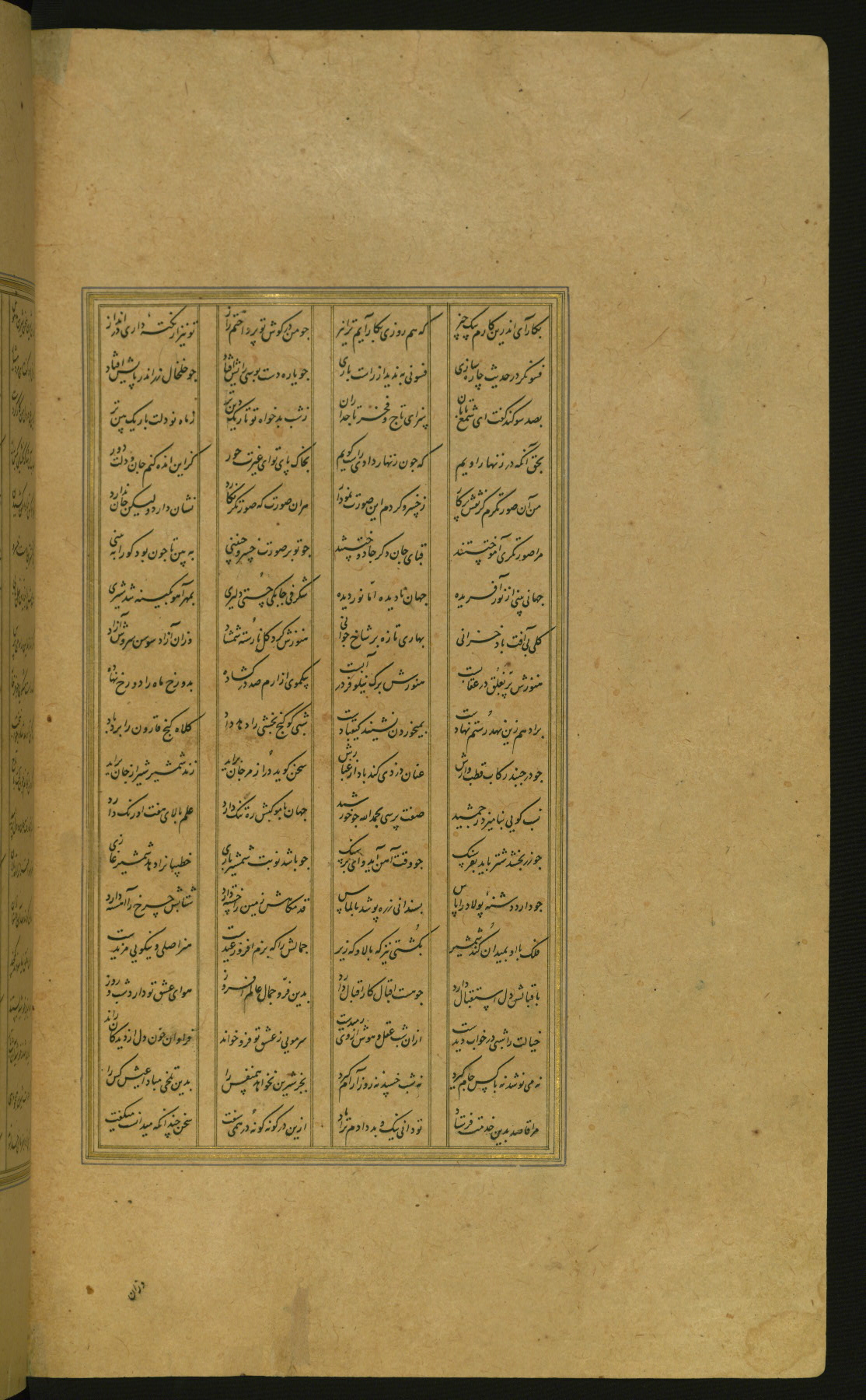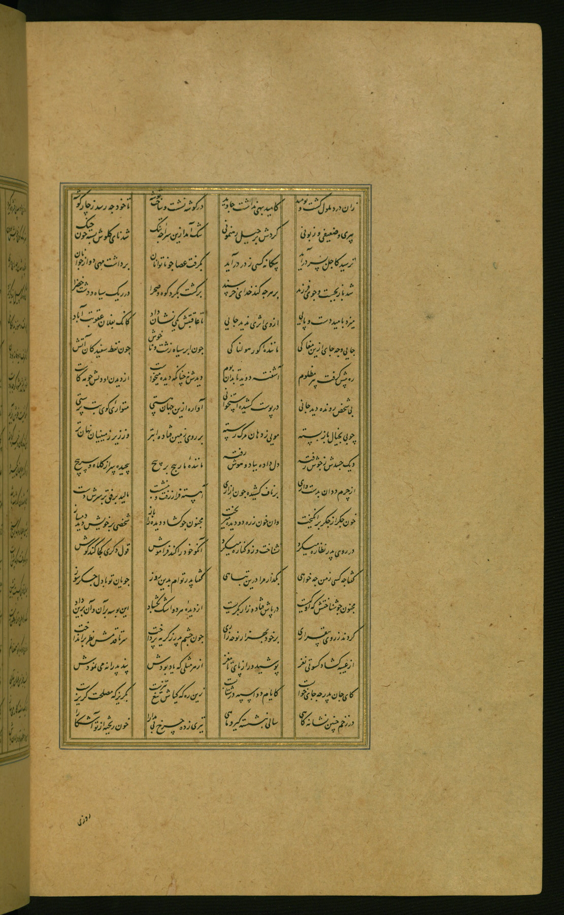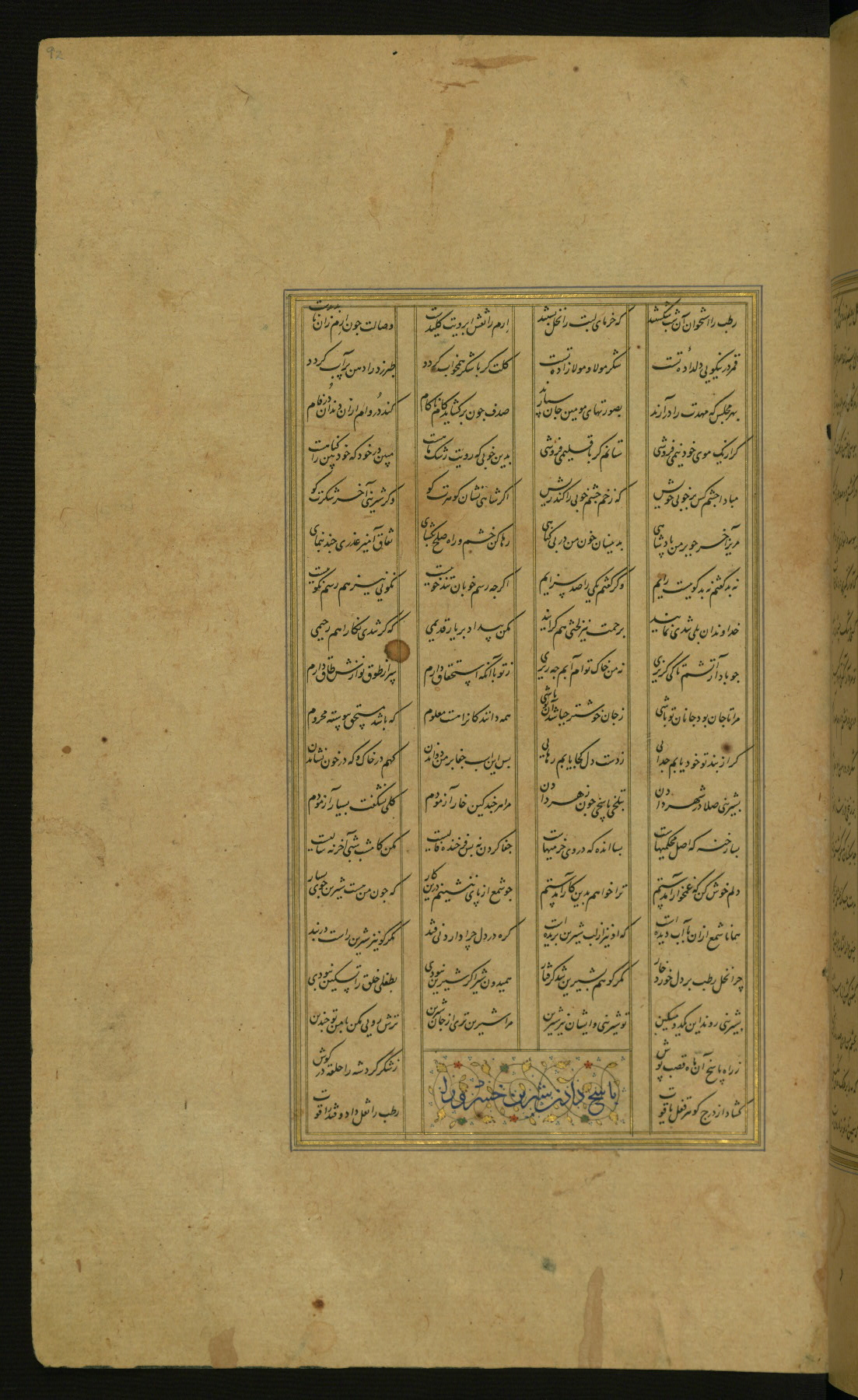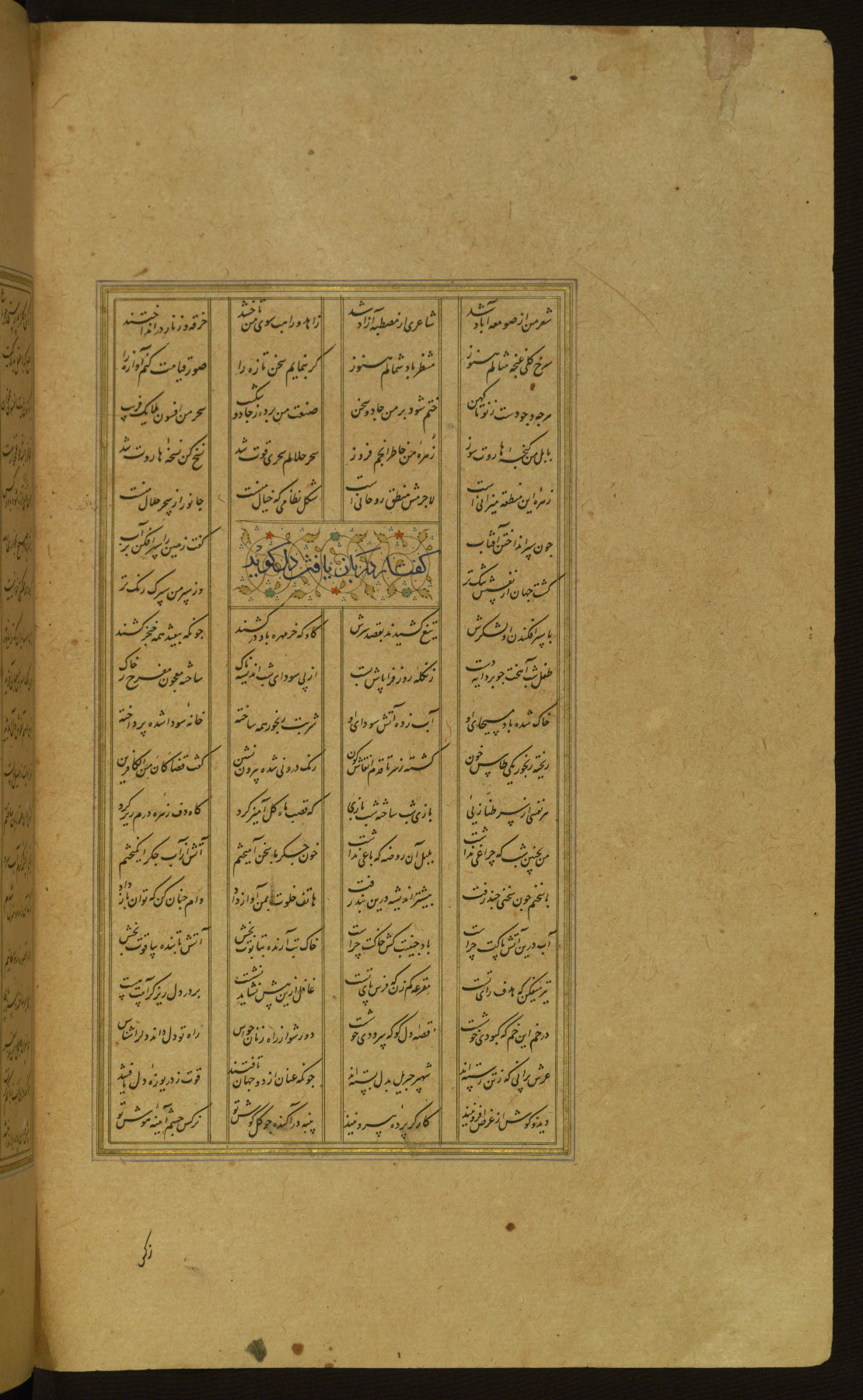 This illuminated and illustrated copy of the Khamsah (quintet) of Niẓāmī Ganjavī (d. 605 AH / 1209 CE) was written by Yār Muḥammad al-Haravī in 922 AH / 1516 CE. Written in four columns in black nastaʿlīq script, this manuscript opens with a double-page illuminated frontispiece signed by ʿAbd al-Wahhāb ibn ʿAbd al-Fattāḥ ibn ʿAlī. It contains thirty-five illustrations that were repainted in India during the twelfth century AH / eighteenth CE. The seal of Muḥammad Asharf ibn Muḥammad Khātam al-Ḥusaynī, dated 1173 AH / 1759-60 CE appears on fols. 1a and 401a. It is possible that the brown leather binding with center and side panels brushed with gold is original to the manuscript but was repaired at a later stage in the codex's history.