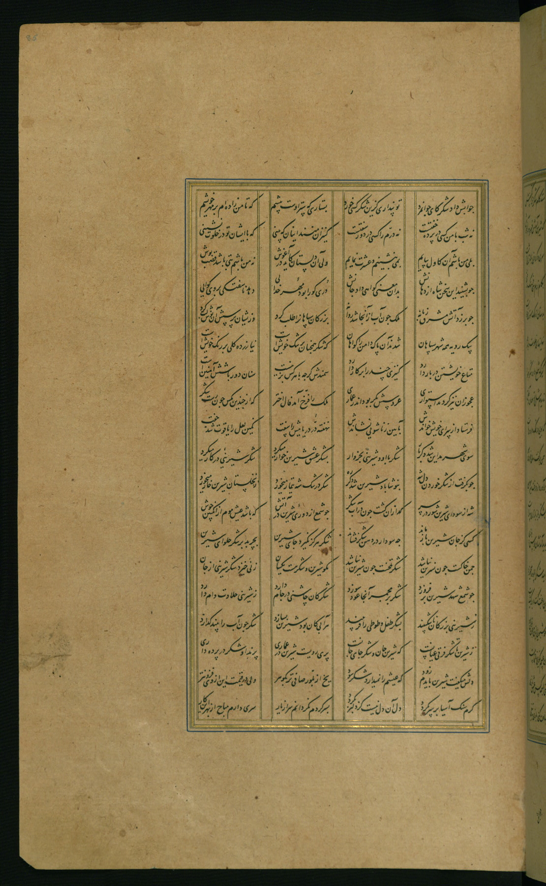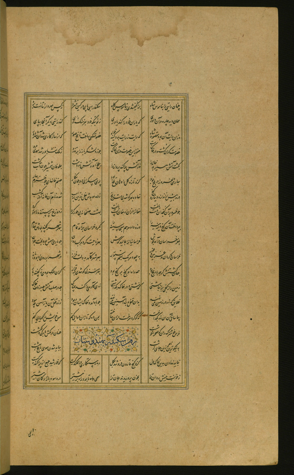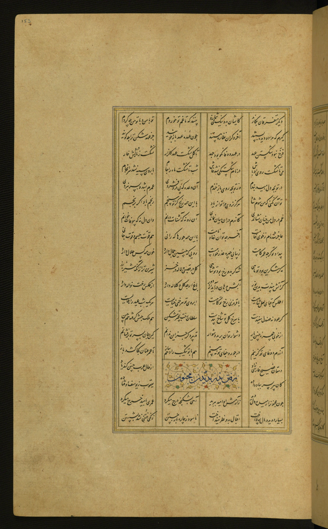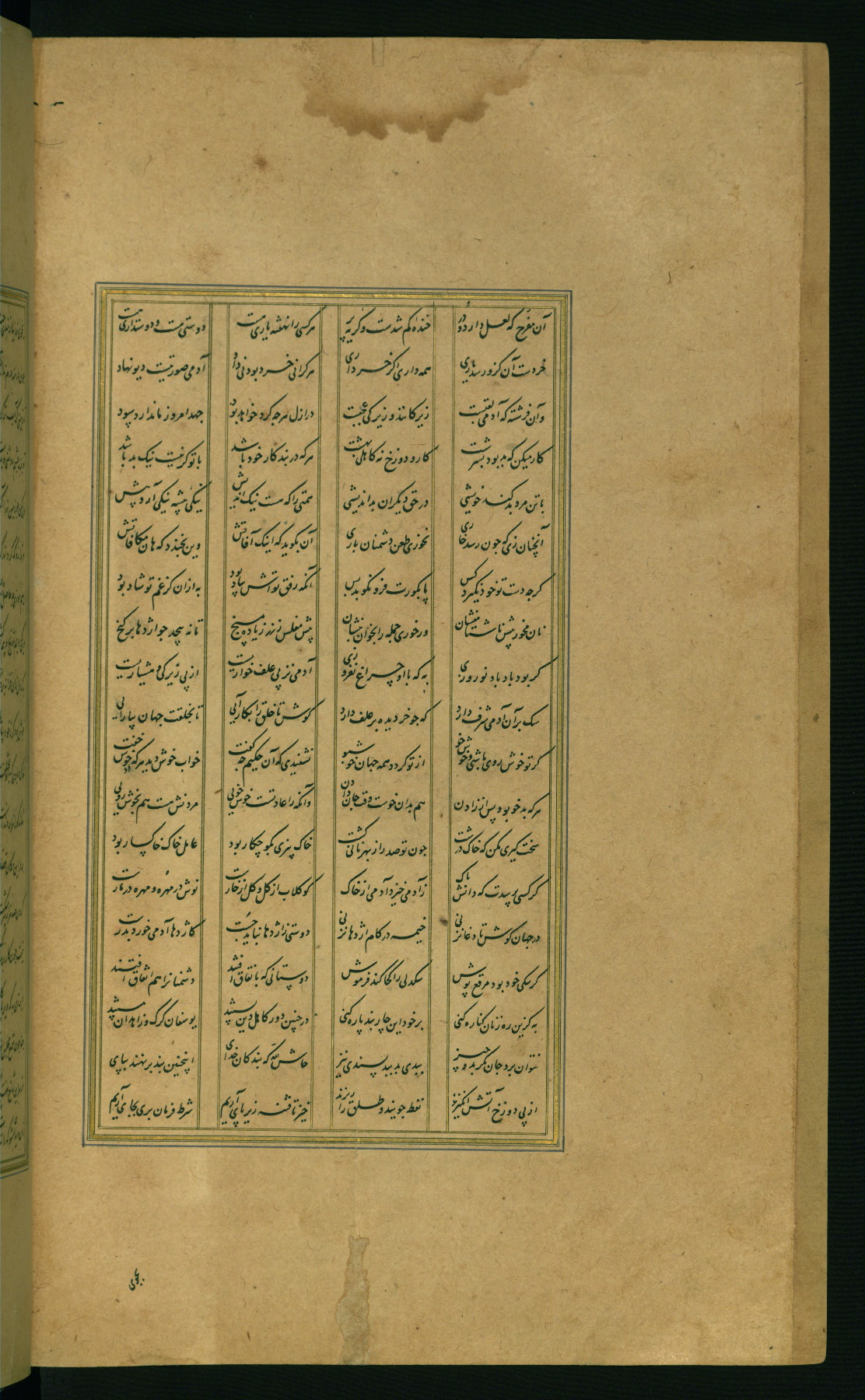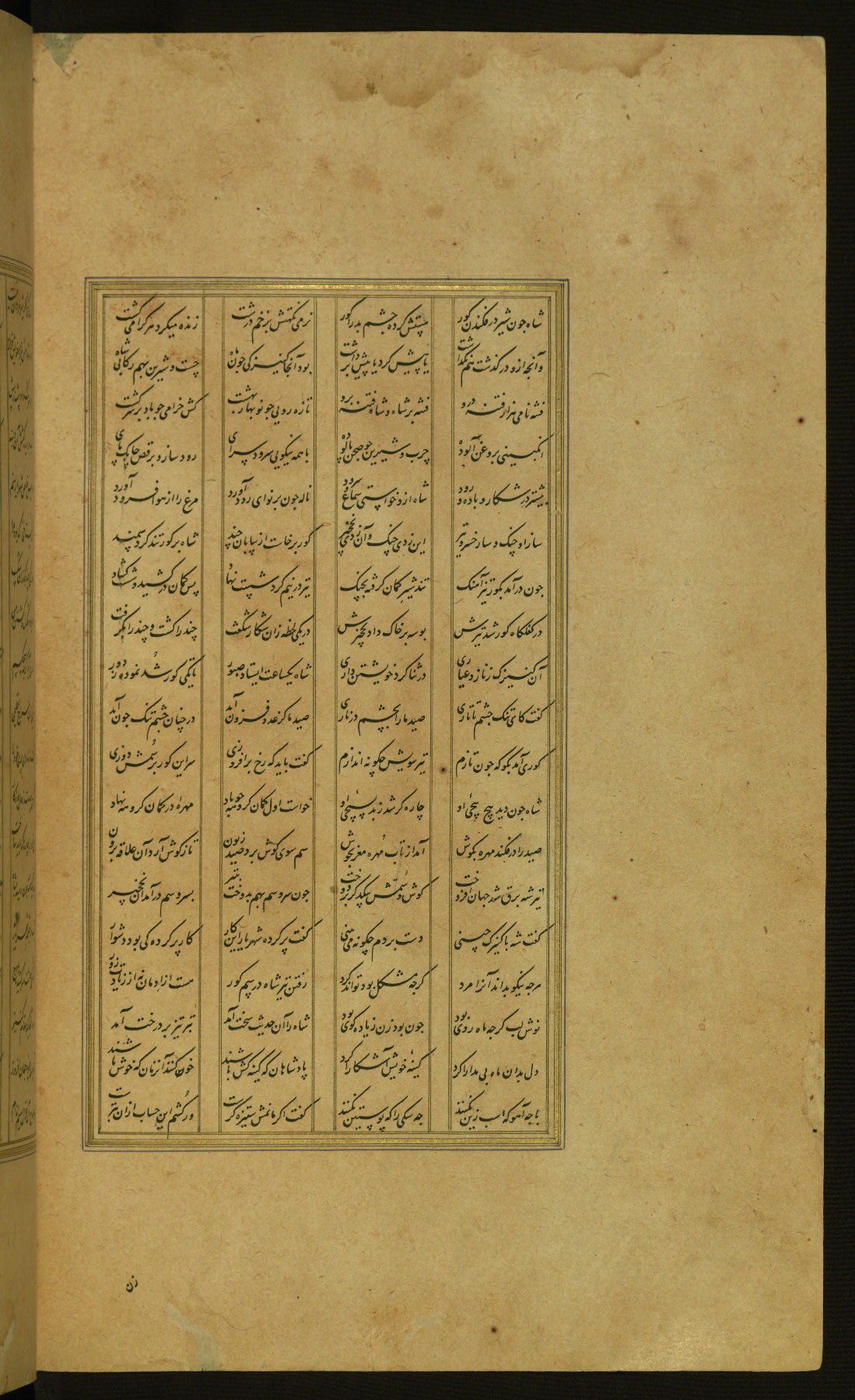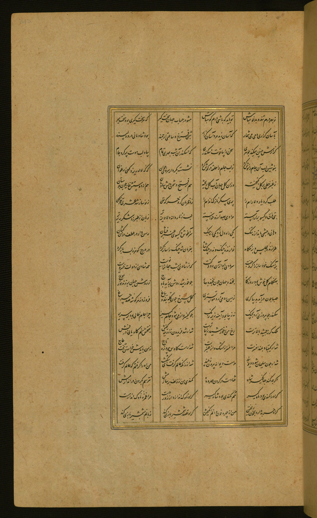 This illuminated and illustrated copy of the Khamsah (quintet) of Niẓāmī Ganjavī (d. 605 AH / 1209 CE) was written by Yār Muḥammad al-Haravī in 922 AH / 1516 CE. Written in four columns in black nastaʿlīq script, this manuscript opens with a double-page illuminated frontispiece signed by ʿAbd al-Wahhāb ibn ʿAbd al-Fattāḥ ibn ʿAlī. It contains thirty-five illustrations that were repainted in India during the twelfth century AH / eighteenth CE. The seal of Muḥammad Asharf ibn Muḥammad Khātam al-Ḥusaynī, dated 1173 AH / 1759-60 CE appears on fols. 1a and 401a. It is possible that the brown leather binding with center and side panels brushed with gold is original to the manuscript but was repaired at a later stage in the codex's history.