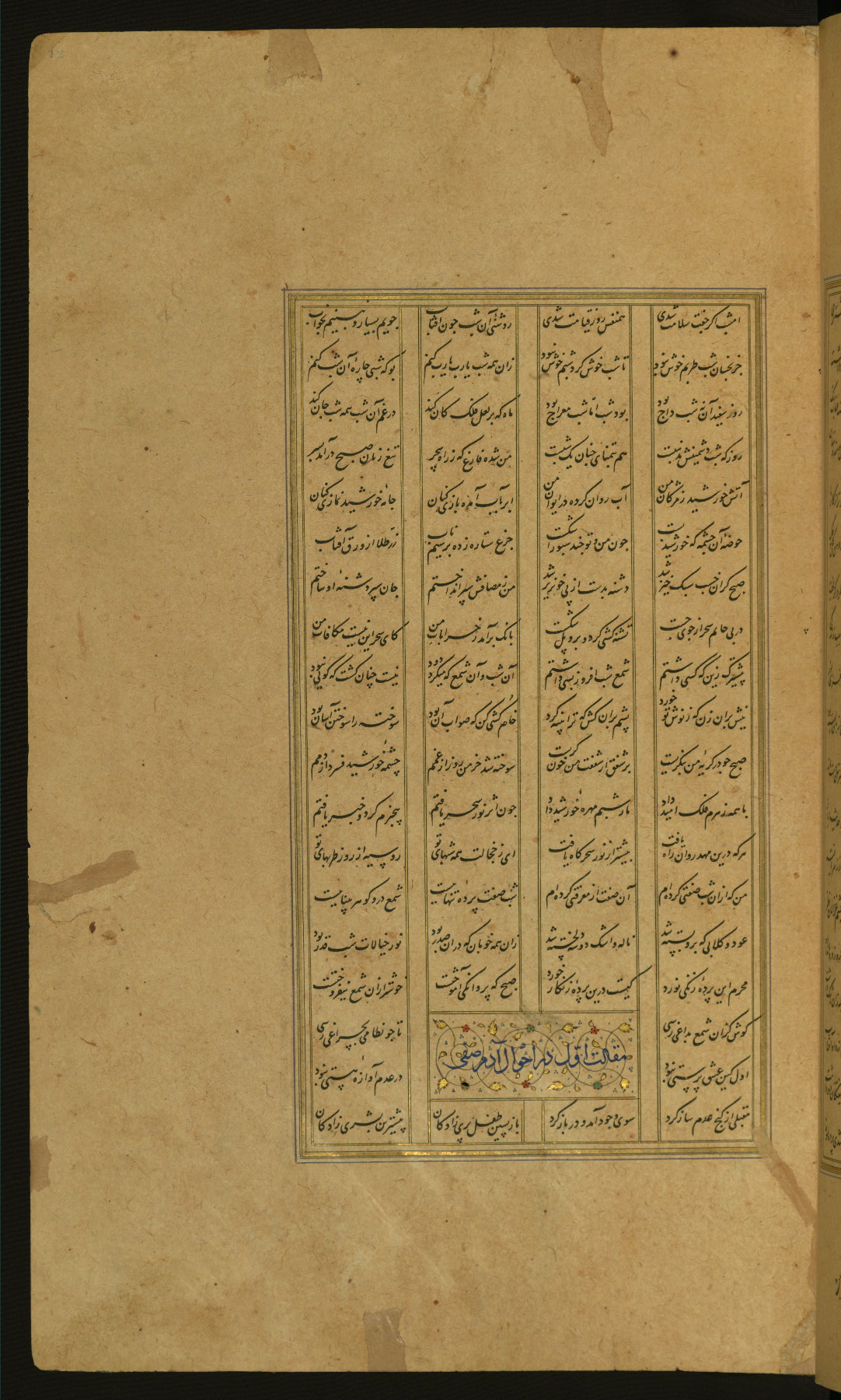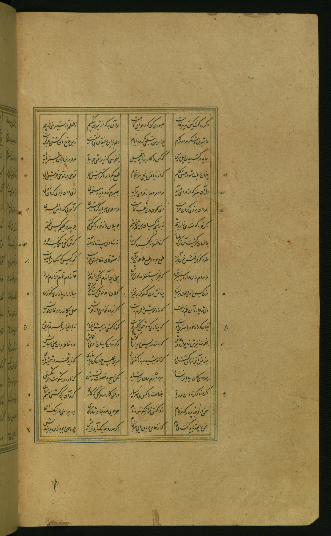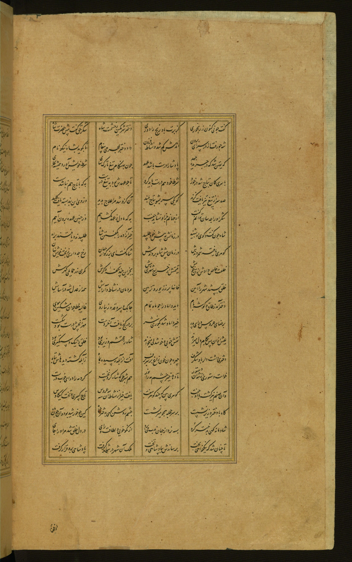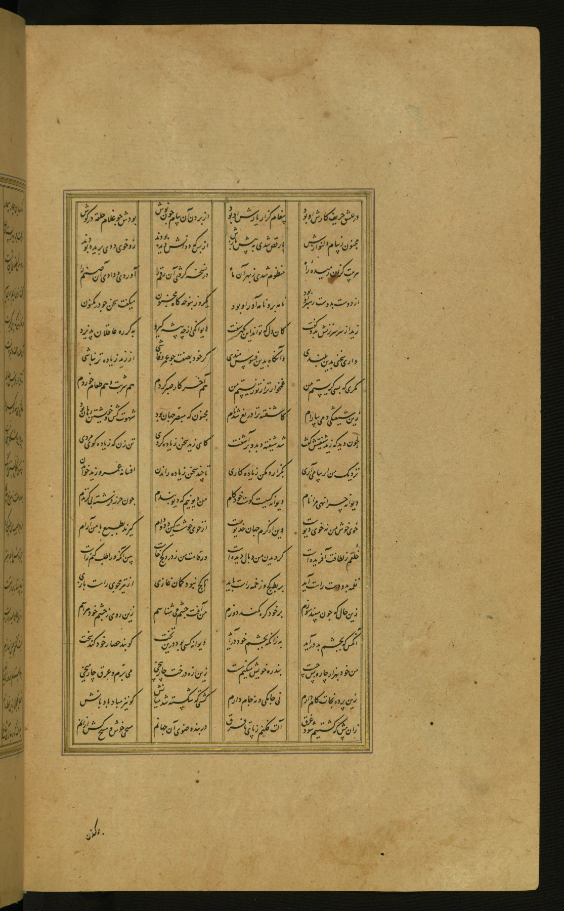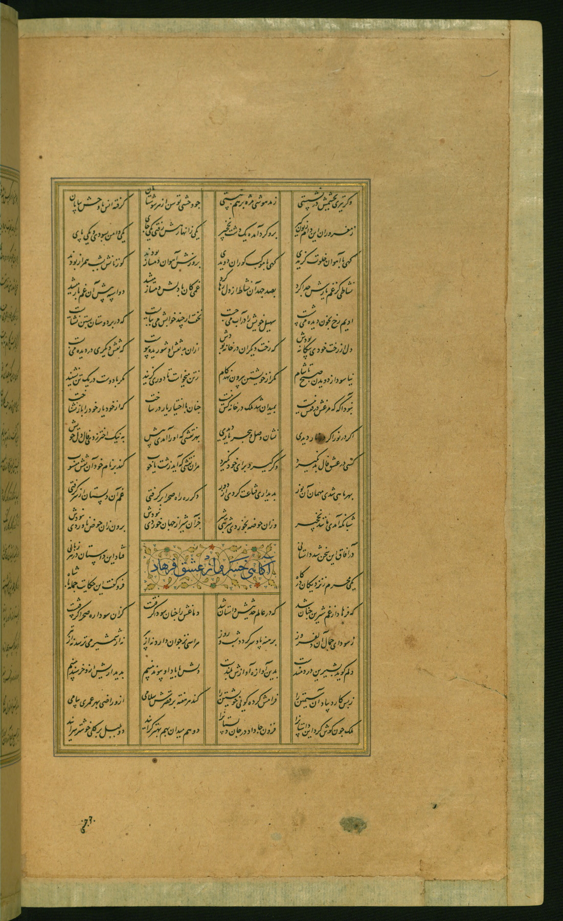 This illuminated and illustrated copy of the Khamsah (quintet) of Niẓāmī Ganjavī (d. 605 AH / 1209 CE) was written by Yār Muḥammad al-Haravī in 922 AH / 1516 CE. Written in four columns in black nastaʿlīq script, this manuscript opens with a double-page illuminated frontispiece signed by ʿAbd al-Wahhāb ibn ʿAbd al-Fattāḥ ibn ʿAlī. It contains thirty-five illustrations that were repainted in India during the twelfth century AH / eighteenth CE. The seal of Muḥammad Asharf ibn Muḥammad Khātam al-Ḥusaynī, dated 1173 AH / 1759-60 CE appears on fols. 1a and 401a. It is possible that the brown leather binding with center and side panels brushed with gold is original to the manuscript but was repaired at a later stage in the codex's history.