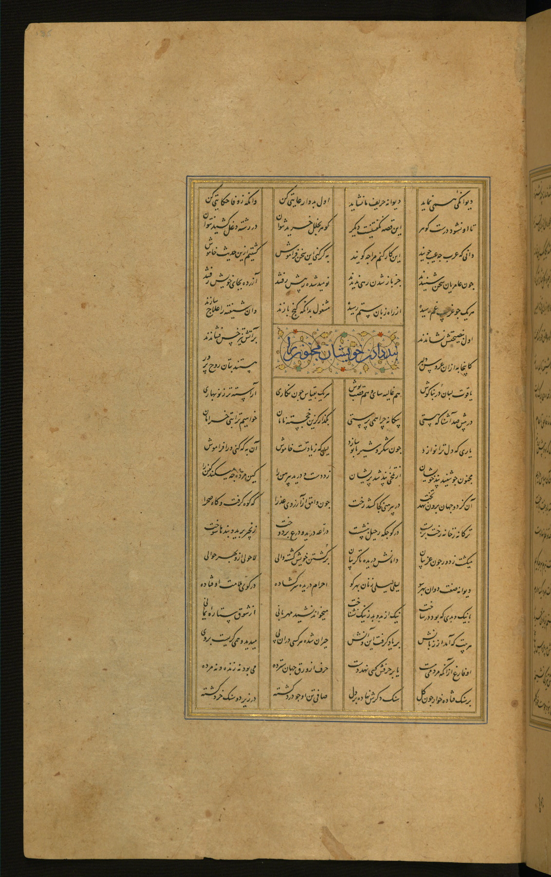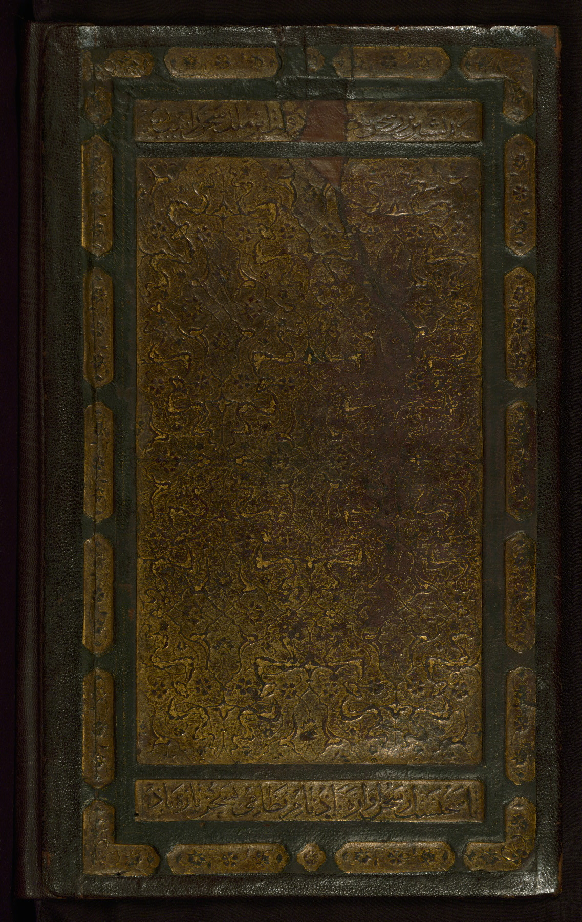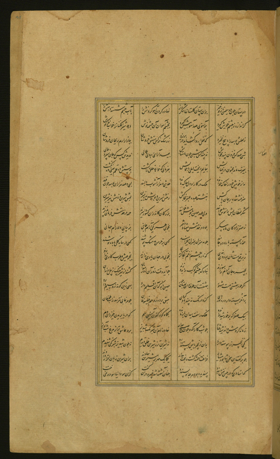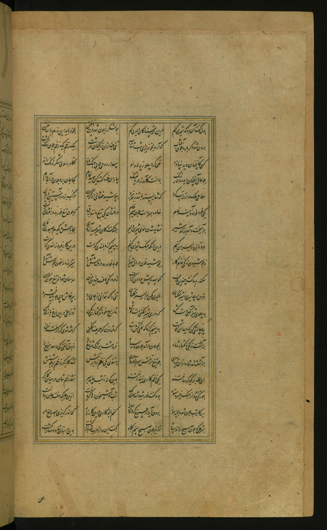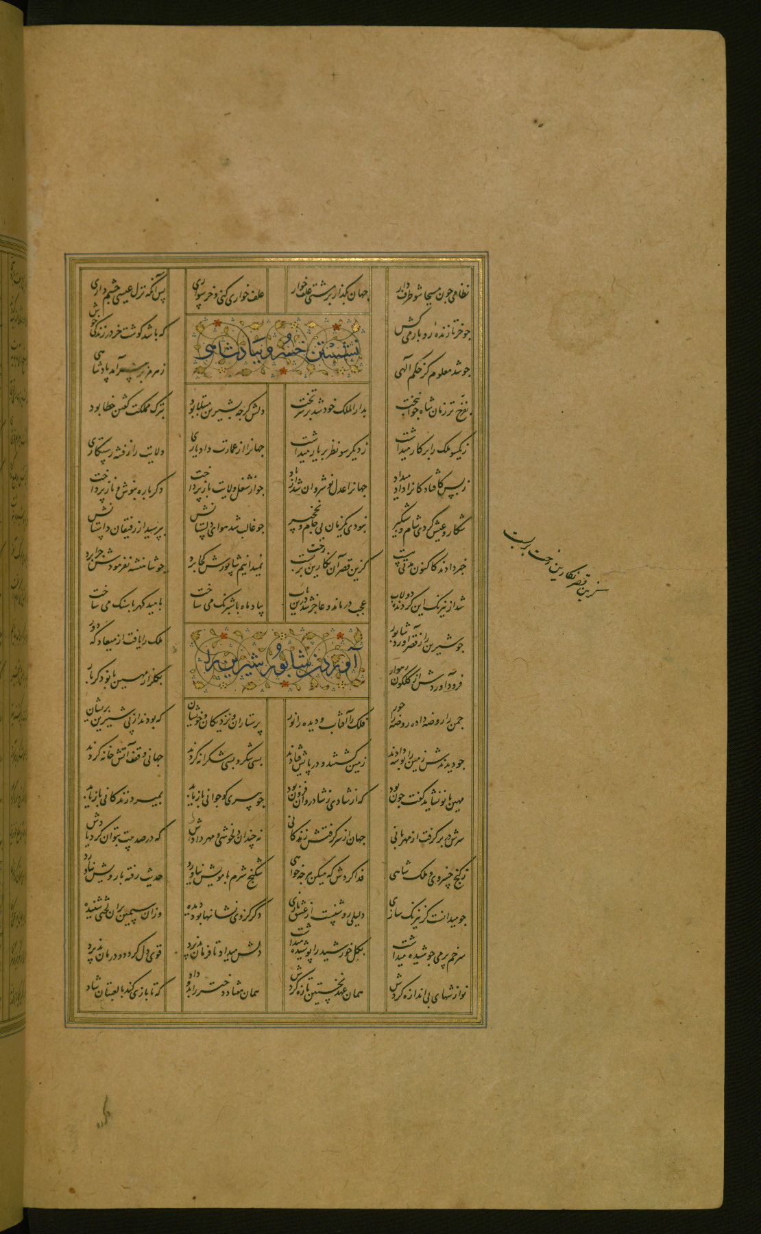 This illuminated and illustrated copy of the Khamsah (quintet) of Niẓāmī Ganjavī (d. 605 AH / 1209 CE) was written by Yār Muḥammad al-Haravī in 922 AH / 1516 CE. Written in four columns in black nastaʿlīq script, this manuscript opens with a double-page illuminated frontispiece signed by ʿAbd al-Wahhāb ibn ʿAbd al-Fattāḥ ibn ʿAlī. It contains thirty-five illustrations that were repainted in India during the twelfth century AH / eighteenth CE. The seal of Muḥammad Asharf ibn Muḥammad Khātam al-Ḥusaynī, dated 1173 AH / 1759-60 CE appears on fols. 1a and 401a. It is possible that the brown leather binding with center and side panels brushed with gold is original to the manuscript but was repaired at a later stage in the codex's history.