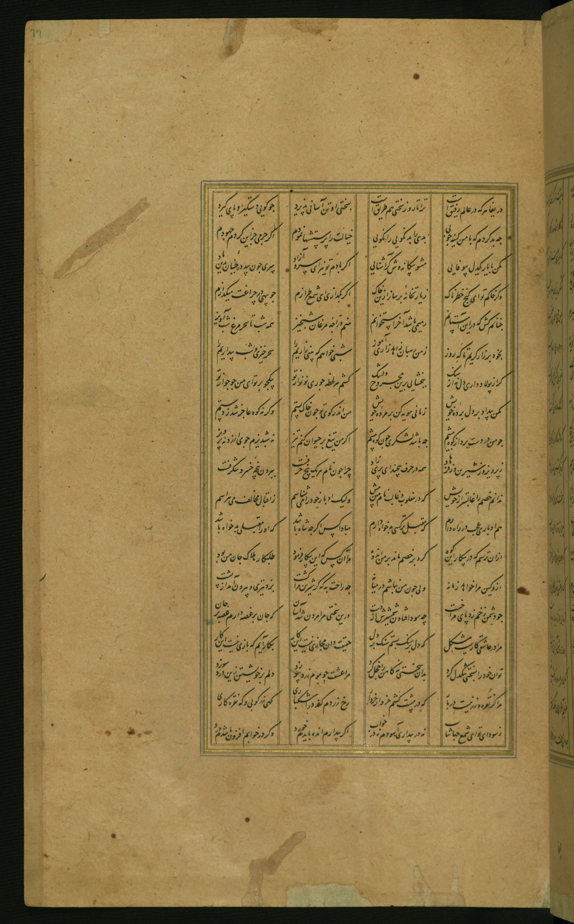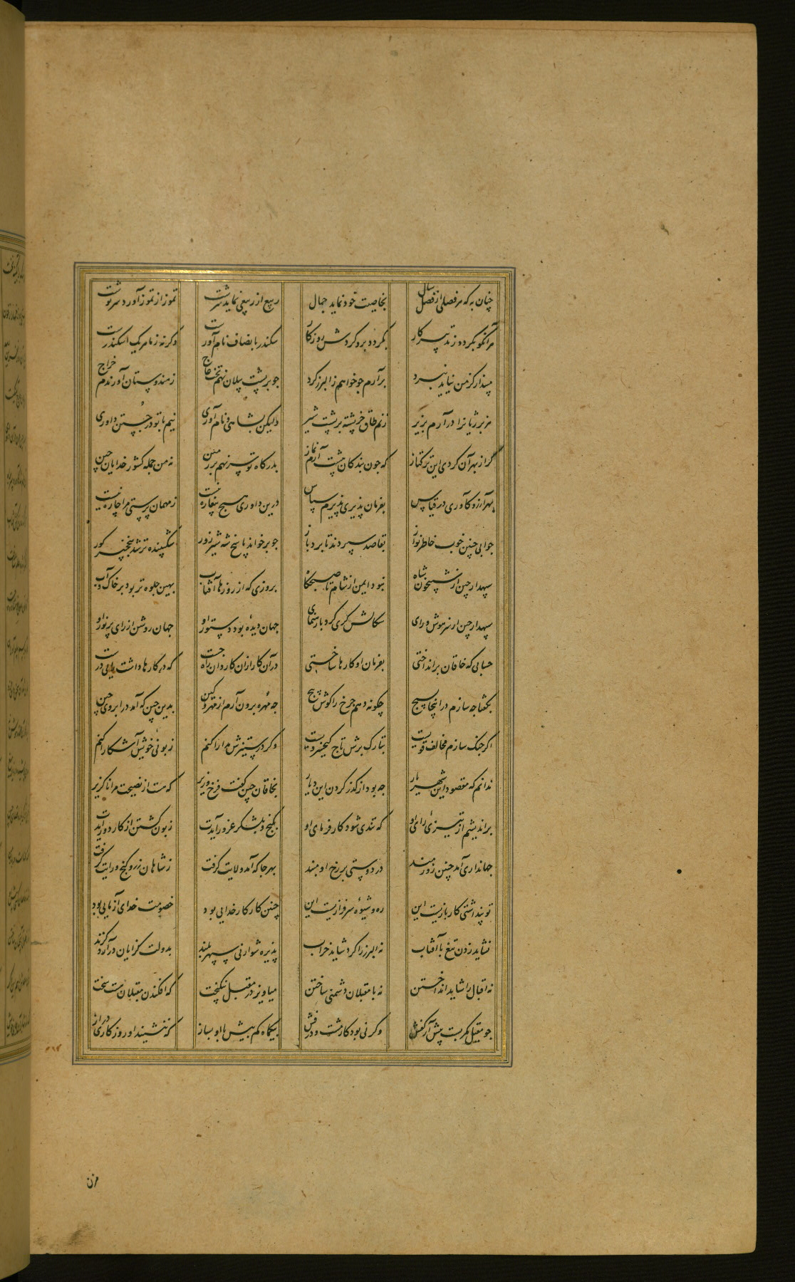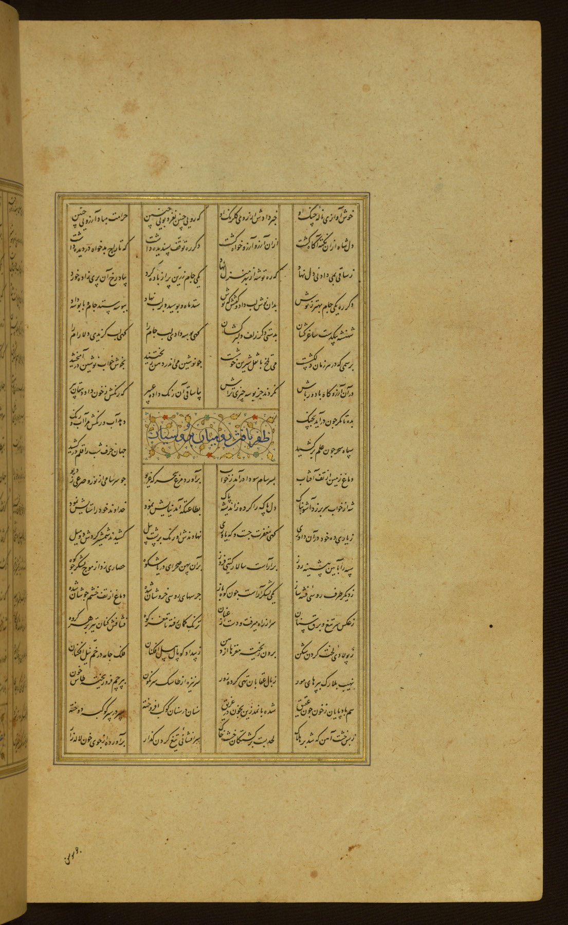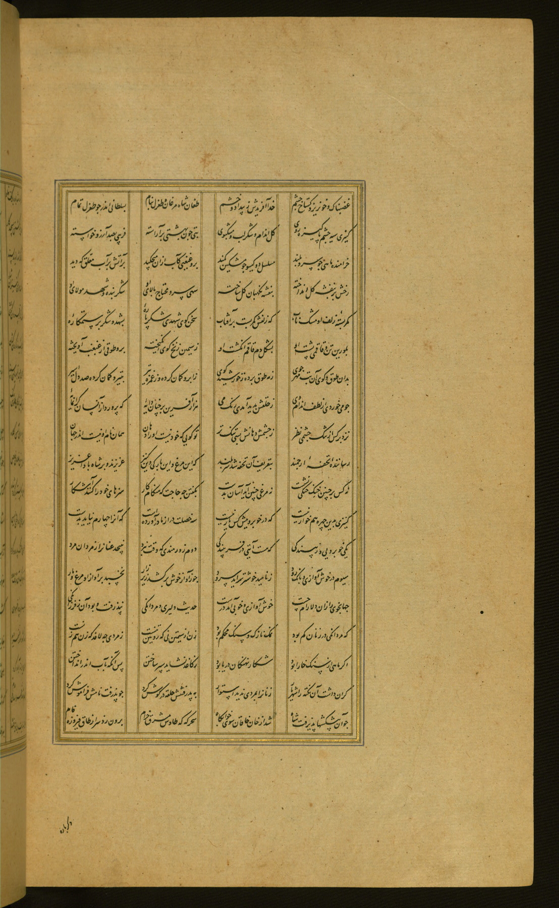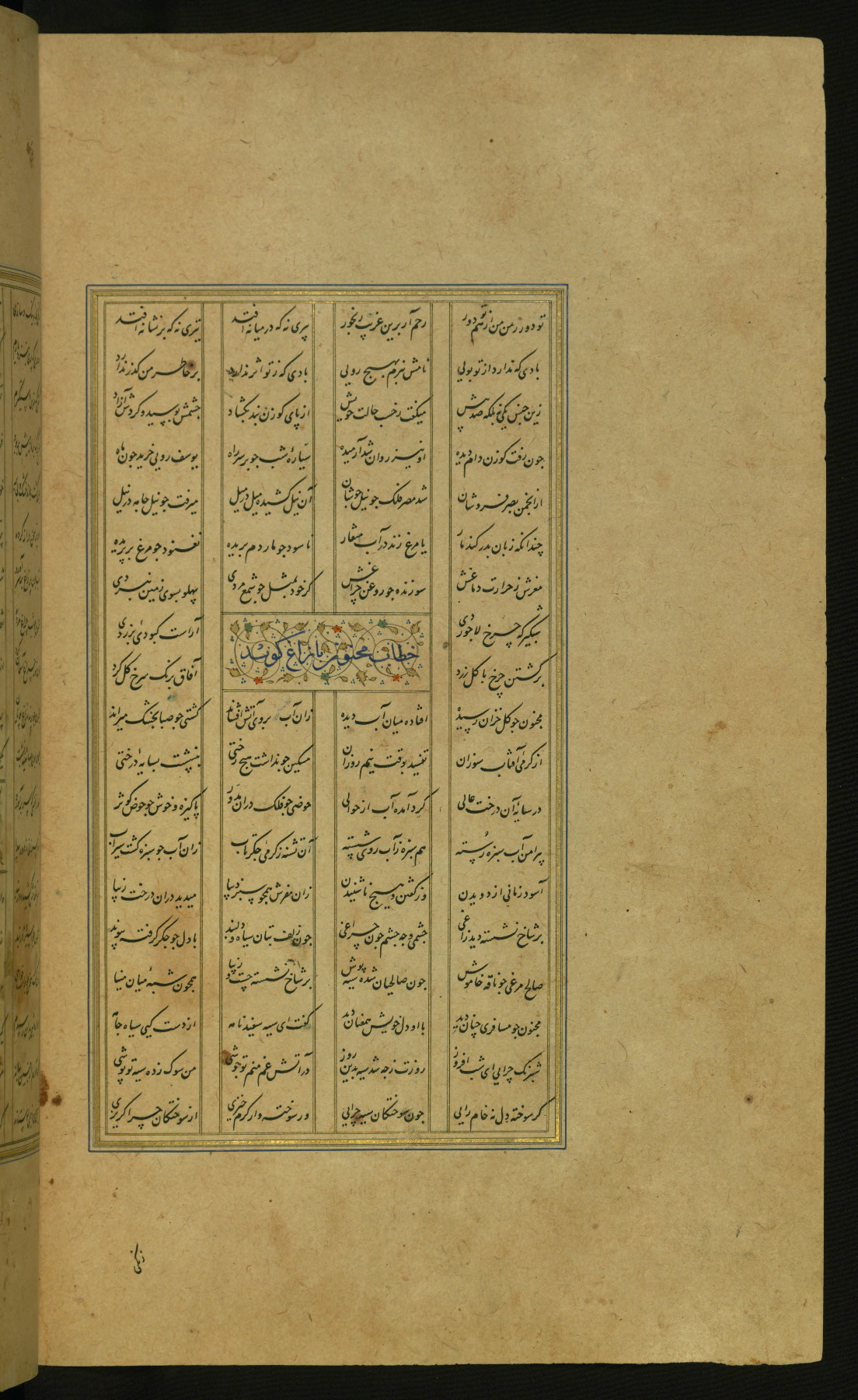 This illuminated and illustrated copy of the Khamsah (quintet) of Niẓāmī Ganjavī (d. 605 AH / 1209 CE) was written by Yār Muḥammad al-Haravī in 922 AH / 1516 CE. Written in four columns in black nastaʿlīq script, this manuscript opens with a double-page illuminated frontispiece signed by ʿAbd al-Wahhāb ibn ʿAbd al-Fattāḥ ibn ʿAlī. It contains thirty-five illustrations that were repainted in India during the twelfth century AH / eighteenth CE. The seal of Muḥammad Asharf ibn Muḥammad Khātam al-Ḥusaynī, dated 1173 AH / 1759-60 CE appears on fols. 1a and 401a. It is possible that the brown leather binding with center and side panels brushed with gold is original to the manuscript but was repaired at a later stage in the codex's history.