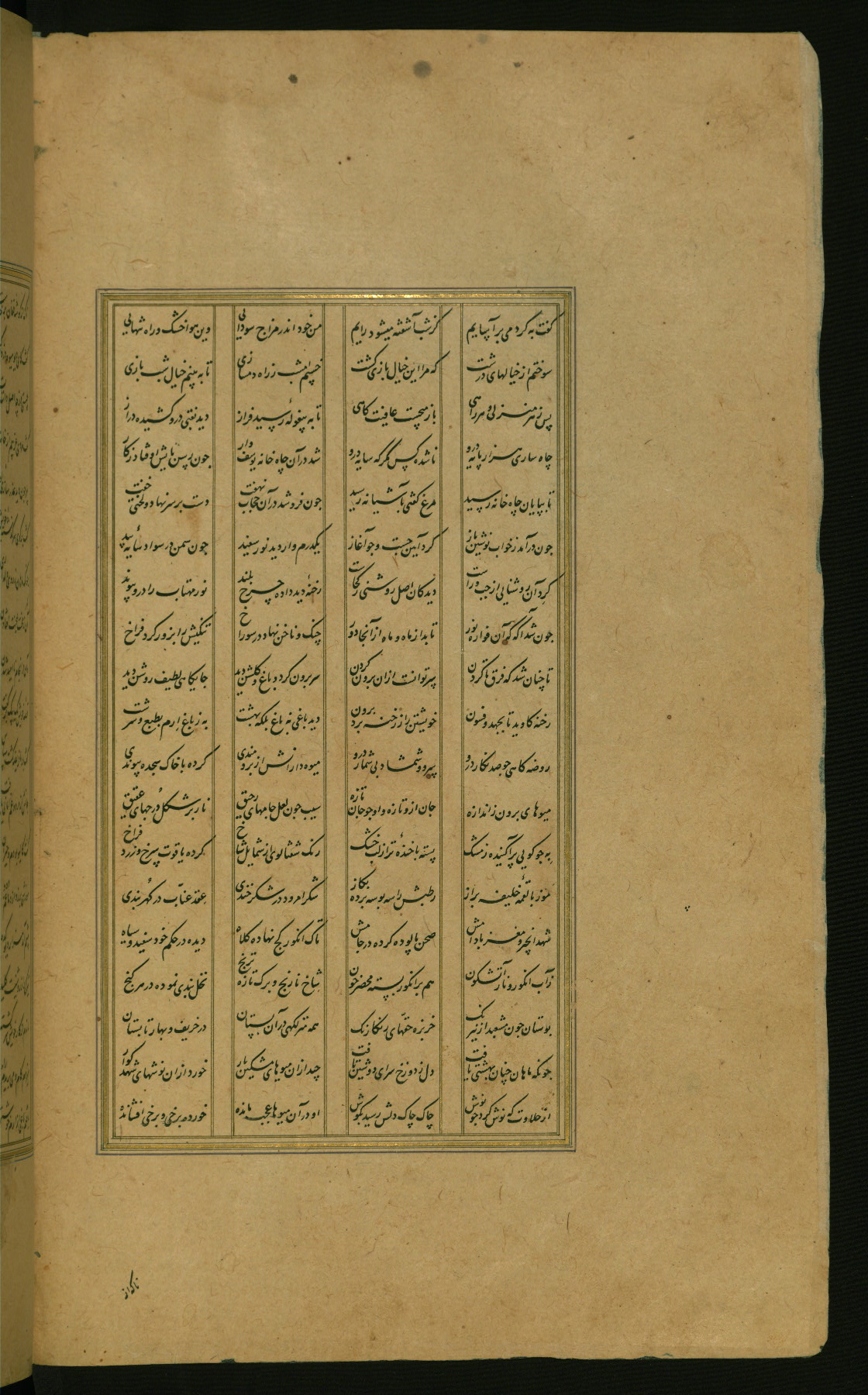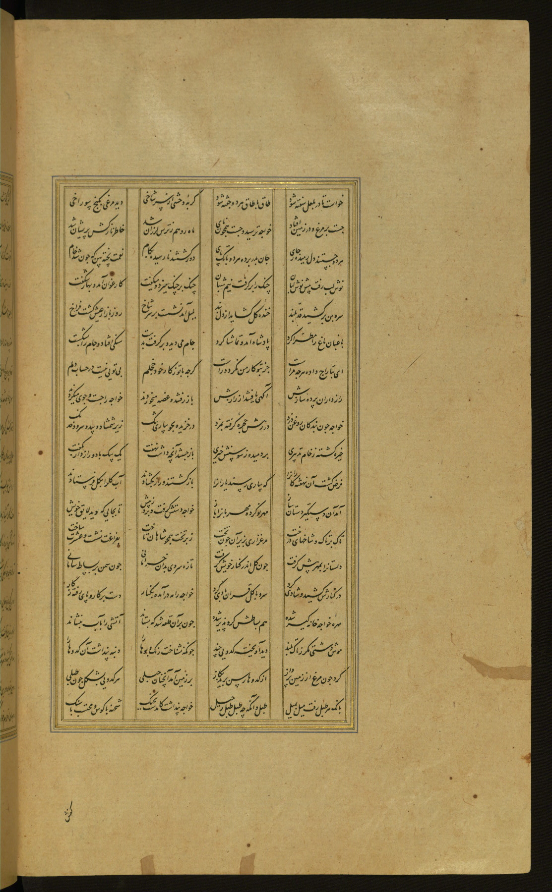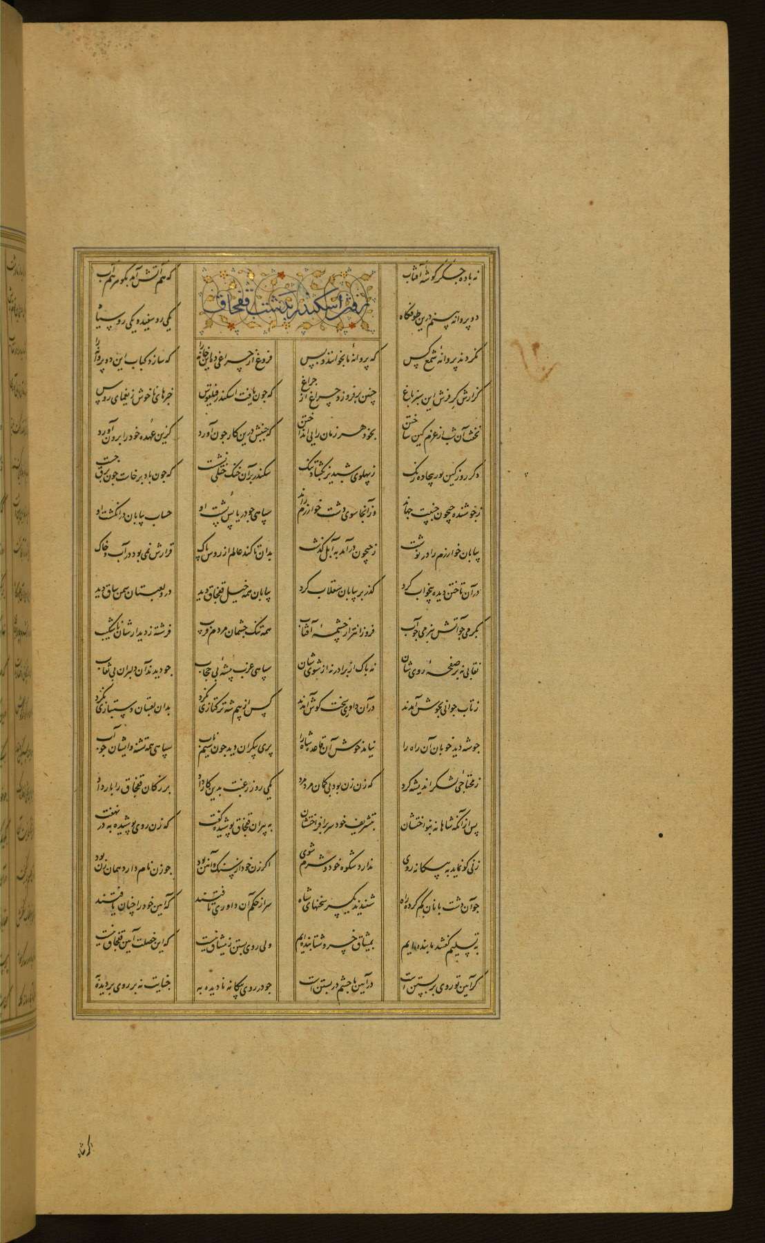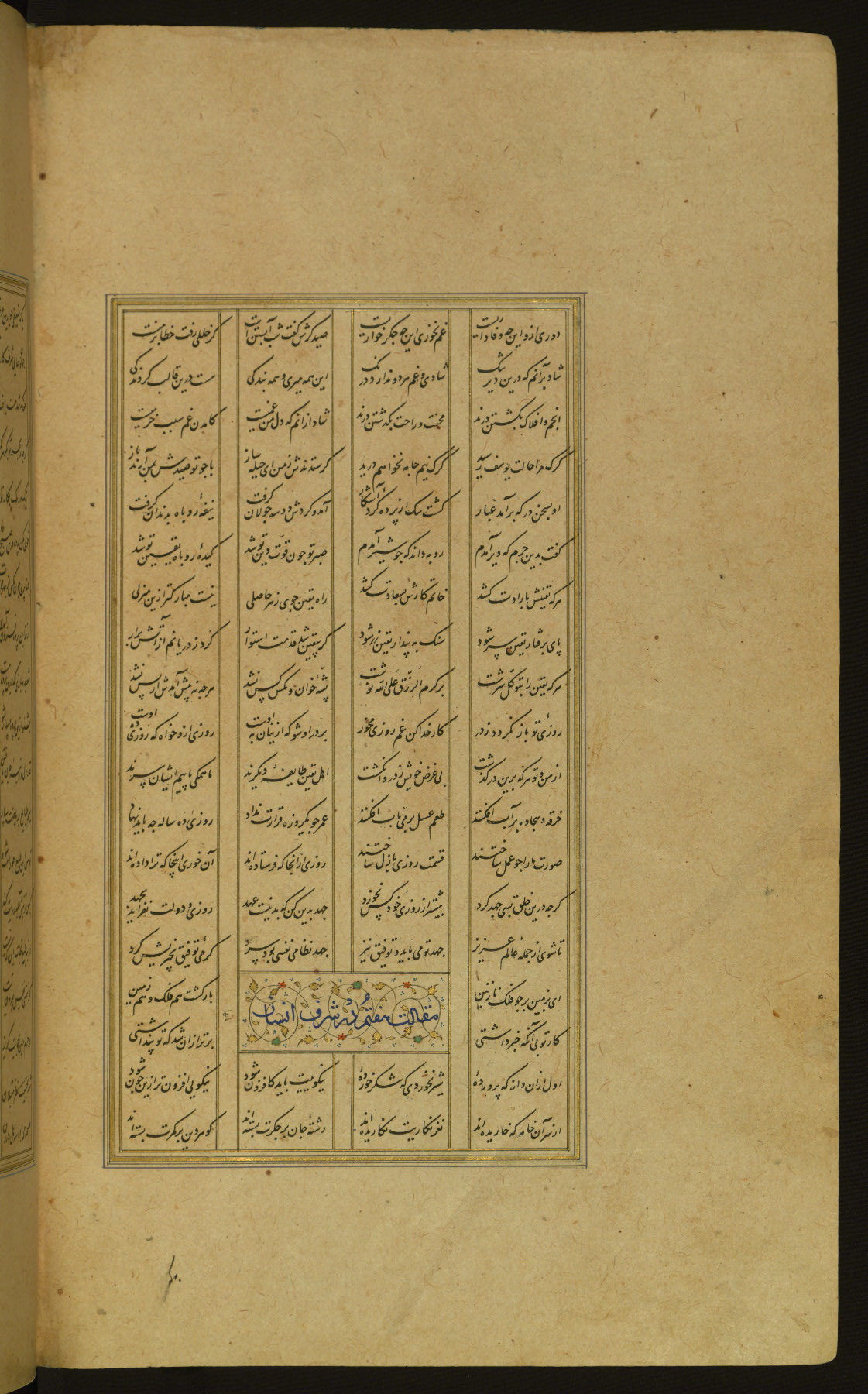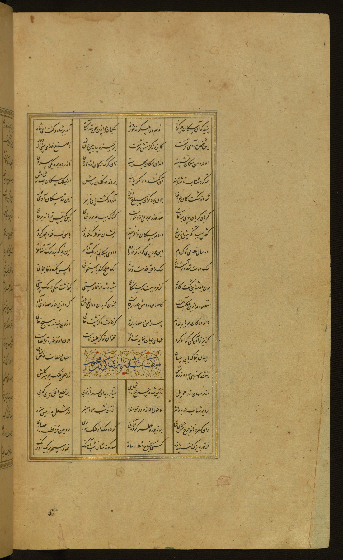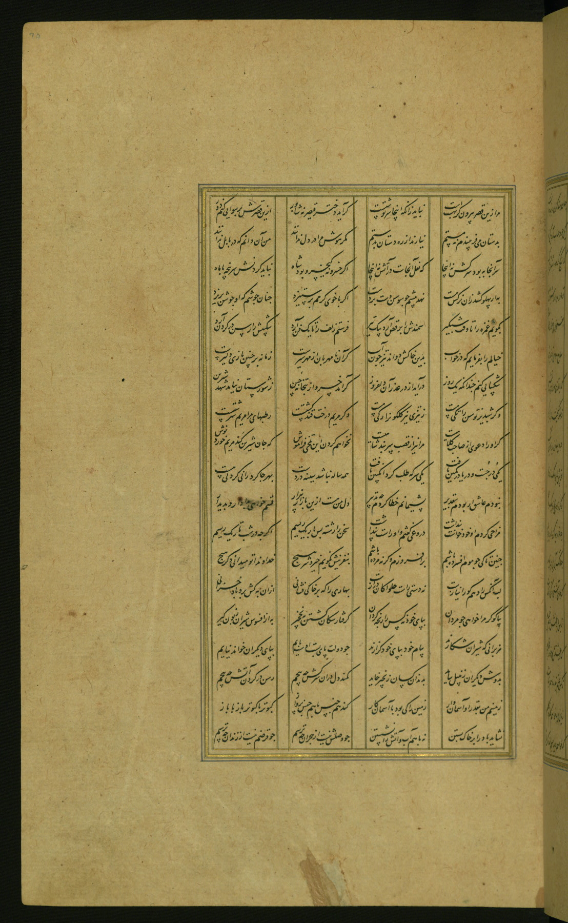 This illuminated and illustrated copy of the Khamsah (quintet) of Niẓāmī Ganjavī (d. 605 AH / 1209 CE) was written by Yār Muḥammad al-Haravī in 922 AH / 1516 CE. Written in four columns in black nastaʿlīq script, this manuscript opens with a double-page illuminated frontispiece signed by ʿAbd al-Wahhāb ibn ʿAbd al-Fattāḥ ibn ʿAlī. It contains thirty-five illustrations that were repainted in India during the twelfth century AH / eighteenth CE. The seal of Muḥammad Asharf ibn Muḥammad Khātam al-Ḥusaynī, dated 1173 AH / 1759-60 CE appears on fols. 1a and 401a. It is possible that the brown leather binding with center and side panels brushed with gold is original to the manuscript but was repaired at a later stage in the codex's history.