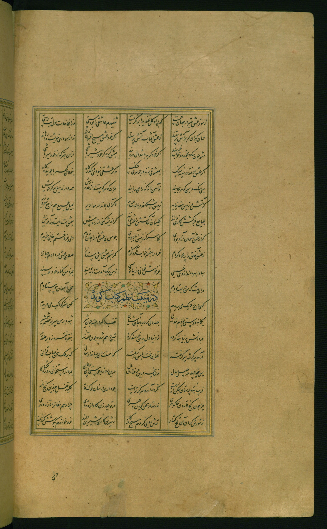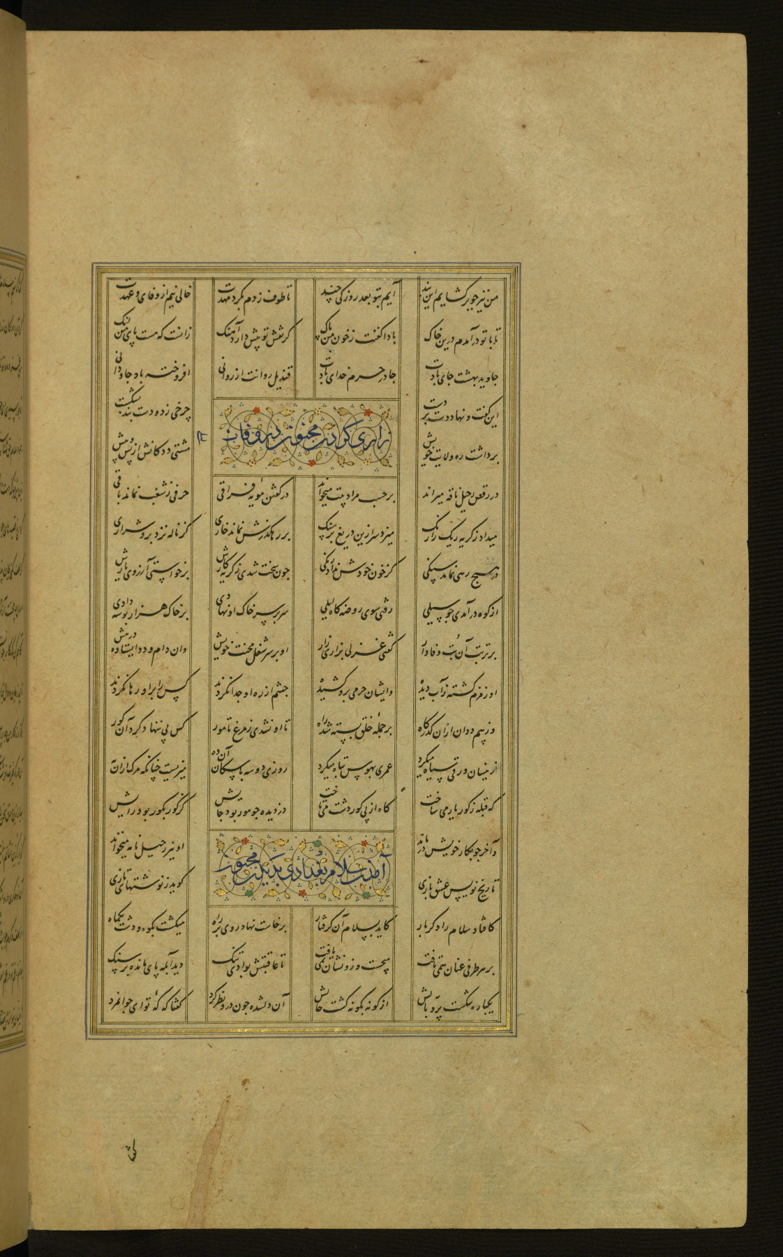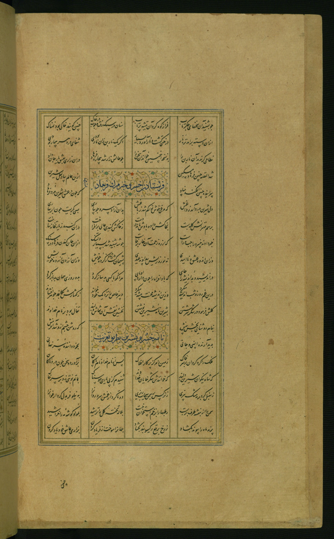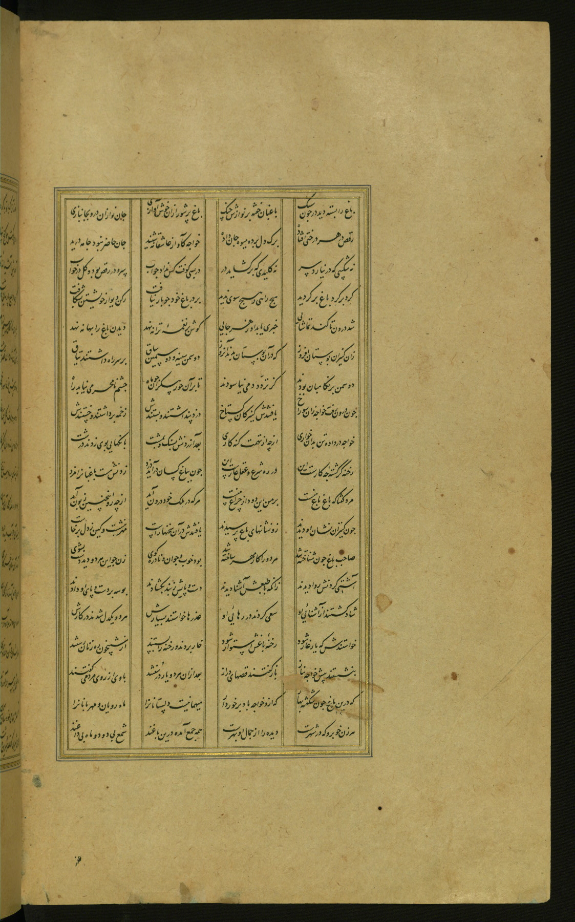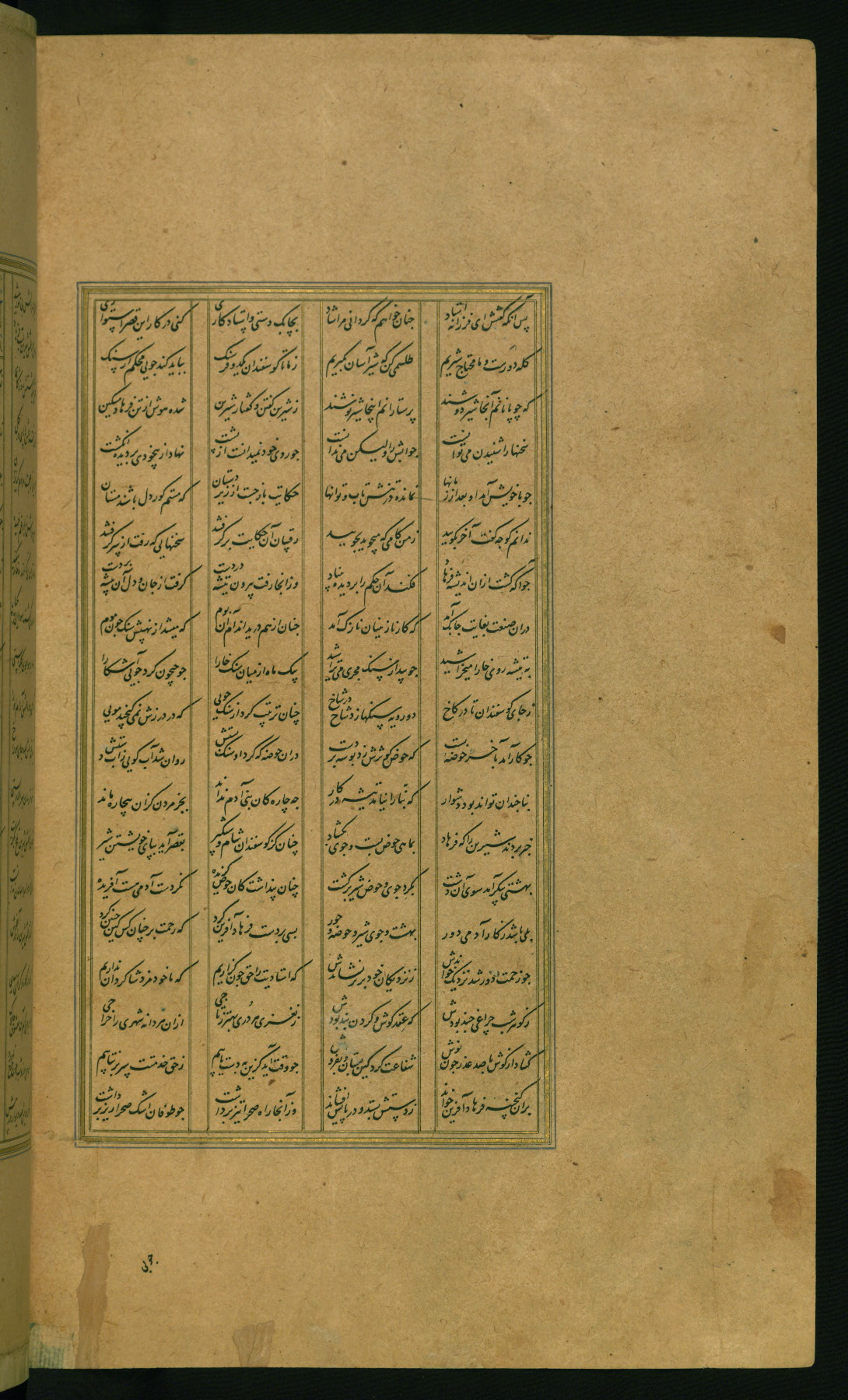 This illuminated and illustrated copy of the Khamsah (quintet) of Niẓāmī Ganjavī (d. 605 AH / 1209 CE) was written by Yār Muḥammad al-Haravī in 922 AH / 1516 CE. Written in four columns in black nastaʿlīq script, this manuscript opens with a double-page illuminated frontispiece signed by ʿAbd al-Wahhāb ibn ʿAbd al-Fattāḥ ibn ʿAlī. It contains thirty-five illustrations that were repainted in India during the twelfth century AH / eighteenth CE. The seal of Muḥammad Asharf ibn Muḥammad Khātam al-Ḥusaynī, dated 1173 AH / 1759-60 CE appears on fols. 1a and 401a. It is possible that the brown leather binding with center and side panels brushed with gold is original to the manuscript but was repaired at a later stage in the codex's history.