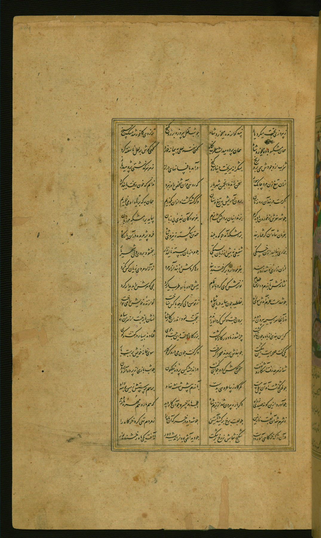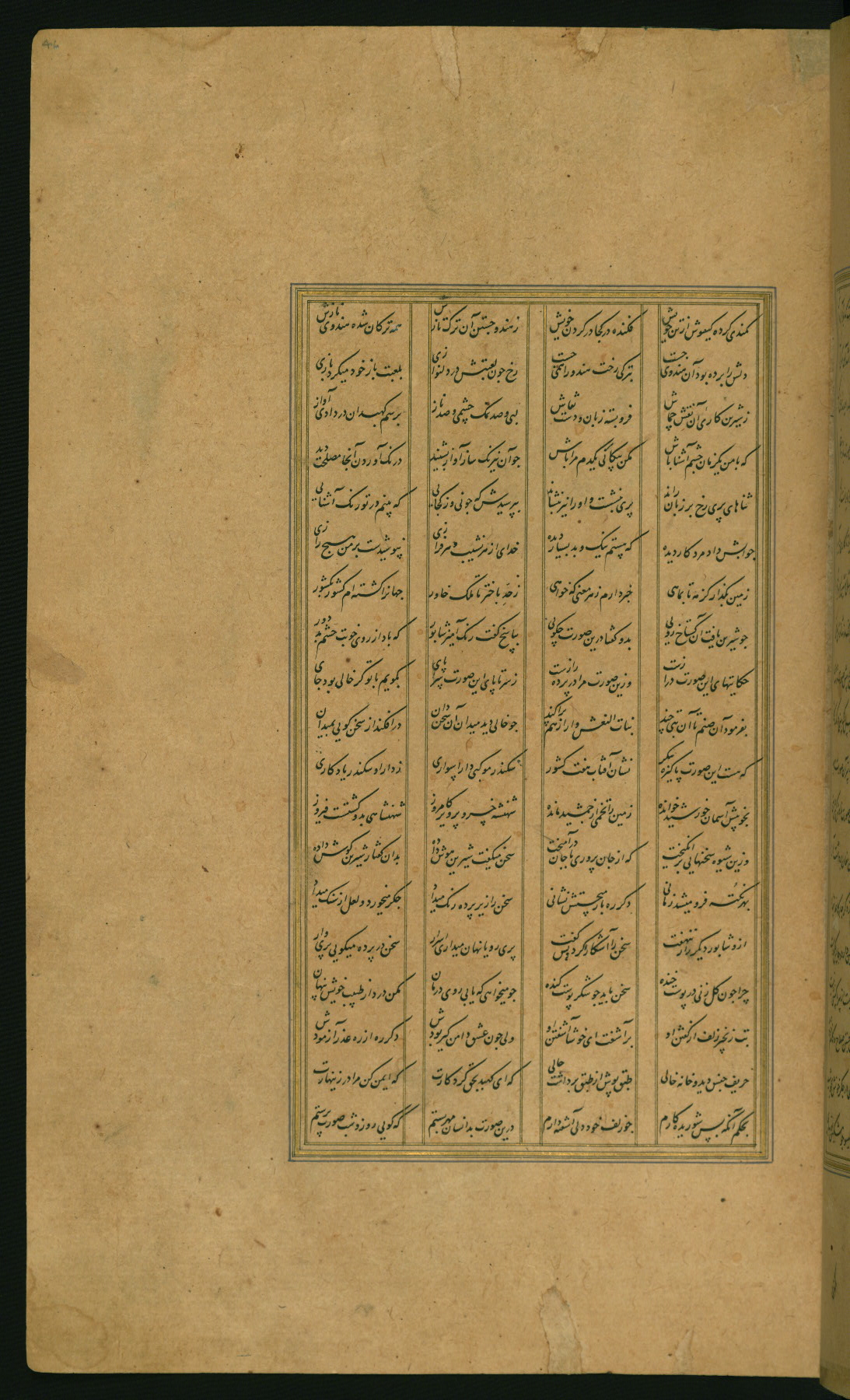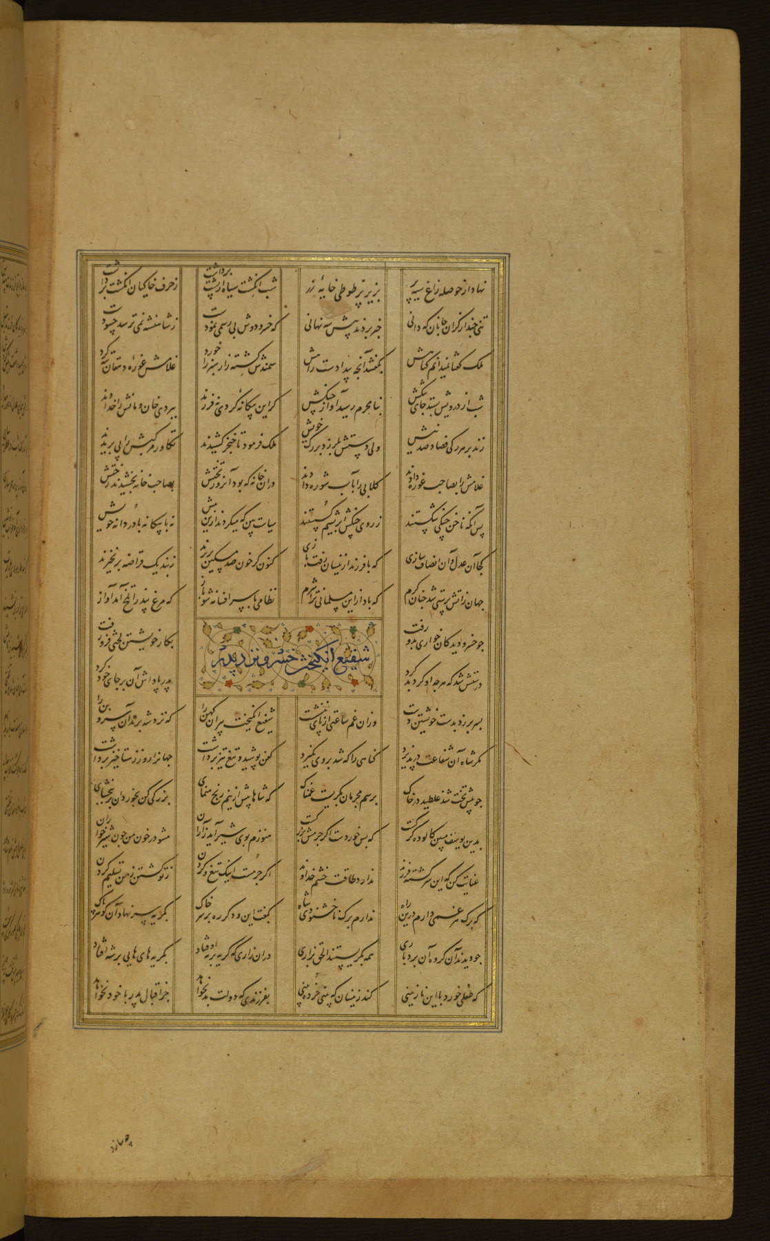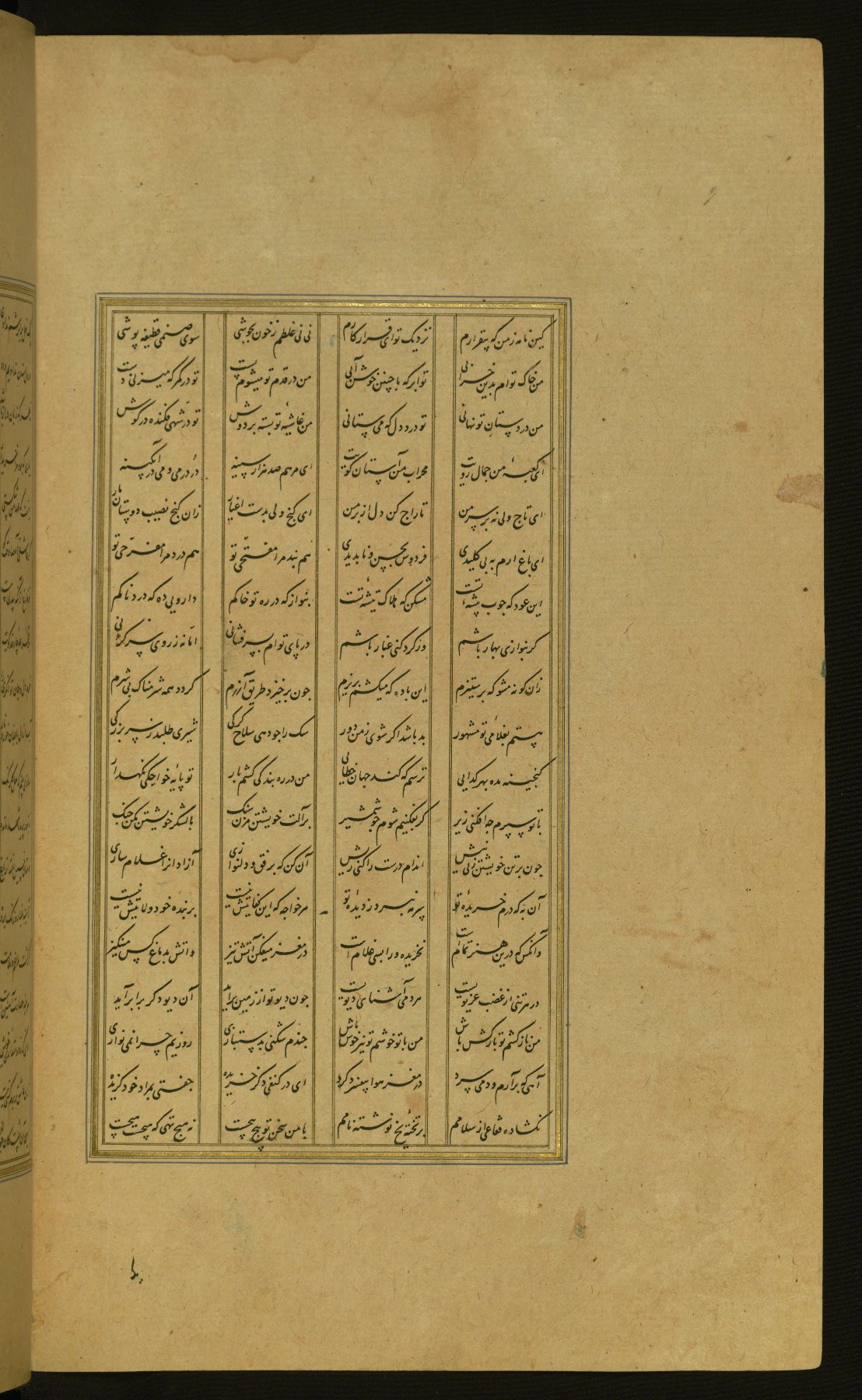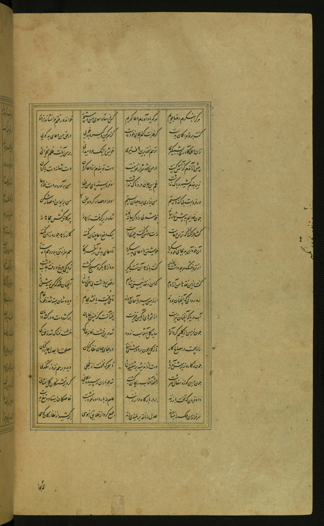 This illuminated and illustrated copy of the Khamsah (quintet) of Niẓāmī Ganjavī (d. 605 AH / 1209 CE) was written by Yār Muḥammad al-Haravī in 922 AH / 1516 CE. Written in four columns in black nastaʿlīq script, this manuscript opens with a double-page illuminated frontispiece signed by ʿAbd al-Wahhāb ibn ʿAbd al-Fattāḥ ibn ʿAlī. It contains thirty-five illustrations that were repainted in India during the twelfth century AH / eighteenth CE. The seal of Muḥammad Asharf ibn Muḥammad Khātam al-Ḥusaynī, dated 1173 AH / 1759-60 CE appears on fols. 1a and 401a. It is possible that the brown leather binding with center and side panels brushed with gold is original to the manuscript but was repaired at a later stage in the codex's history.