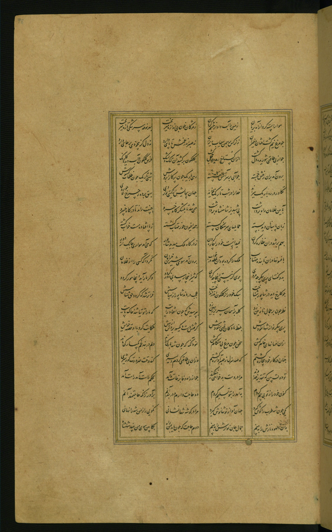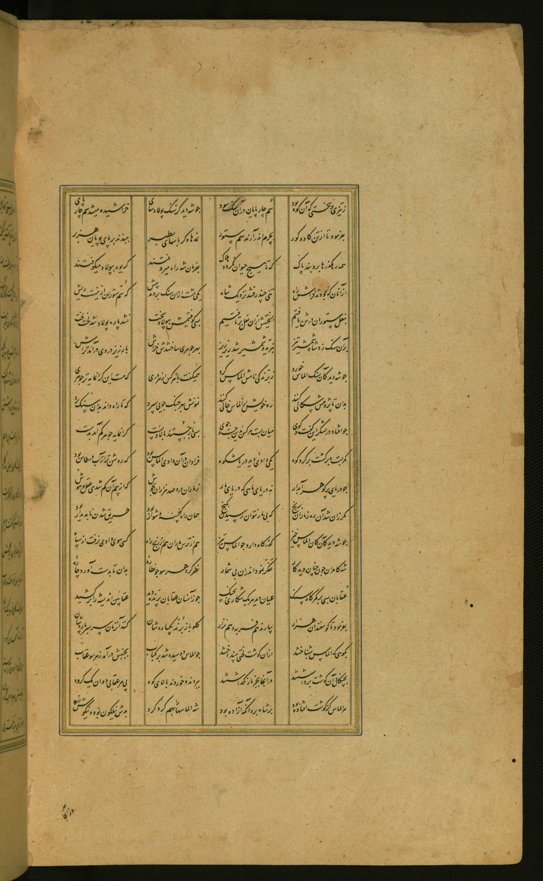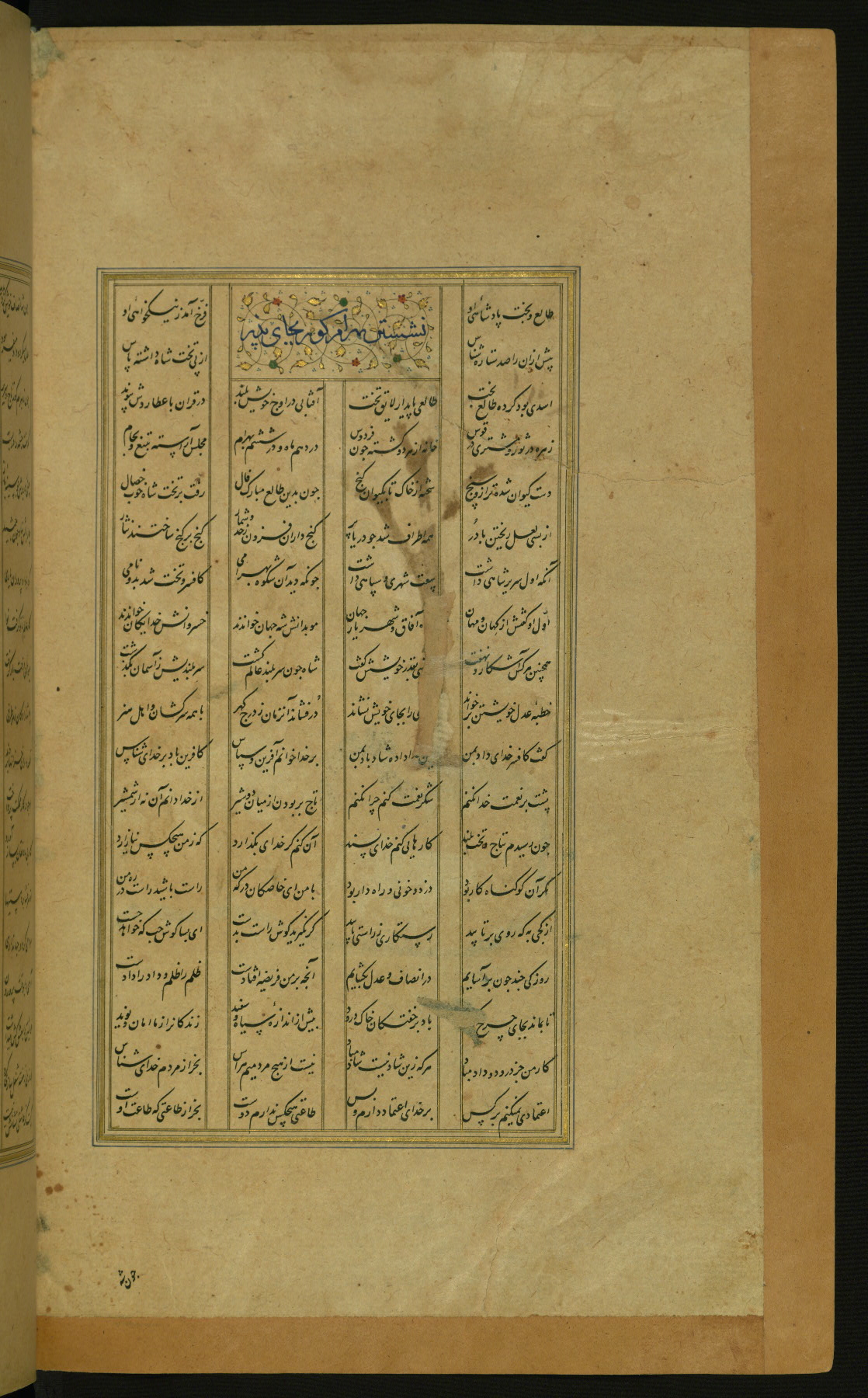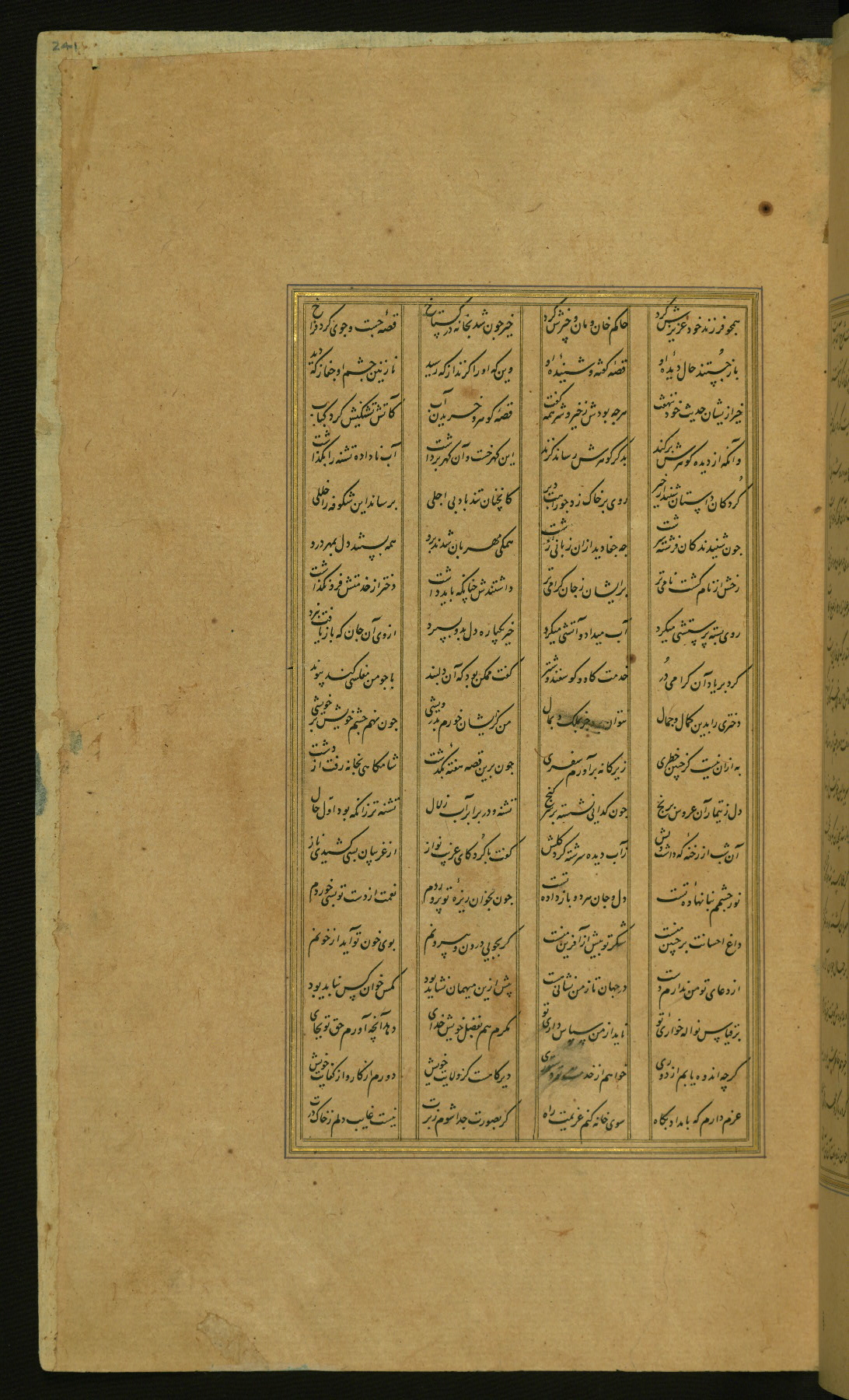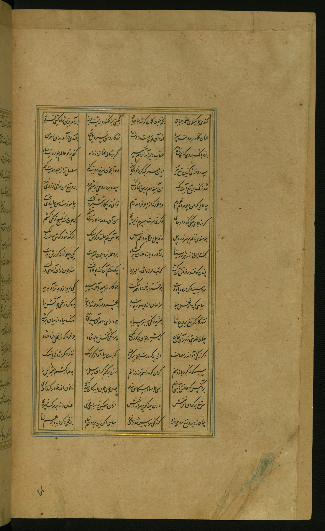 This illuminated and illustrated copy of the Khamsah (quintet) of Niẓāmī Ganjavī (d. 605 AH / 1209 CE) was written by Yār Muḥammad al-Haravī in 922 AH / 1516 CE. Written in four columns in black nastaʿlīq script, this manuscript opens with a double-page illuminated frontispiece signed by ʿAbd al-Wahhāb ibn ʿAbd al-Fattāḥ ibn ʿAlī. It contains thirty-five illustrations that were repainted in India during the twelfth century AH / eighteenth CE. The seal of Muḥammad Asharf ibn Muḥammad Khātam al-Ḥusaynī, dated 1173 AH / 1759-60 CE appears on fols. 1a and 401a. It is possible that the brown leather binding with center and side panels brushed with gold is original to the manuscript but was repaired at a later stage in the codex's history.