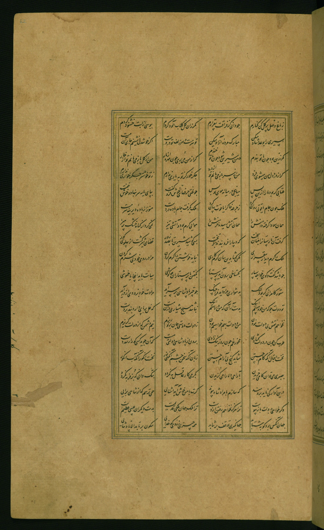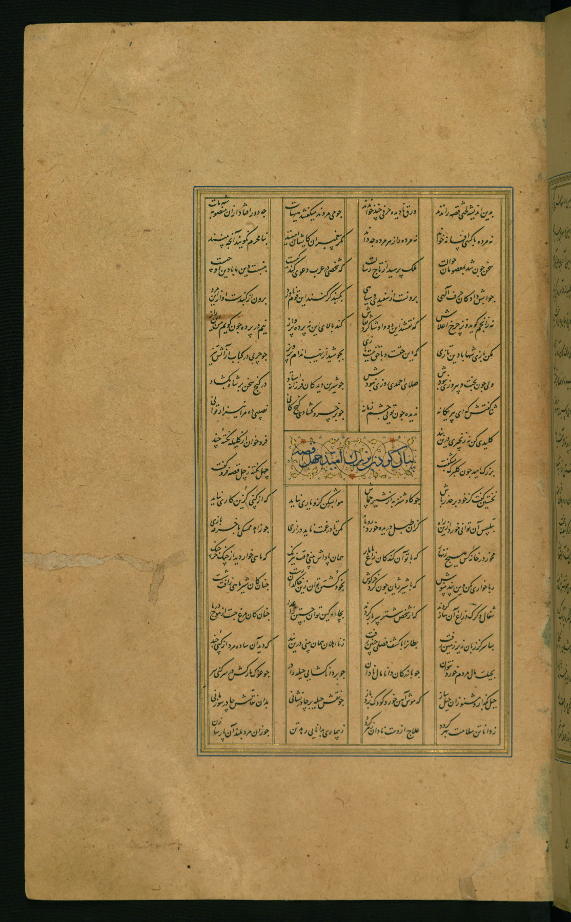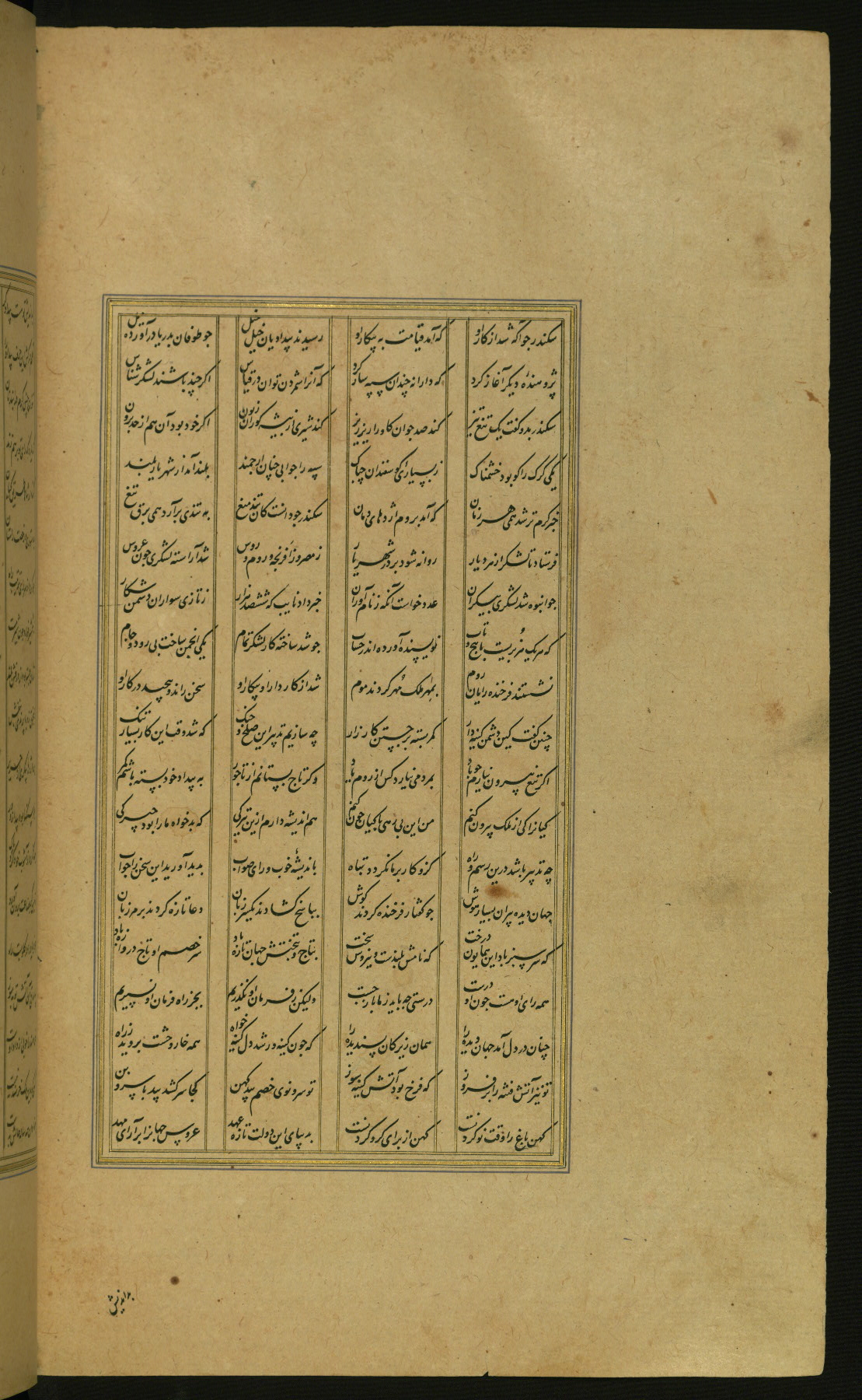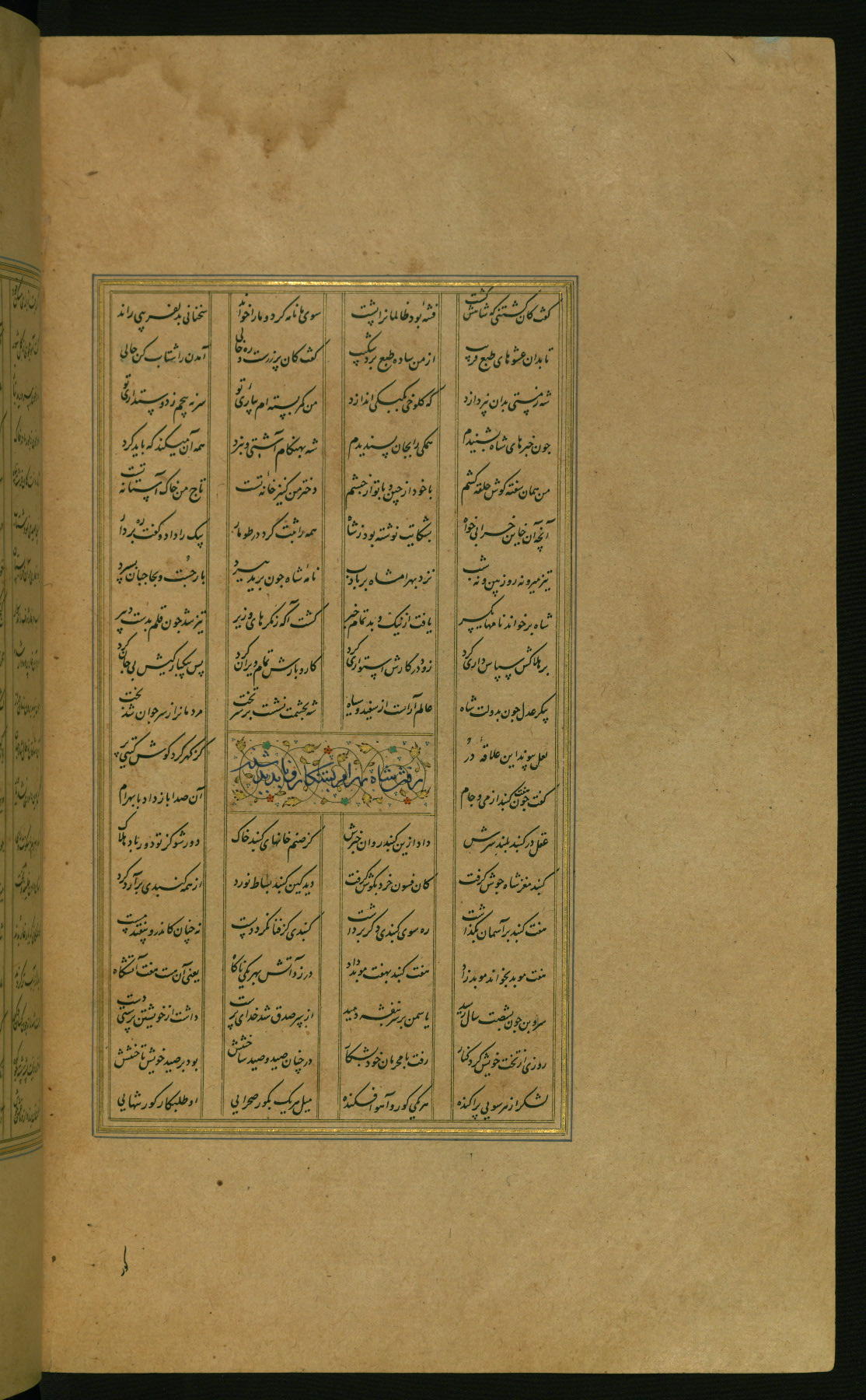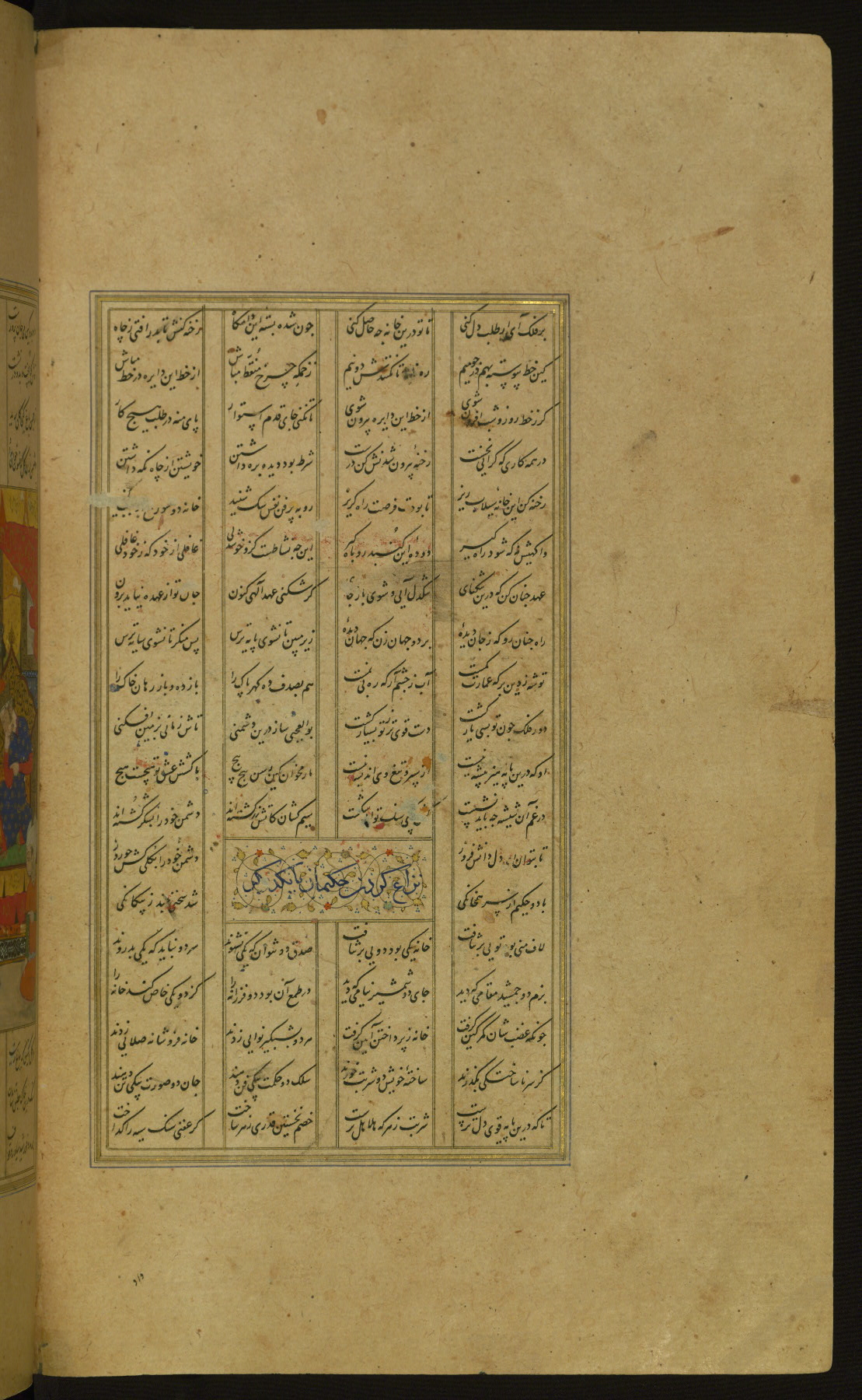 This illuminated and illustrated copy of the Khamsah (quintet) of Niẓāmī Ganjavī (d. 605 AH / 1209 CE) was written by Yār Muḥammad al-Haravī in 922 AH / 1516 CE. Written in four columns in black nastaʿlīq script, this manuscript opens with a double-page illuminated frontispiece signed by ʿAbd al-Wahhāb ibn ʿAbd al-Fattāḥ ibn ʿAlī. It contains thirty-five illustrations that were repainted in India during the twelfth century AH / eighteenth CE. The seal of Muḥammad Asharf ibn Muḥammad Khātam al-Ḥusaynī, dated 1173 AH / 1759-60 CE appears on fols. 1a and 401a. It is possible that the brown leather binding with center and side panels brushed with gold is original to the manuscript but was repaired at a later stage in the codex's history.
