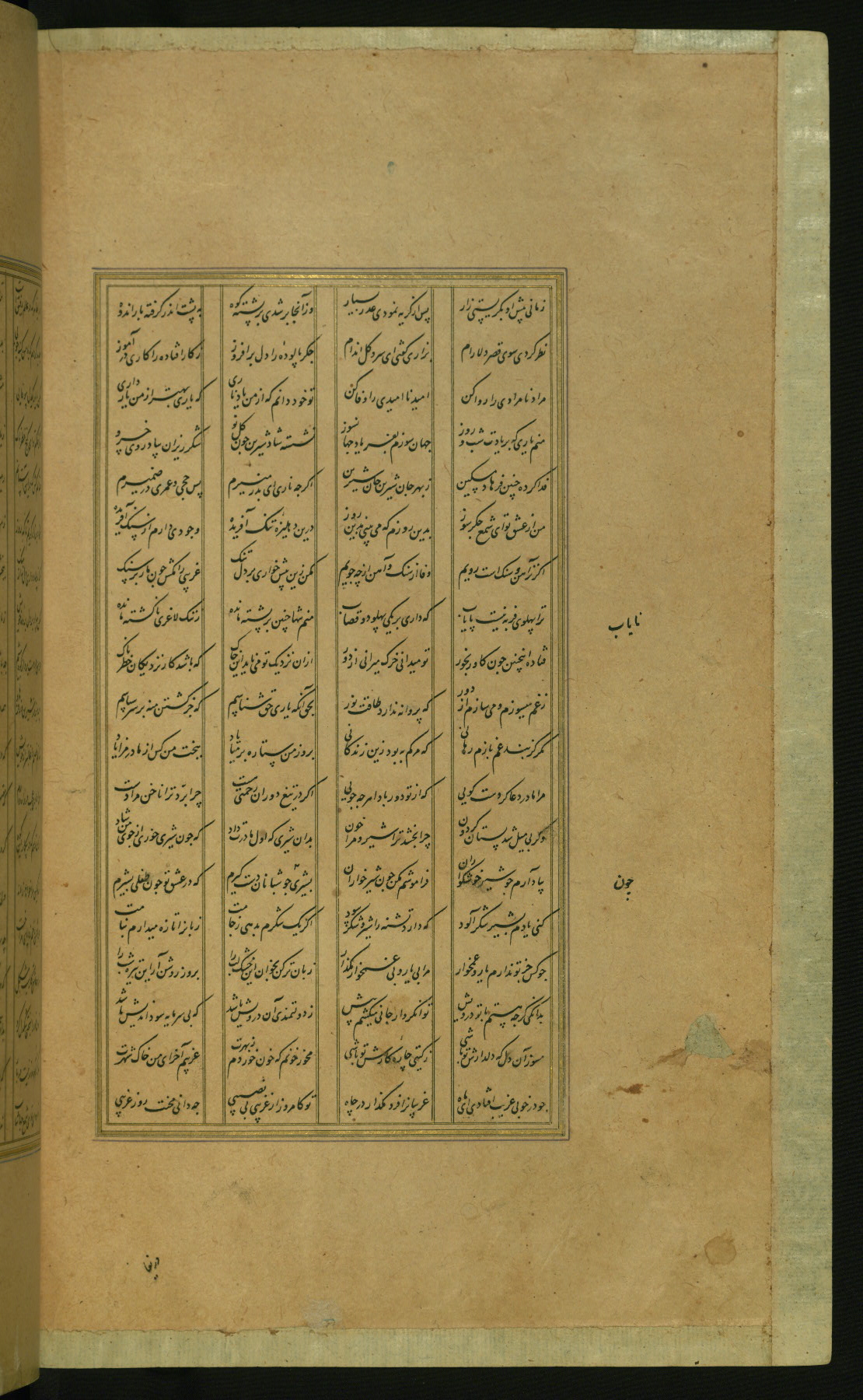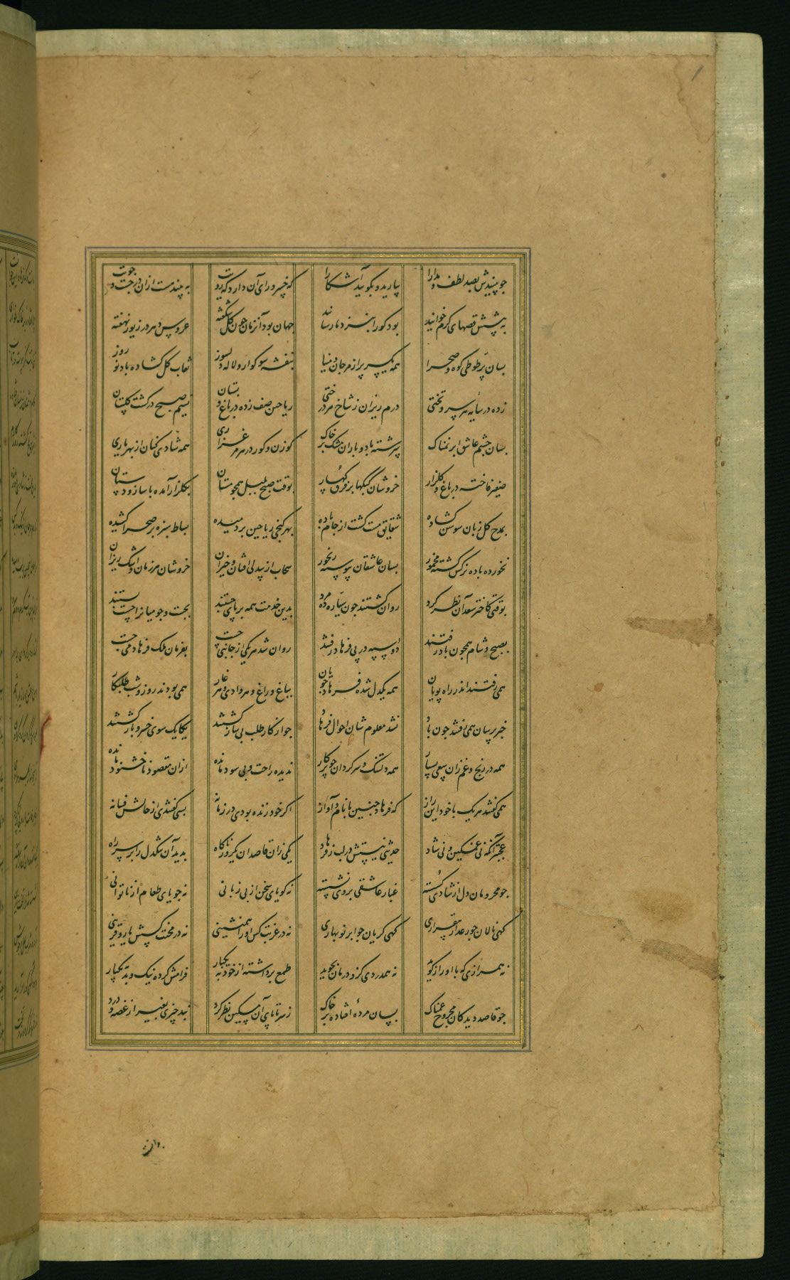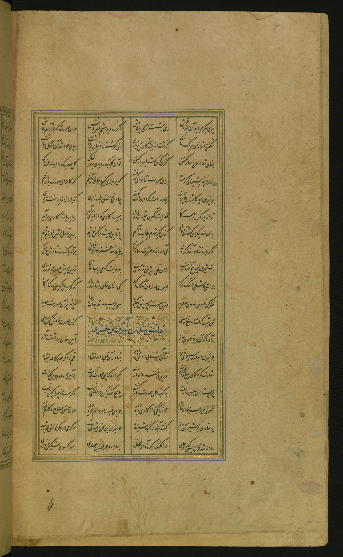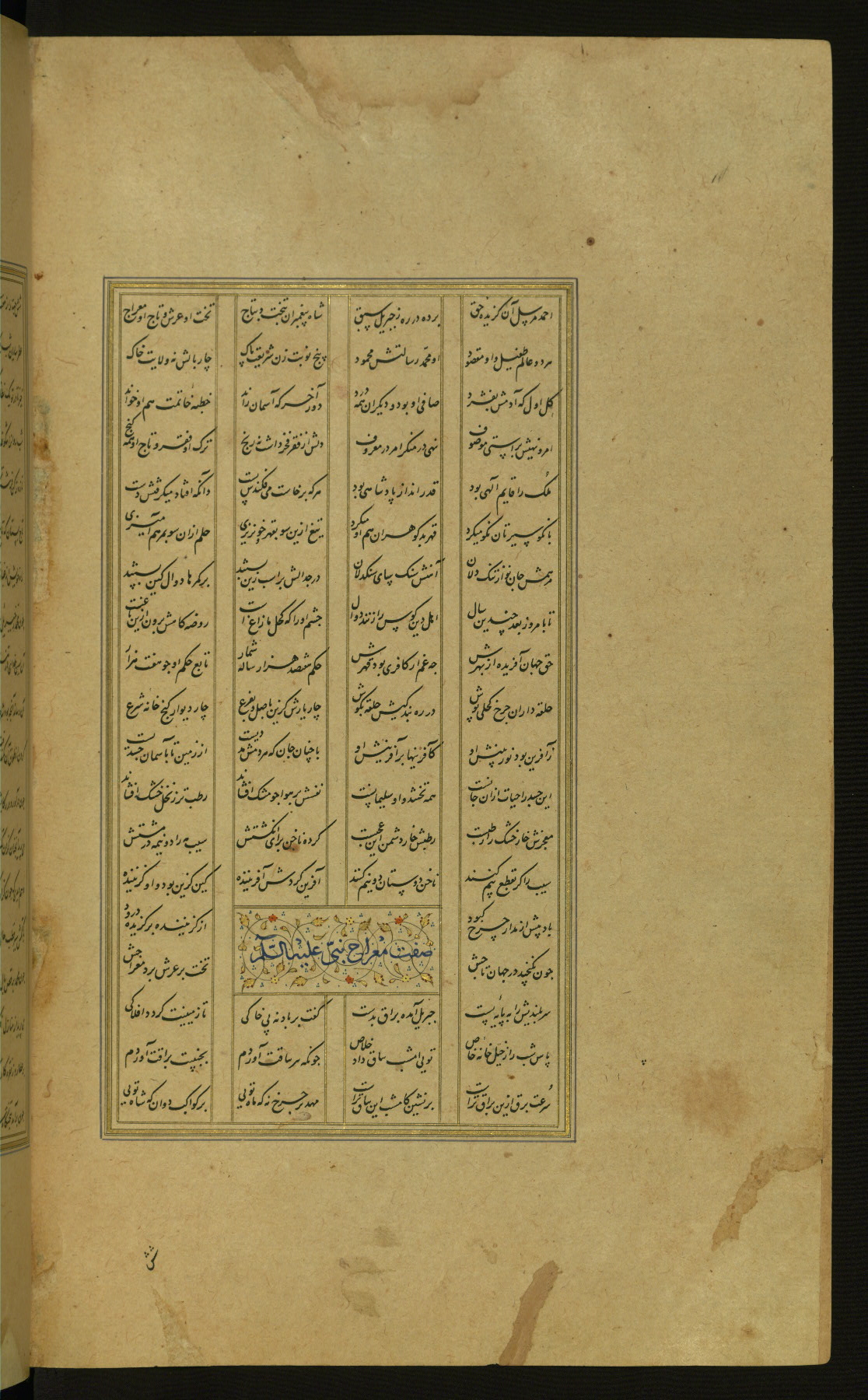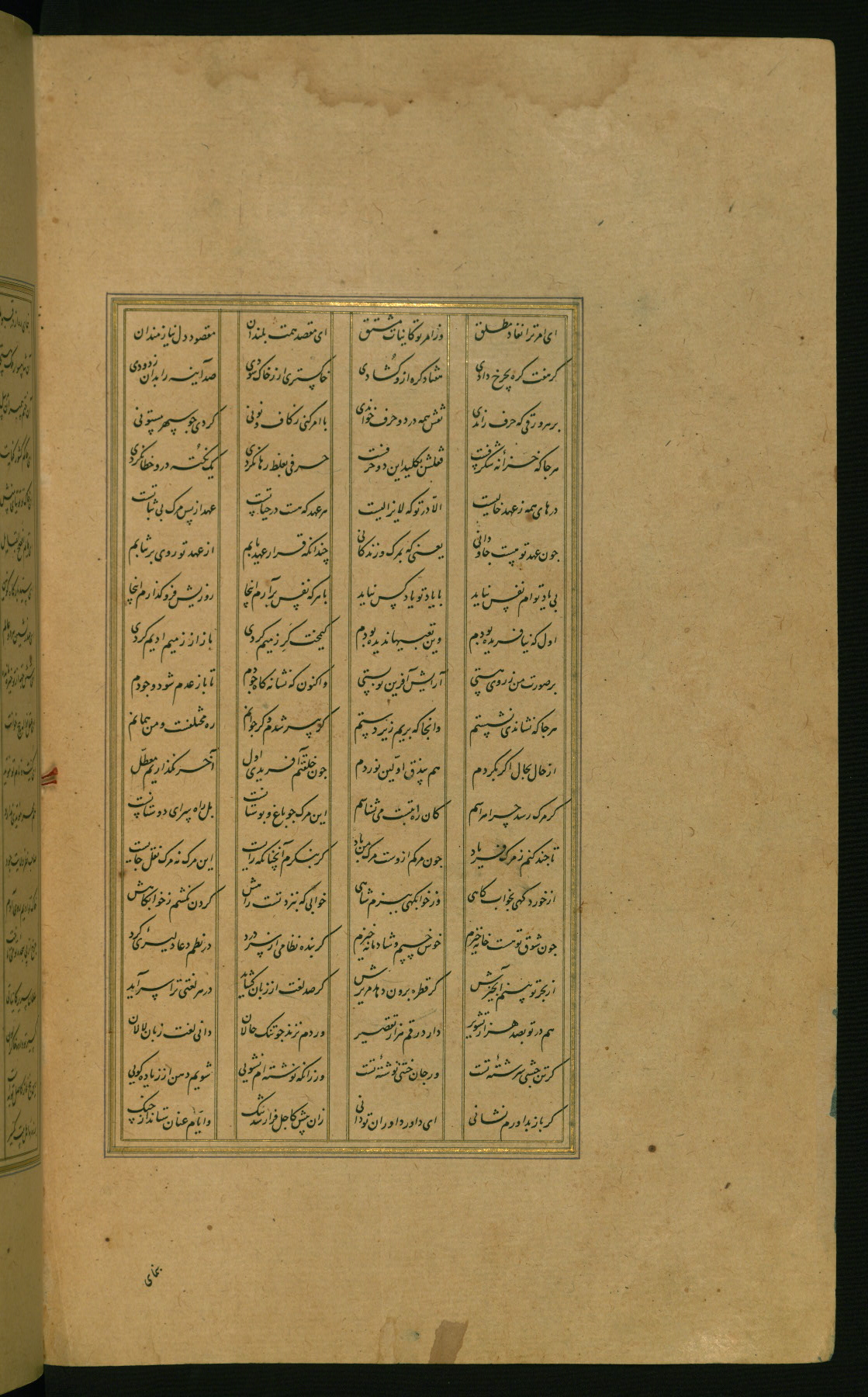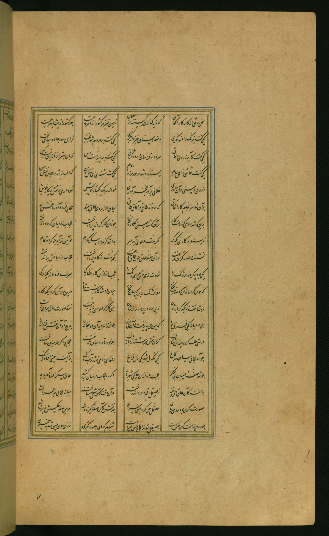 This illuminated and illustrated copy of the Khamsah (quintet) of Niẓāmī Ganjavī (d. 605 AH / 1209 CE) was written by Yār Muḥammad al-Haravī in 922 AH / 1516 CE. Written in four columns in black nastaʿlīq script, this manuscript opens with a double-page illuminated frontispiece signed by ʿAbd al-Wahhāb ibn ʿAbd al-Fattāḥ ibn ʿAlī. It contains thirty-five illustrations that were repainted in India during the twelfth century AH / eighteenth CE. The seal of Muḥammad Asharf ibn Muḥammad Khātam al-Ḥusaynī, dated 1173 AH / 1759-60 CE appears on fols. 1a and 401a. It is possible that the brown leather binding with center and side panels brushed with gold is original to the manuscript but was repaired at a later stage in the codex's history.