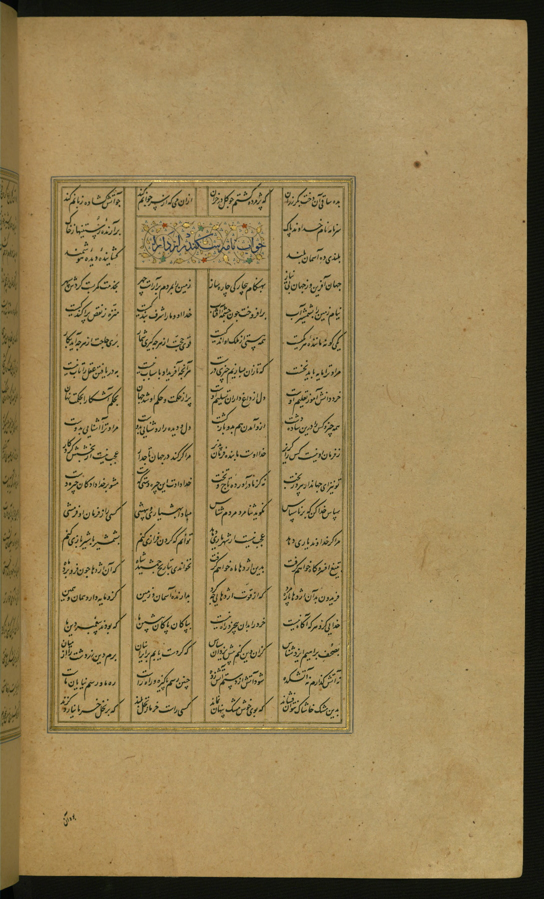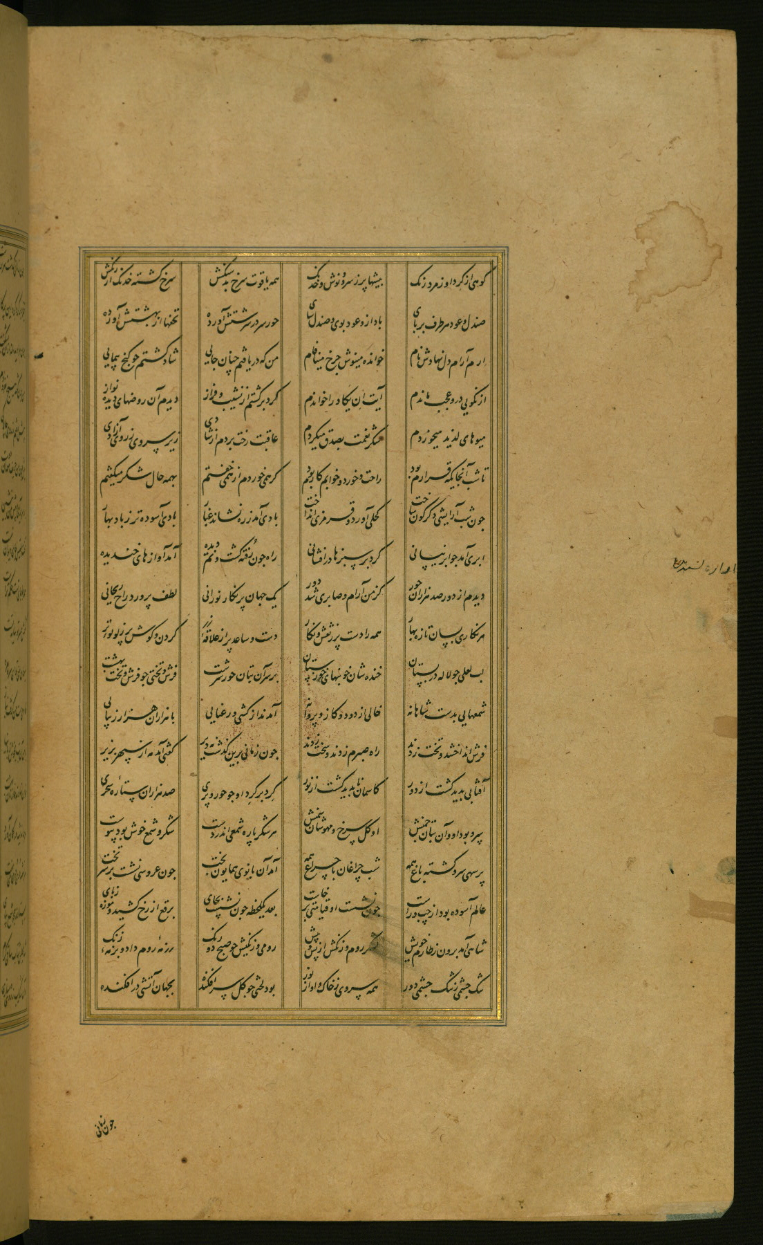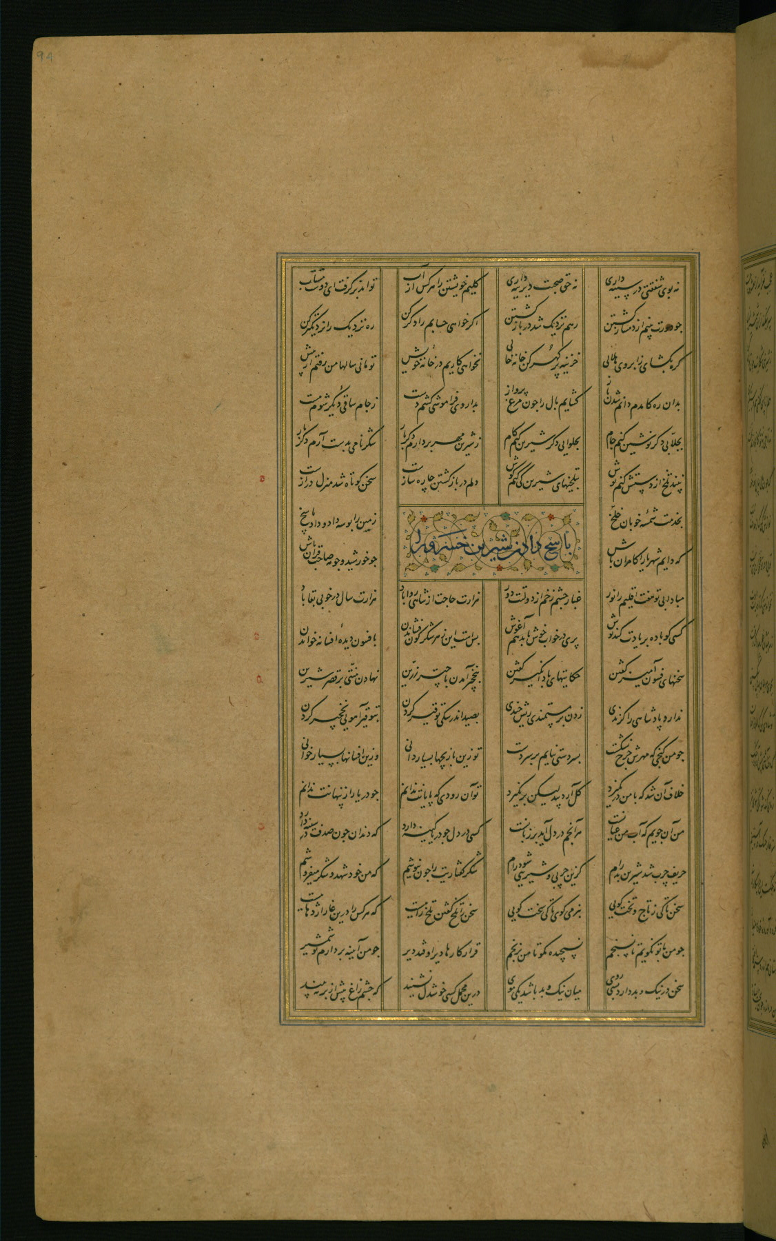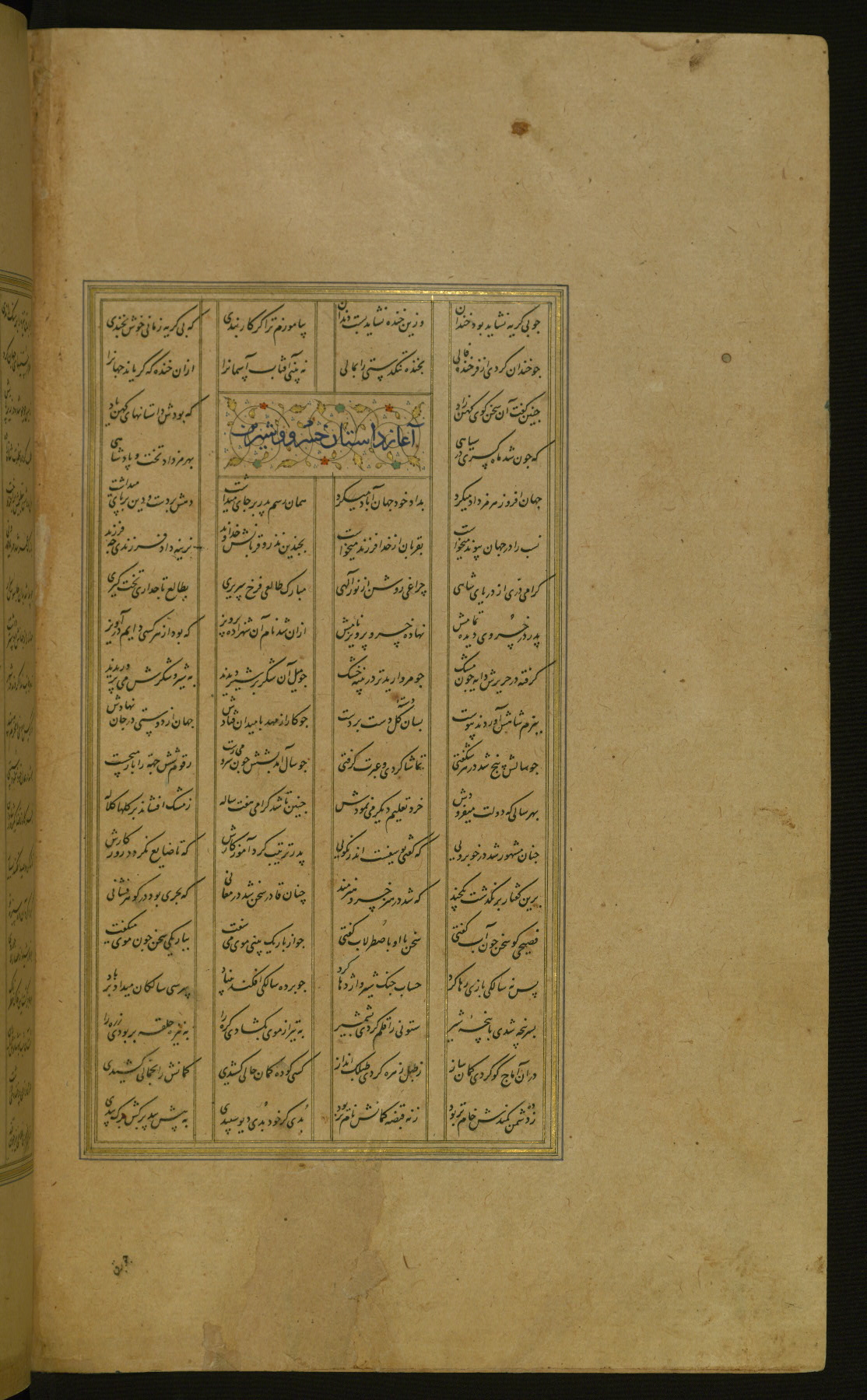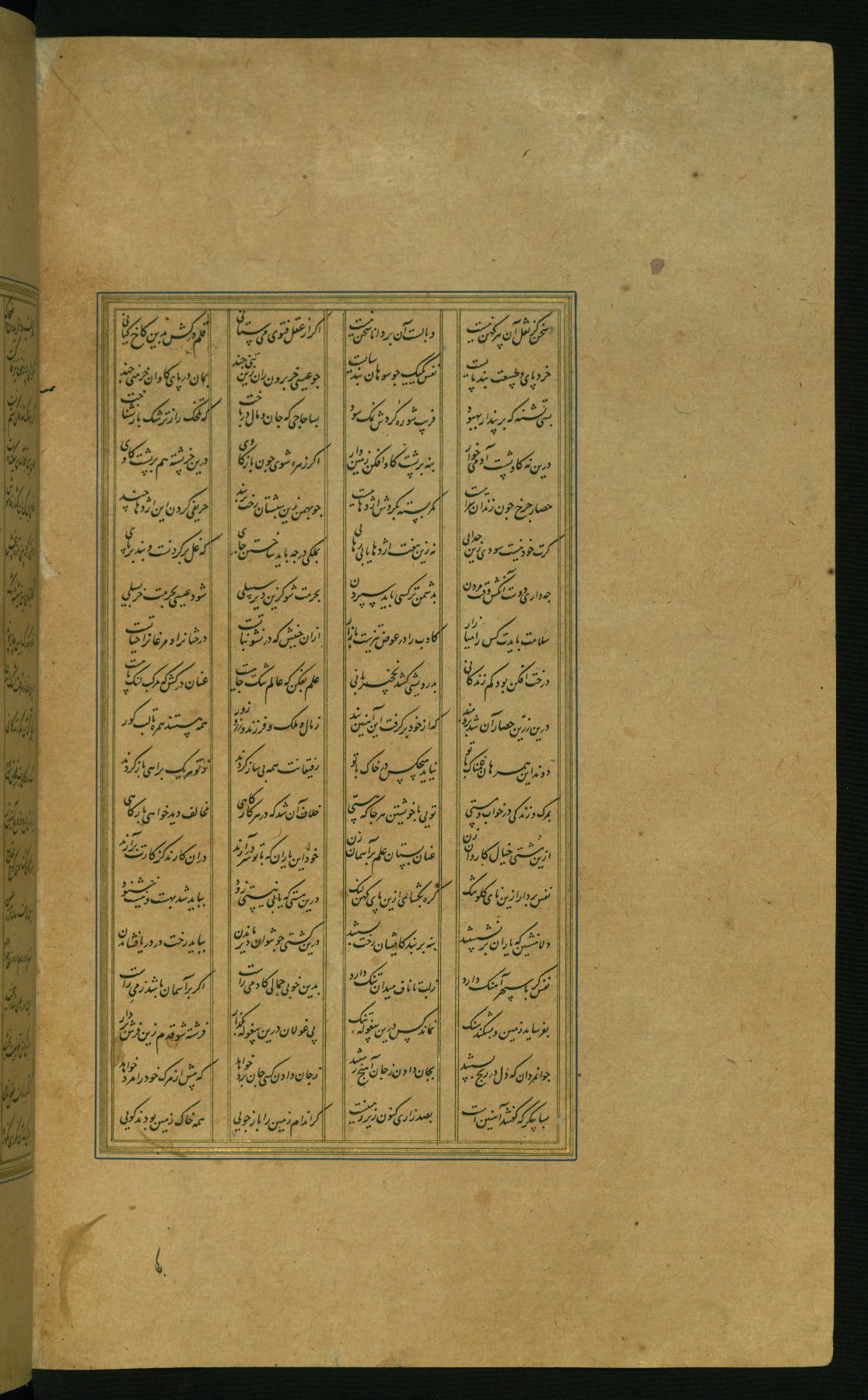 This illuminated and illustrated copy of the Khamsah (quintet) of Niẓāmī Ganjavī (d. 605 AH / 1209 CE) was written by Yār Muḥammad al-Haravī in 922 AH / 1516 CE. Written in four columns in black nastaʿlīq script, this manuscript opens with a double-page illuminated frontispiece signed by ʿAbd al-Wahhāb ibn ʿAbd al-Fattāḥ ibn ʿAlī. It contains thirty-five illustrations that were repainted in India during the twelfth century AH / eighteenth CE. The seal of Muḥammad Asharf ibn Muḥammad Khātam al-Ḥusaynī, dated 1173 AH / 1759-60 CE appears on fols. 1a and 401a. It is possible that the brown leather binding with center and side panels brushed with gold is original to the manuscript but was repaired at a later stage in the codex's history.