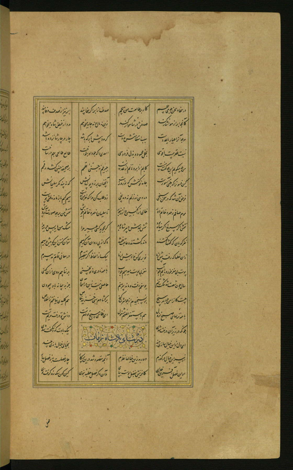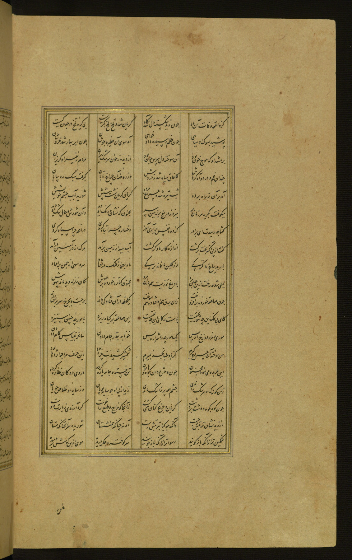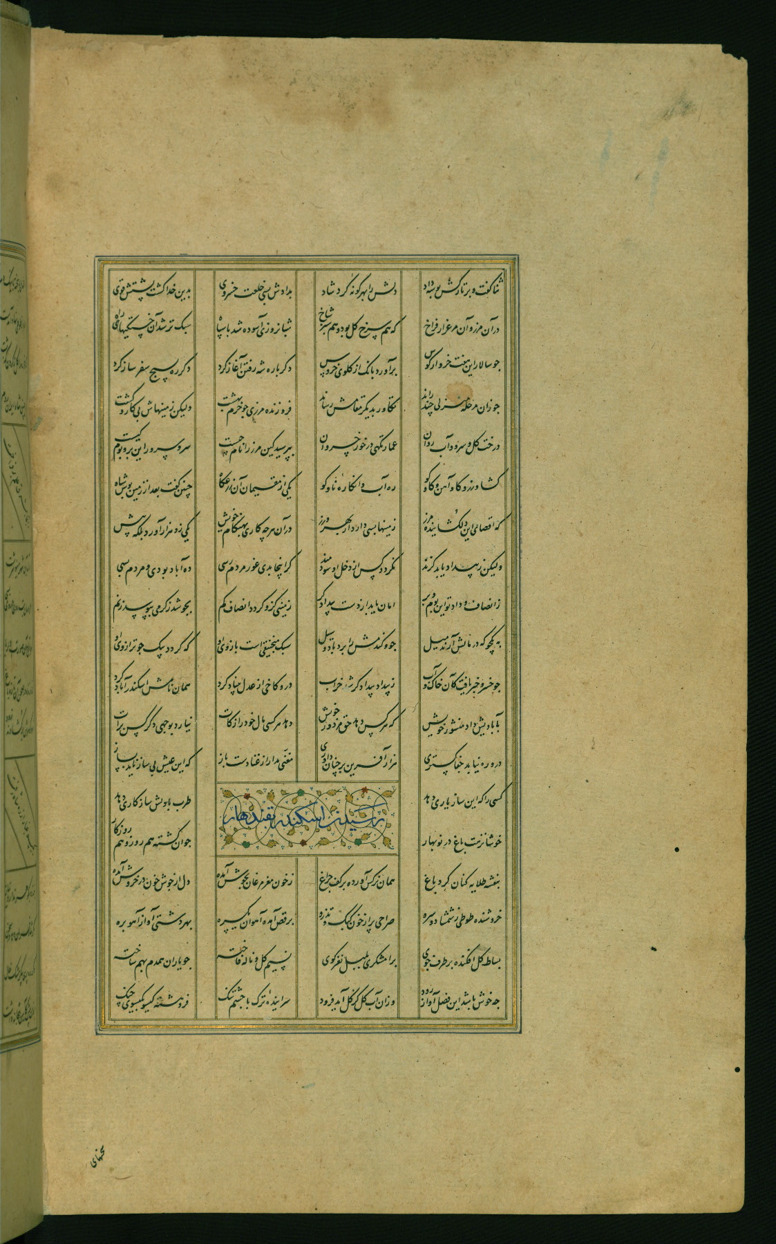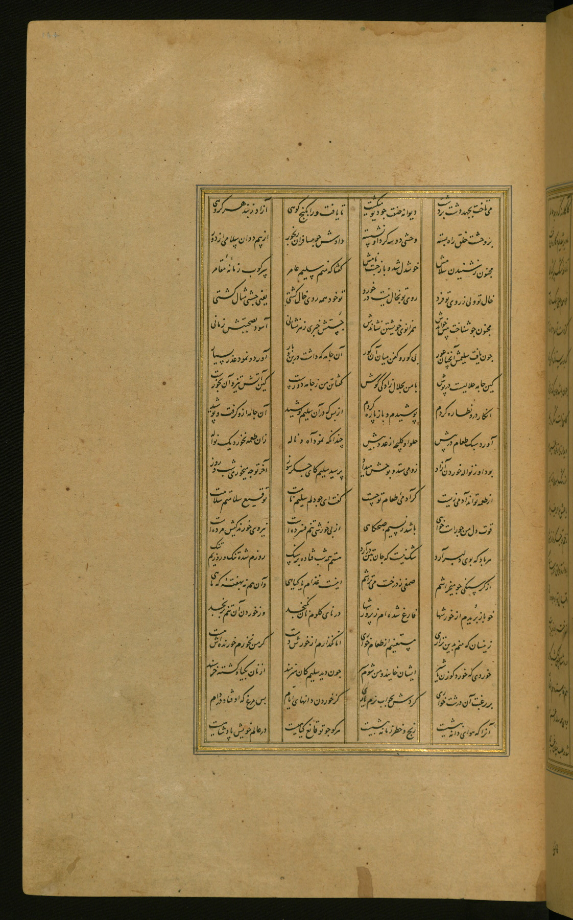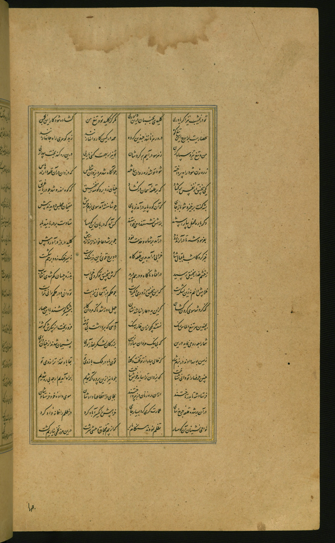 This illuminated and illustrated copy of the Khamsah (quintet) of Niẓāmī Ganjavī (d. 605 AH / 1209 CE) was written by Yār Muḥammad al-Haravī in 922 AH / 1516 CE. Written in four columns in black nastaʿlīq script, this manuscript opens with a double-page illuminated frontispiece signed by ʿAbd al-Wahhāb ibn ʿAbd al-Fattāḥ ibn ʿAlī. It contains thirty-five illustrations that were repainted in India during the twelfth century AH / eighteenth CE. The seal of Muḥammad Asharf ibn Muḥammad Khātam al-Ḥusaynī, dated 1173 AH / 1759-60 CE appears on fols. 1a and 401a. It is possible that the brown leather binding with center and side panels brushed with gold is original to the manuscript but was repaired at a later stage in the codex's history.