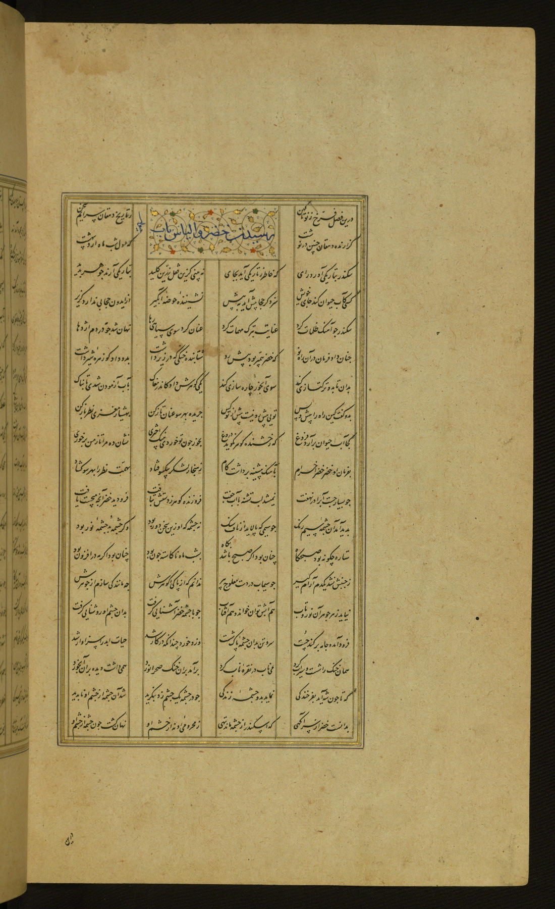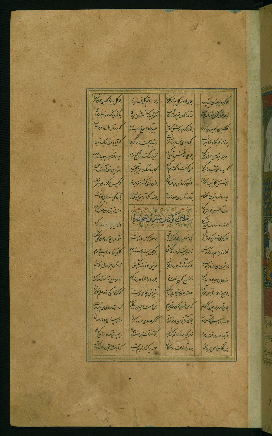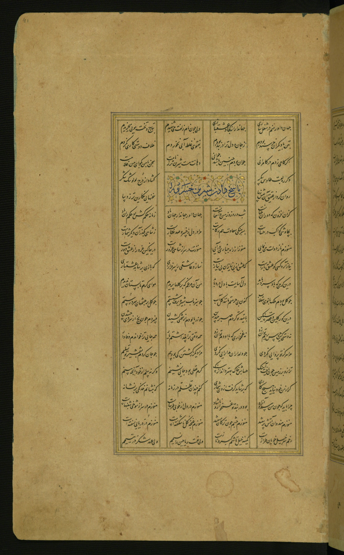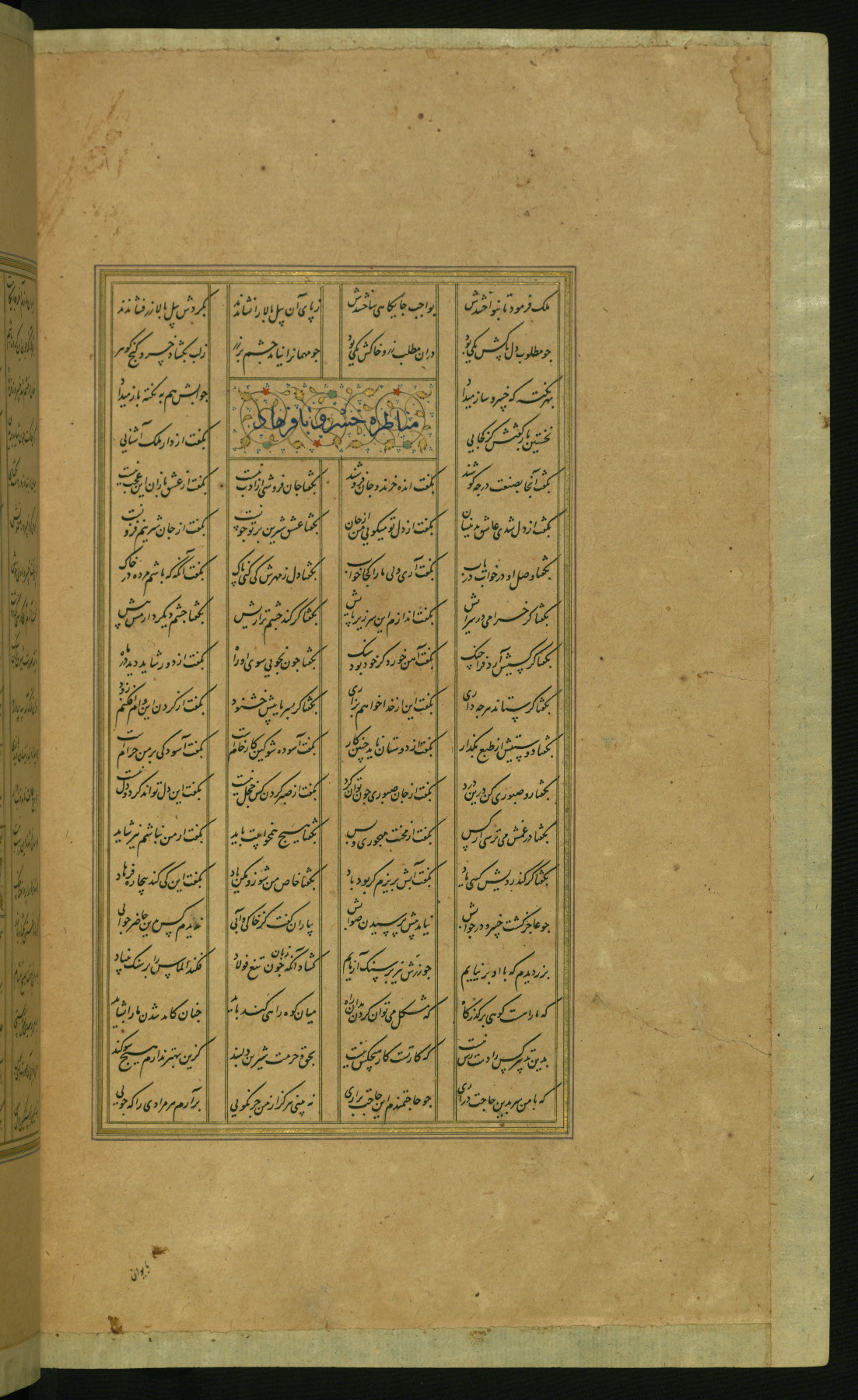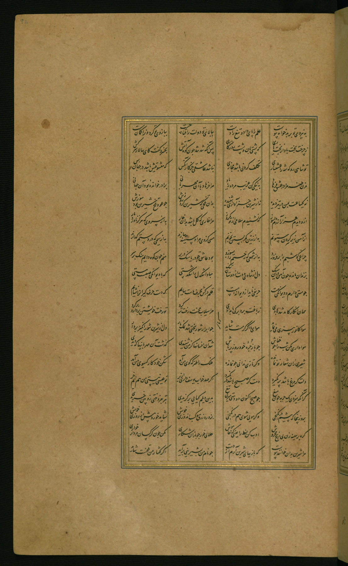 This illuminated and illustrated copy of the Khamsah (quintet) of Niẓāmī Ganjavī (d. 605 AH / 1209 CE) was written by Yār Muḥammad al-Haravī in 922 AH / 1516 CE. Written in four columns in black nastaʿlīq script, this manuscript opens with a double-page illuminated frontispiece signed by ʿAbd al-Wahhāb ibn ʿAbd al-Fattāḥ ibn ʿAlī. It contains thirty-five illustrations that were repainted in India during the twelfth century AH / eighteenth CE. The seal of Muḥammad Asharf ibn Muḥammad Khātam al-Ḥusaynī, dated 1173 AH / 1759-60 CE appears on fols. 1a and 401a. It is possible that the brown leather binding with center and side panels brushed with gold is original to the manuscript but was repaired at a later stage in the codex's history.