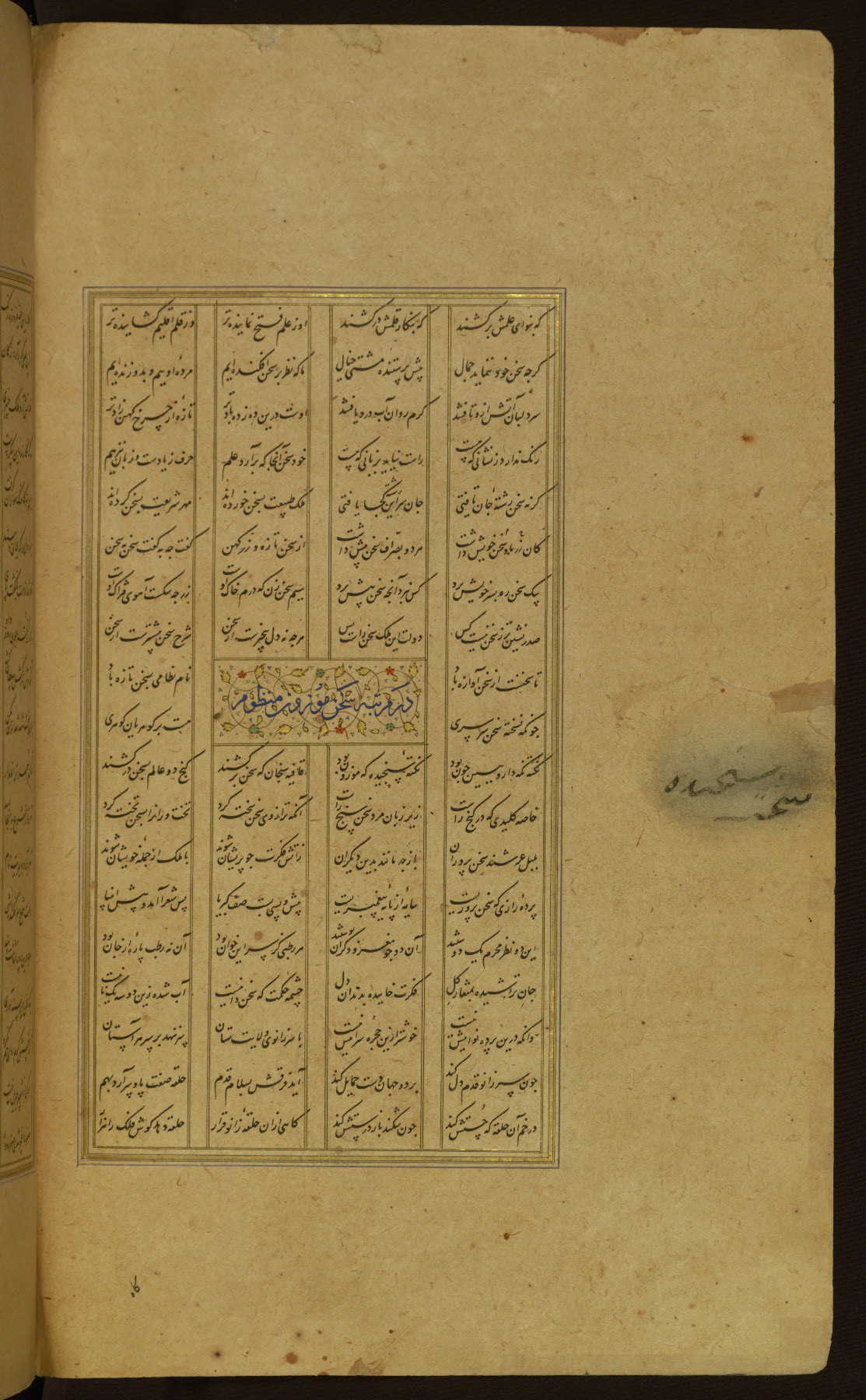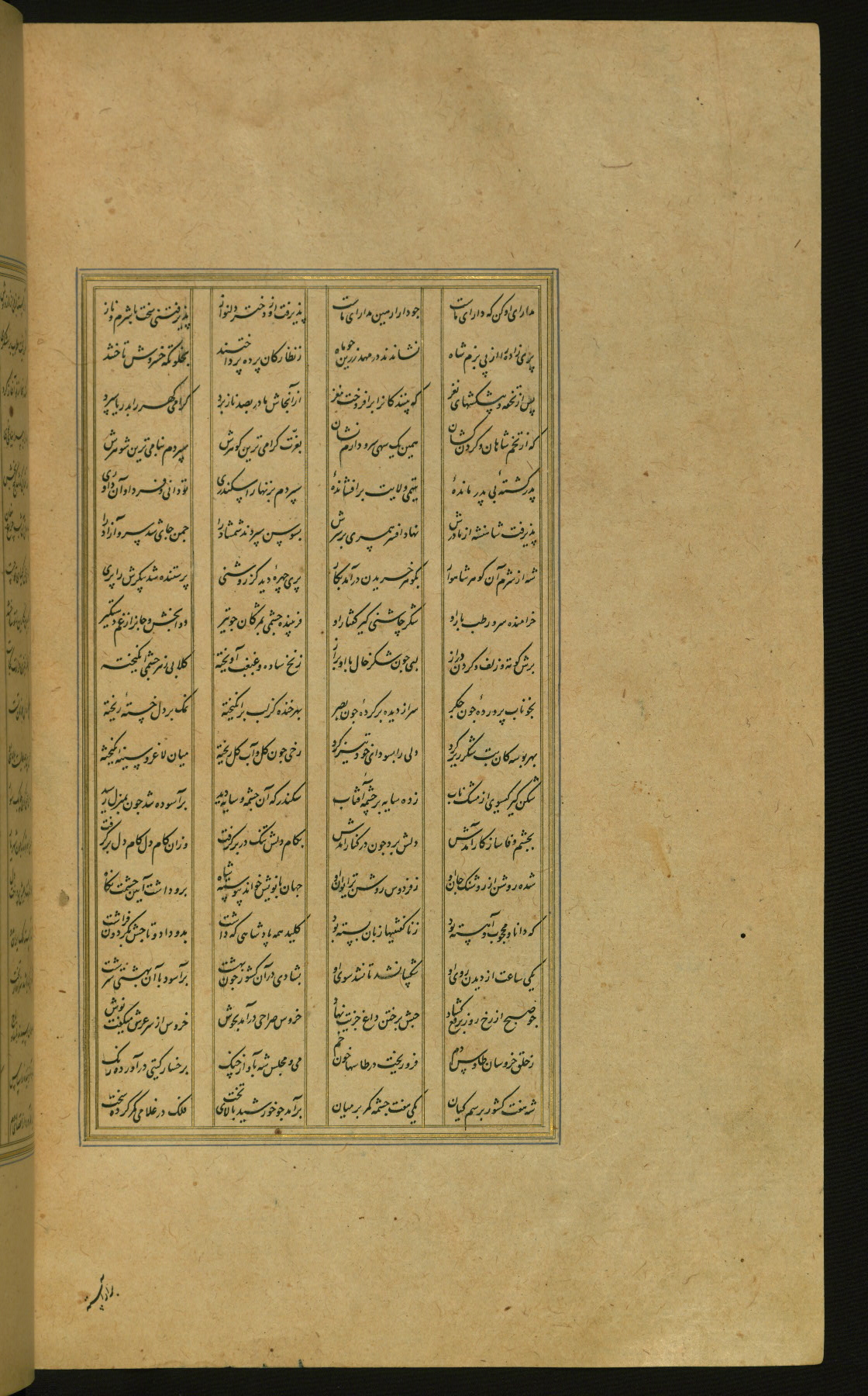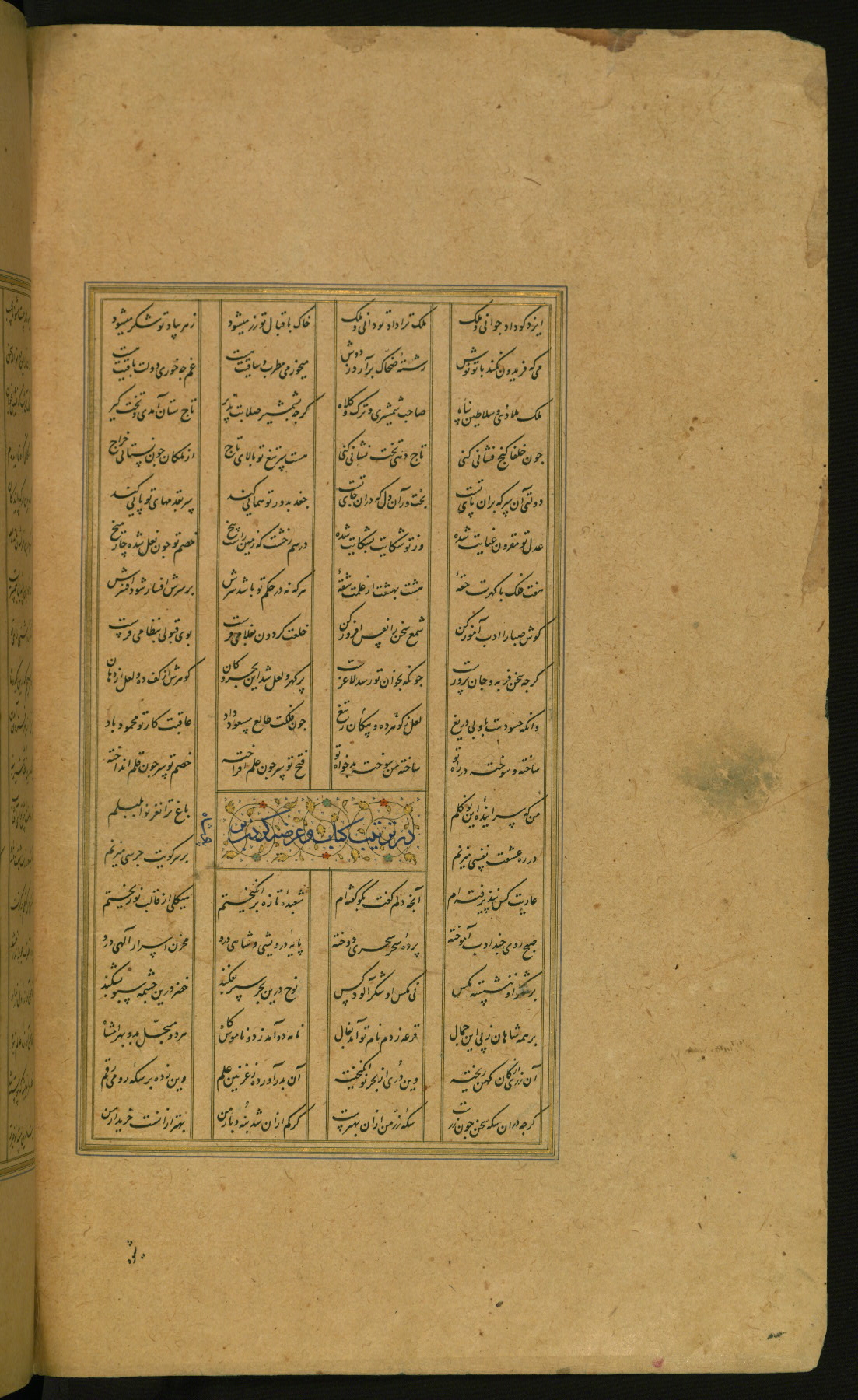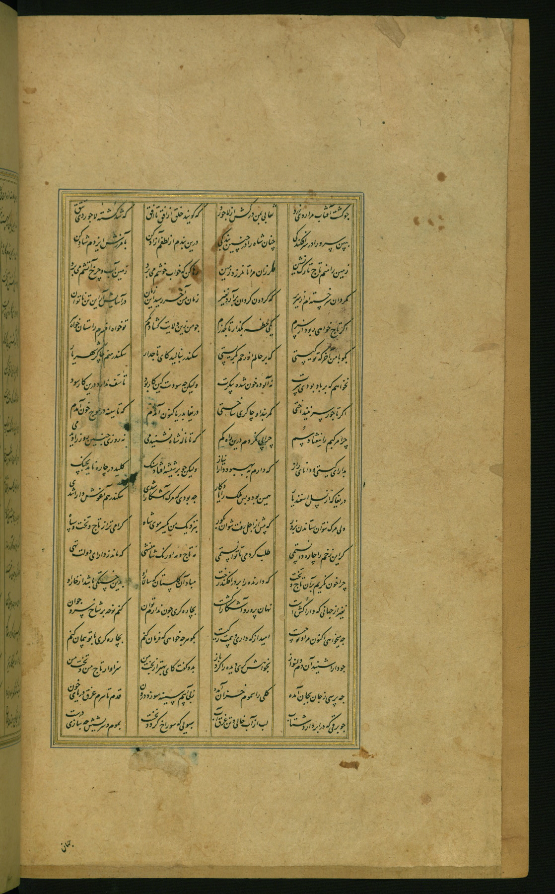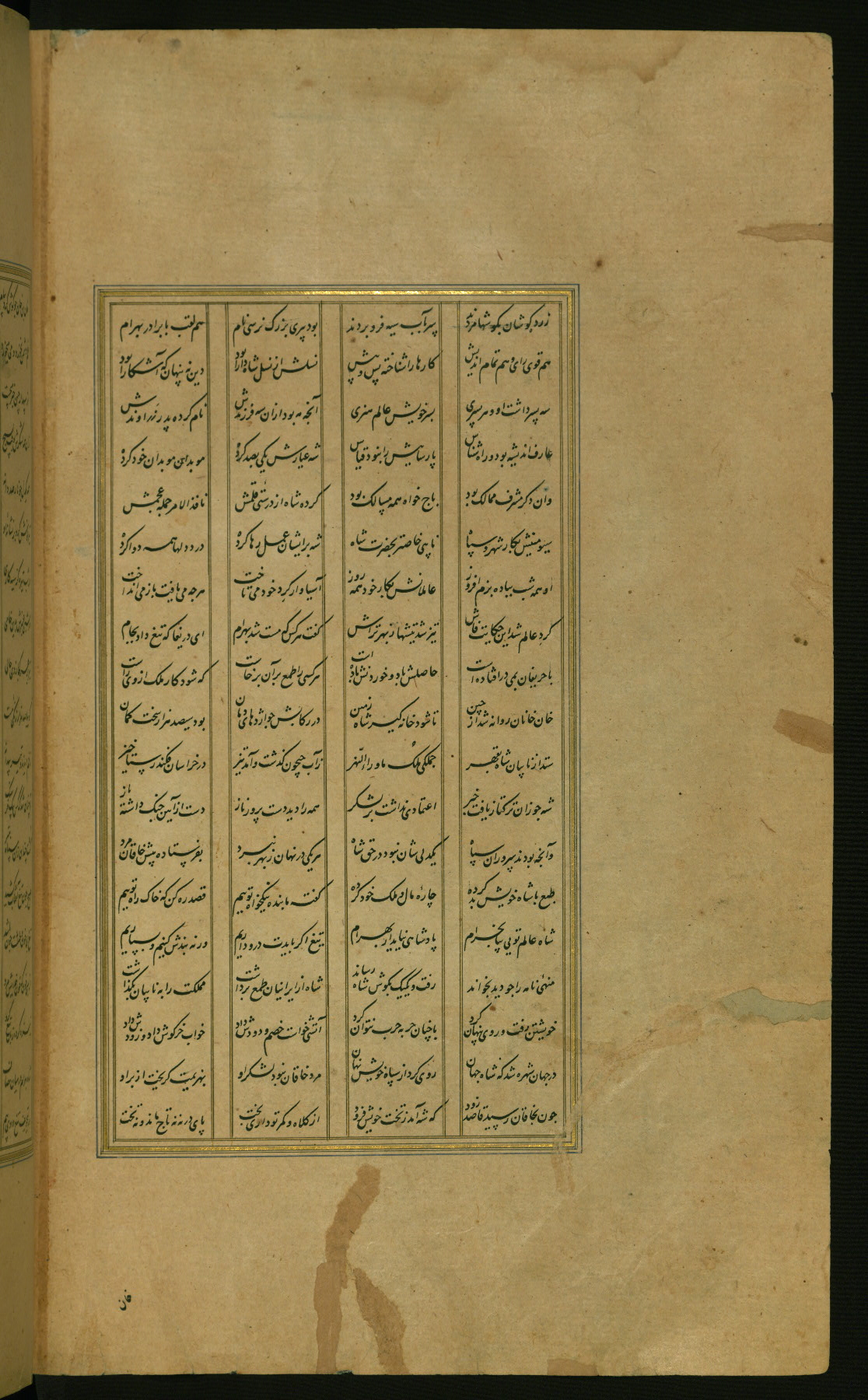 This illuminated and illustrated copy of the Khamsah (quintet) of Niẓāmī Ganjavī (d. 605 AH / 1209 CE) was written by Yār Muḥammad al-Haravī in 922 AH / 1516 CE. Written in four columns in black nastaʿlīq script, this manuscript opens with a double-page illuminated frontispiece signed by ʿAbd al-Wahhāb ibn ʿAbd al-Fattāḥ ibn ʿAlī. It contains thirty-five illustrations that were repainted in India during the twelfth century AH / eighteenth CE. The seal of Muḥammad Asharf ibn Muḥammad Khātam al-Ḥusaynī, dated 1173 AH / 1759-60 CE appears on fols. 1a and 401a. It is possible that the brown leather binding with center and side panels brushed with gold is original to the manuscript but was repaired at a later stage in the codex's history.