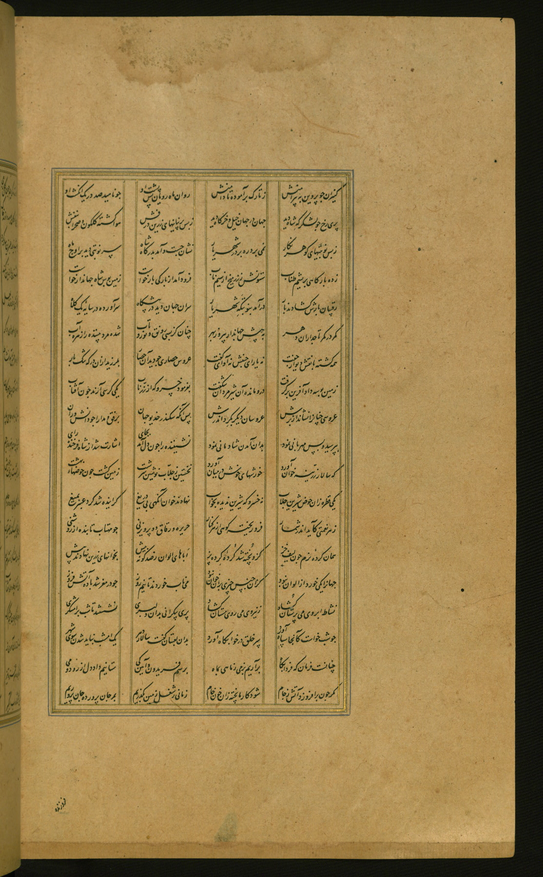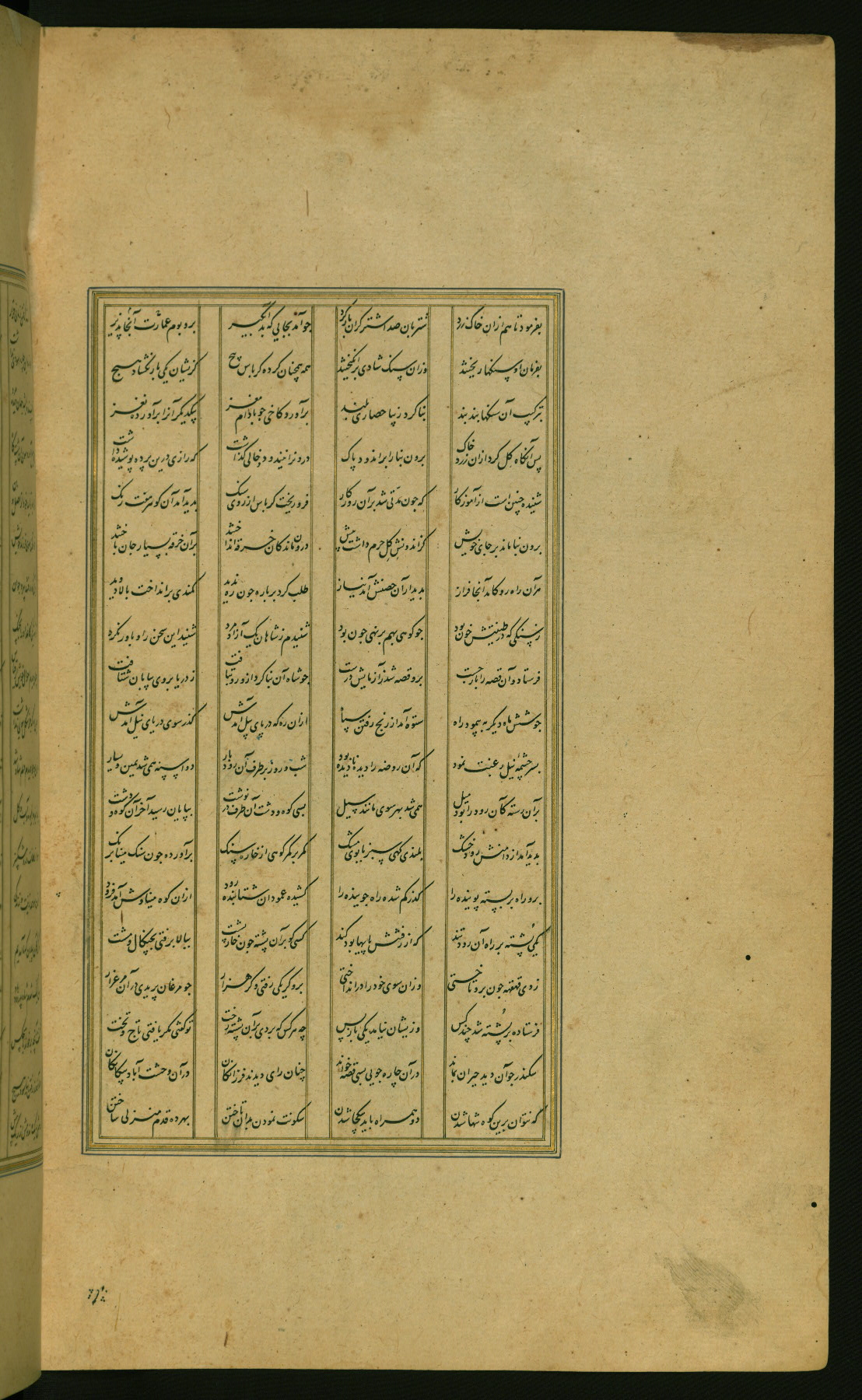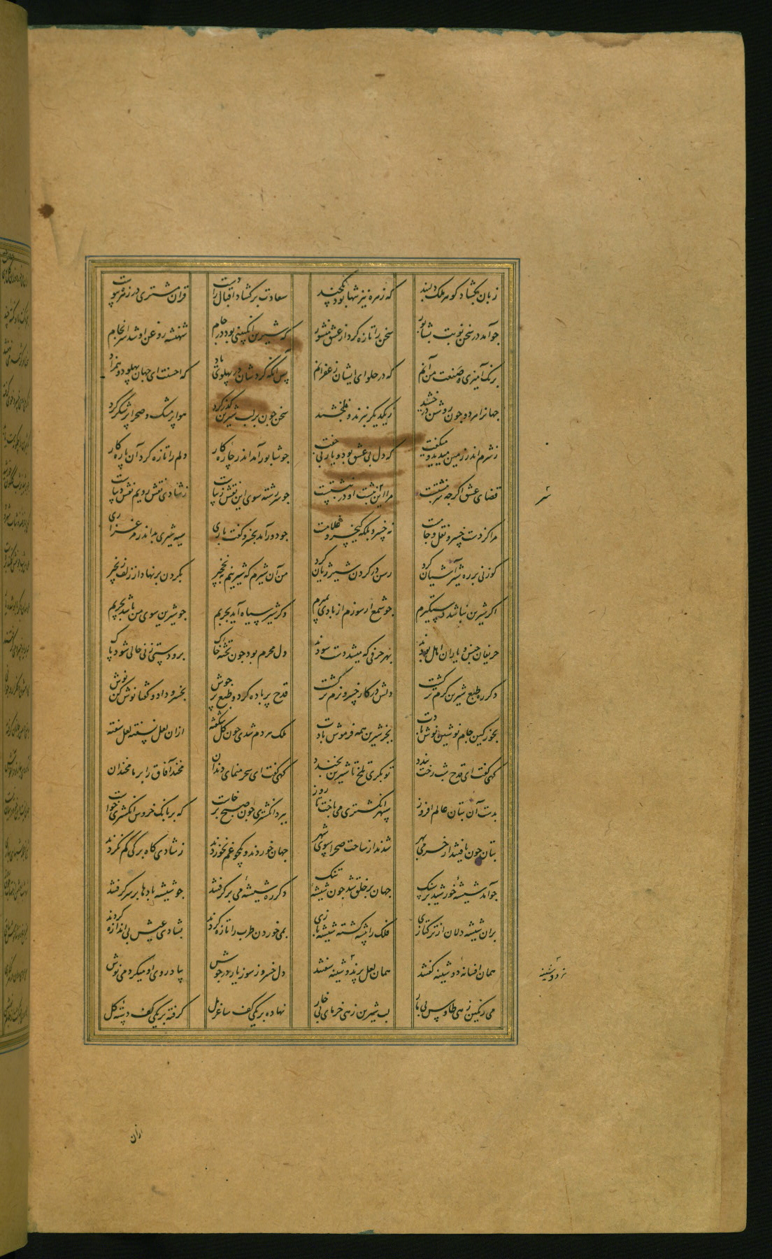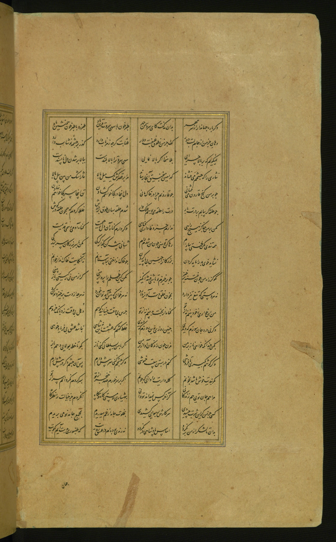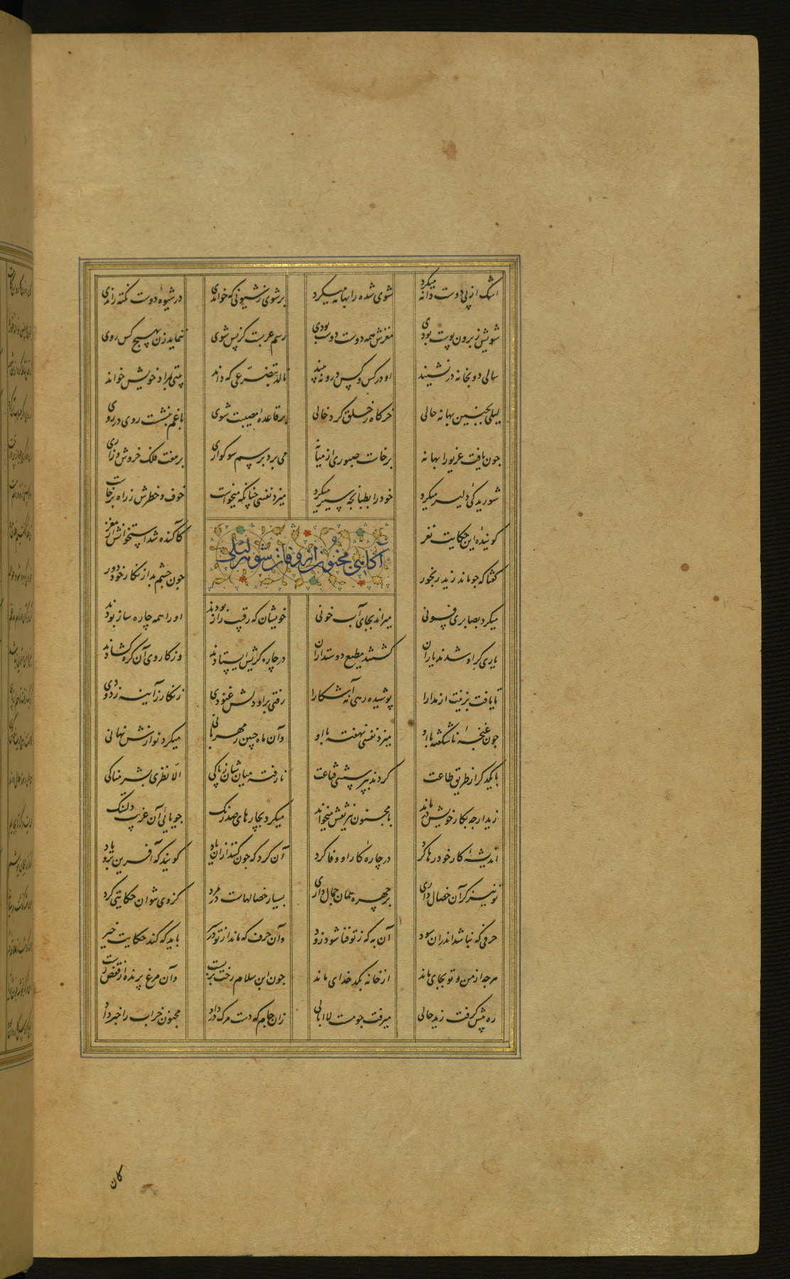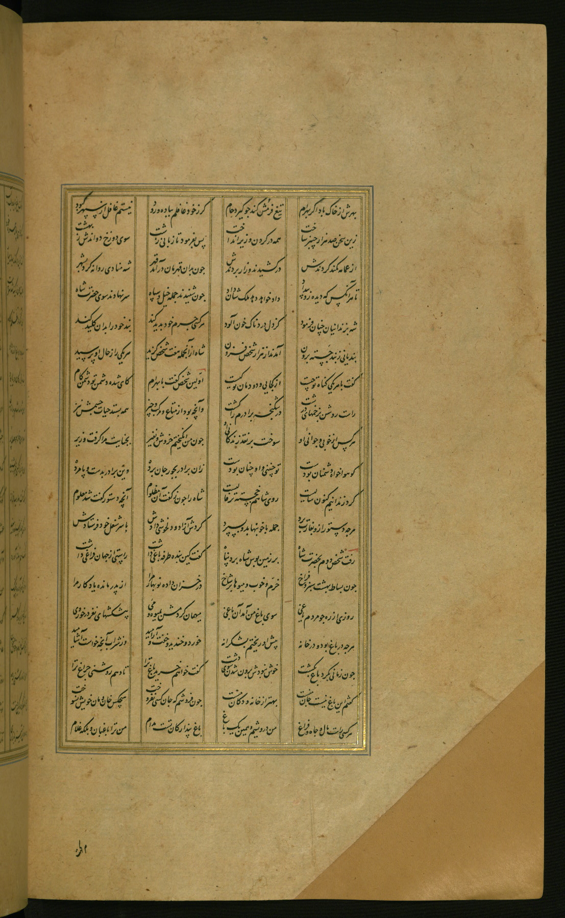 This illuminated and illustrated copy of the Khamsah (quintet) of Niẓāmī Ganjavī (d. 605 AH / 1209 CE) was written by Yār Muḥammad al-Haravī in 922 AH / 1516 CE. Written in four columns in black nastaʿlīq script, this manuscript opens with a double-page illuminated frontispiece signed by ʿAbd al-Wahhāb ibn ʿAbd al-Fattāḥ ibn ʿAlī. It contains thirty-five illustrations that were repainted in India during the twelfth century AH / eighteenth CE. The seal of Muḥammad Asharf ibn Muḥammad Khātam al-Ḥusaynī, dated 1173 AH / 1759-60 CE appears on fols. 1a and 401a. It is possible that the brown leather binding with center and side panels brushed with gold is original to the manuscript but was repaired at a later stage in the codex's history.