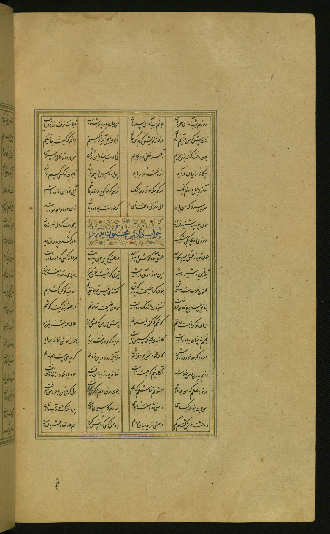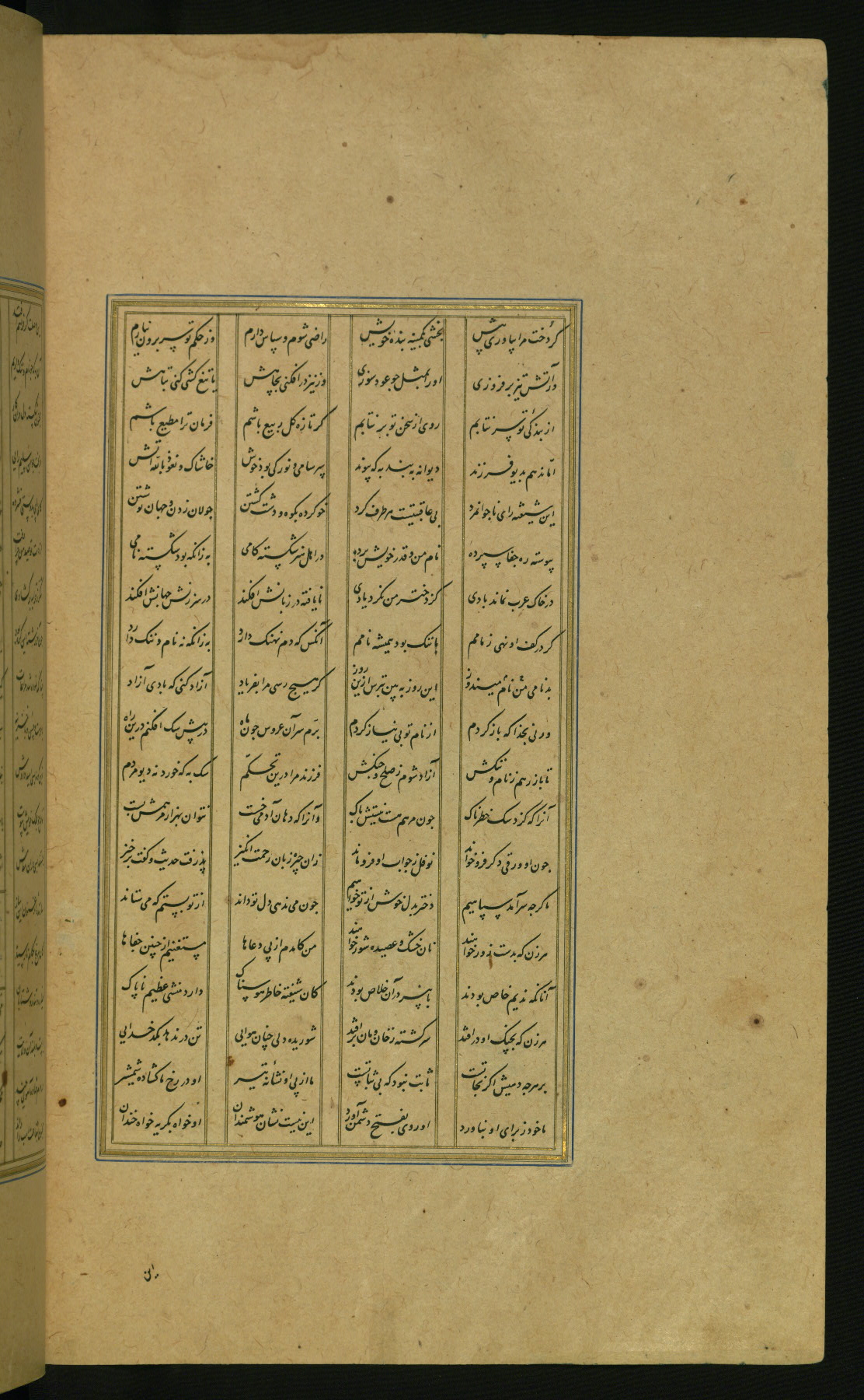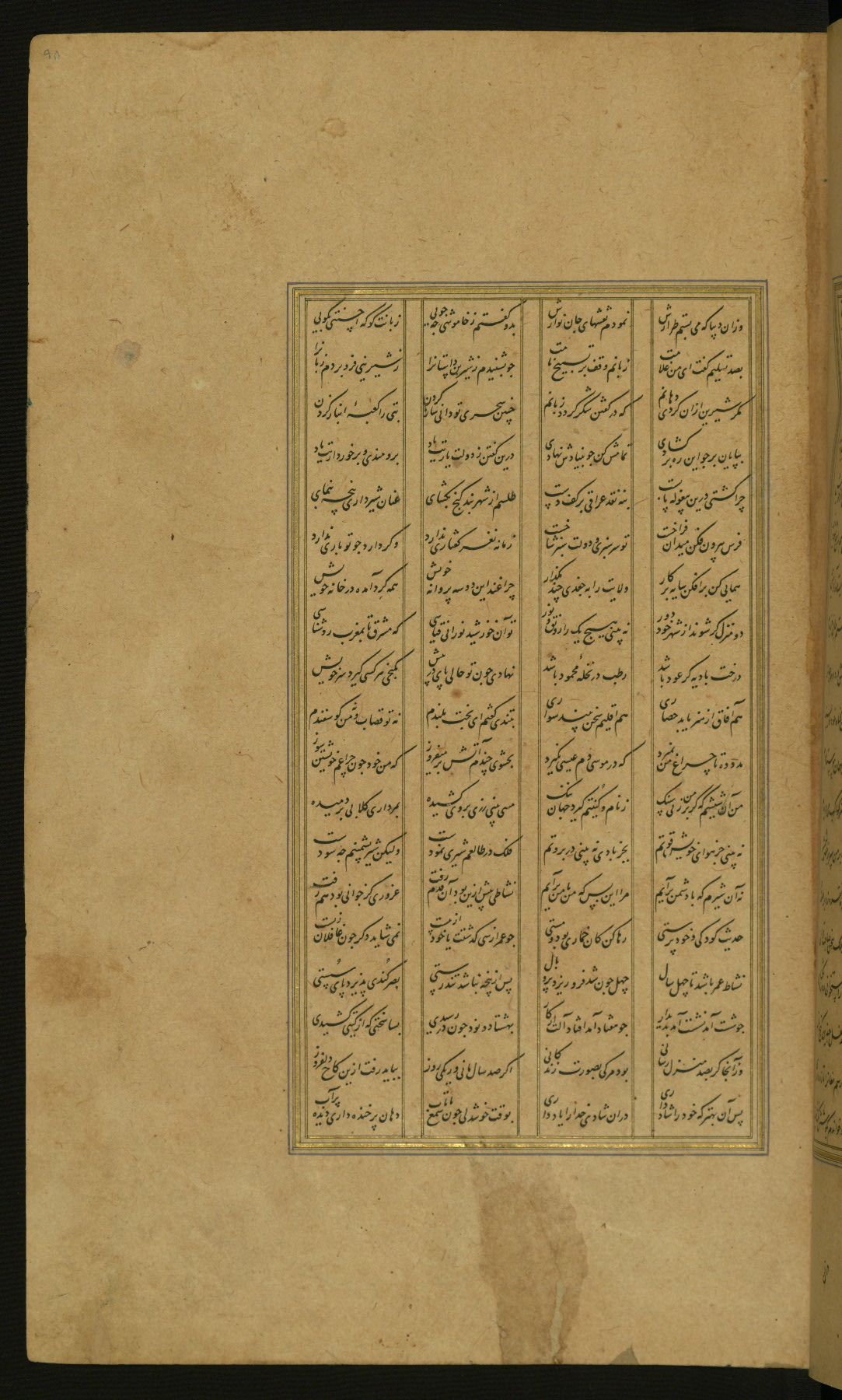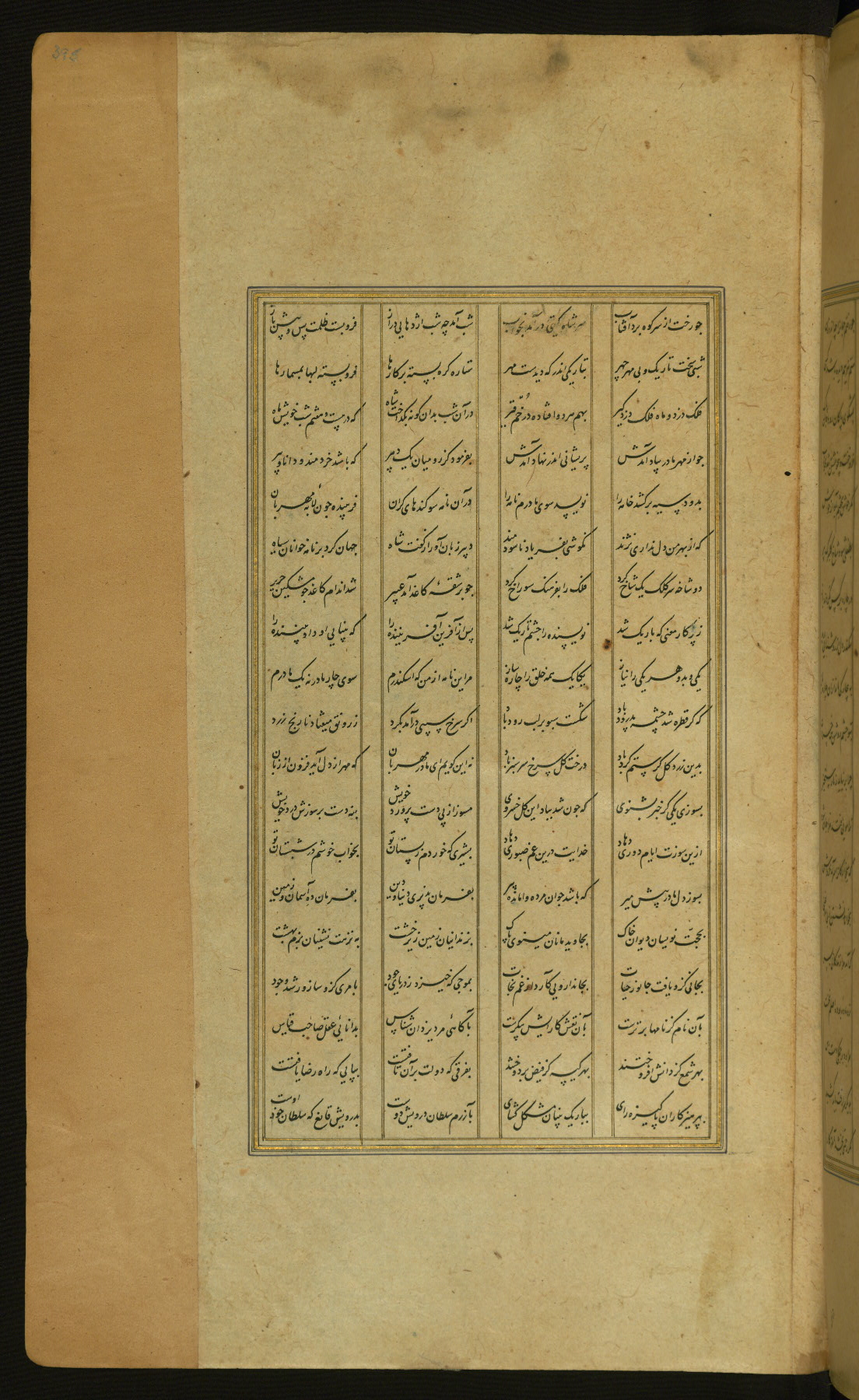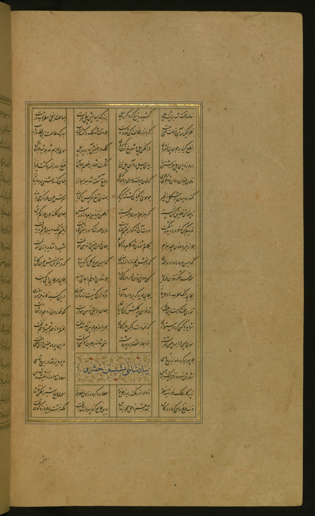 This illuminated and illustrated copy of the Khamsah (quintet) of Niẓāmī Ganjavī (d. 605 AH / 1209 CE) was written by Yār Muḥammad al-Haravī in 922 AH / 1516 CE. Written in four columns in black nastaʿlīq script, this manuscript opens with a double-page illuminated frontispiece signed by ʿAbd al-Wahhāb ibn ʿAbd al-Fattāḥ ibn ʿAlī. It contains thirty-five illustrations that were repainted in India during the twelfth century AH / eighteenth CE. The seal of Muḥammad Asharf ibn Muḥammad Khātam al-Ḥusaynī, dated 1173 AH / 1759-60 CE appears on fols. 1a and 401a. It is possible that the brown leather binding with center and side panels brushed with gold is original to the manuscript but was repaired at a later stage in the codex's history.