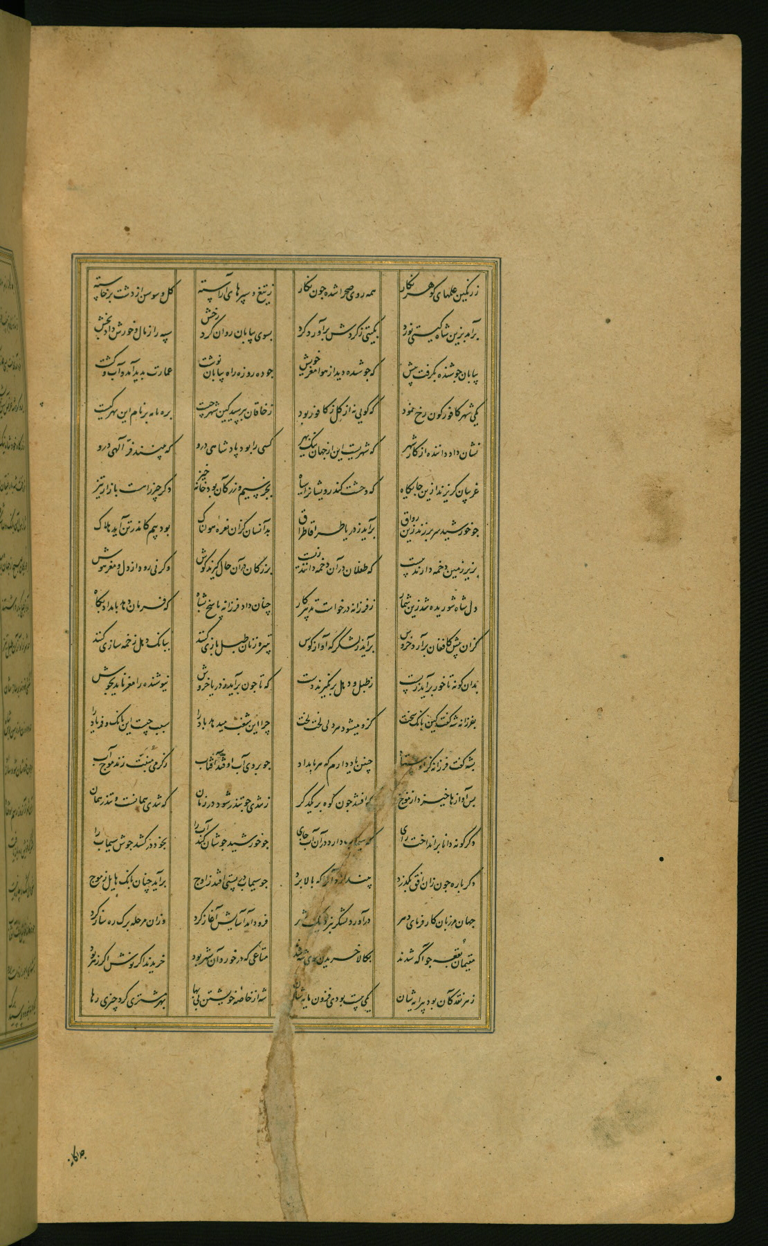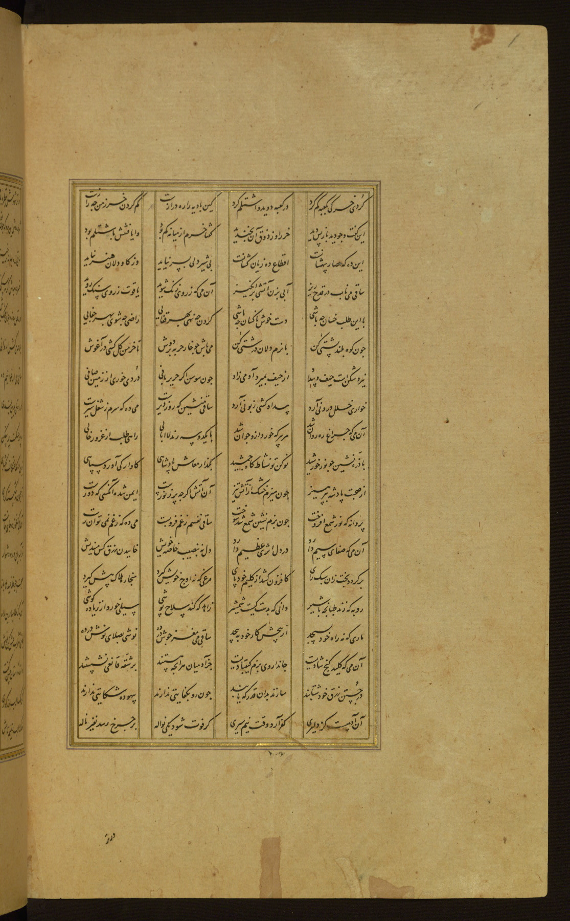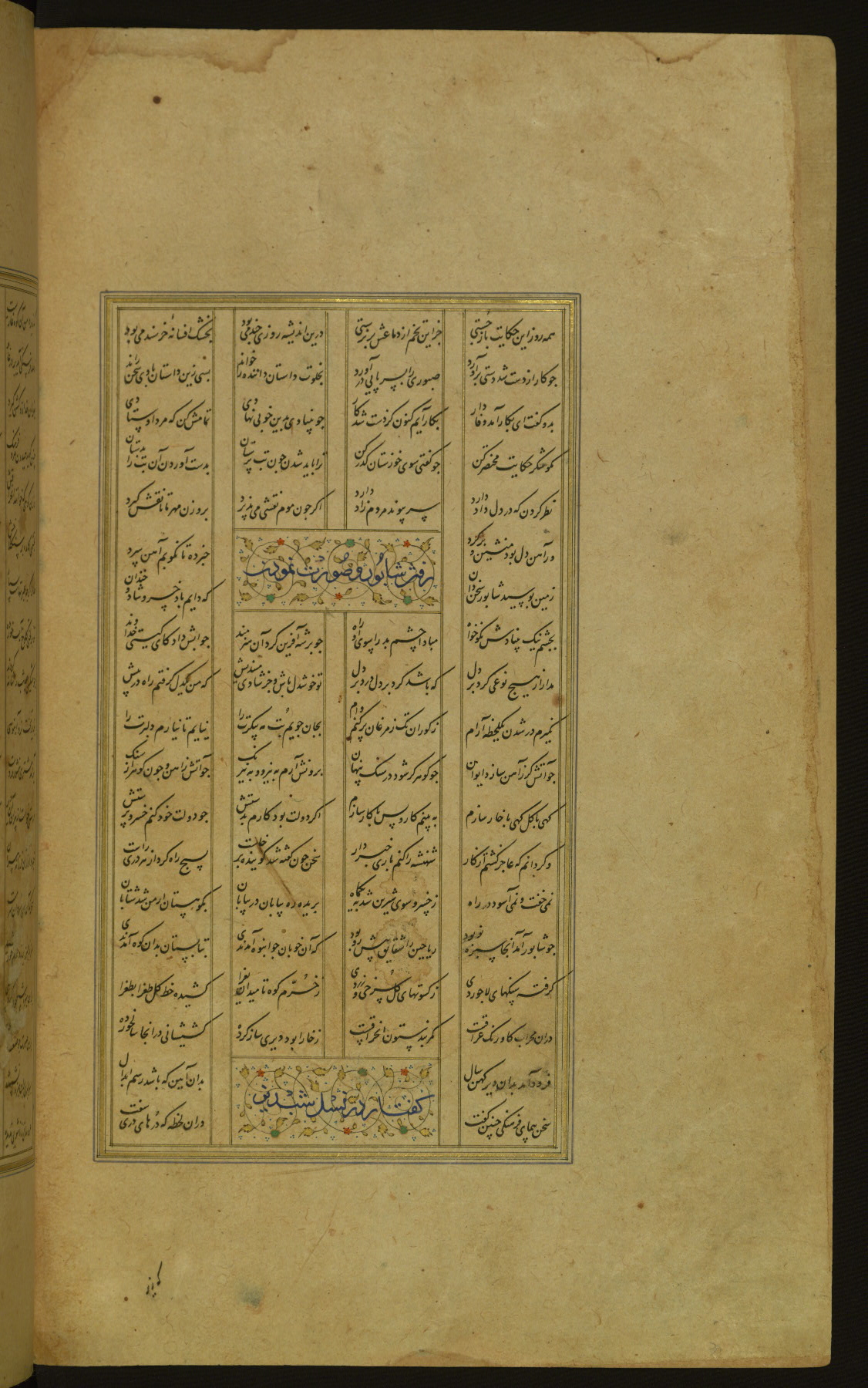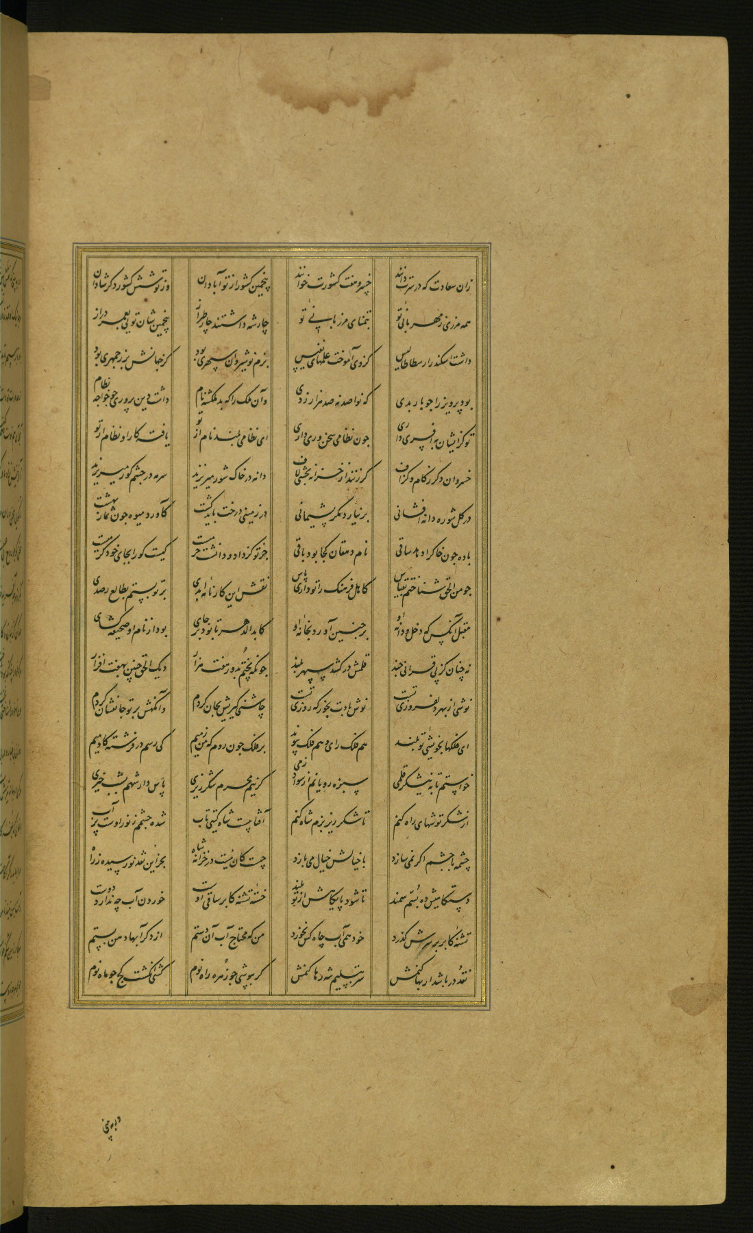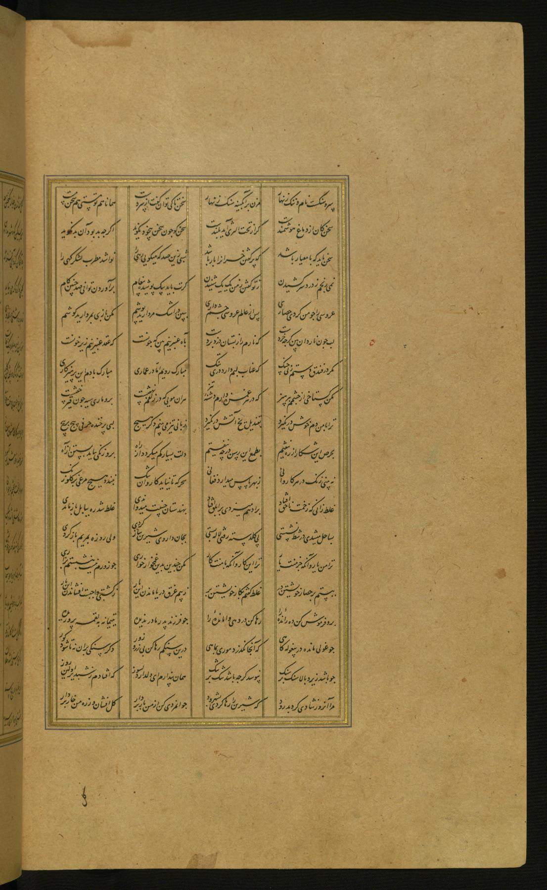 This illuminated and illustrated copy of the Khamsah (quintet) of Niẓāmī Ganjavī (d. 605 AH / 1209 CE) was written by Yār Muḥammad al-Haravī in 922 AH / 1516 CE. Written in four columns in black nastaʿlīq script, this manuscript opens with a double-page illuminated frontispiece signed by ʿAbd al-Wahhāb ibn ʿAbd al-Fattāḥ ibn ʿAlī. It contains thirty-five illustrations that were repainted in India during the twelfth century AH / eighteenth CE. The seal of Muḥammad Asharf ibn Muḥammad Khātam al-Ḥusaynī, dated 1173 AH / 1759-60 CE appears on fols. 1a and 401a. It is possible that the brown leather binding with center and side panels brushed with gold is original to the manuscript but was repaired at a later stage in the codex's history.