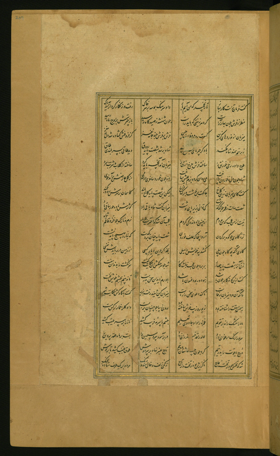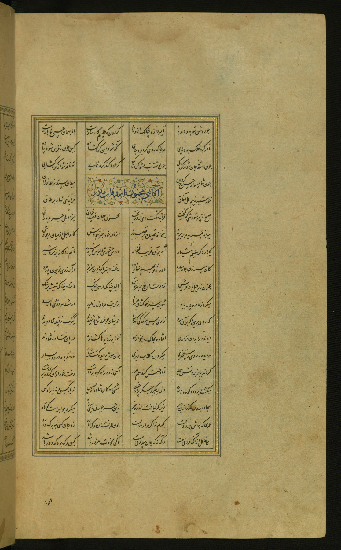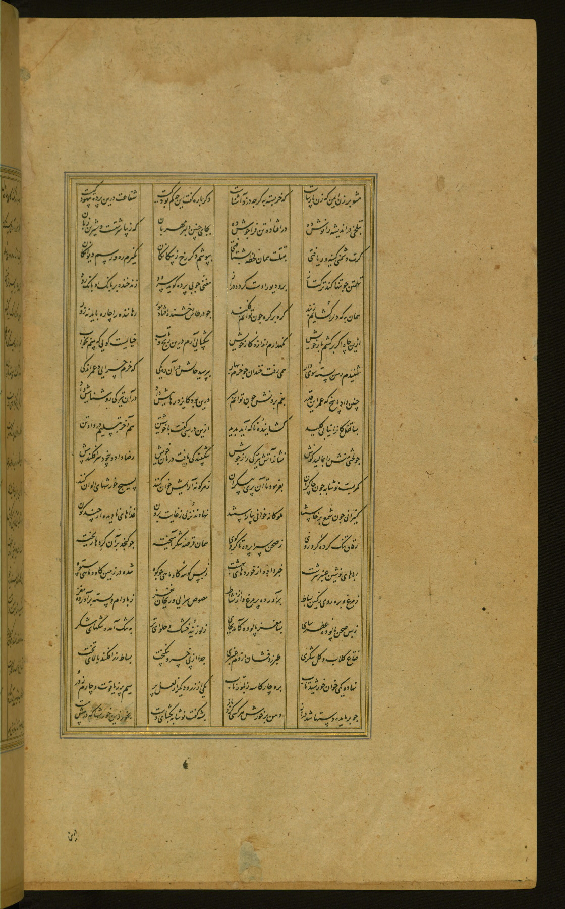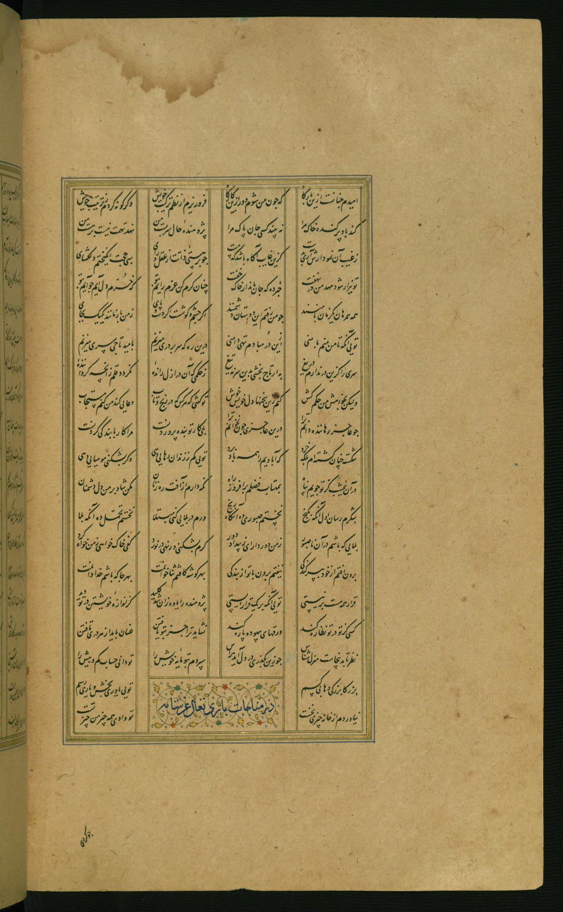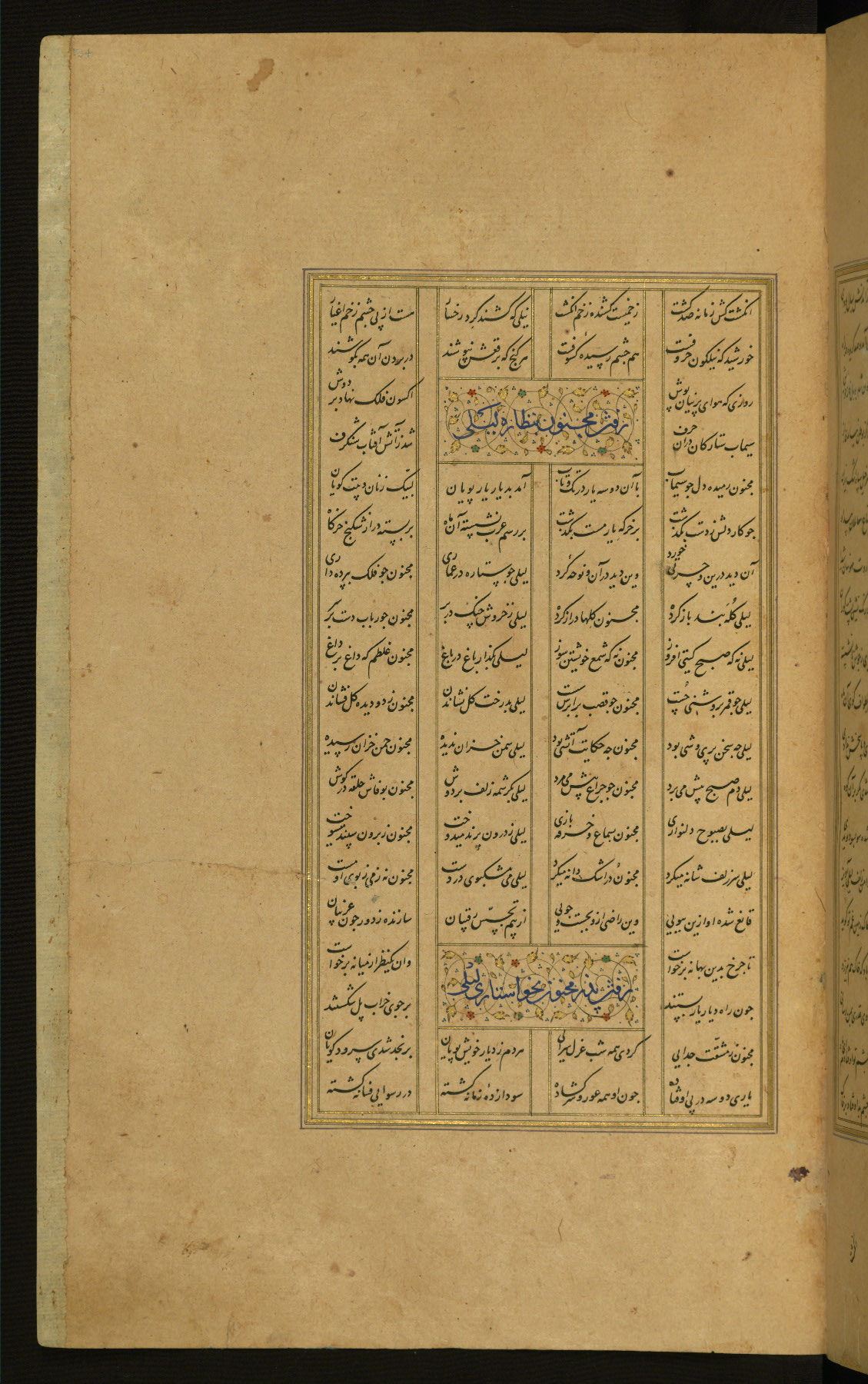 This illuminated and illustrated copy of the Khamsah (quintet) of Niẓāmī Ganjavī (d. 605 AH / 1209 CE) was written by Yār Muḥammad al-Haravī in 922 AH / 1516 CE. Written in four columns in black nastaʿlīq script, this manuscript opens with a double-page illuminated frontispiece signed by ʿAbd al-Wahhāb ibn ʿAbd al-Fattāḥ ibn ʿAlī. It contains thirty-five illustrations that were repainted in India during the twelfth century AH / eighteenth CE. The seal of Muḥammad Asharf ibn Muḥammad Khātam al-Ḥusaynī, dated 1173 AH / 1759-60 CE appears on fols. 1a and 401a. It is possible that the brown leather binding with center and side panels brushed with gold is original to the manuscript but was repaired at a later stage in the codex's history.
