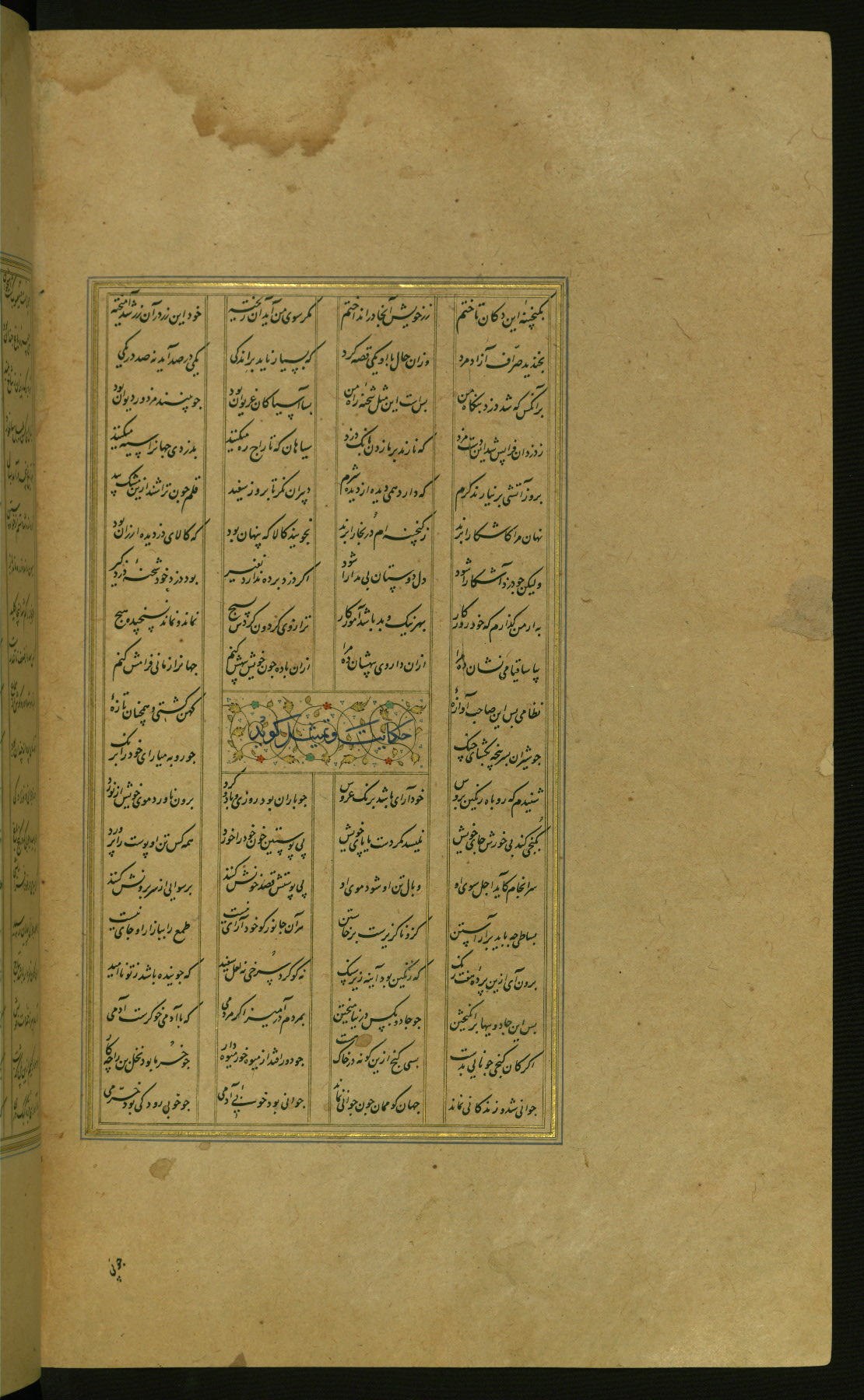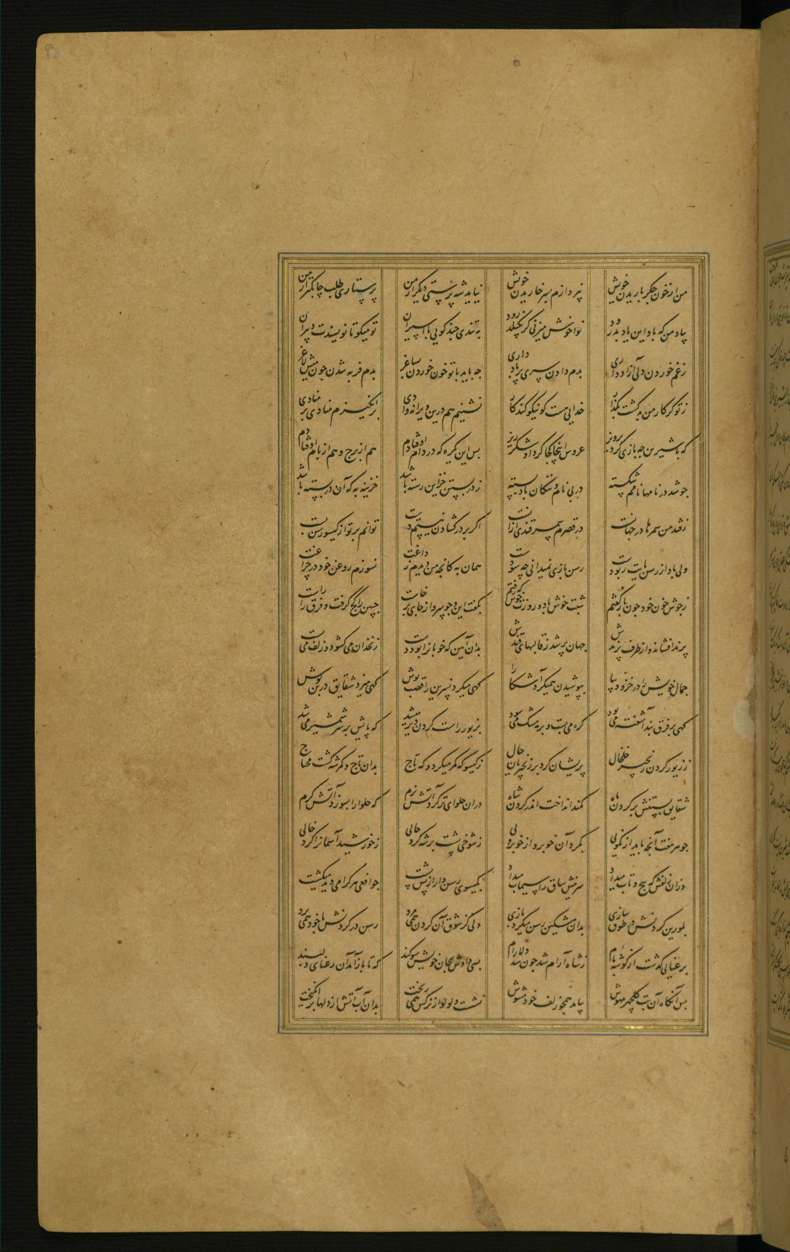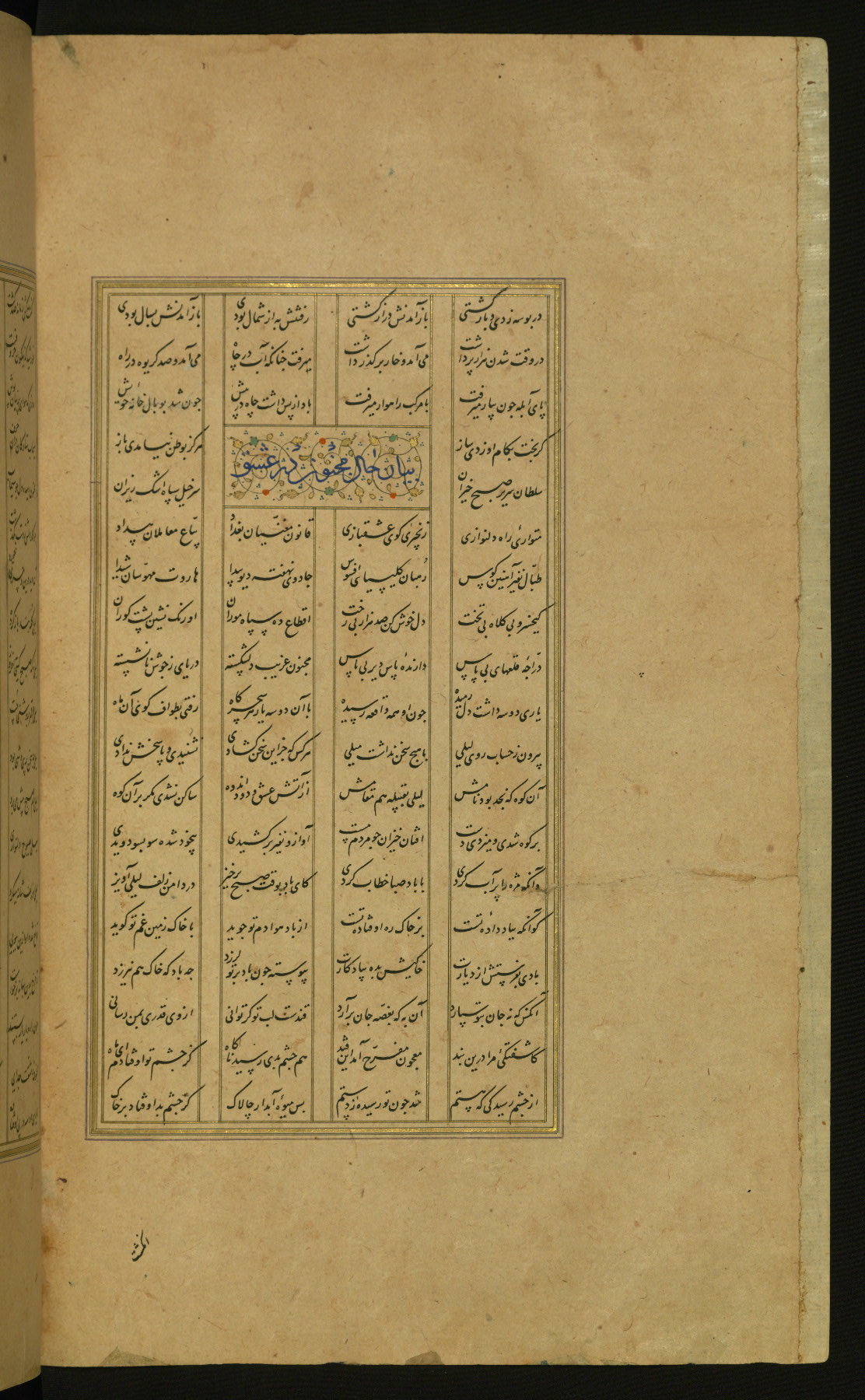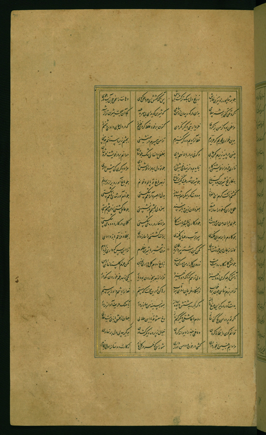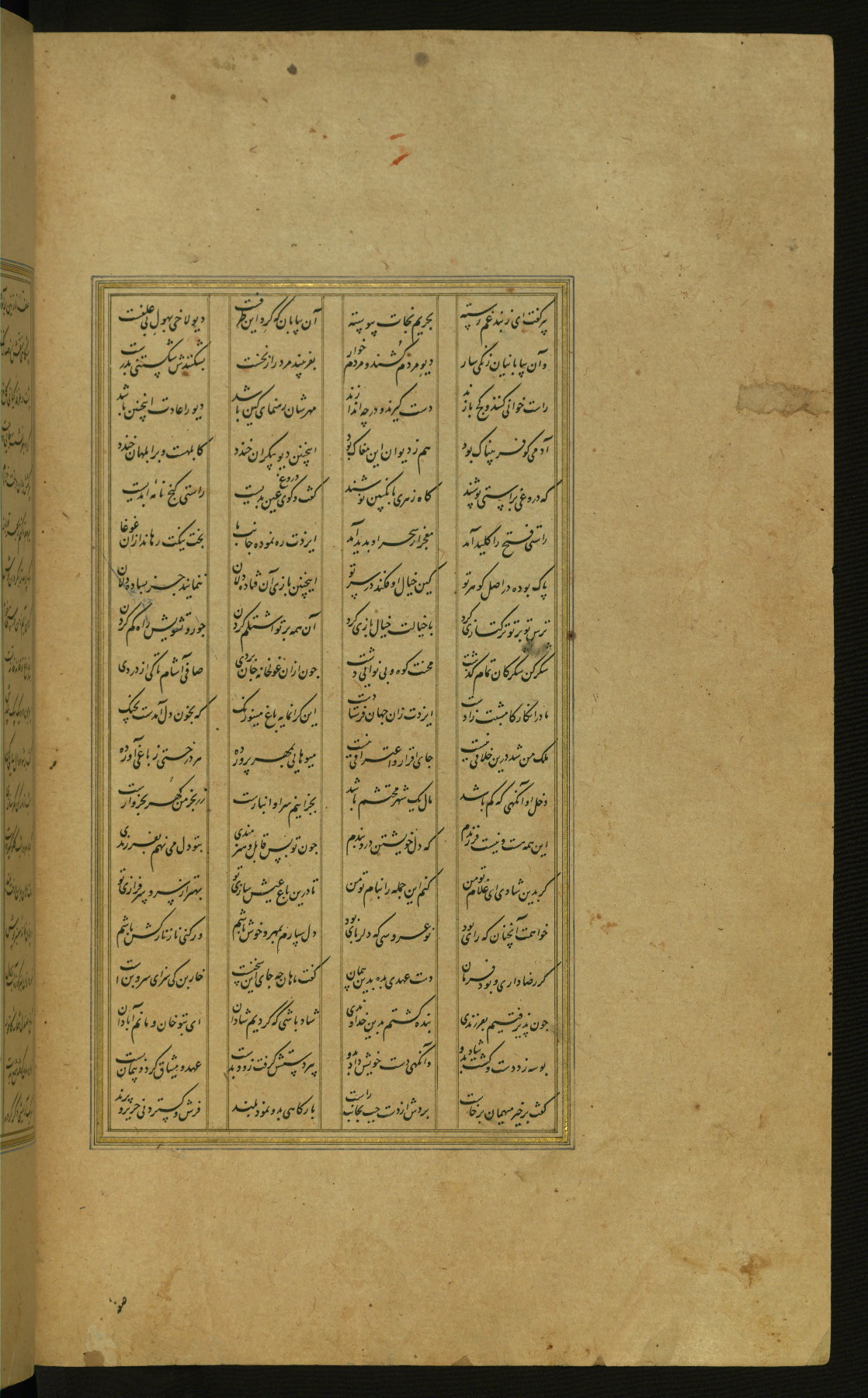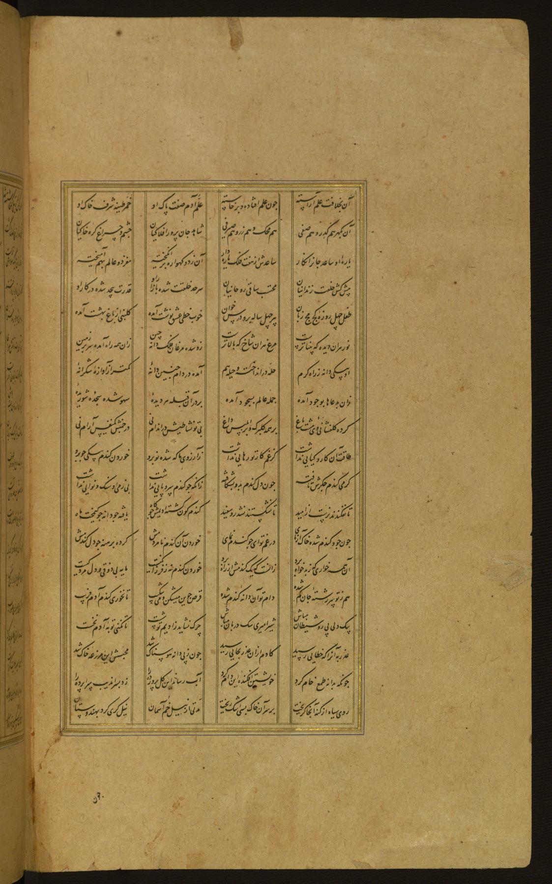 This illuminated and illustrated copy of the Khamsah (quintet) of Niẓāmī Ganjavī (d. 605 AH / 1209 CE) was written by Yār Muḥammad al-Haravī in 922 AH / 1516 CE. Written in four columns in black nastaʿlīq script, this manuscript opens with a double-page illuminated frontispiece signed by ʿAbd al-Wahhāb ibn ʿAbd al-Fattāḥ ibn ʿAlī. It contains thirty-five illustrations that were repainted in India during the twelfth century AH / eighteenth CE. The seal of Muḥammad Asharf ibn Muḥammad Khātam al-Ḥusaynī, dated 1173 AH / 1759-60 CE appears on fols. 1a and 401a. It is possible that the brown leather binding with center and side panels brushed with gold is original to the manuscript but was repaired at a later stage in the codex's history.
