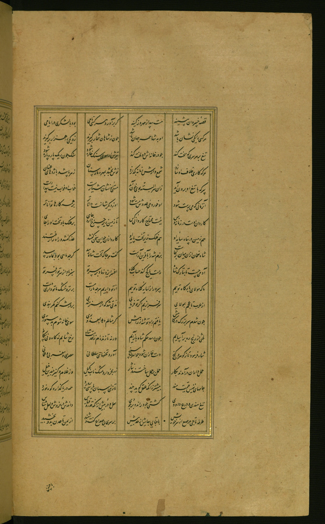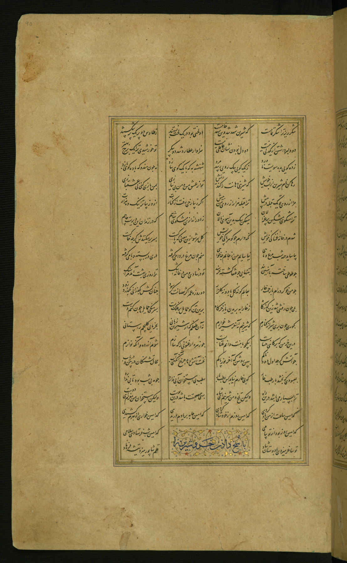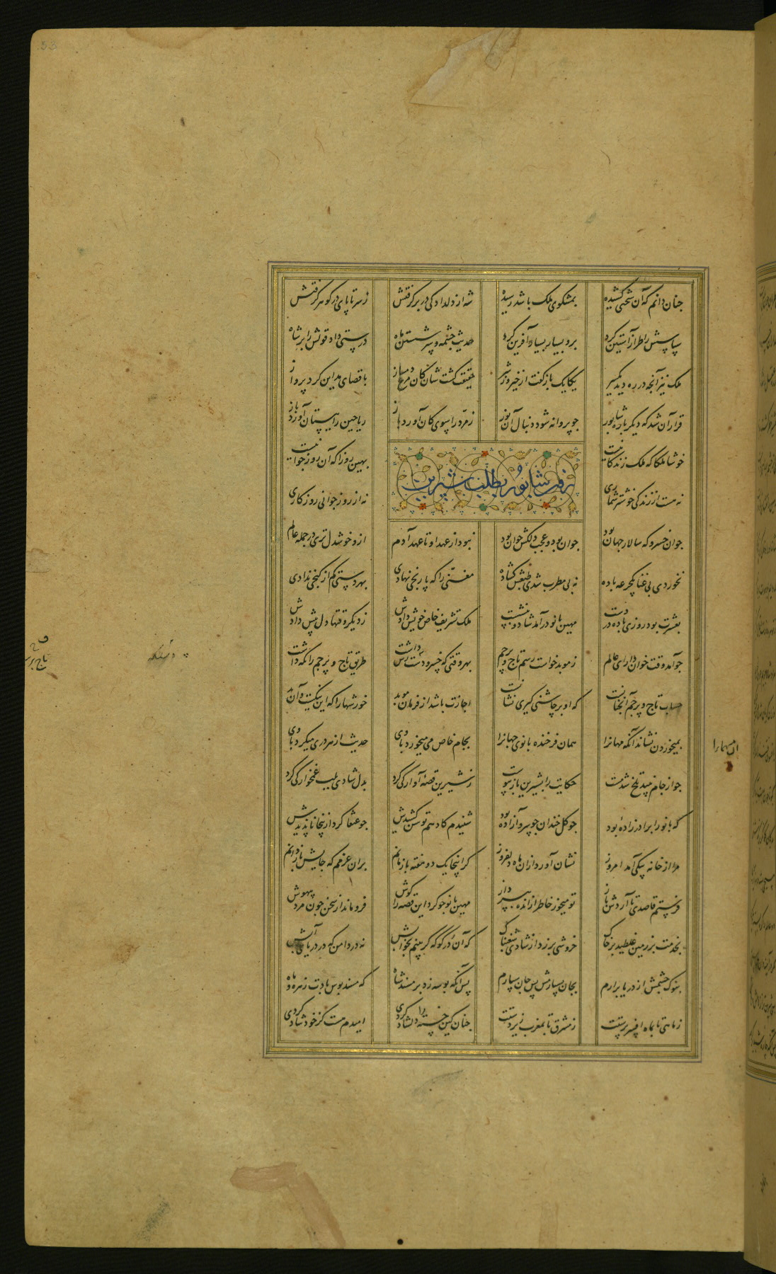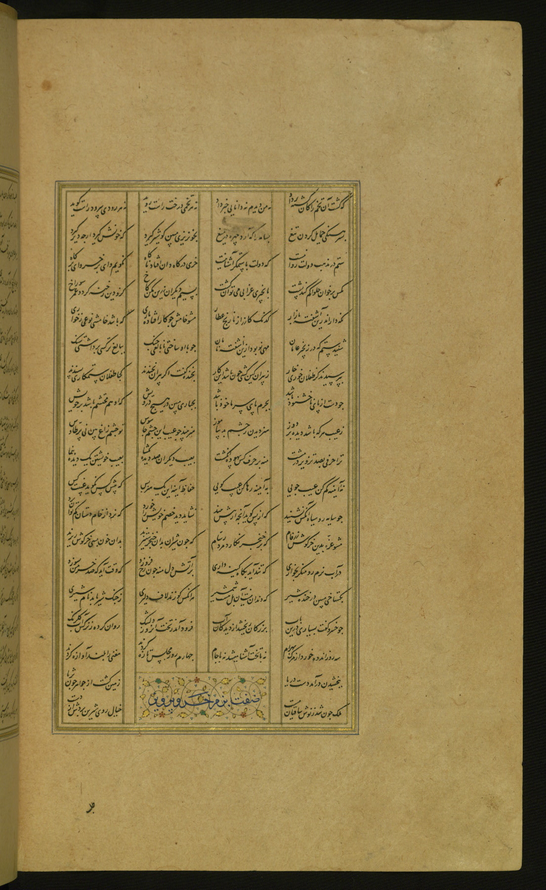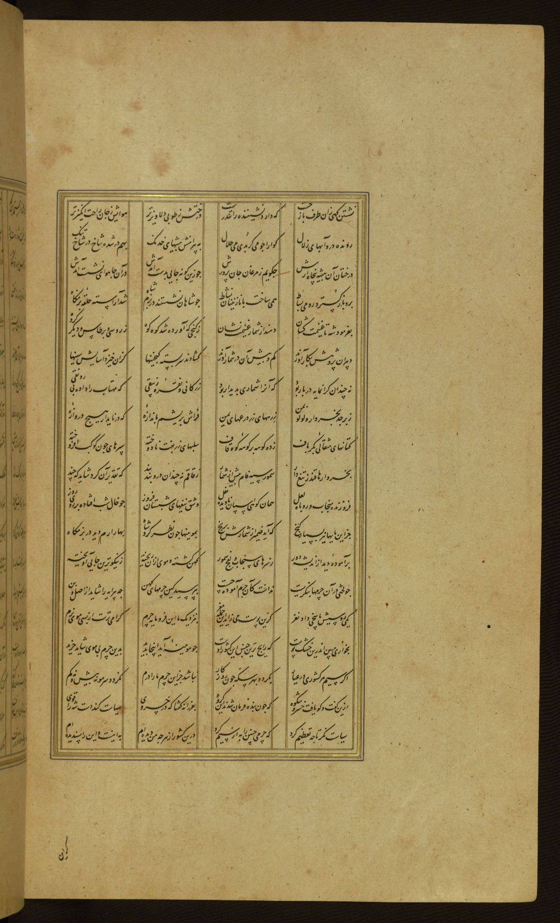 This illuminated and illustrated copy of the Khamsah (quintet) of Niẓāmī Ganjavī (d. 605 AH / 1209 CE) was written by Yār Muḥammad al-Haravī in 922 AH / 1516 CE. Written in four columns in black nastaʿlīq script, this manuscript opens with a double-page illuminated frontispiece signed by ʿAbd al-Wahhāb ibn ʿAbd al-Fattāḥ ibn ʿAlī. It contains thirty-five illustrations that were repainted in India during the twelfth century AH / eighteenth CE. The seal of Muḥammad Asharf ibn Muḥammad Khātam al-Ḥusaynī, dated 1173 AH / 1759-60 CE appears on fols. 1a and 401a. It is possible that the brown leather binding with center and side panels brushed with gold is original to the manuscript but was repaired at a later stage in the codex's history.