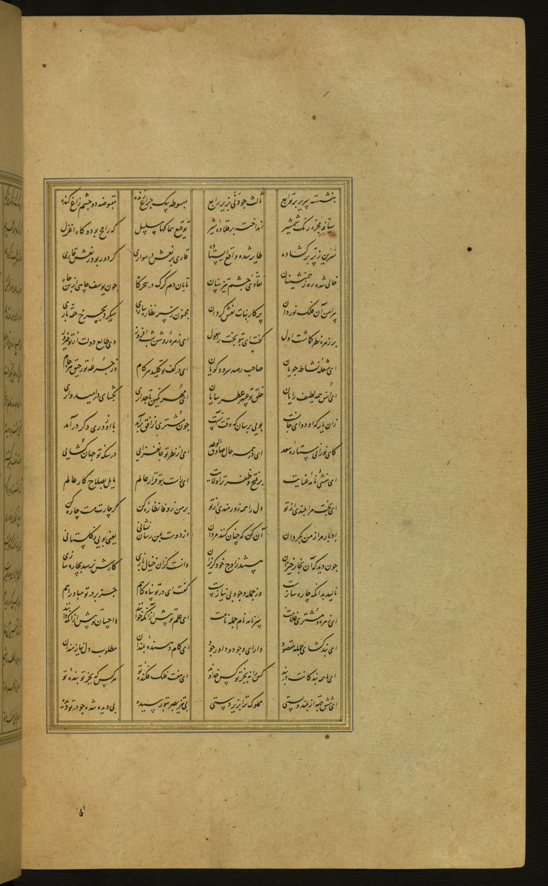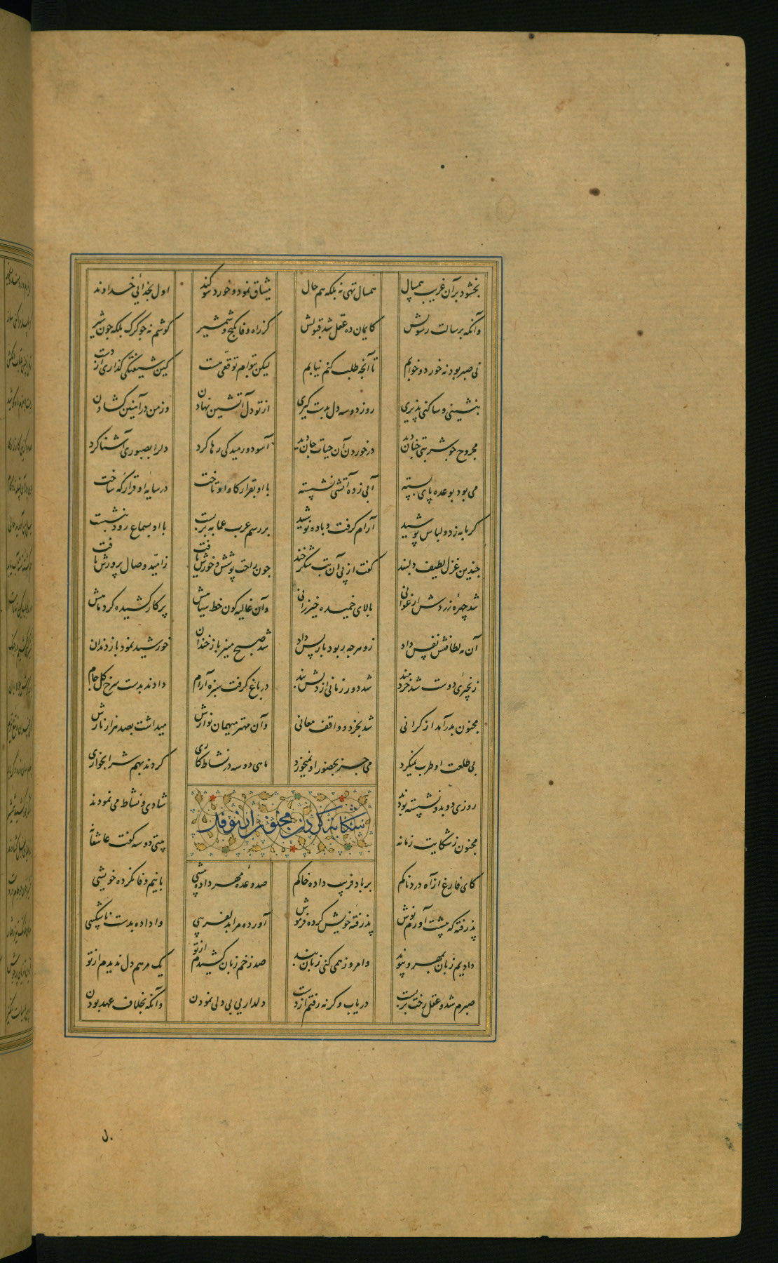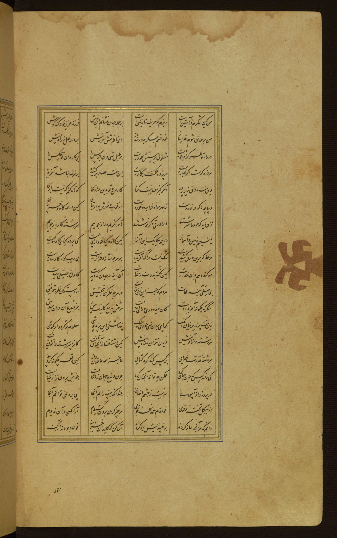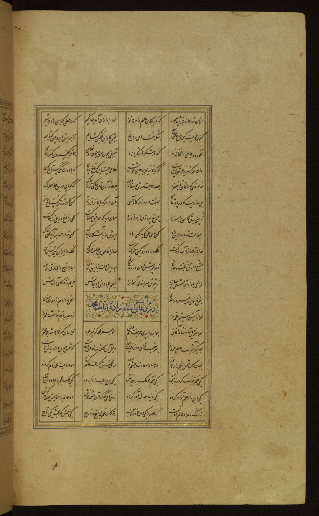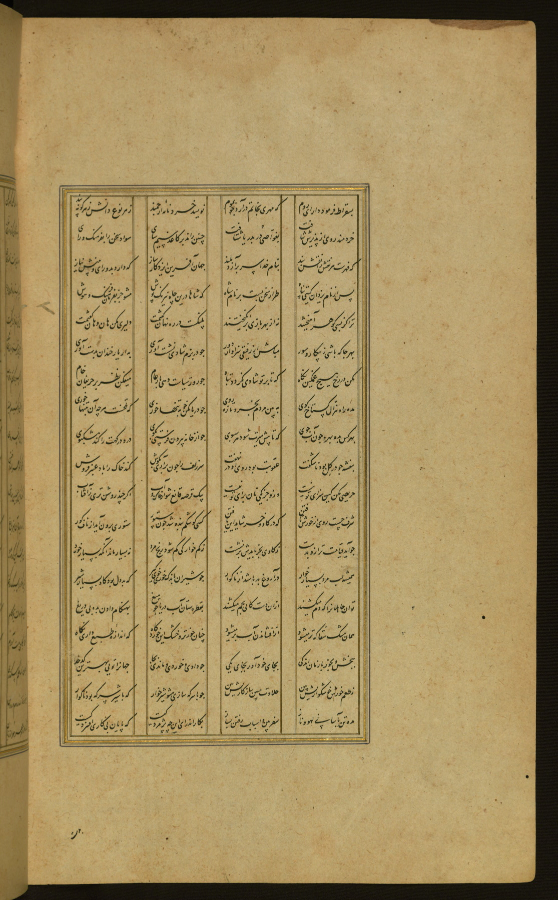 This illuminated and illustrated copy of the Khamsah (quintet) of Niẓāmī Ganjavī (d. 605 AH / 1209 CE) was written by Yār Muḥammad al-Haravī in 922 AH / 1516 CE. Written in four columns in black nastaʿlīq script, this manuscript opens with a double-page illuminated frontispiece signed by ʿAbd al-Wahhāb ibn ʿAbd al-Fattāḥ ibn ʿAlī. It contains thirty-five illustrations that were repainted in India during the twelfth century AH / eighteenth CE. The seal of Muḥammad Asharf ibn Muḥammad Khātam al-Ḥusaynī, dated 1173 AH / 1759-60 CE appears on fols. 1a and 401a. It is possible that the brown leather binding with center and side panels brushed with gold is original to the manuscript but was repaired at a later stage in the codex's history.