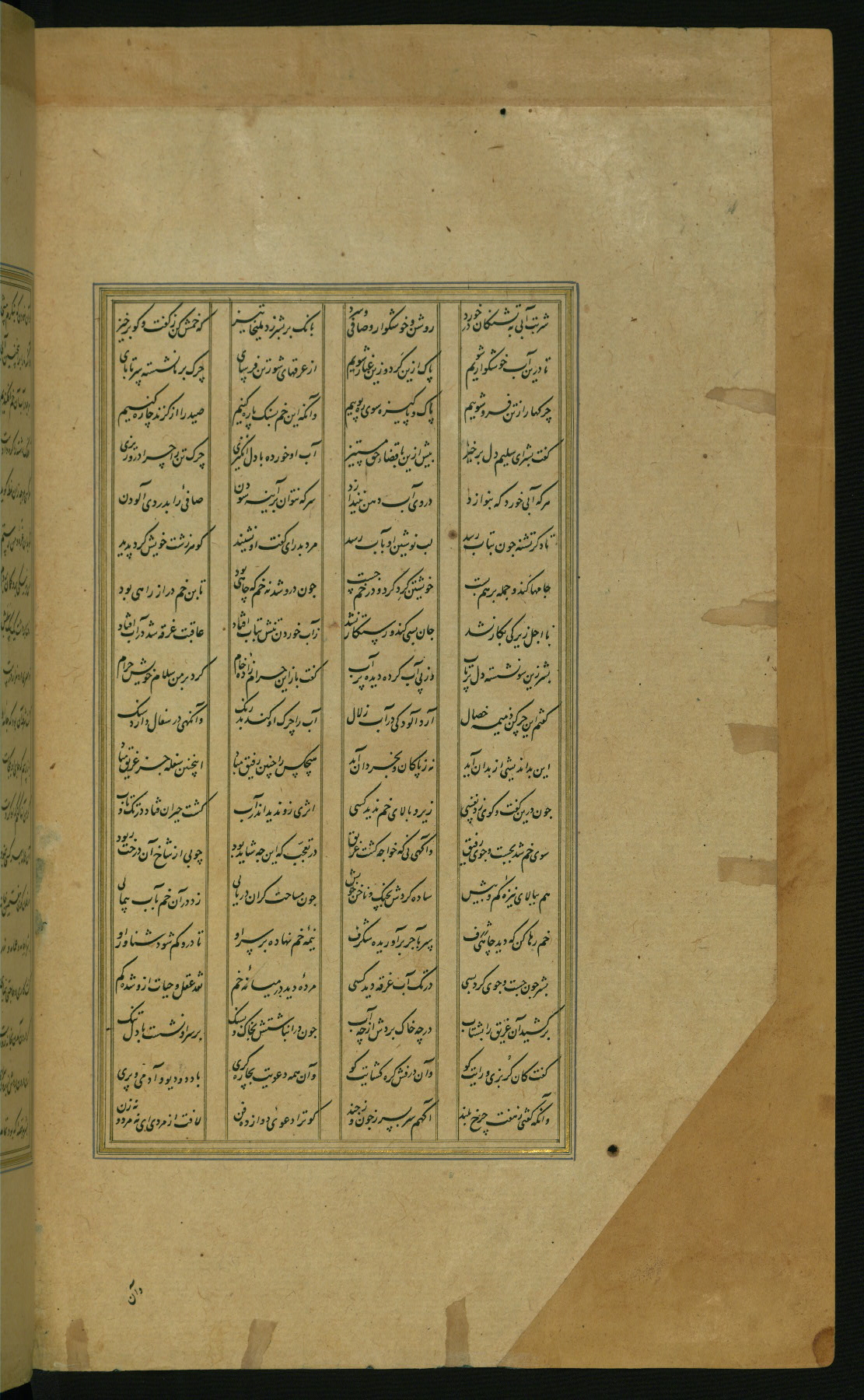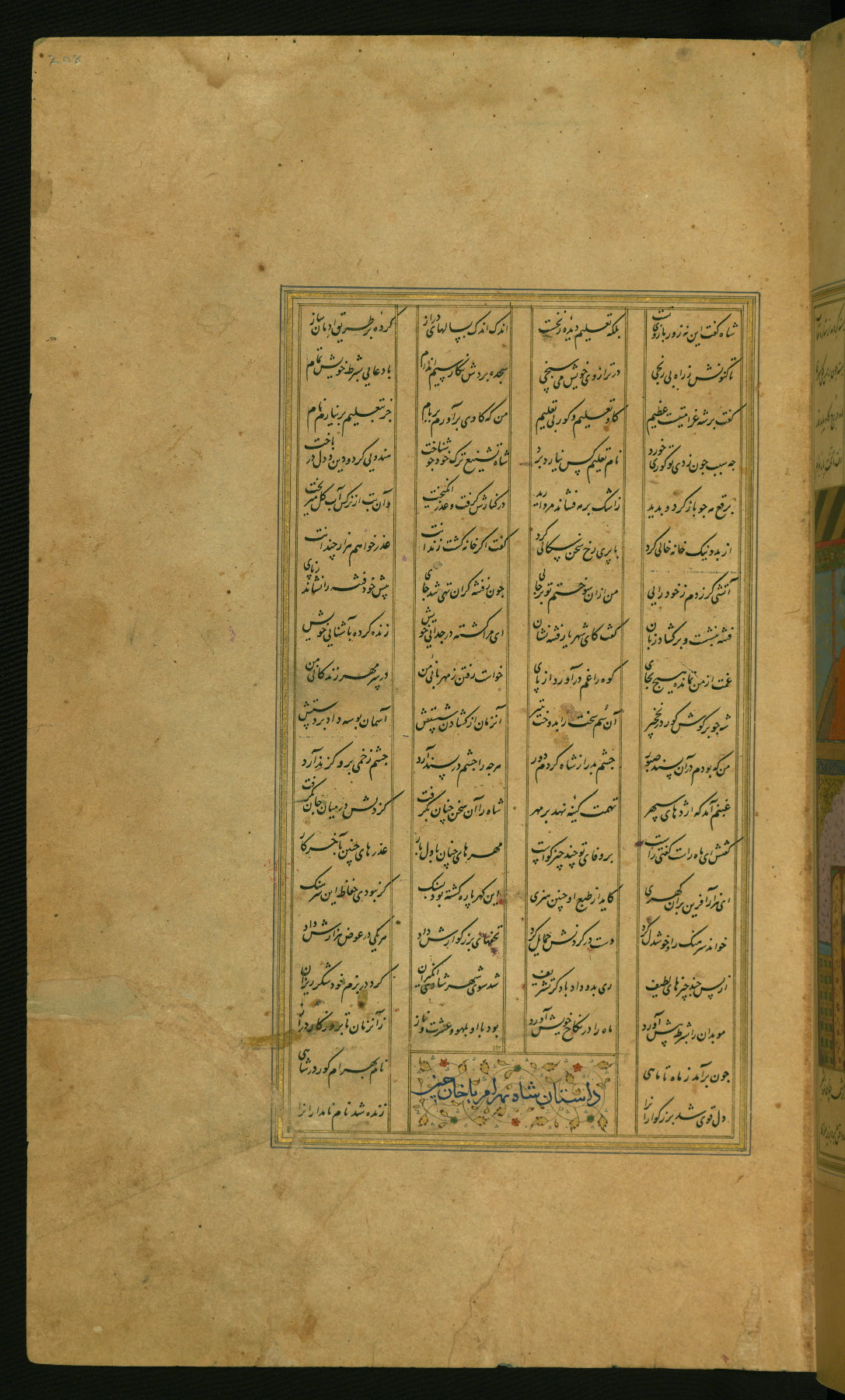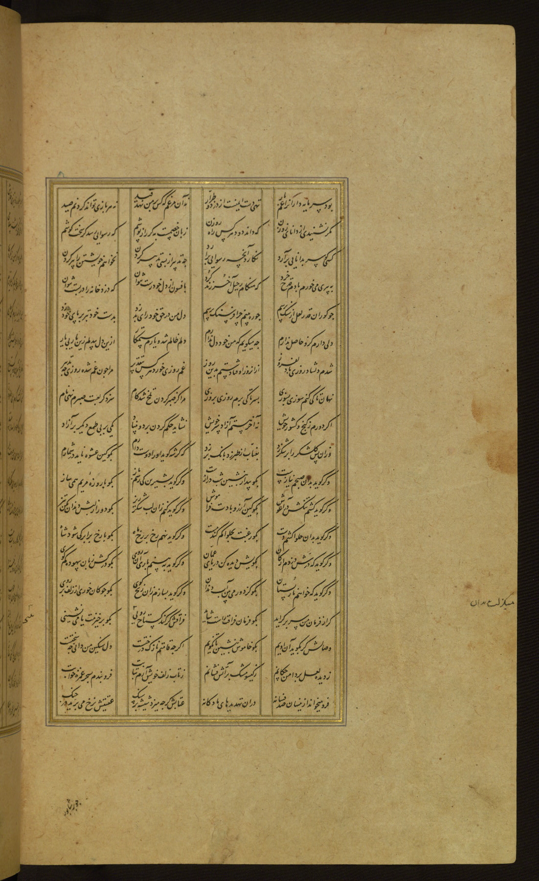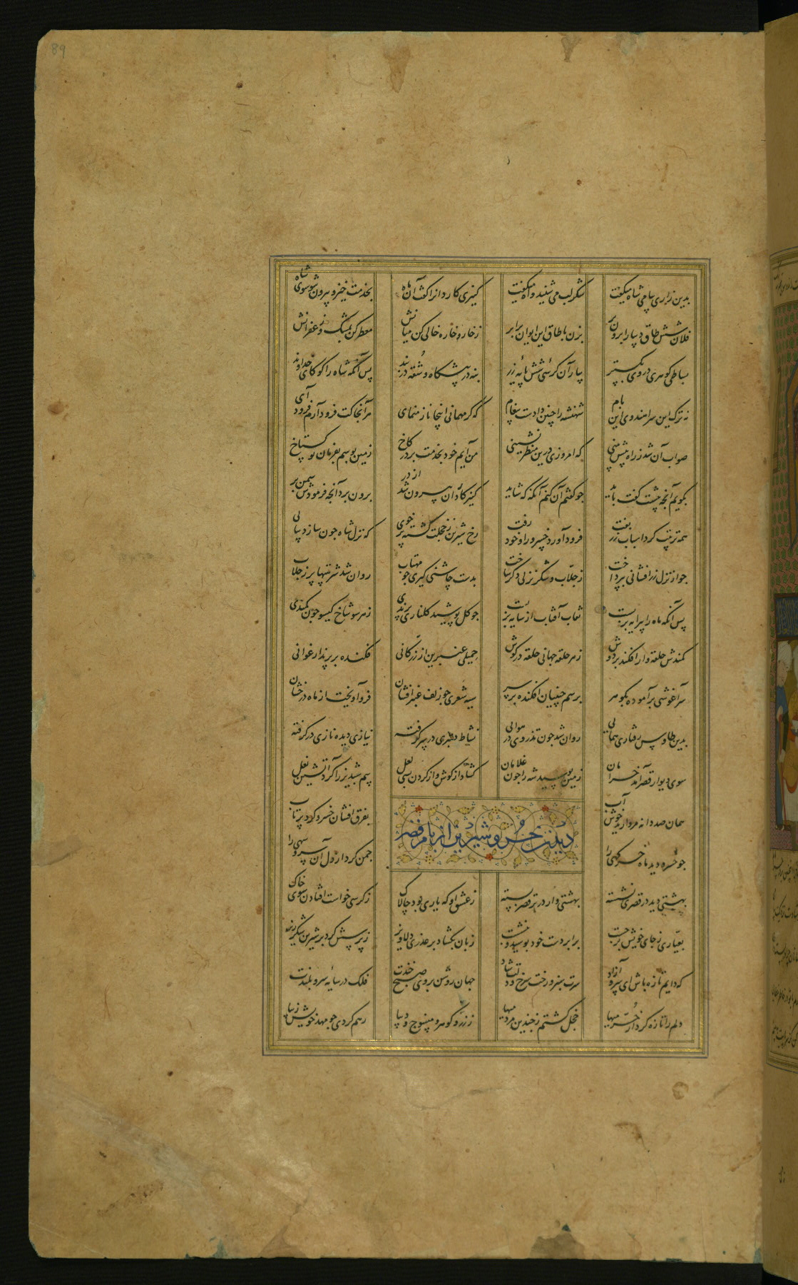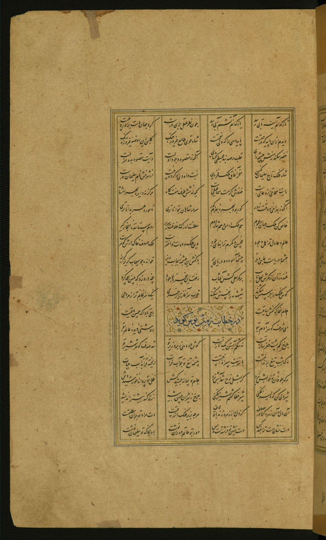 This illuminated and illustrated copy of the Khamsah (quintet) of Niẓāmī Ganjavī (d. 605 AH / 1209 CE) was written by Yār Muḥammad al-Haravī in 922 AH / 1516 CE. Written in four columns in black nastaʿlīq script, this manuscript opens with a double-page illuminated frontispiece signed by ʿAbd al-Wahhāb ibn ʿAbd al-Fattāḥ ibn ʿAlī. It contains thirty-five illustrations that were repainted in India during the twelfth century AH / eighteenth CE. The seal of Muḥammad Asharf ibn Muḥammad Khātam al-Ḥusaynī, dated 1173 AH / 1759-60 CE appears on fols. 1a and 401a. It is possible that the brown leather binding with center and side panels brushed with gold is original to the manuscript but was repaired at a later stage in the codex's history.