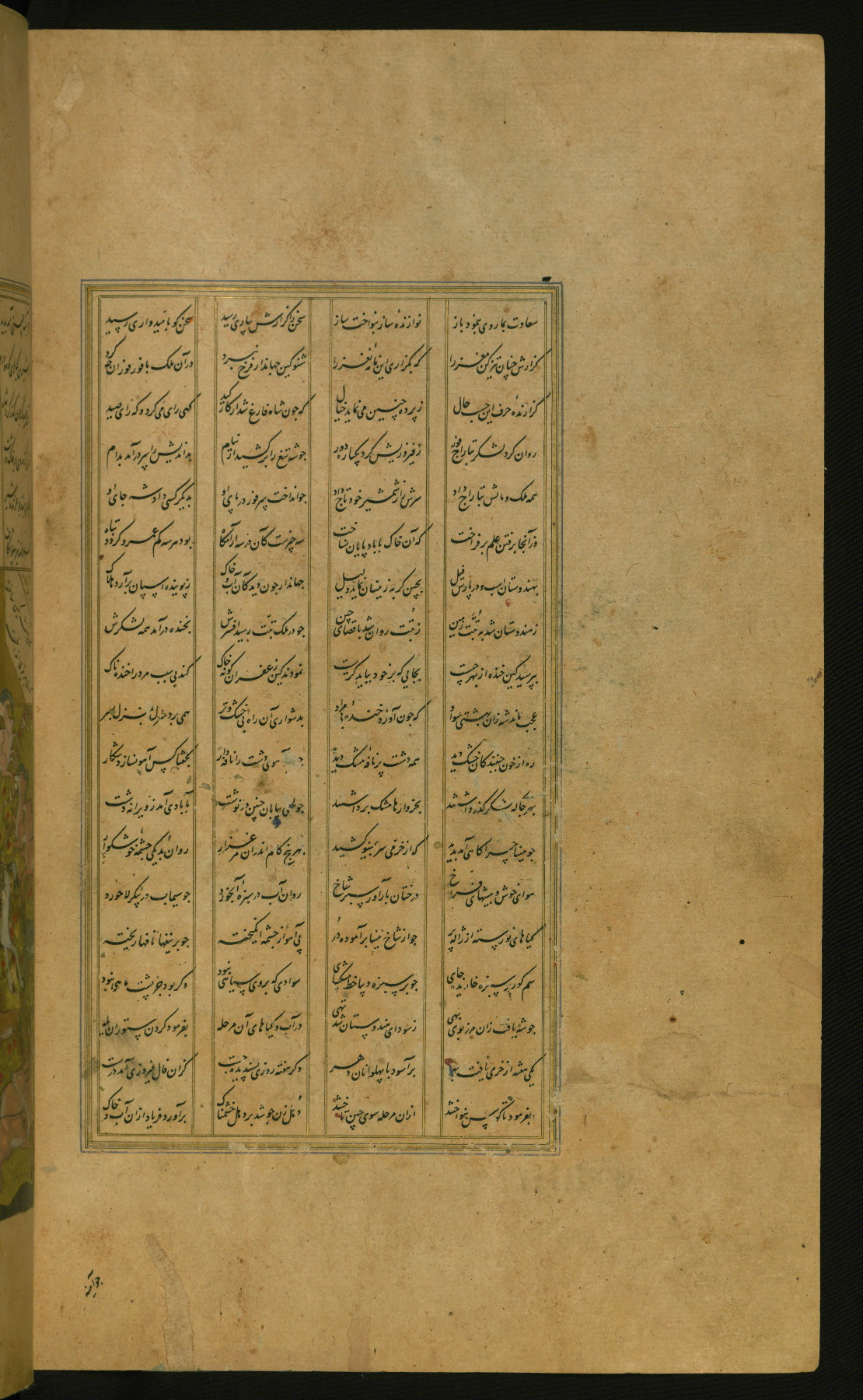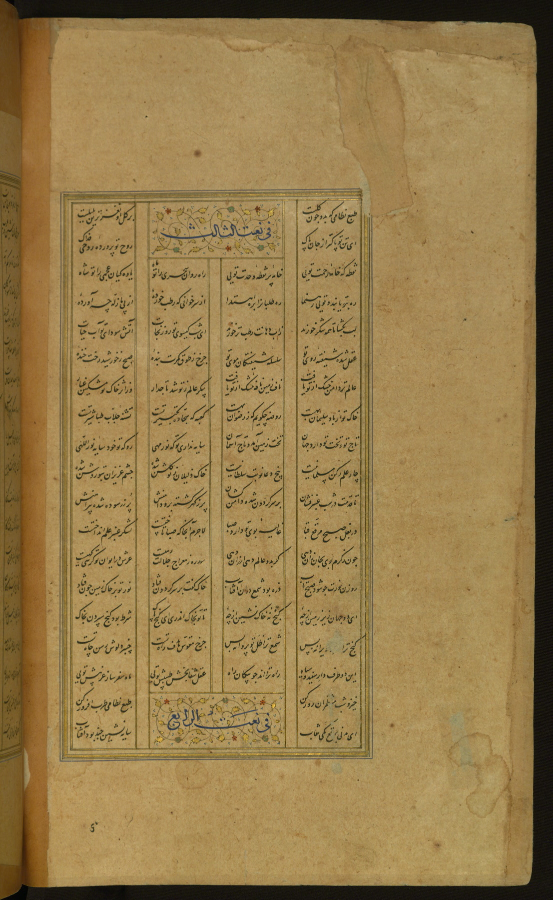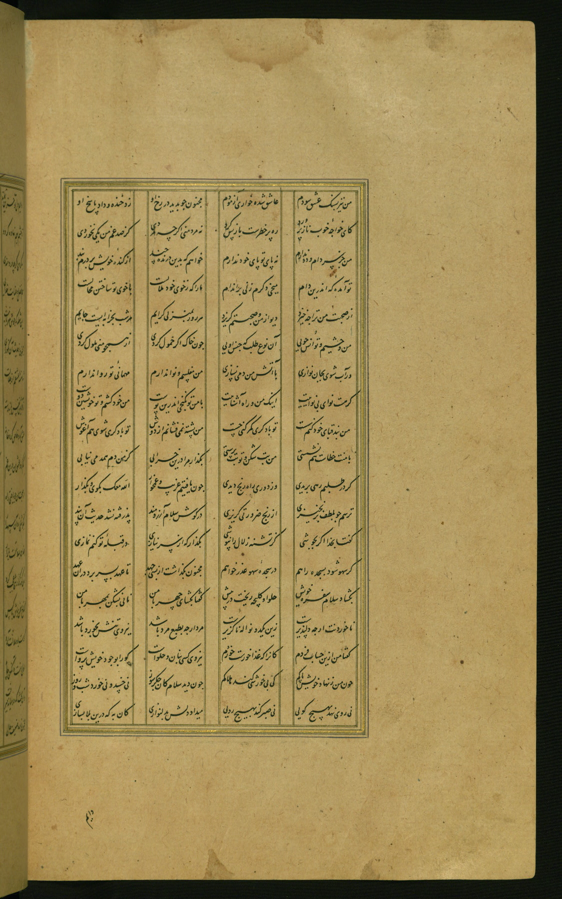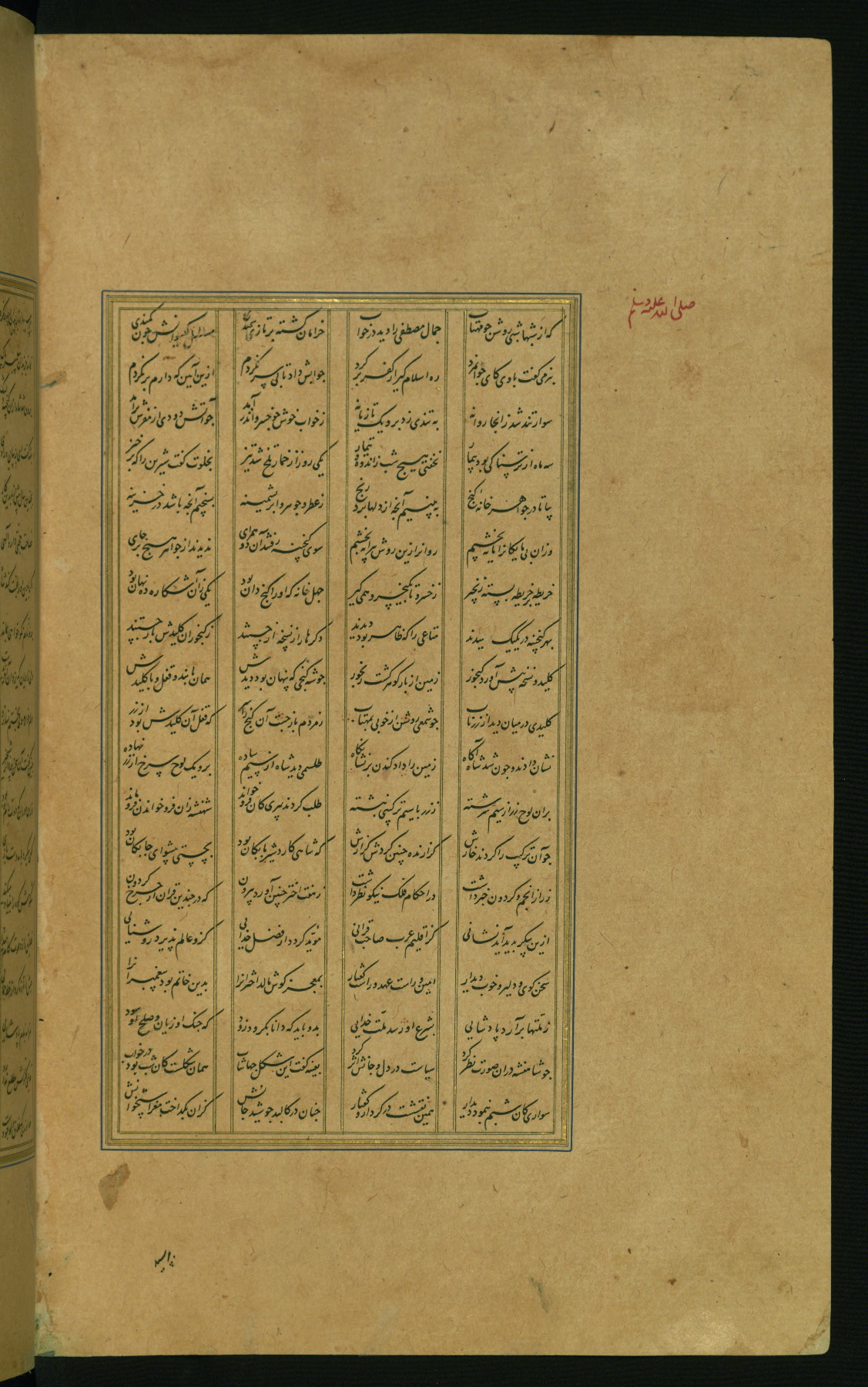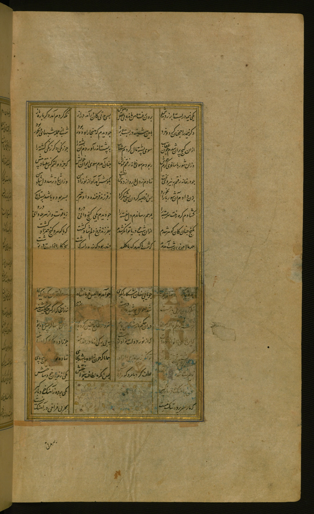This illuminated and illustrated copy of the Khamsah (quintet) of Niẓāmī Ganjavī (d. 605 AH / 1209 CE) was written by Yār Muḥammad al-Haravī in 922 AH / 1516 CE. Written in four columns in black nastaʿlīq script, this manuscript opens with a double-page illuminated frontispiece signed by ʿAbd al-Wahhāb ibn ʿAbd al-Fattāḥ ibn ʿAlī. It contains thirty-five illustrations that were repainted in India during the twelfth century AH / eighteenth CE. The seal of Muḥammad Asharf ibn Muḥammad Khātam al-Ḥusaynī, dated 1173 AH / 1759-60 CE appears on fols. 1a and 401a. It is possible that the brown leather binding with center and side panels brushed with gold is original to the manuscript but was repaired at a later stage in the codex's history.