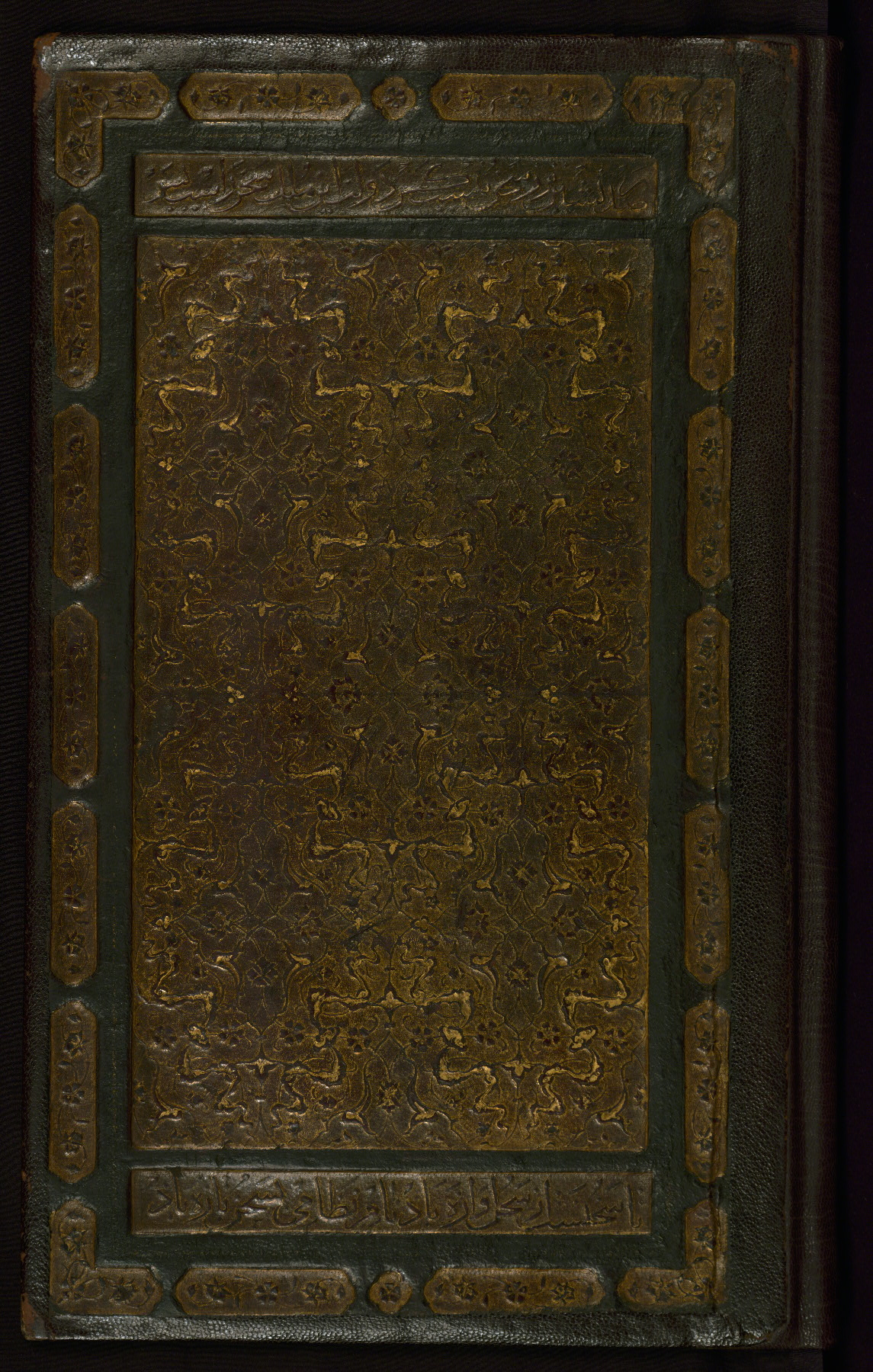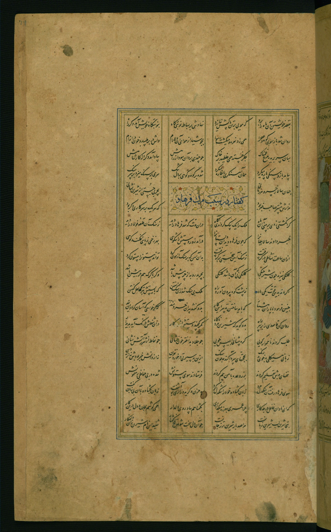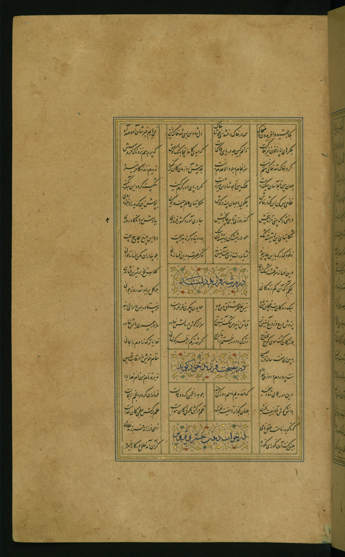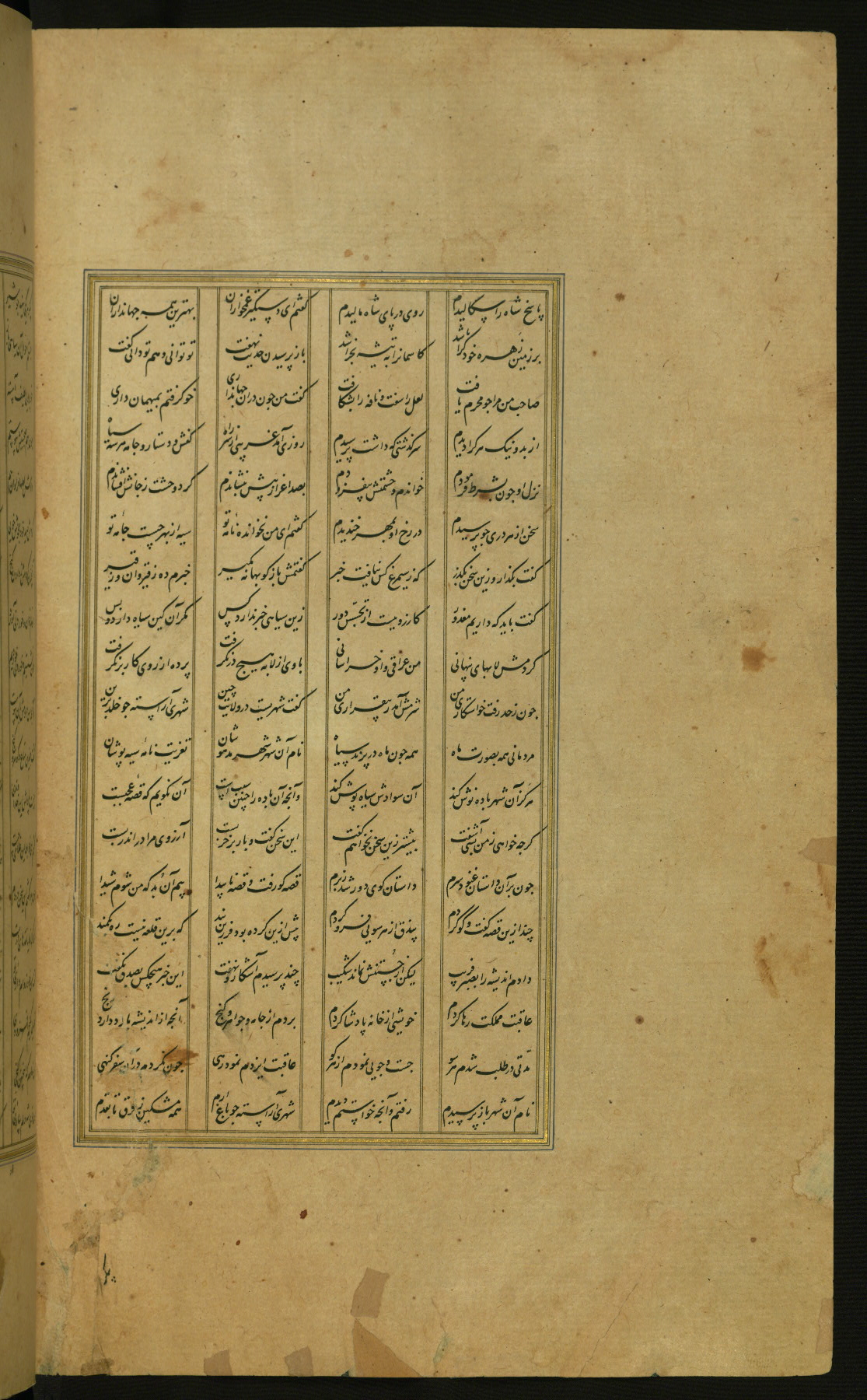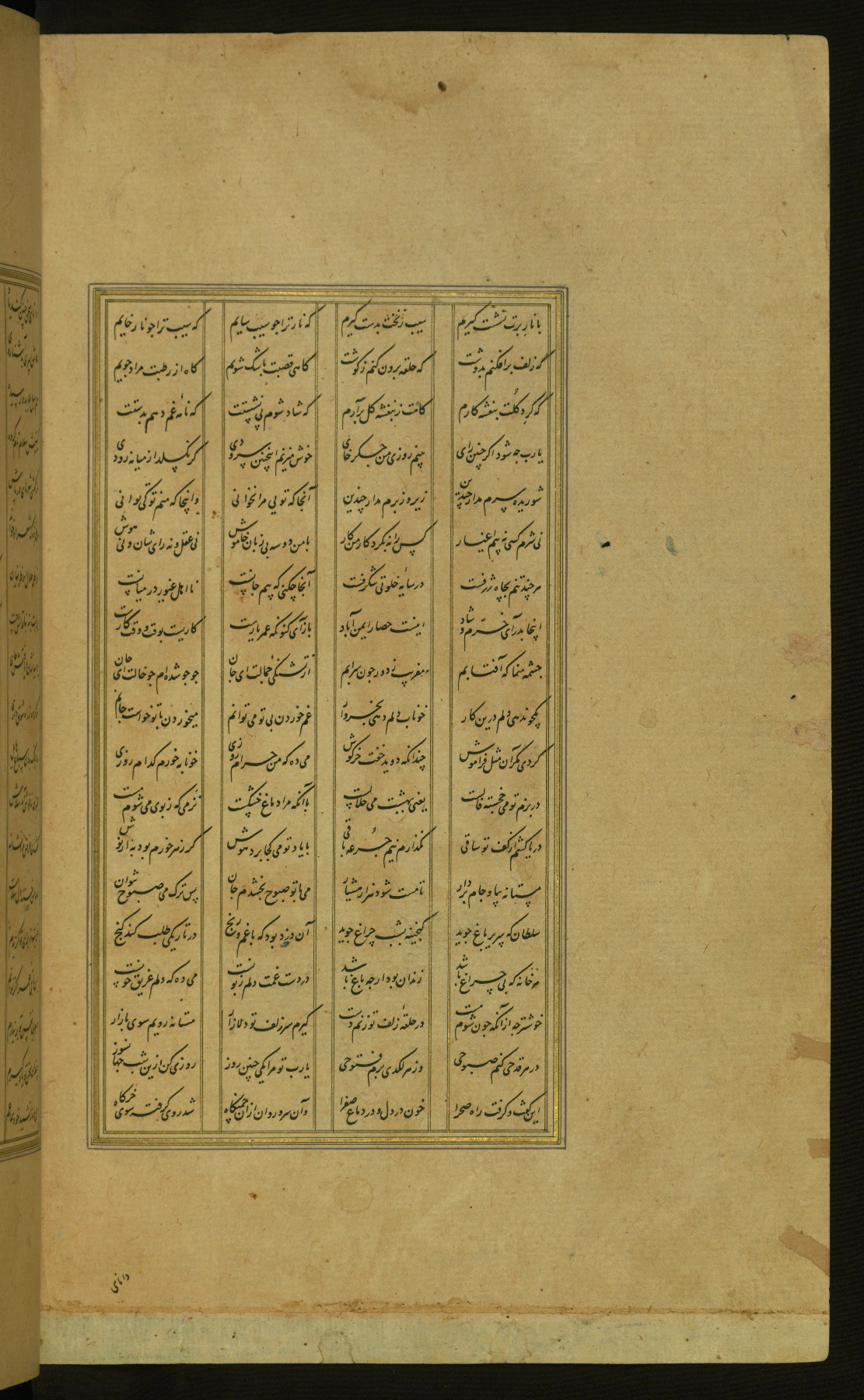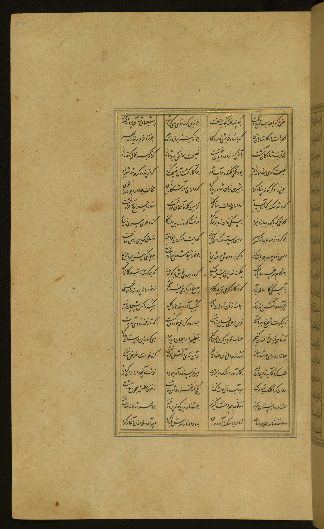 This illuminated and illustrated copy of the Khamsah (quintet) of Niẓāmī Ganjavī (d. 605 AH / 1209 CE) was written by Yār Muḥammad al-Haravī in 922 AH / 1516 CE. Written in four columns in black nastaʿlīq script, this manuscript opens with a double-page illuminated frontispiece signed by ʿAbd al-Wahhāb ibn ʿAbd al-Fattāḥ ibn ʿAlī. It contains thirty-five illustrations that were repainted in India during the twelfth century AH / eighteenth CE. The seal of Muḥammad Asharf ibn Muḥammad Khātam al-Ḥusaynī, dated 1173 AH / 1759-60 CE appears on fols. 1a and 401a. It is possible that the brown leather binding with center and side panels brushed with gold is original to the manuscript but was repaired at a later stage in the codex's history.