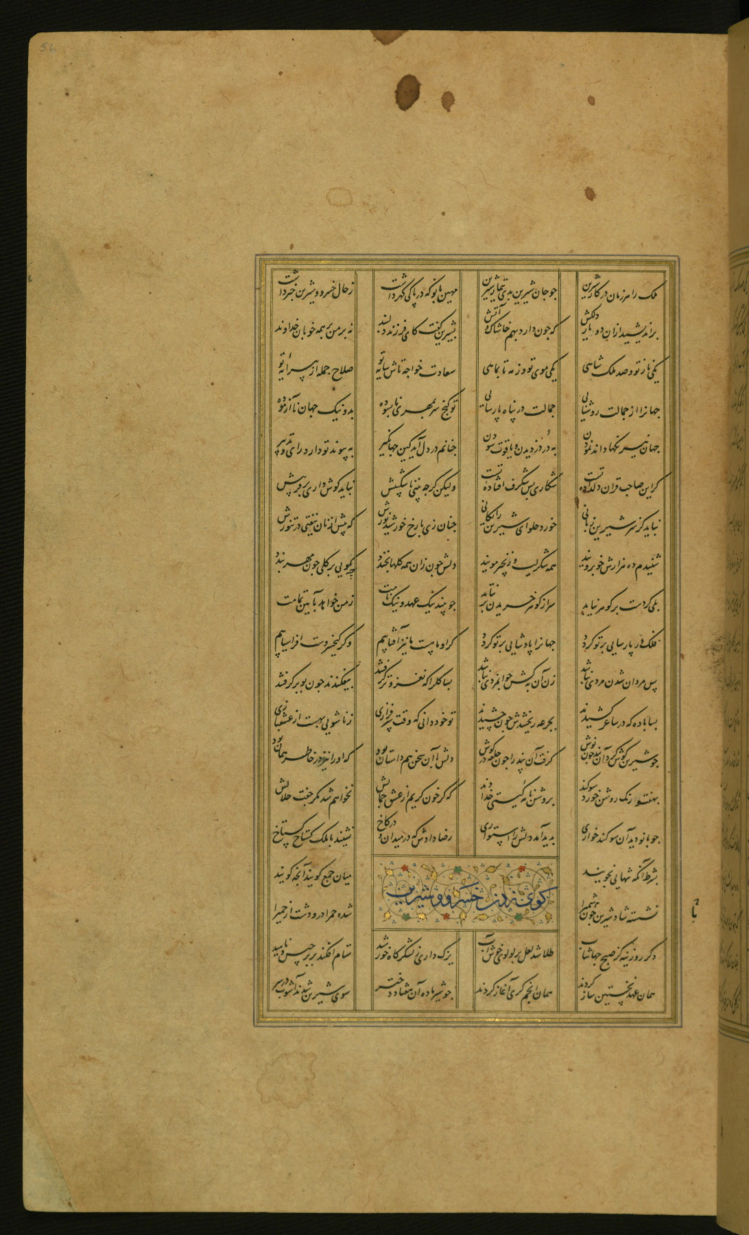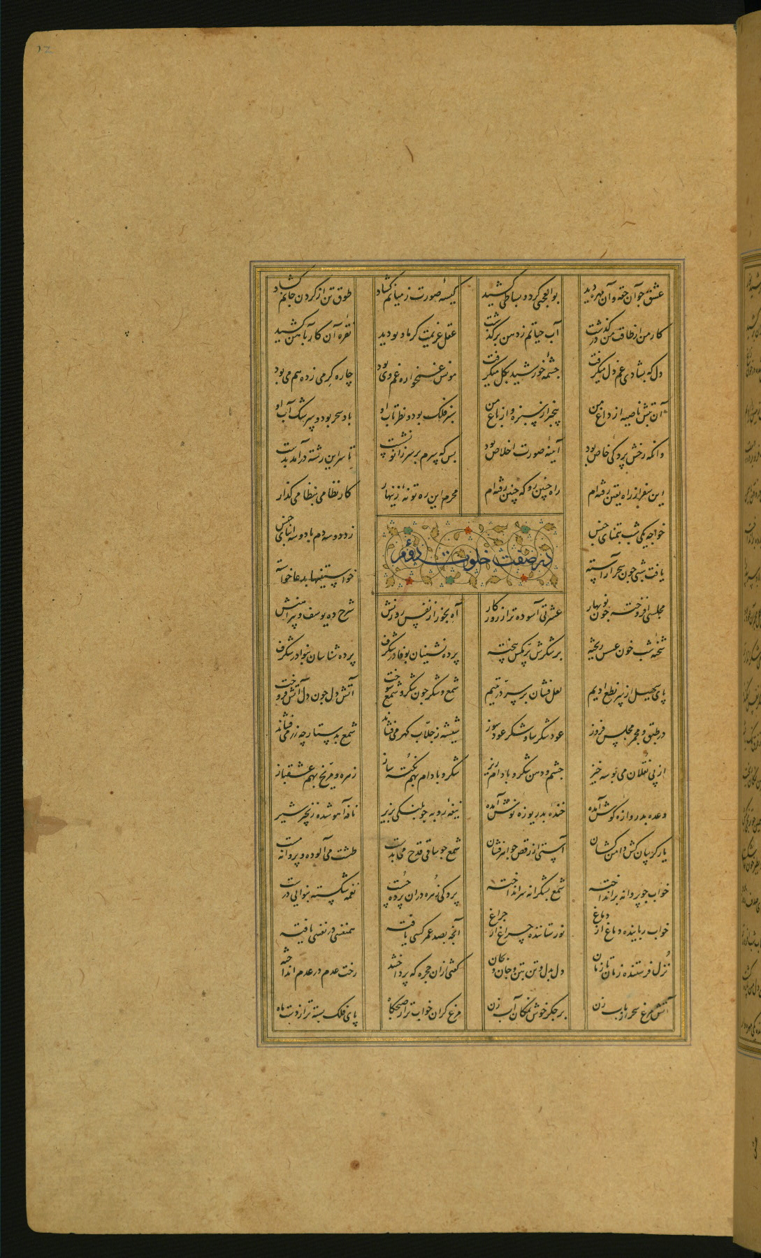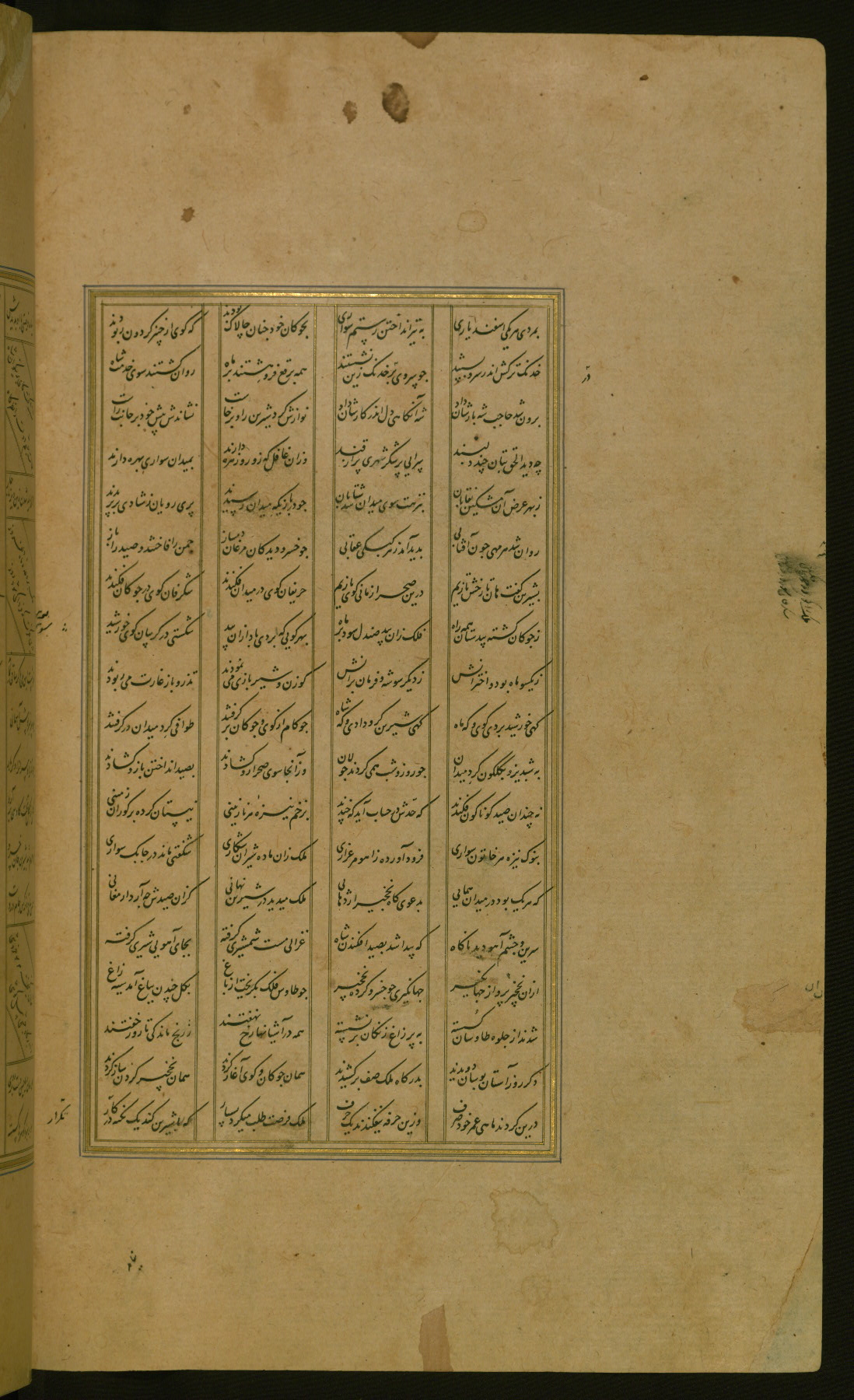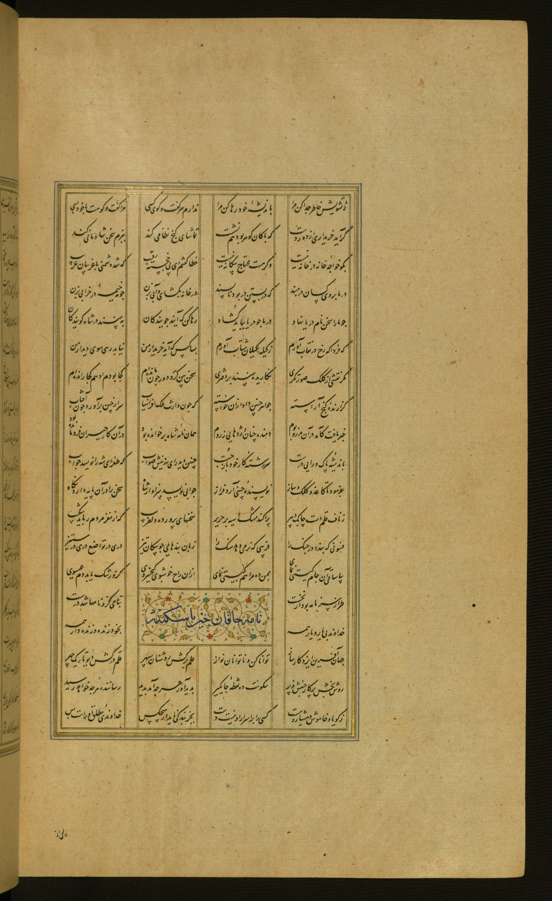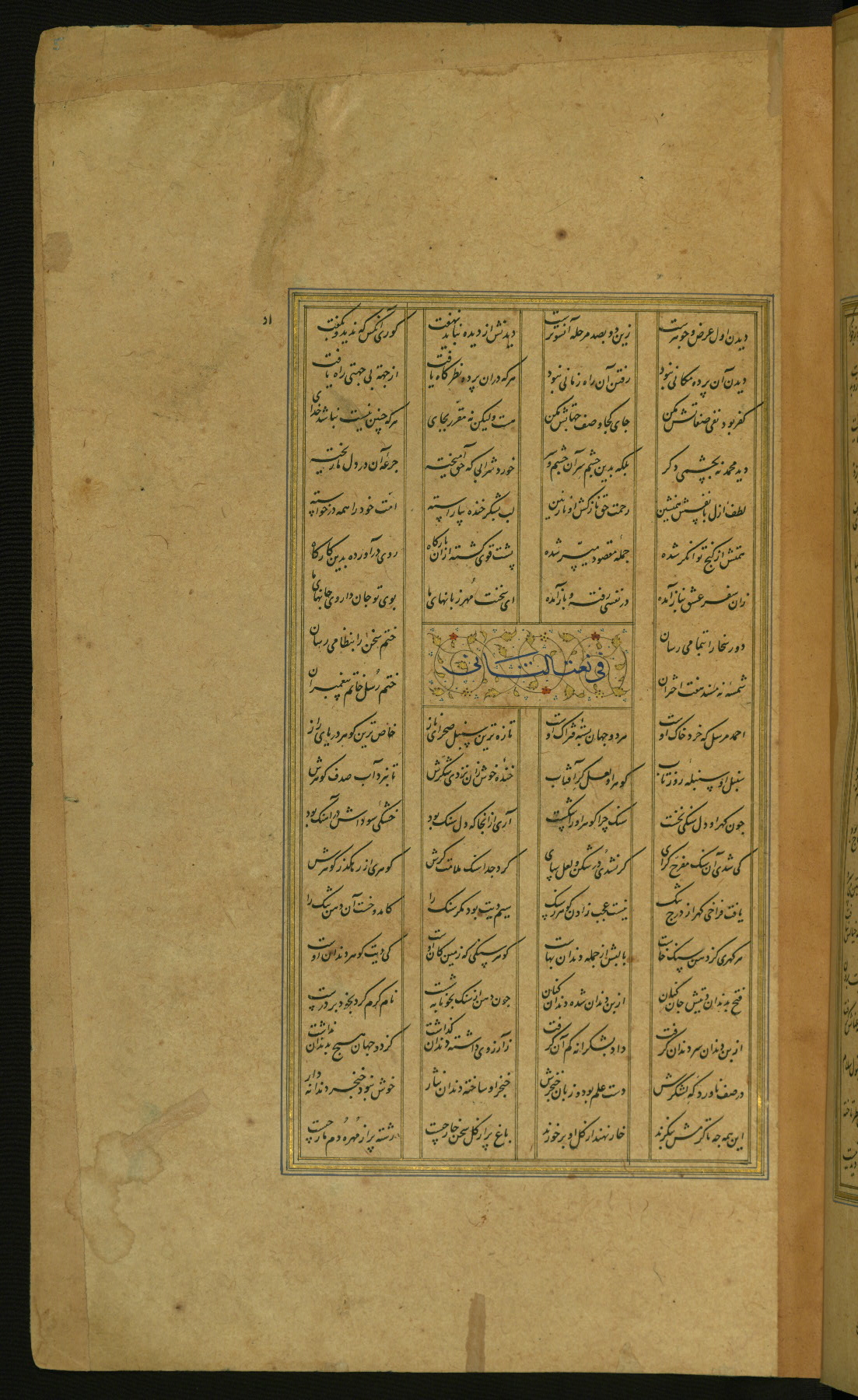 This illuminated and illustrated copy of the Khamsah (quintet) of Niẓāmī Ganjavī (d. 605 AH / 1209 CE) was written by Yār Muḥammad al-Haravī in 922 AH / 1516 CE. Written in four columns in black nastaʿlīq script, this manuscript opens with a double-page illuminated frontispiece signed by ʿAbd al-Wahhāb ibn ʿAbd al-Fattāḥ ibn ʿAlī. It contains thirty-five illustrations that were repainted in India during the twelfth century AH / eighteenth CE. The seal of Muḥammad Asharf ibn Muḥammad Khātam al-Ḥusaynī, dated 1173 AH / 1759-60 CE appears on fols. 1a and 401a. It is possible that the brown leather binding with center and side panels brushed with gold is original to the manuscript but was repaired at a later stage in the codex's history.