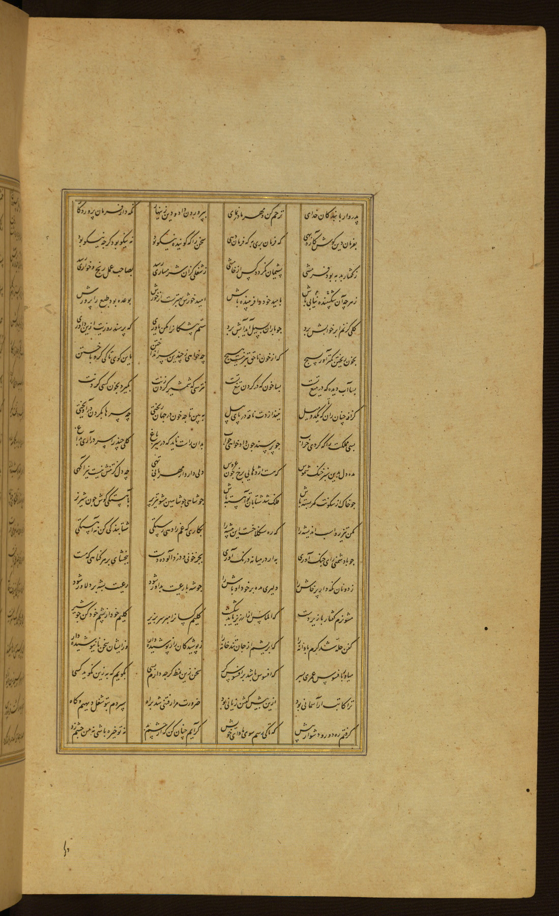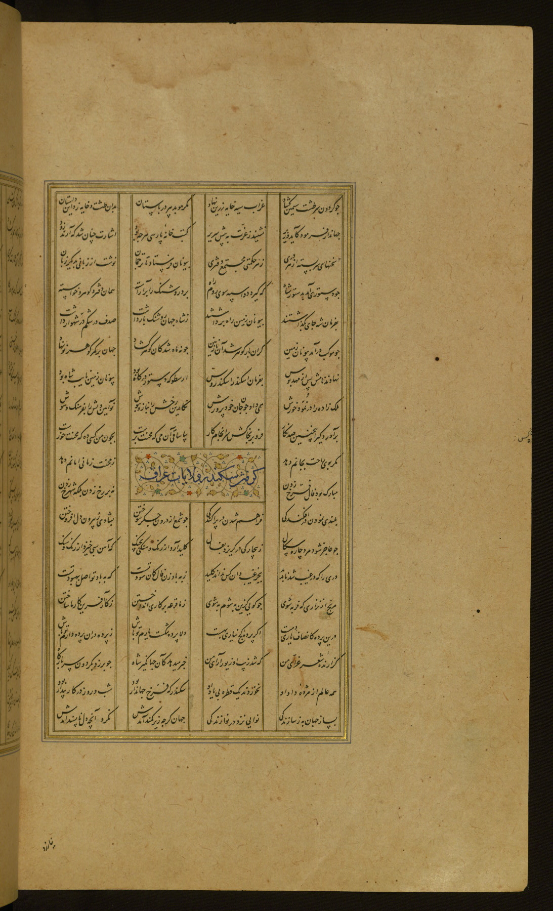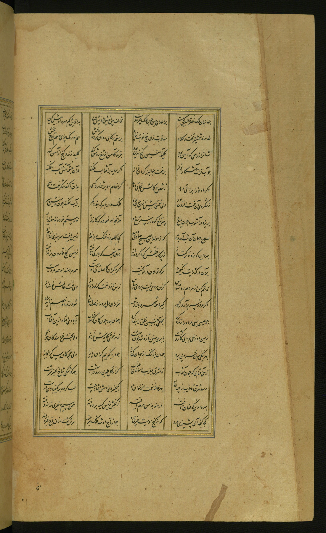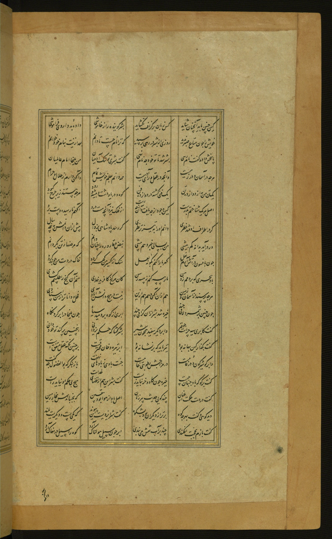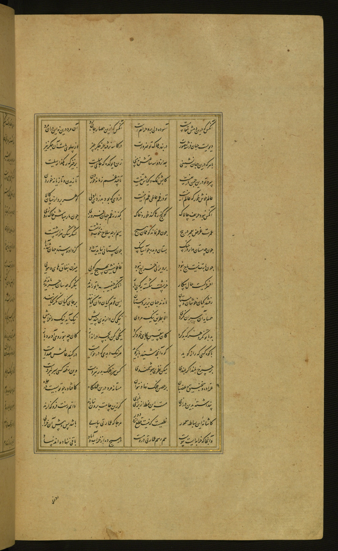 This illuminated and illustrated copy of the Khamsah (quintet) of Niẓāmī Ganjavī (d. 605 AH / 1209 CE) was written by Yār Muḥammad al-Haravī in 922 AH / 1516 CE. Written in four columns in black nastaʿlīq script, this manuscript opens with a double-page illuminated frontispiece signed by ʿAbd al-Wahhāb ibn ʿAbd al-Fattāḥ ibn ʿAlī. It contains thirty-five illustrations that were repainted in India during the twelfth century AH / eighteenth CE. The seal of Muḥammad Asharf ibn Muḥammad Khātam al-Ḥusaynī, dated 1173 AH / 1759-60 CE appears on fols. 1a and 401a. It is possible that the brown leather binding with center and side panels brushed with gold is original to the manuscript but was repaired at a later stage in the codex's history.