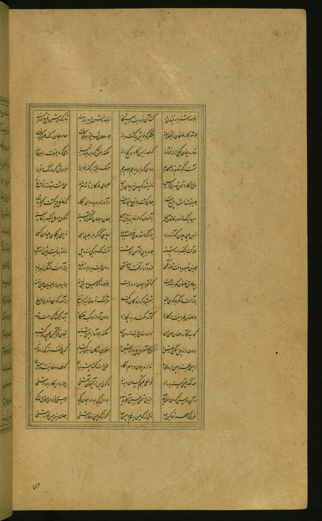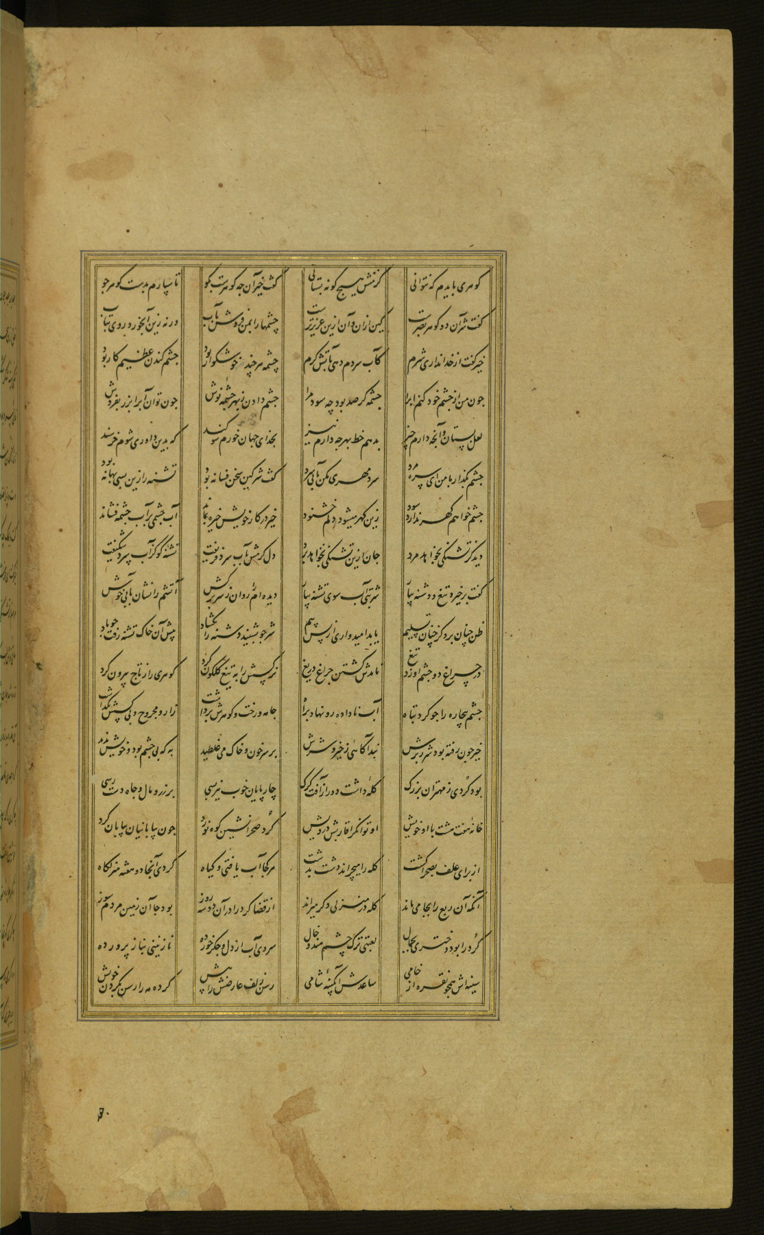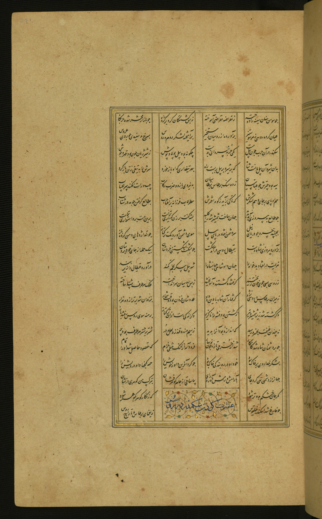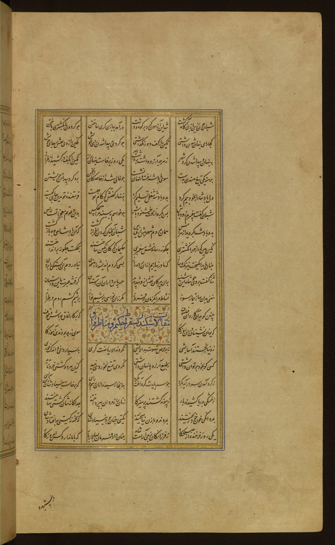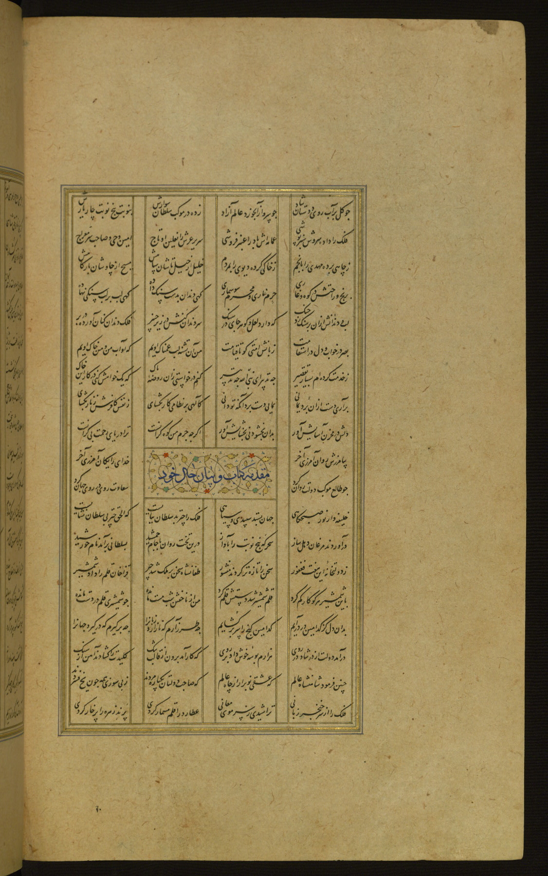 This illuminated and illustrated copy of the Khamsah (quintet) of Niẓāmī Ganjavī (d. 605 AH / 1209 CE) was written by Yār Muḥammad al-Haravī in 922 AH / 1516 CE. Written in four columns in black nastaʿlīq script, this manuscript opens with a double-page illuminated frontispiece signed by ʿAbd al-Wahhāb ibn ʿAbd al-Fattāḥ ibn ʿAlī. It contains thirty-five illustrations that were repainted in India during the twelfth century AH / eighteenth CE. The seal of Muḥammad Asharf ibn Muḥammad Khātam al-Ḥusaynī, dated 1173 AH / 1759-60 CE appears on fols. 1a and 401a. It is possible that the brown leather binding with center and side panels brushed with gold is original to the manuscript but was repaired at a later stage in the codex's history.